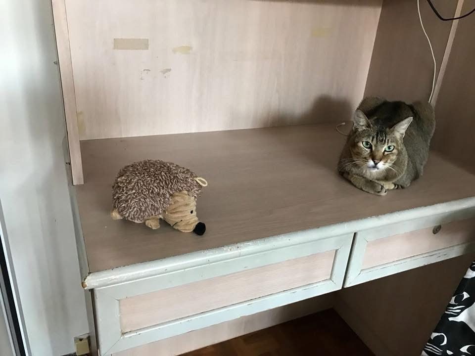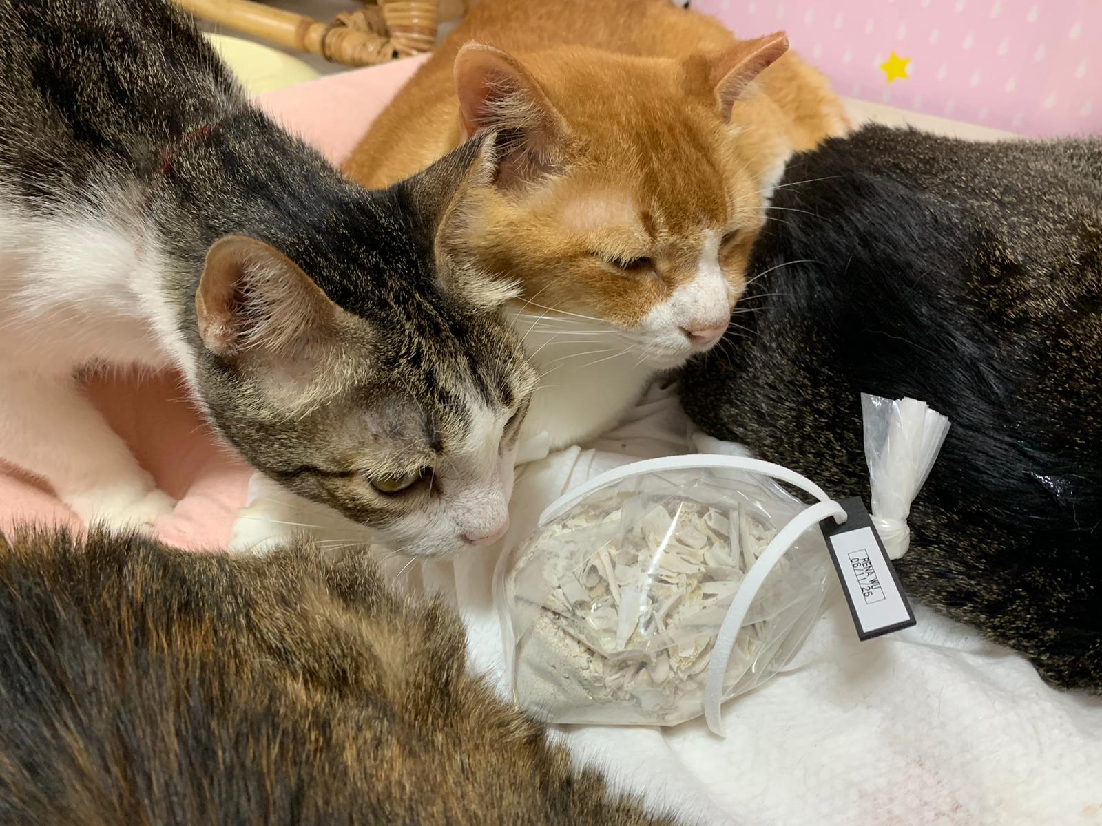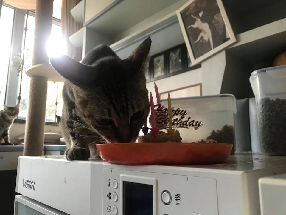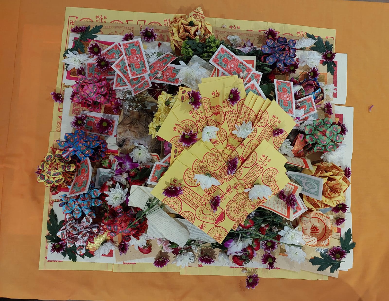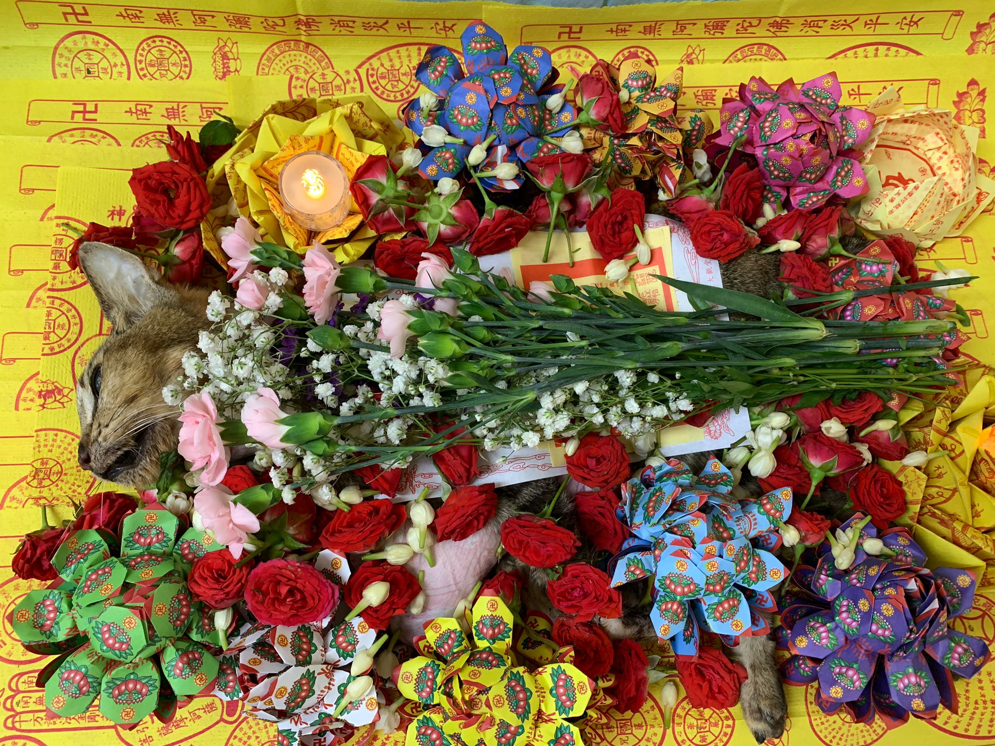 11.10am+: rena is back, n I bring her onto the bed, Jack, buddy sena is on it, so she can laze w them for a while. Kitty came to kiss rena, while I extract rena 10 years photos, last time Kitty and rena always in 2g kitchen food shelves 🙂 they r friends. told them I’m bringing rena back home to visit then go center prep her urn and party photos and labels.