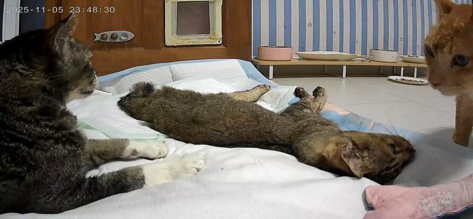 Morning: her left paw still swollen, still got water retention. Is ok. Not that swell. Maybe yesterday too much fluid. Today I Subcut minimum. Still give medi as usual. She still active in food time, even chase after sunshine cake wanna bite into the ff
