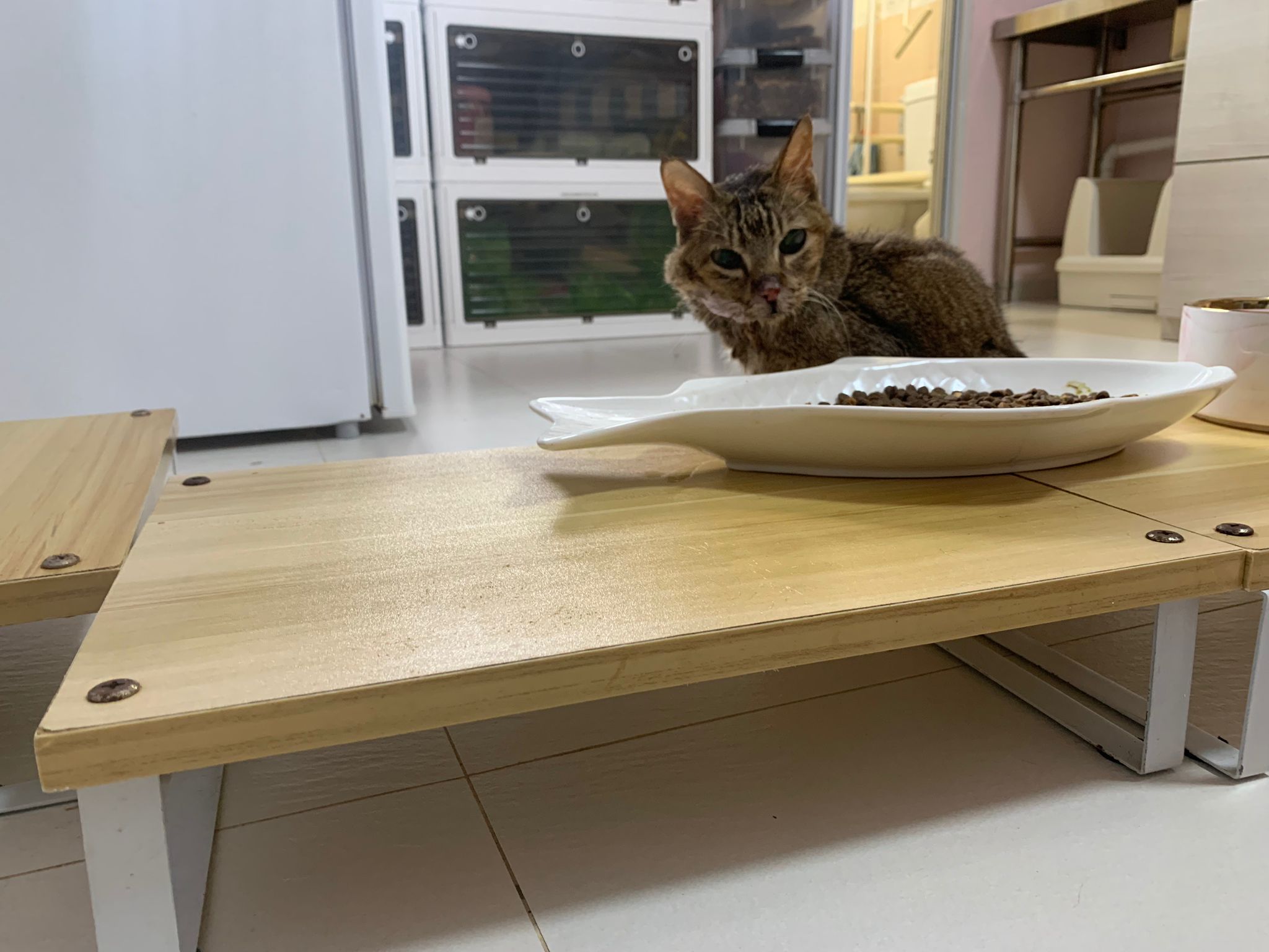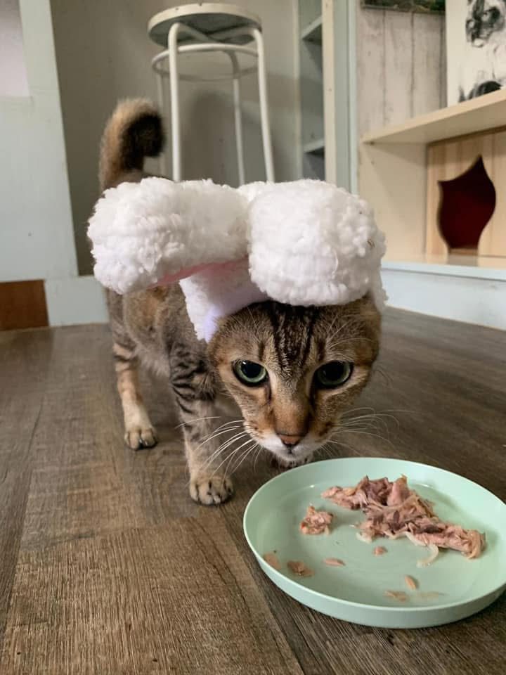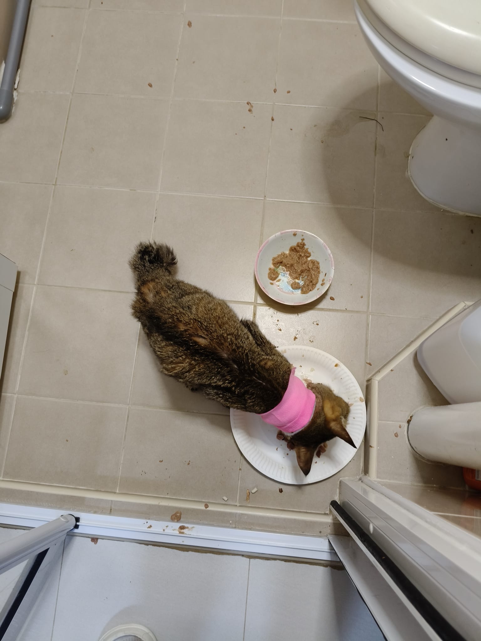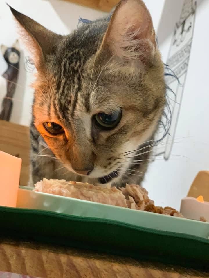 I on The tv sound and when it’s time to give snack I call for her she didn’t respond. Duno is tv too loud or she isn’t responsive. I got to carry her to bandage up and she go to a food plate after it’s done – I’m happy to see that. Then I serve her schesir mousse n kakato tuna w mackeral. She lick some n seem to choke.