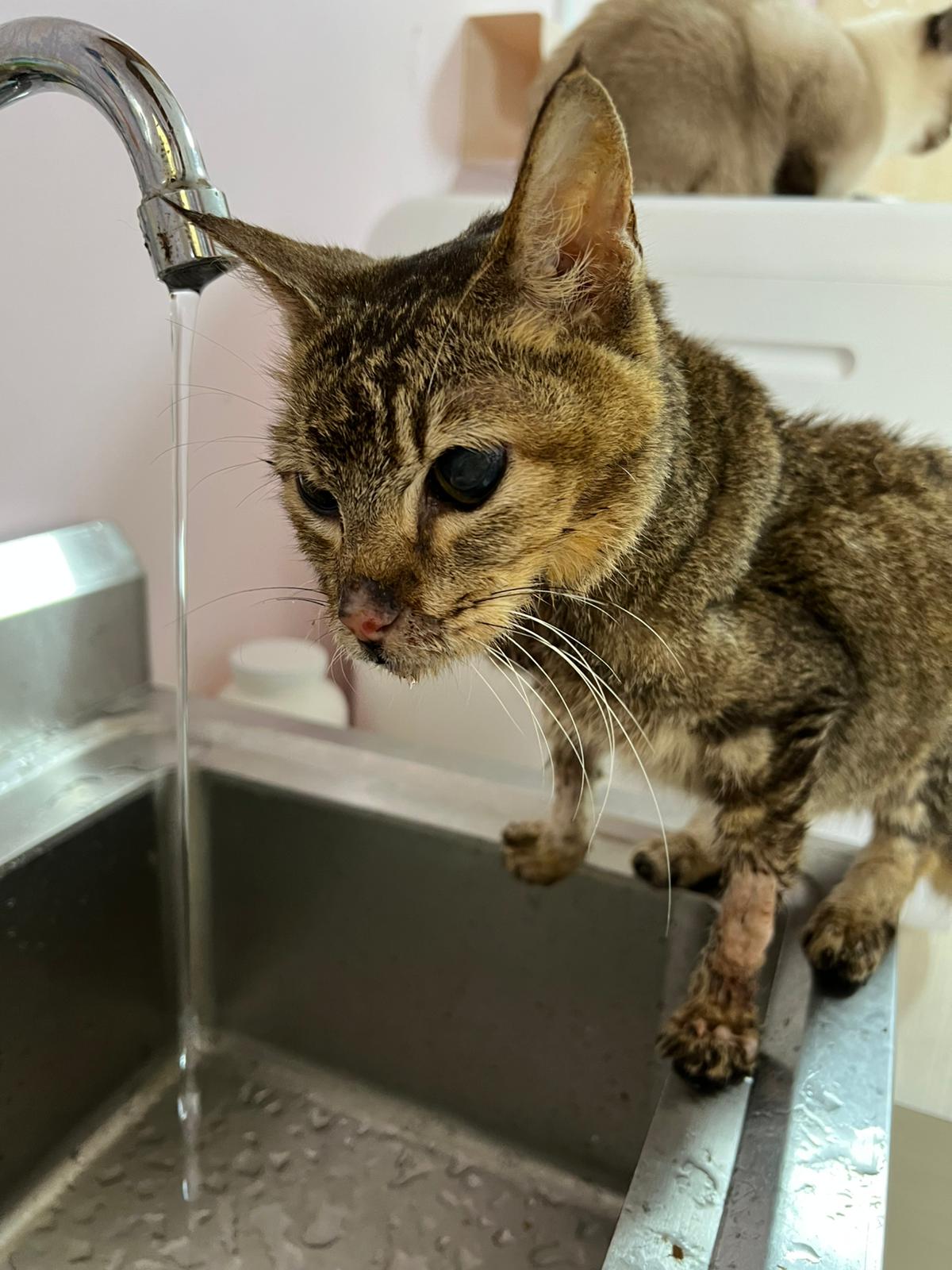 Morning: she still go for water tap. I didn’t weigh her today but I think she is thinner. the left eye still have those longan discharge but can clean away. Her neck hole is fine as it is. Just don’t burst will do. try to talk to her but the feel is not as strong cos the time I have w her is mainly to medicate her so maybe she can’t find the mood to feel comfy and cozy w me.