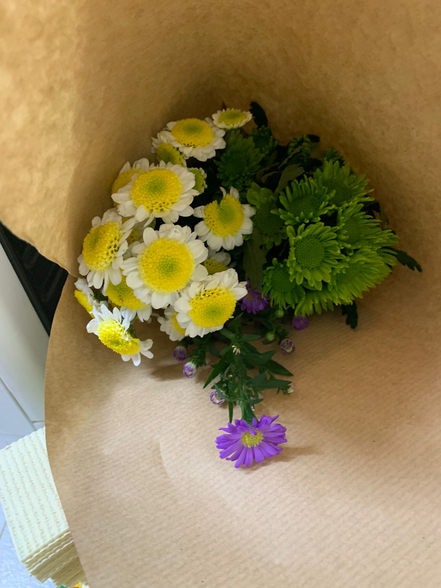 I helped agnes buy flower, her w green petals. I bought sweet combo for rena. Later let agnes give flowers on her own. tonight kc, Eileen, agnes coming to see her.