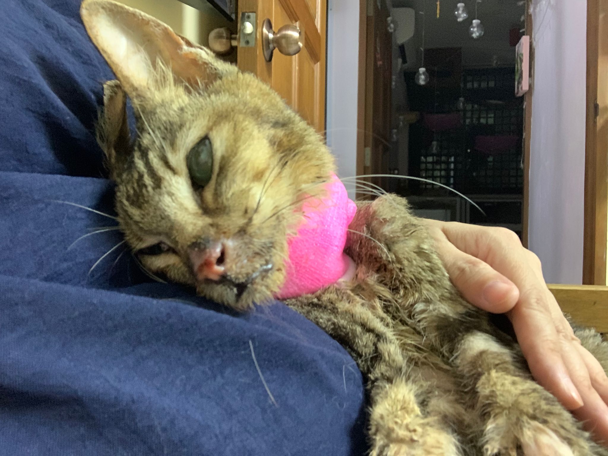 Morning: her hole in neck I didn’t expect it to close cos her skin is stretched by the lump/tumor, so regular clean will be good. Next 2 weeks or so when I can’t come daily I’ll let her air. Now bandage I still feel safer and cleaner for her n others. Her left eye had a few days of longan eyeball but I manage to clean it, but there is a layer of minor ulcer on it? Also re her k, cos I don’t wanna her be poke anytime soon, maybe after the party, 2 months. So maybe I’ll drop w kcl 2 bags, then the rest will be back to normal drip.