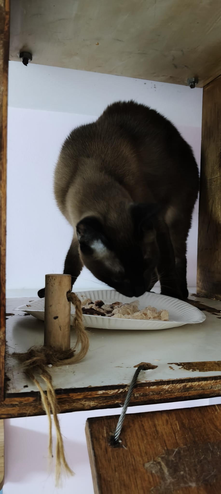 3pm; I go back just to talk to them. I open up FFG chicken to shed into container, wanna bring for ah boy. He run in n meow meow at me. I give him of cos. When I serve food he come again he want more I give him more on his snack plate.