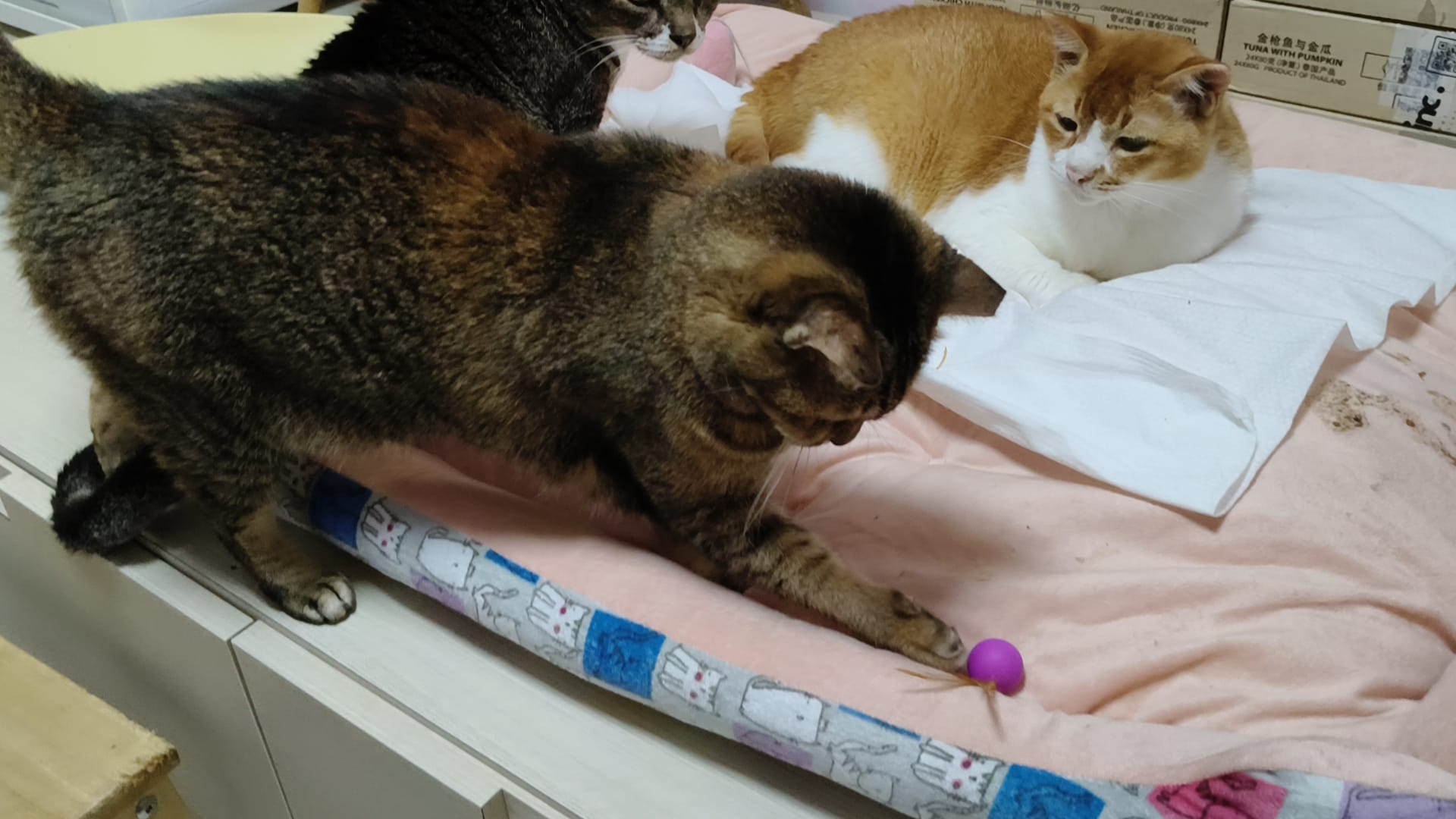 Night: mmm:” Sena playing. Sena attracting more to play. So much fun with the 2 feather balls”