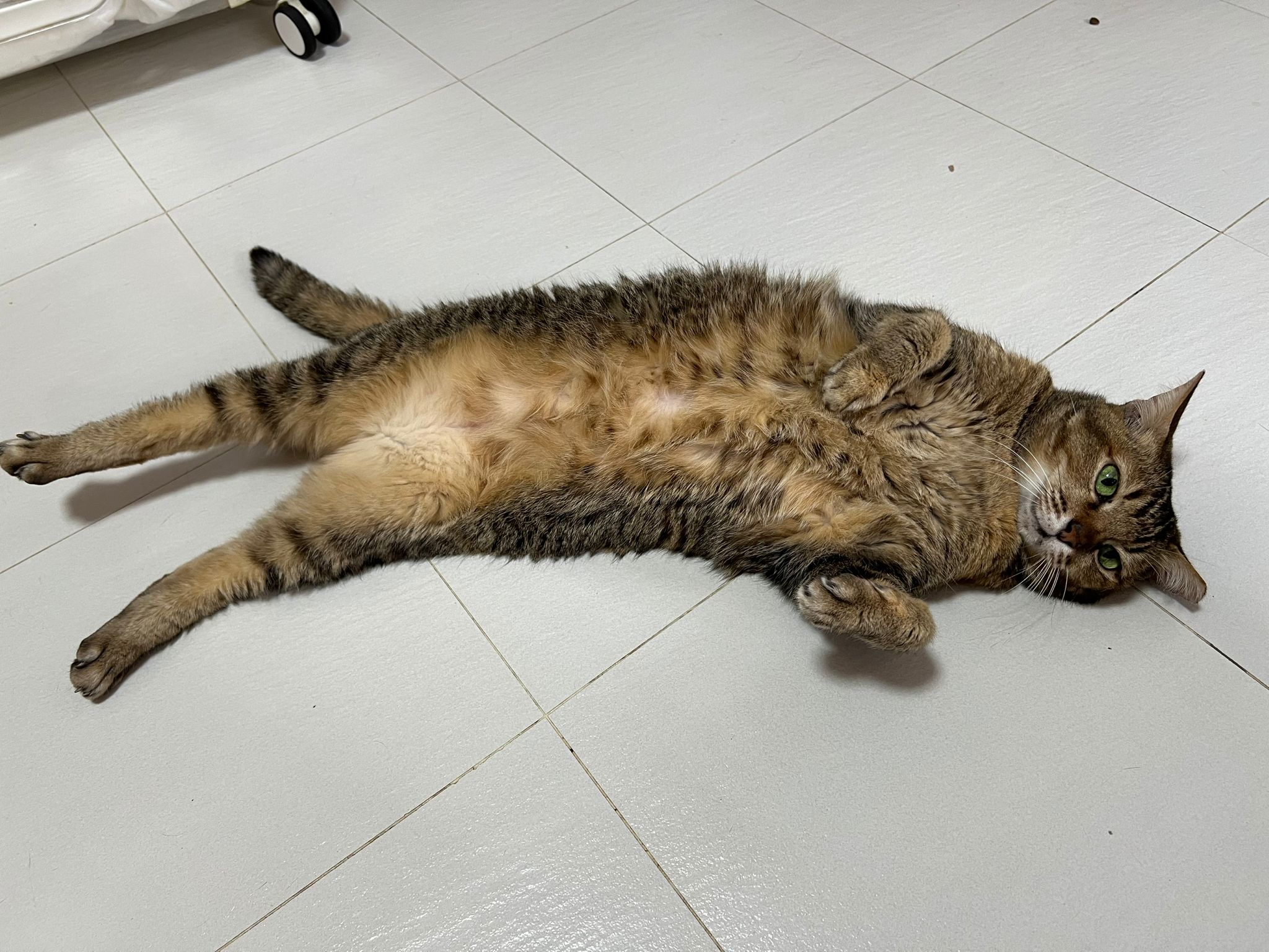Morning: still my belly rub queen. Super cute. But her left eye today got dirt, like a little starting flu.