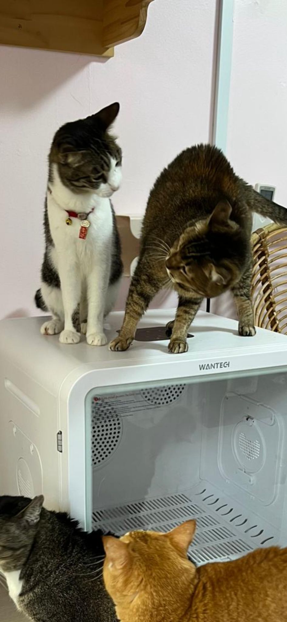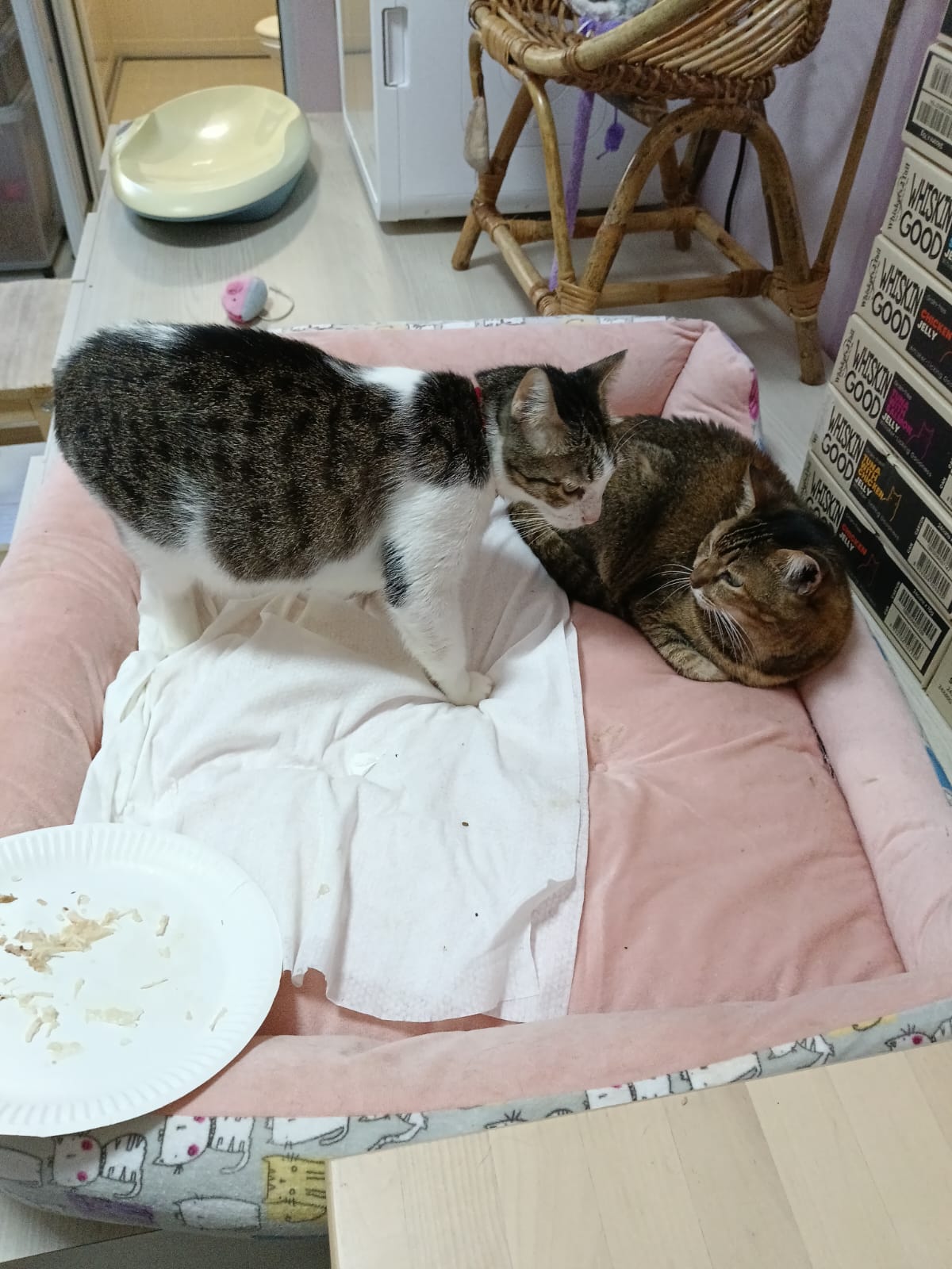 11.10am+: rena is back, n I bring her onto the bed, Jack, buddy sena is on it, so she can laze w them for a while. Kitty came to kiss rena, while I extract rena 10 years photos, last time Kitty and rena always in 2g kitchen food shelves 🙂 they r friends. told them I’m bringing rena back home to visit then go center prep her urn and party photos and labels.