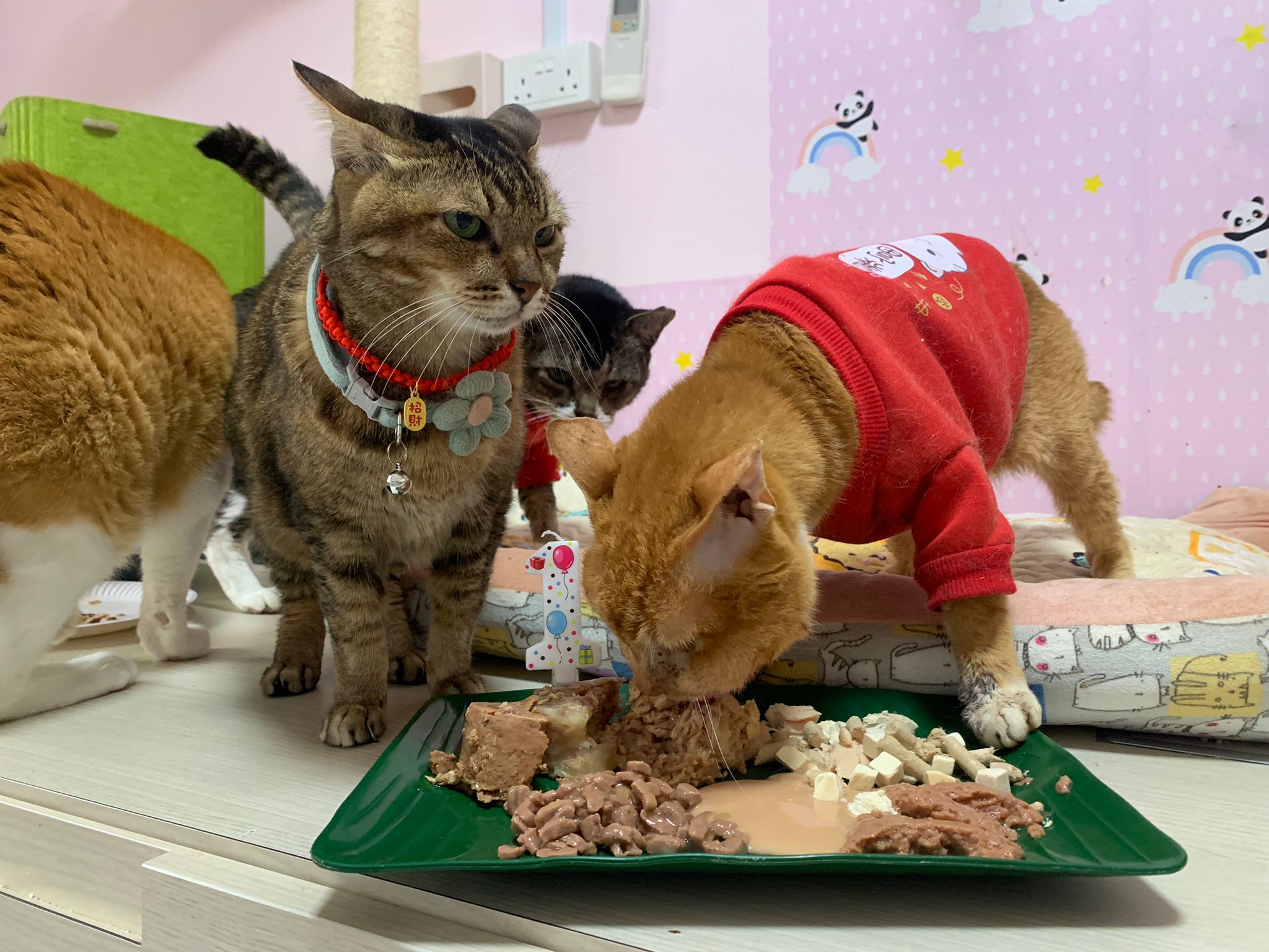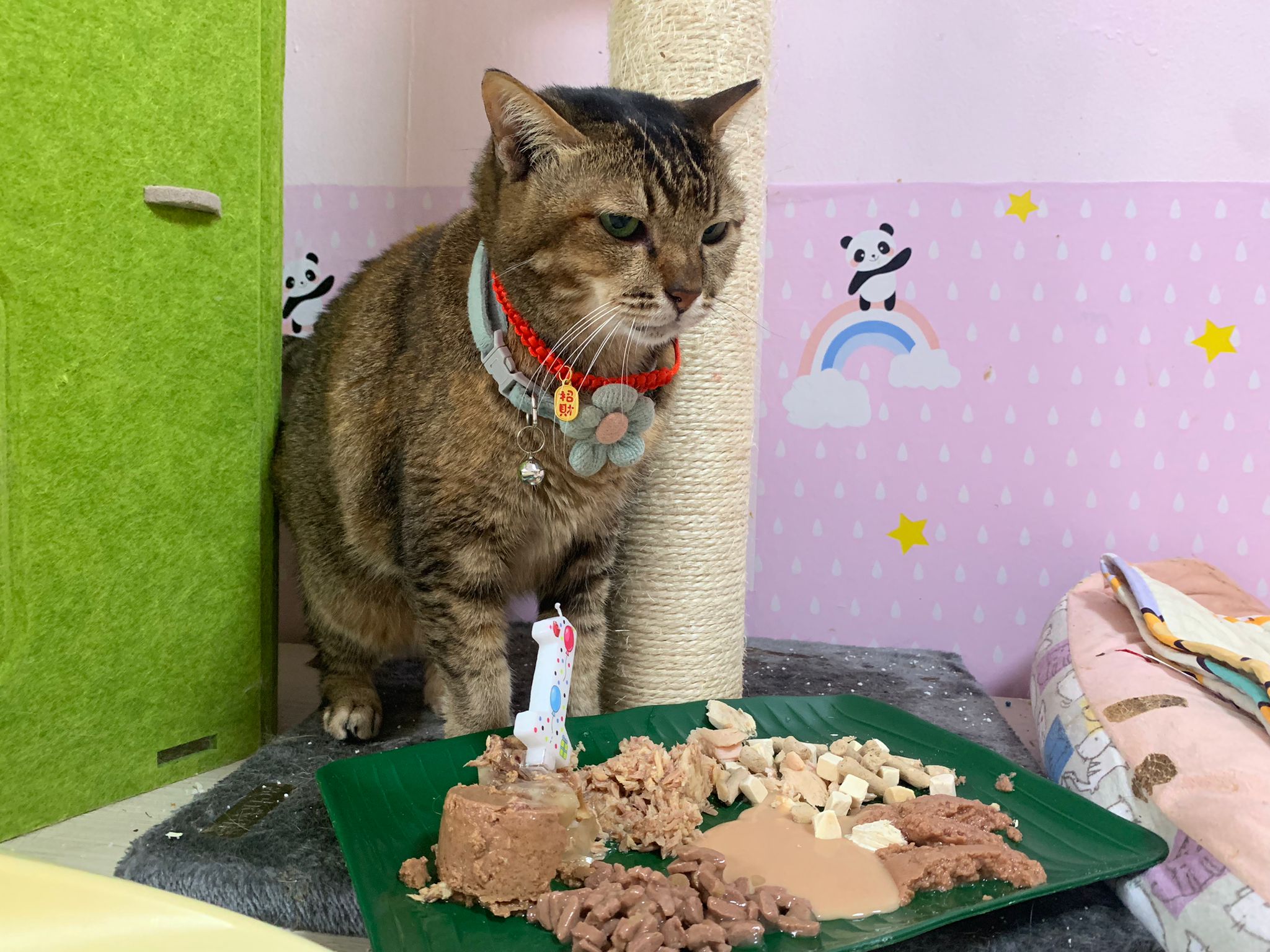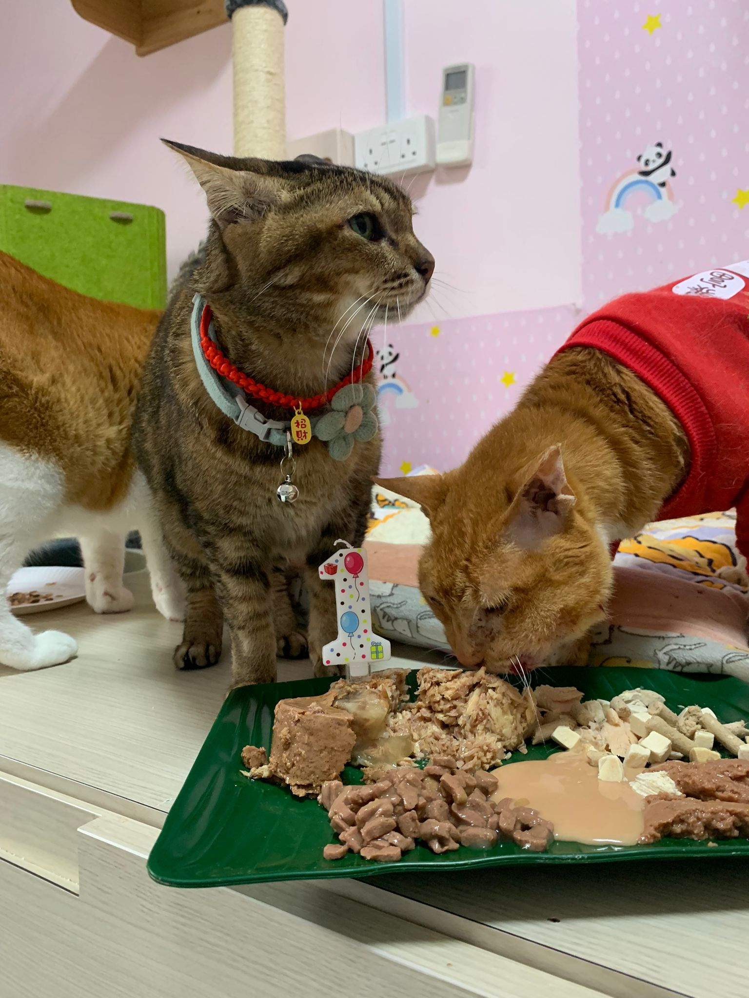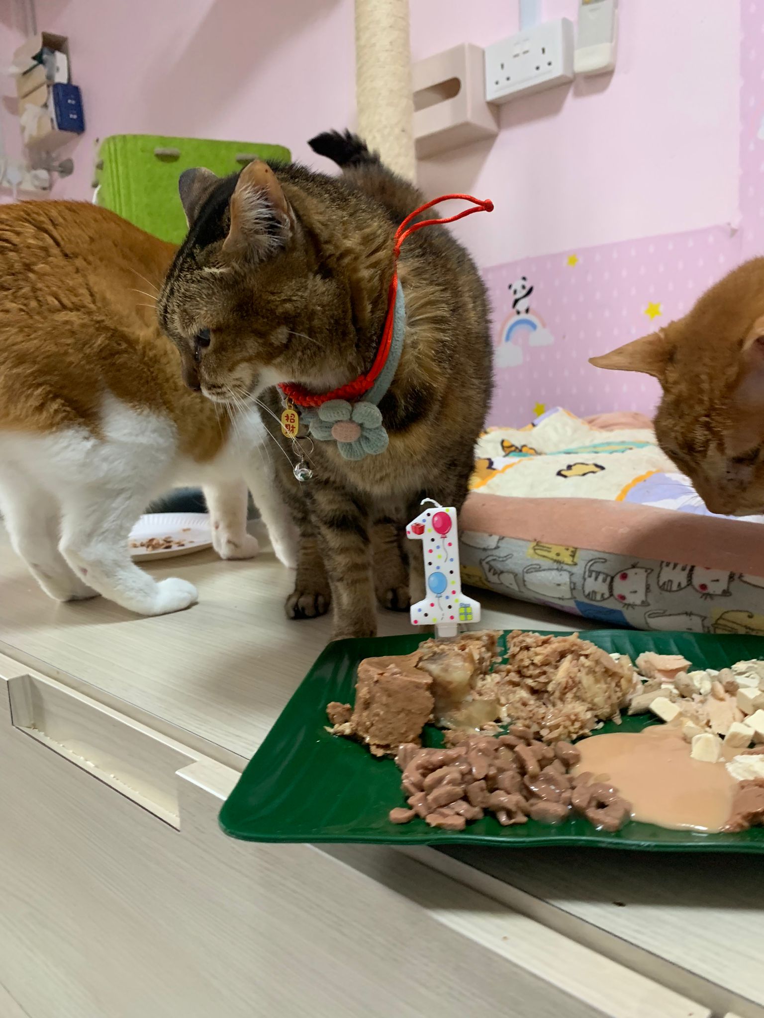 Morning: I celebrate buddy bday first then I move on to sena. Sena is eating kibble but I carry her up to bed to sing song. Buddy come join us. End up both only want rubs and sayang. Both didn’t eat. Sena see junior 不爽 and want to beat him up. Ha funny sena w me for 12 years le. 16.2 will check her status. Old cat 老脾气. ha not interested in her bday plate. Or maybe no chance to eat la…. didi so aggressive. She just give in to him