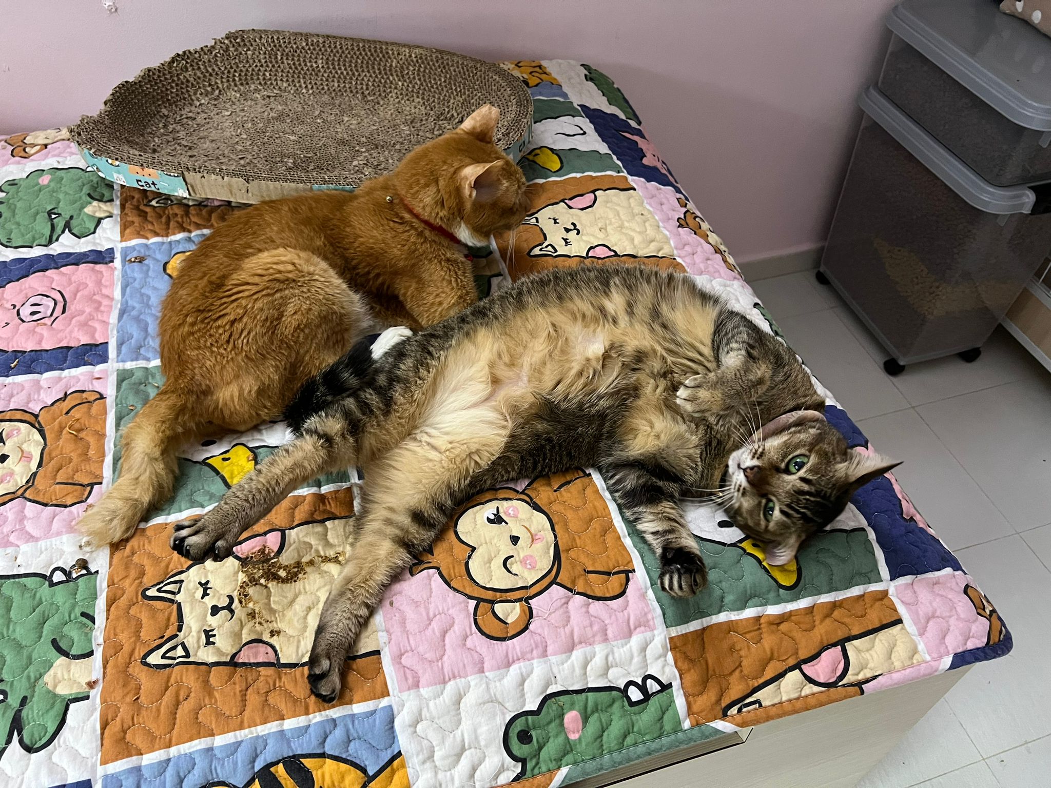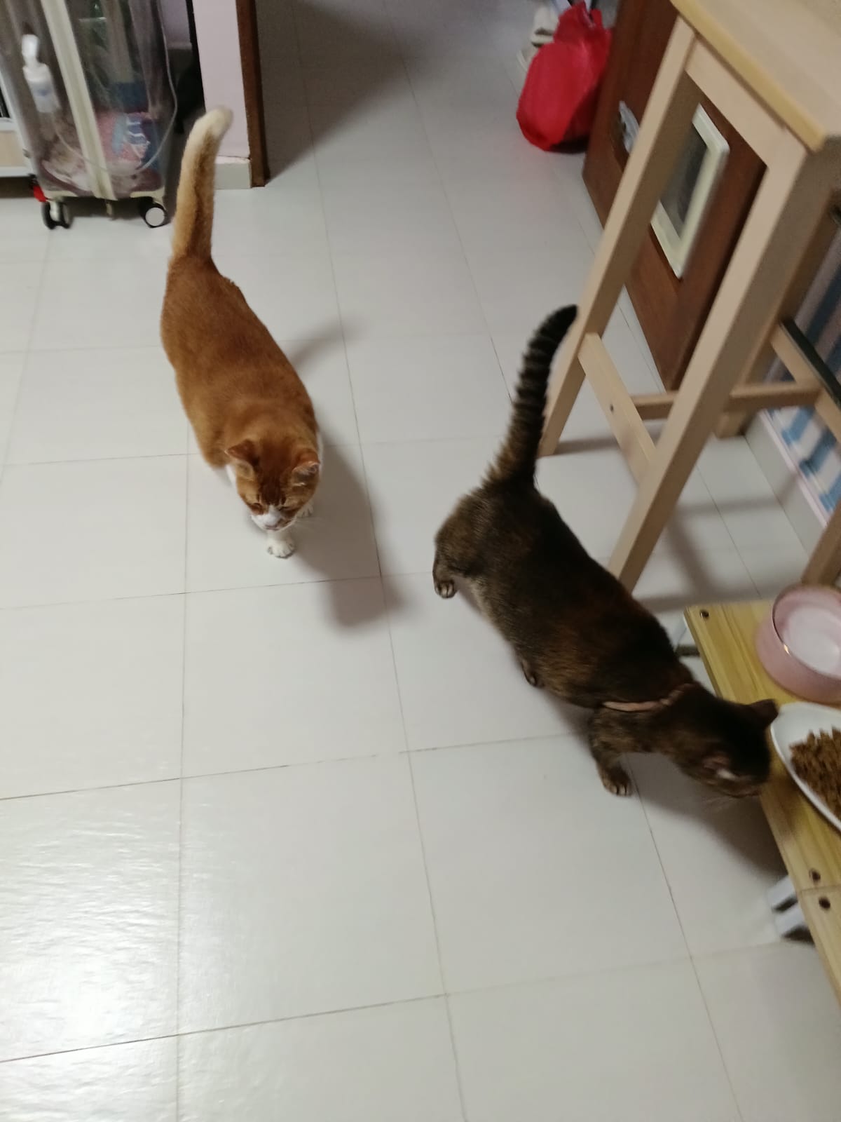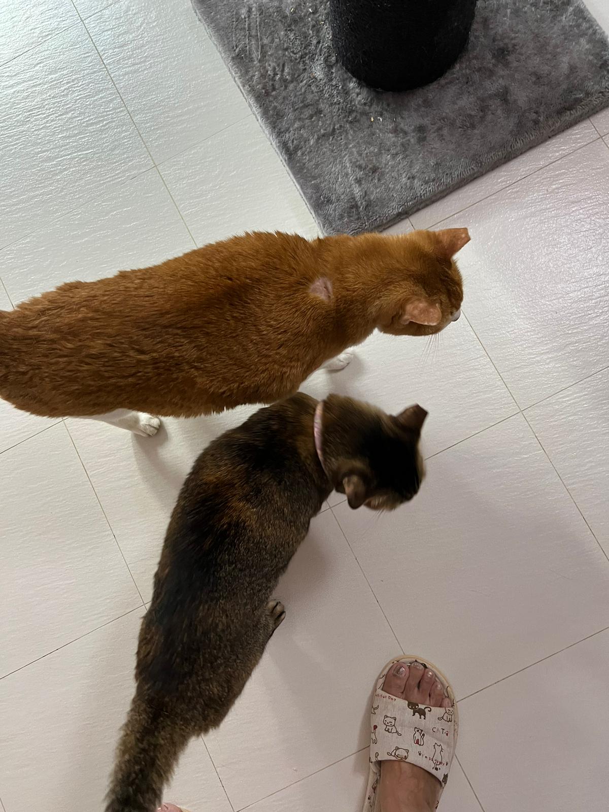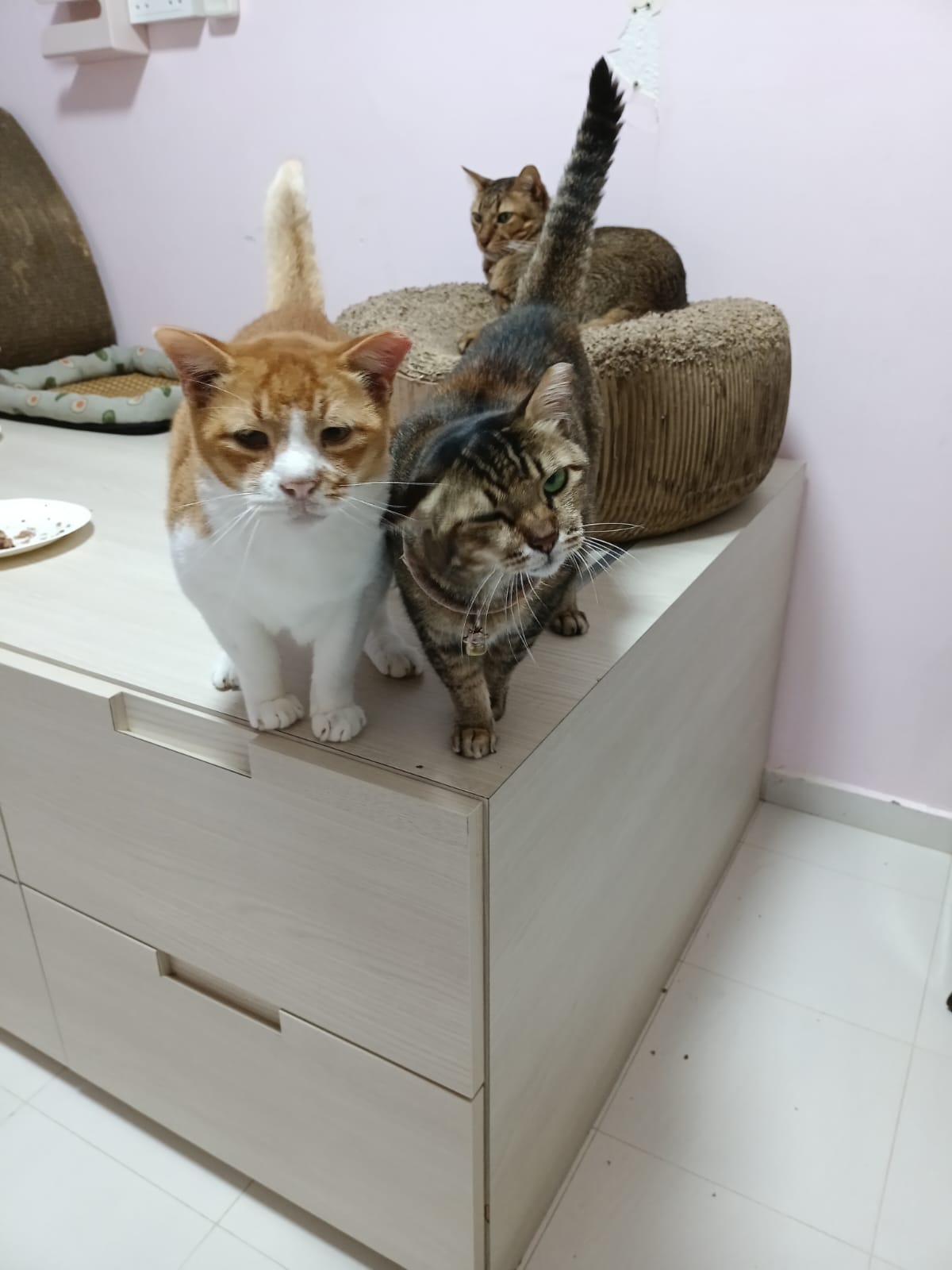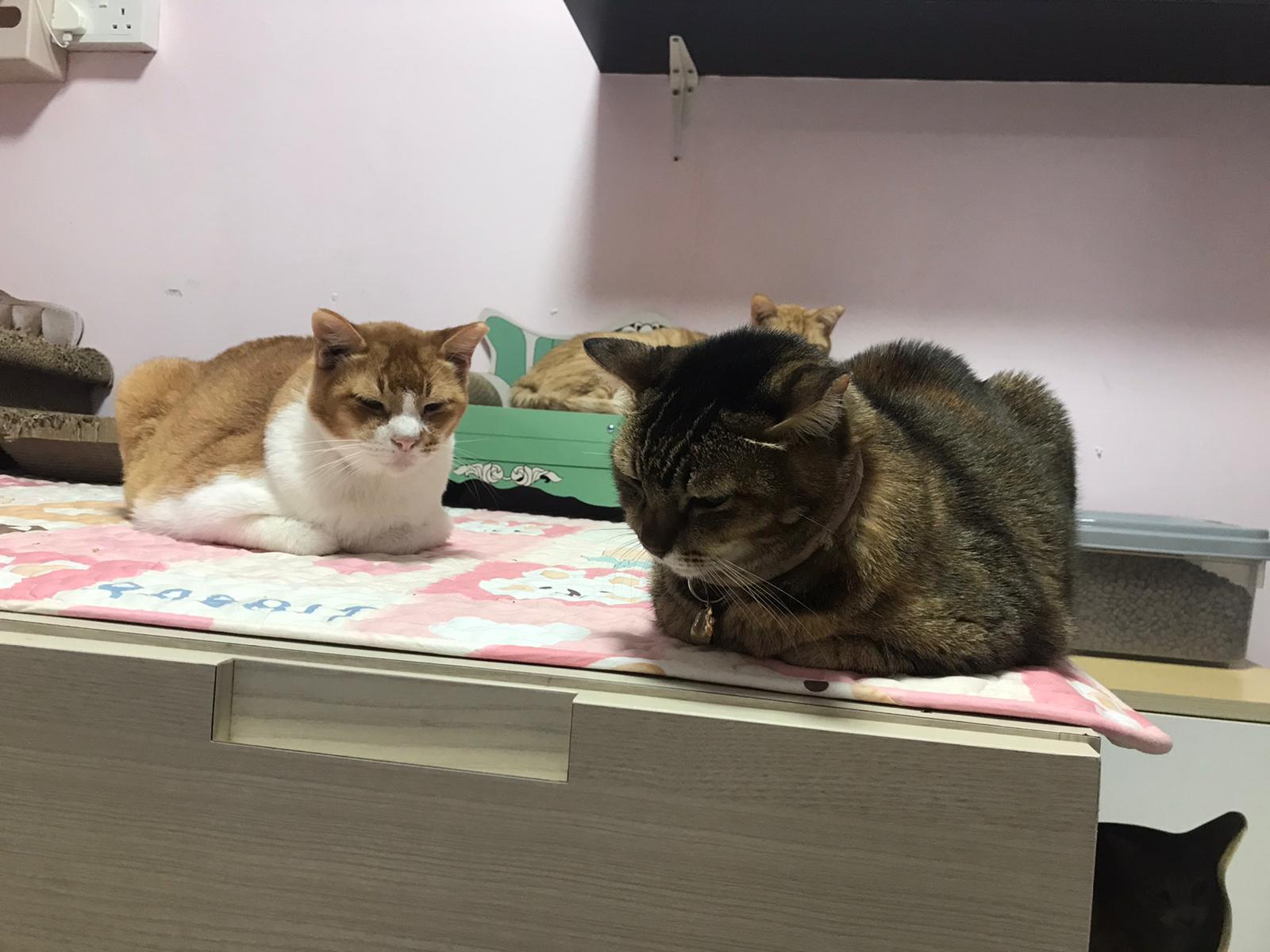 9am+: tao station on top of that window cabinet, sena wanna sit beside her, she stare at her, making sure she didn’t touch her. End up both of them sit together; didnt disturb each other. Kiss the 2, n take photos of them. Ha. When I’m going medi round, sena still do her job la. Flop on floor tell me belly rub when manja putting eye drop.