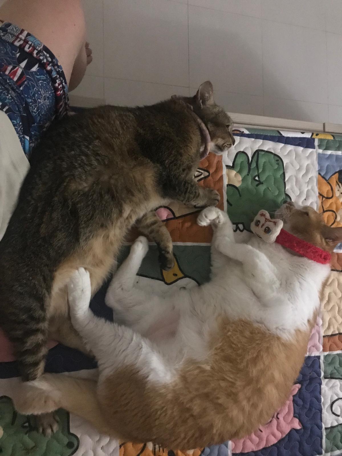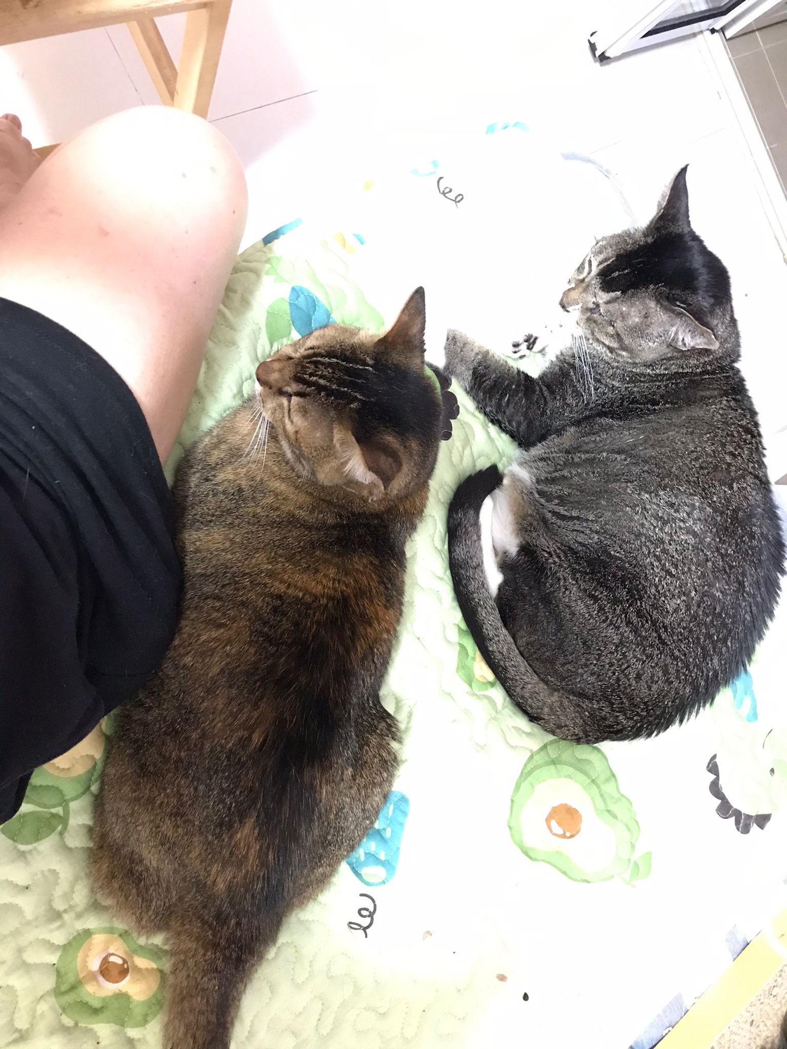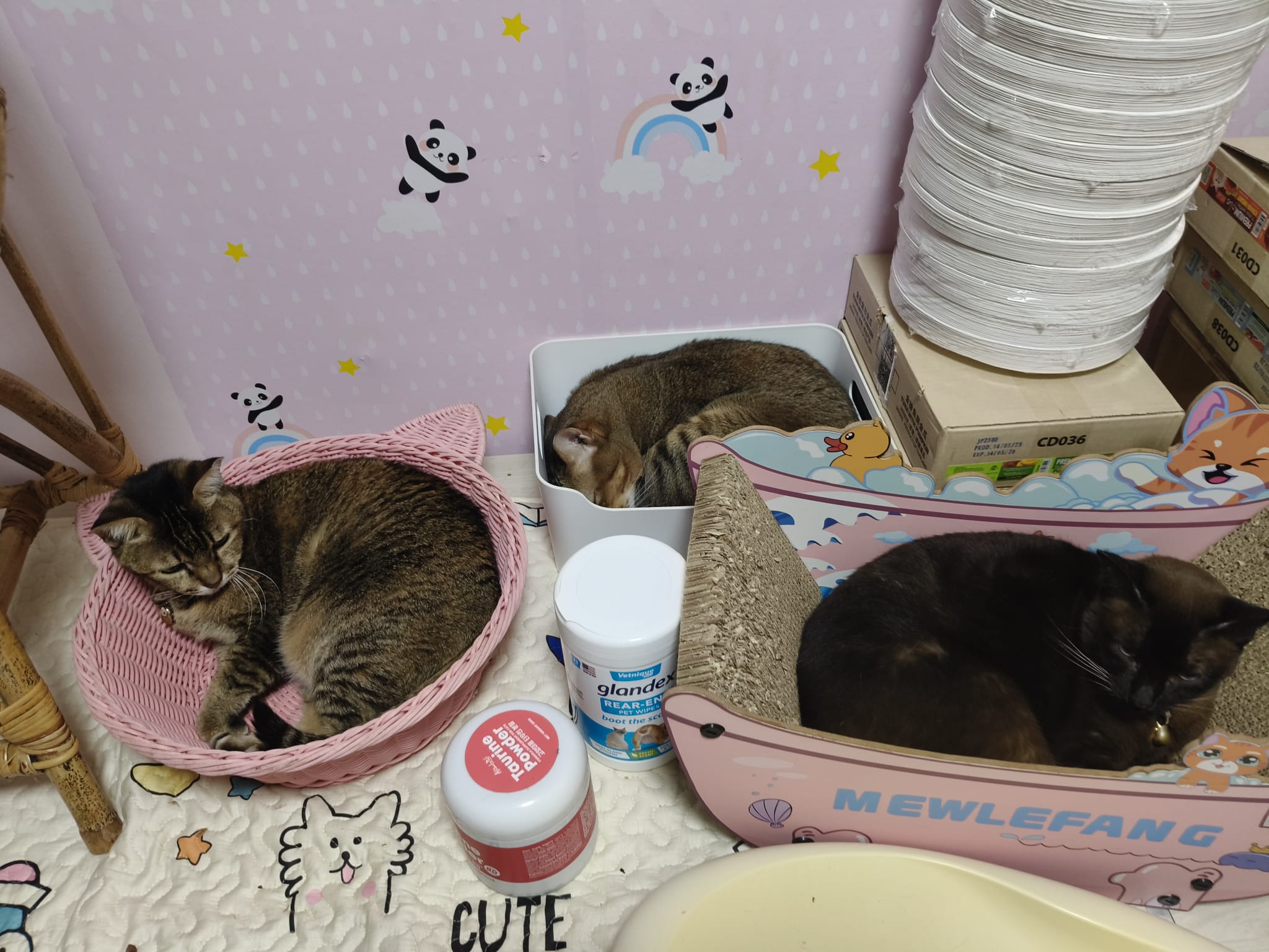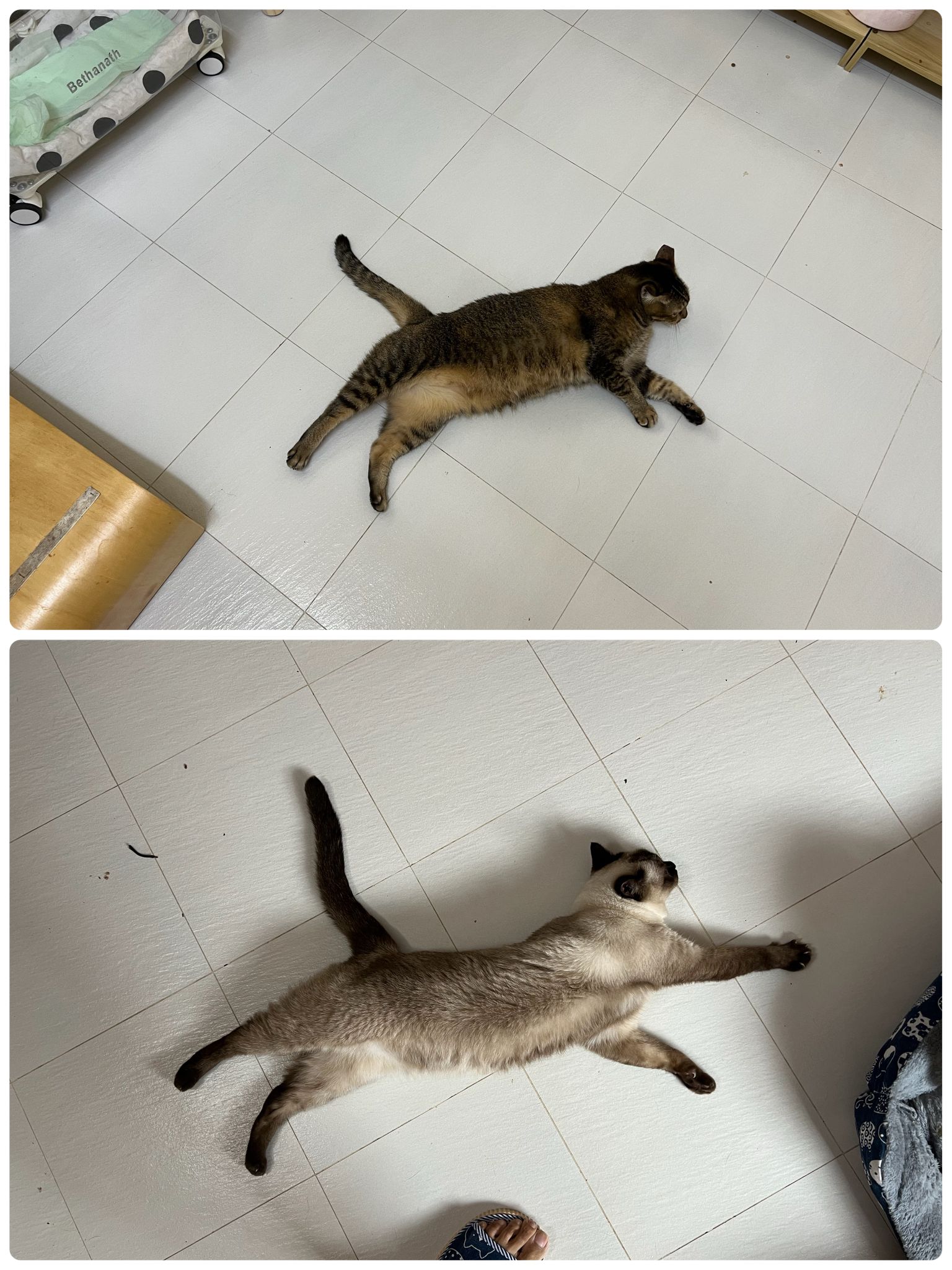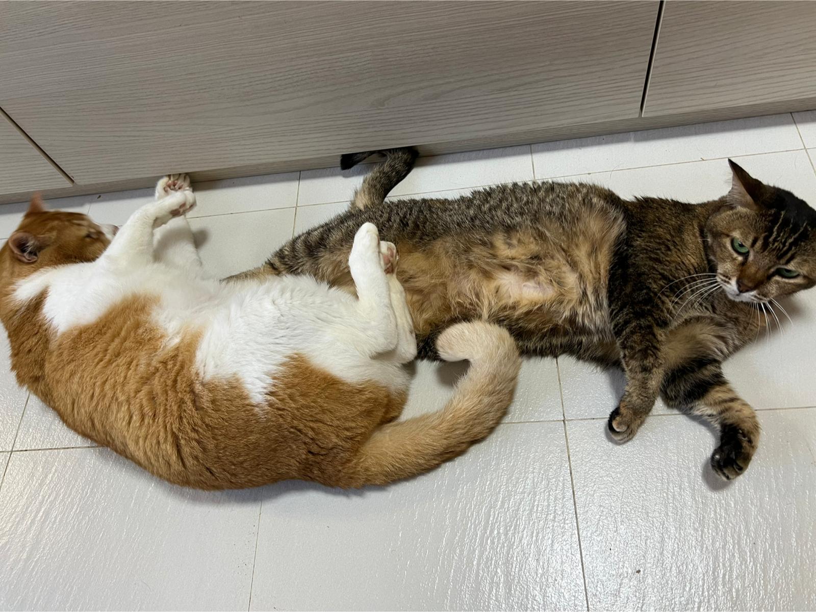 9am+: tao station on top of that window cabinet, sena wanna sit beside her, she stare at her, making sure she didn’t touch her. End up both of them sit together; didnt disturb each other. Kiss the 2, n take photos of them. Ha. When I’m going medi round, sena still do her job la. Flop on floor tell me belly rub when manja putting eye drop.