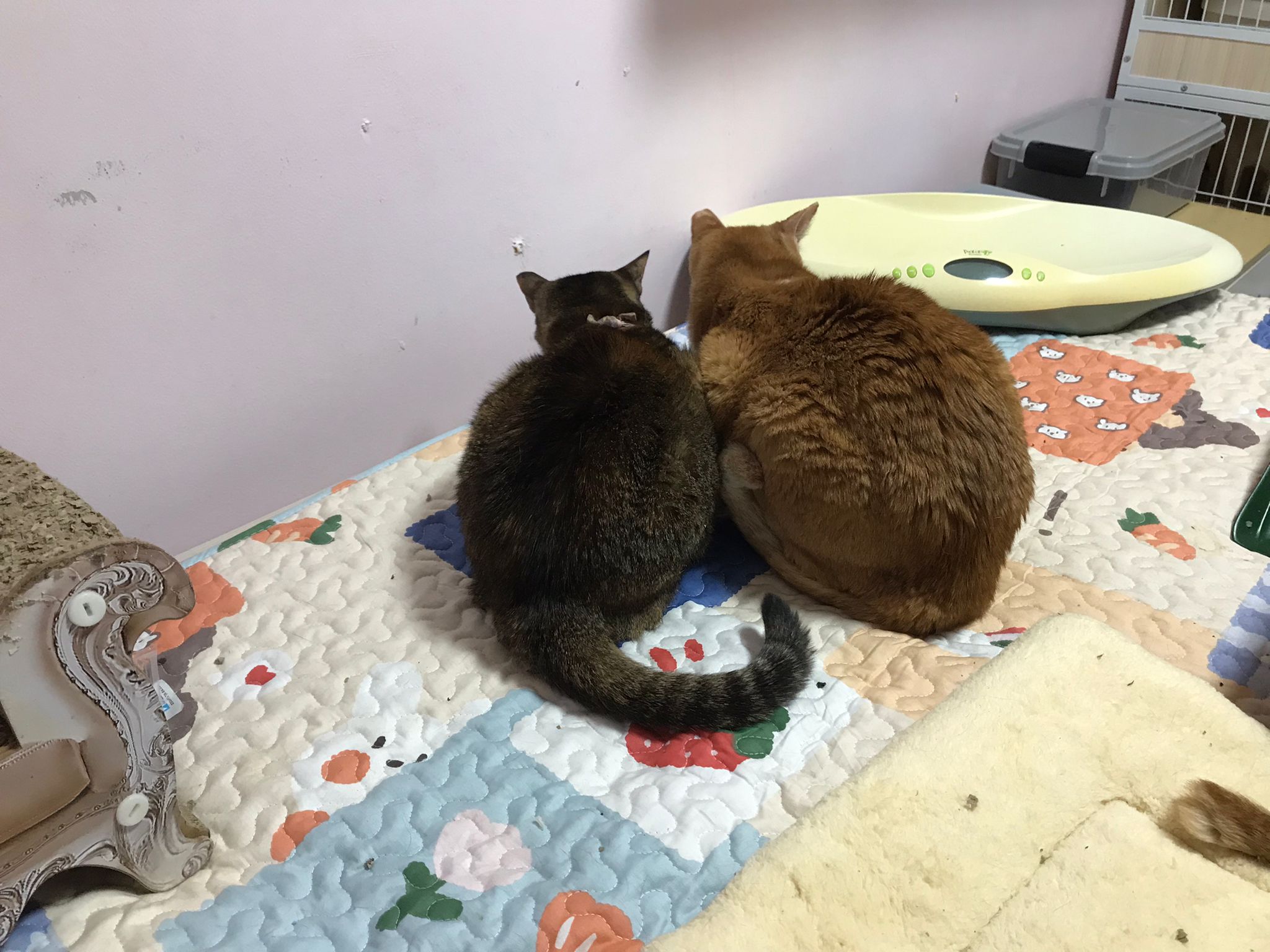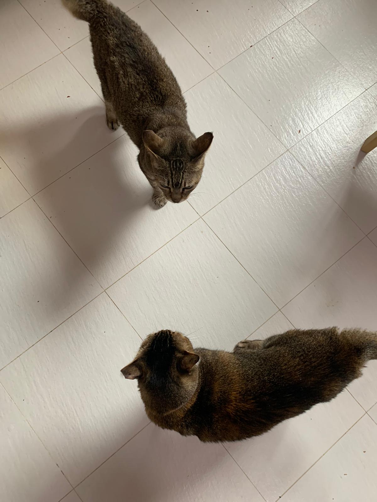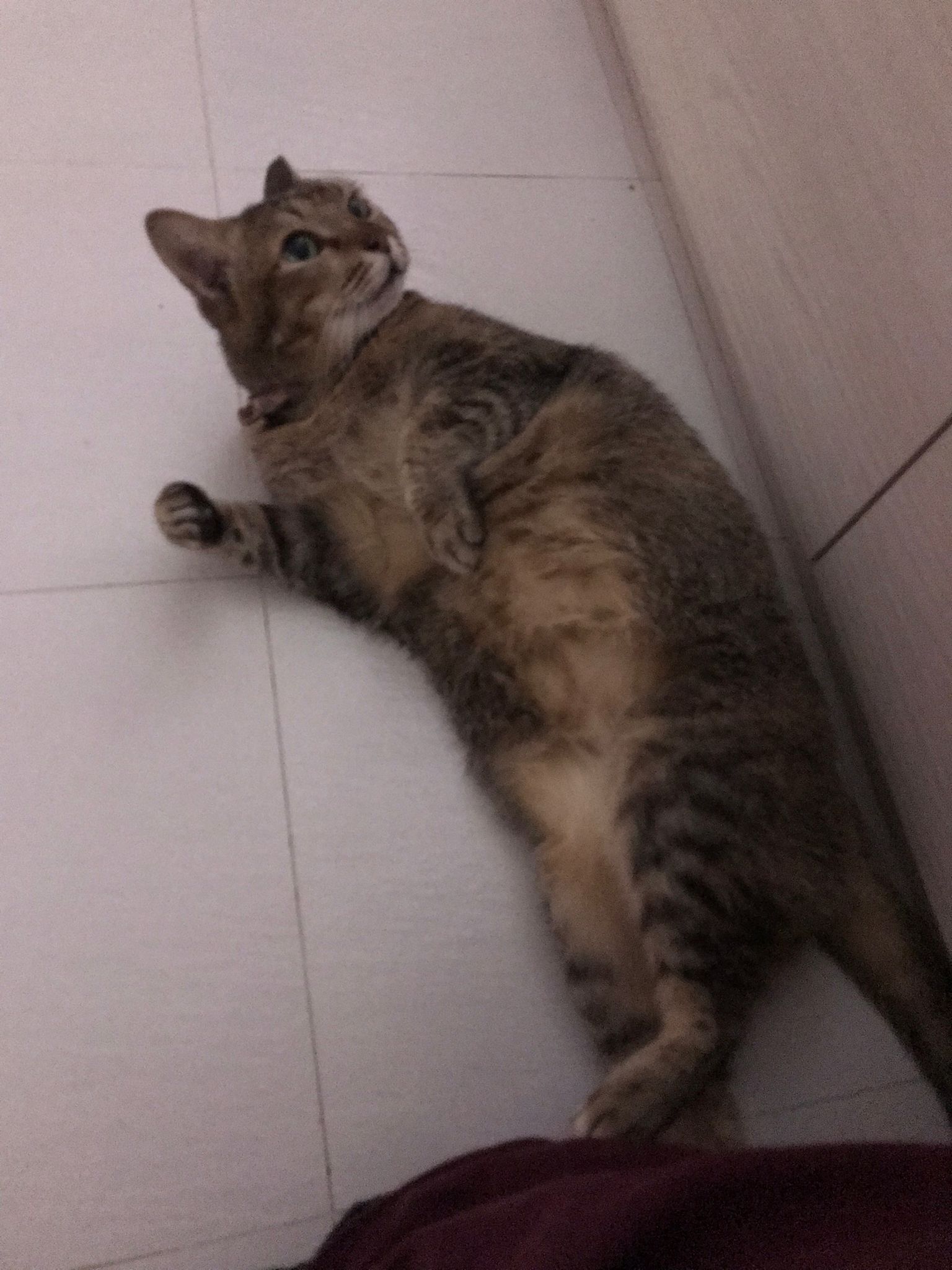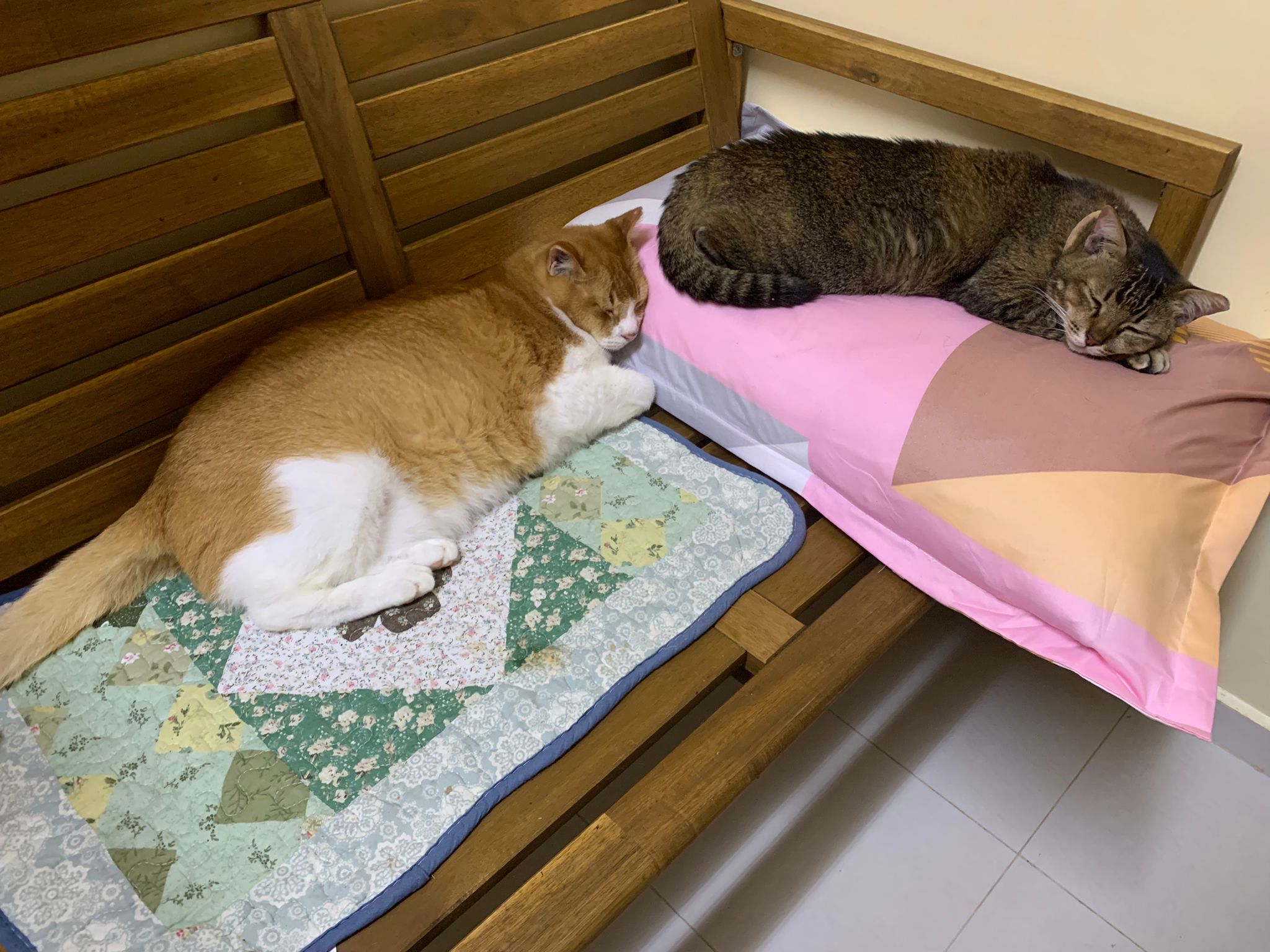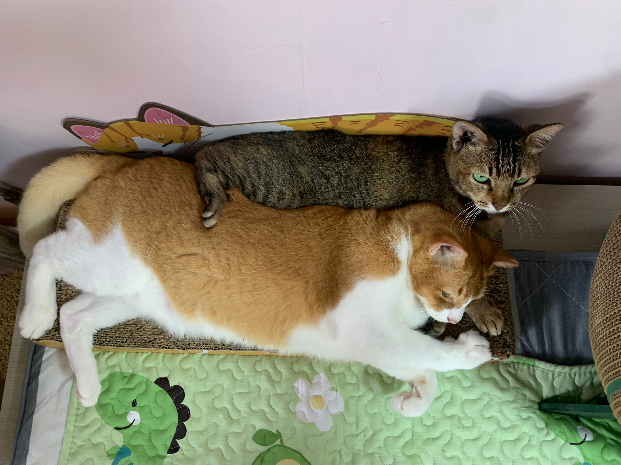 9am+: tao station on top of that window cabinet, sena wanna sit beside her, she stare at her, making sure she didn’t touch her. End up both of them sit together; didnt disturb each other. Kiss the 2, n take photos of them. Ha. When I’m going medi round, sena still do her job la. Flop on floor tell me belly rub when manja putting eye drop.