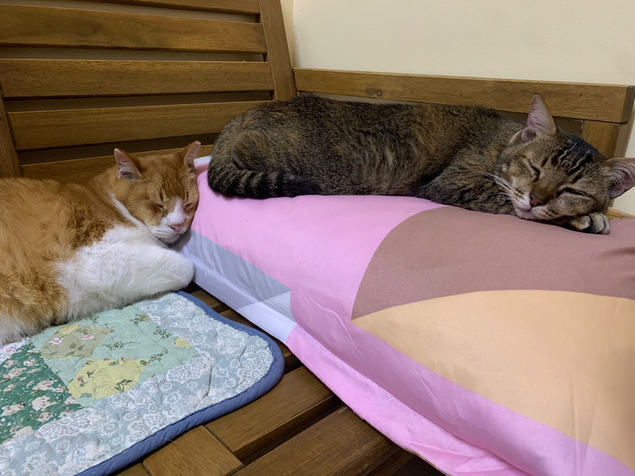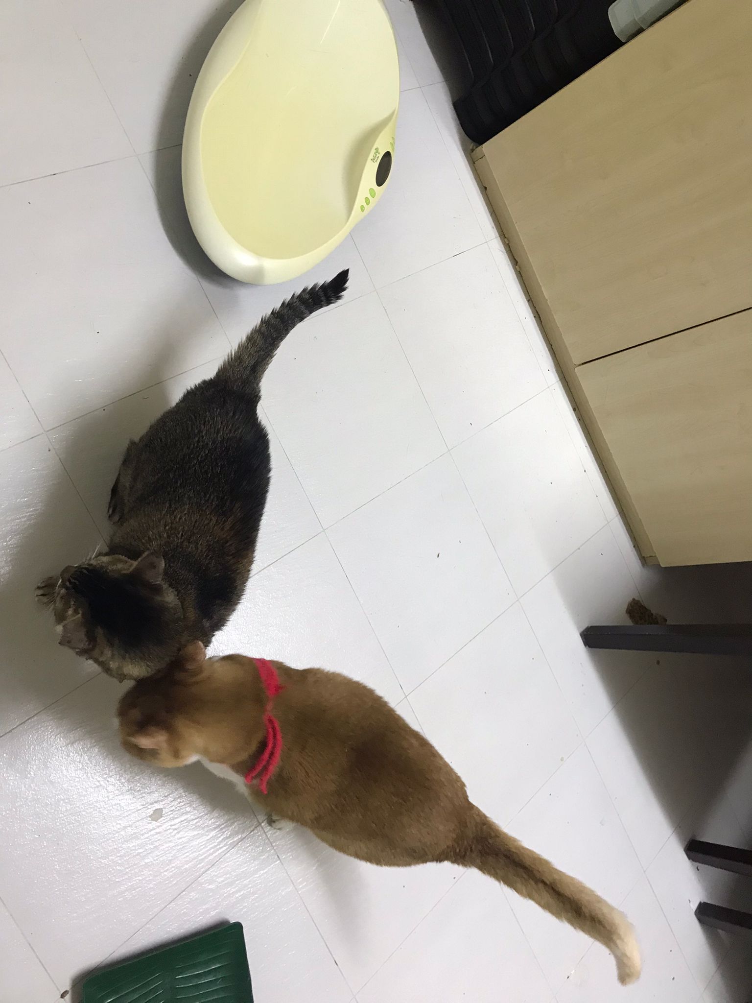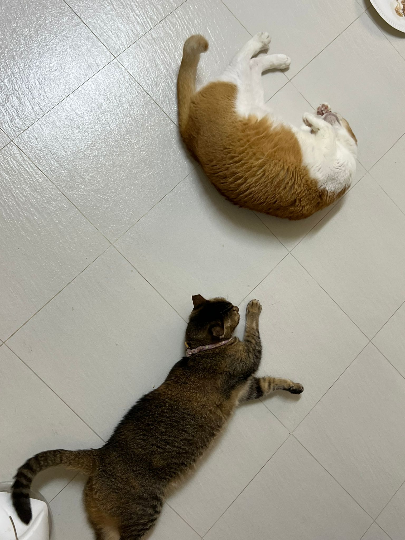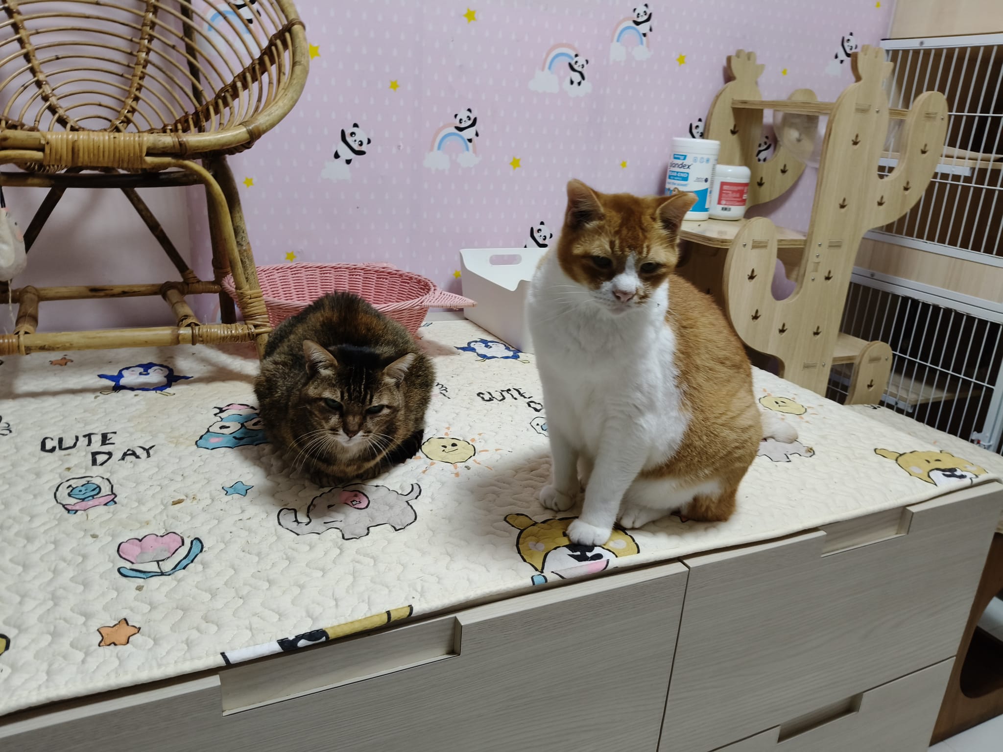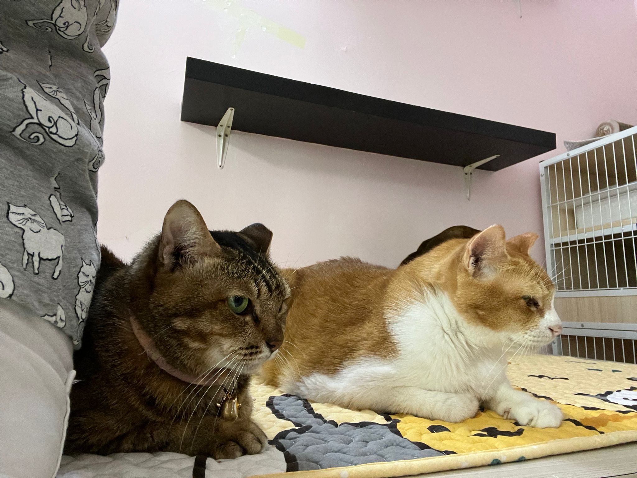 9am+: tao station on top of that window cabinet, sena wanna sit beside her, she stare at her, making sure she didn’t touch her. End up both of them sit together; didnt disturb each other. Kiss the 2, n take photos of them. Ha. When I’m going medi round, sena still do her job la. Flop on floor tell me belly rub when manja putting eye drop.