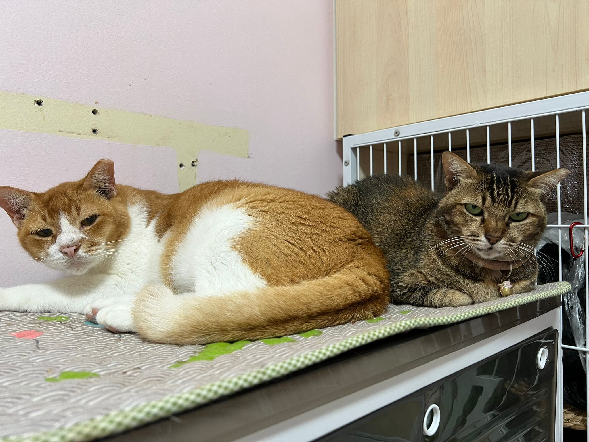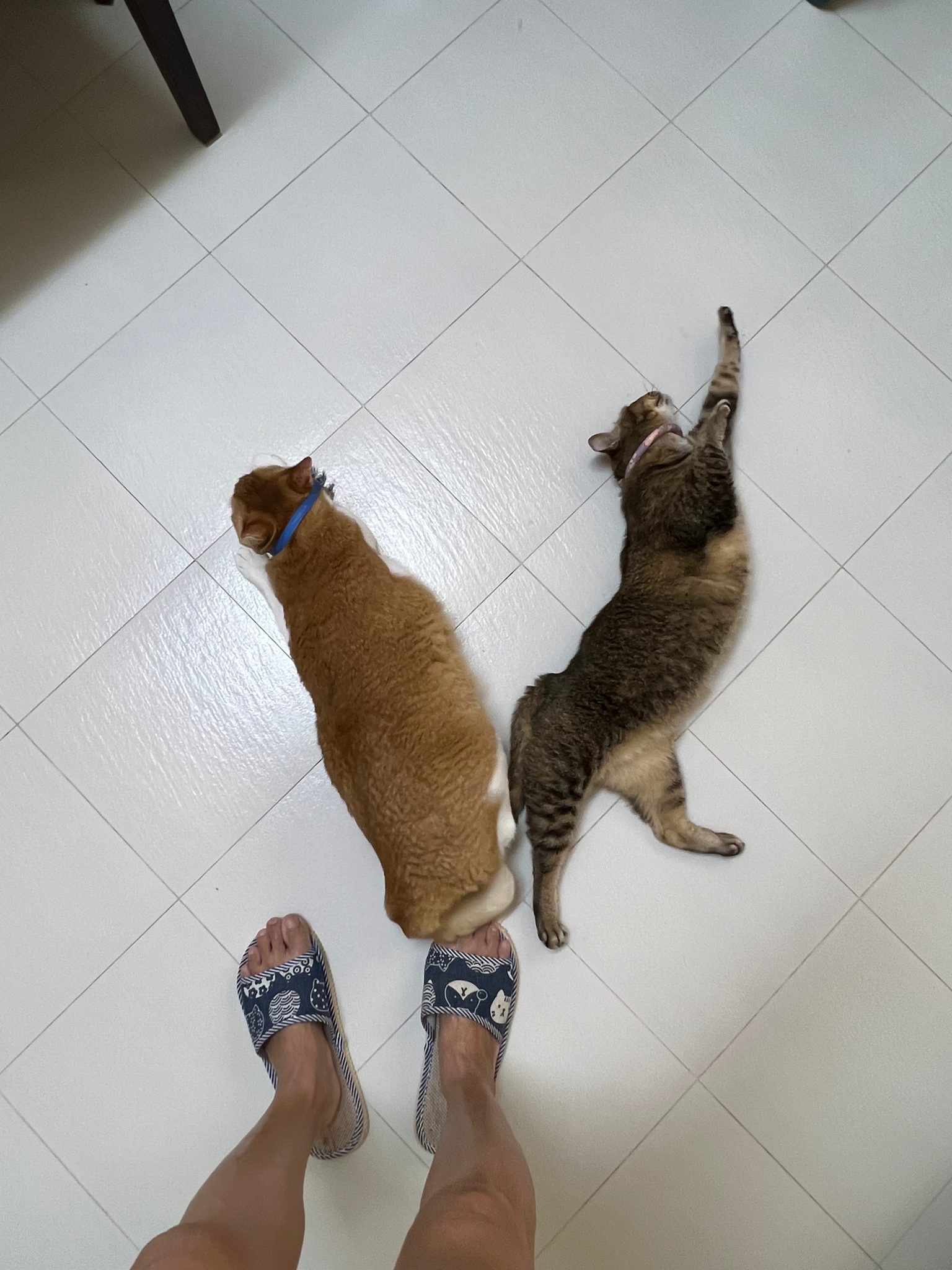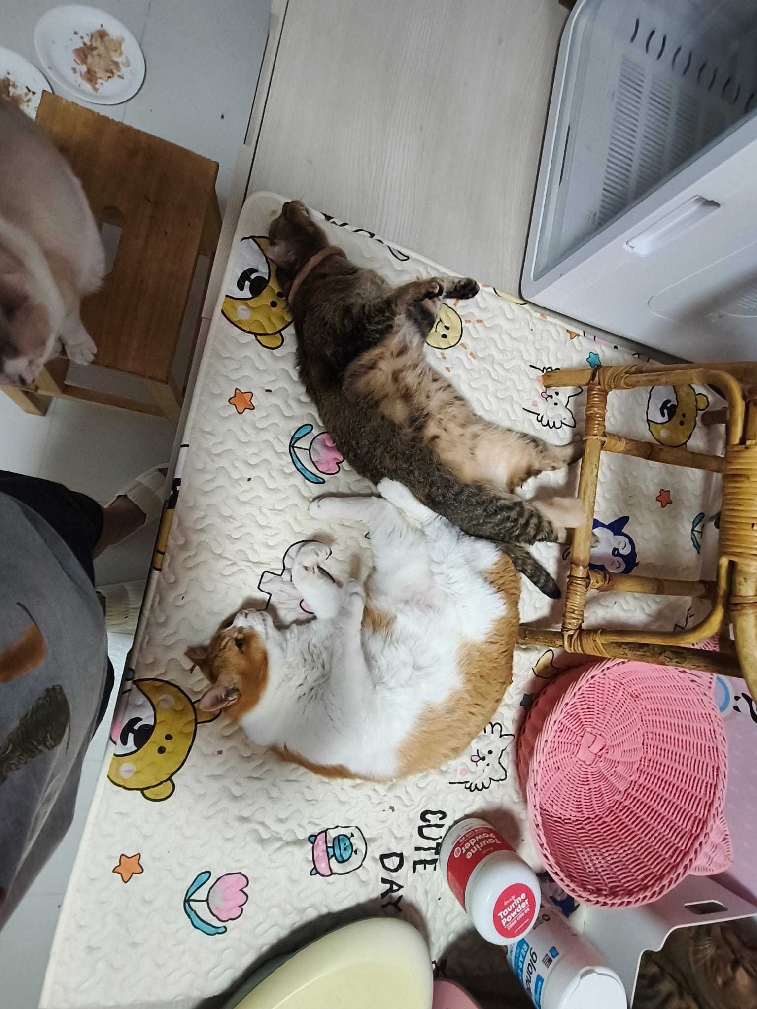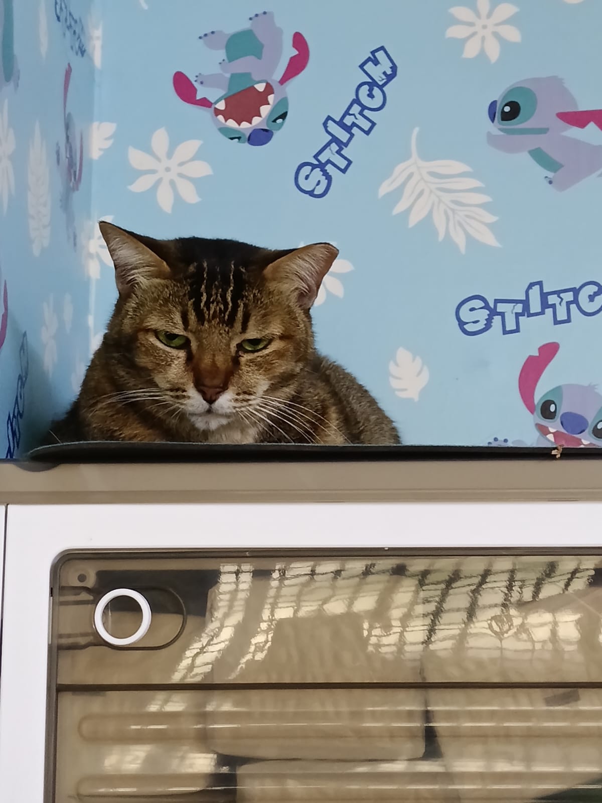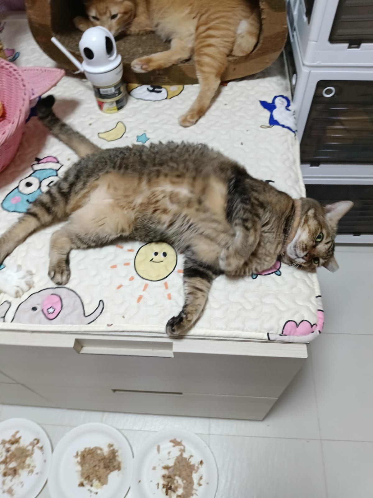 9am+: tao station on top of that window cabinet, sena wanna sit beside her, she stare at her, making sure she didn’t touch her. End up both of them sit together; didnt disturb each other. Kiss the 2, n take photos of them. Ha. When I’m going medi round, sena still do her job la. Flop on floor tell me belly rub when manja putting eye drop.