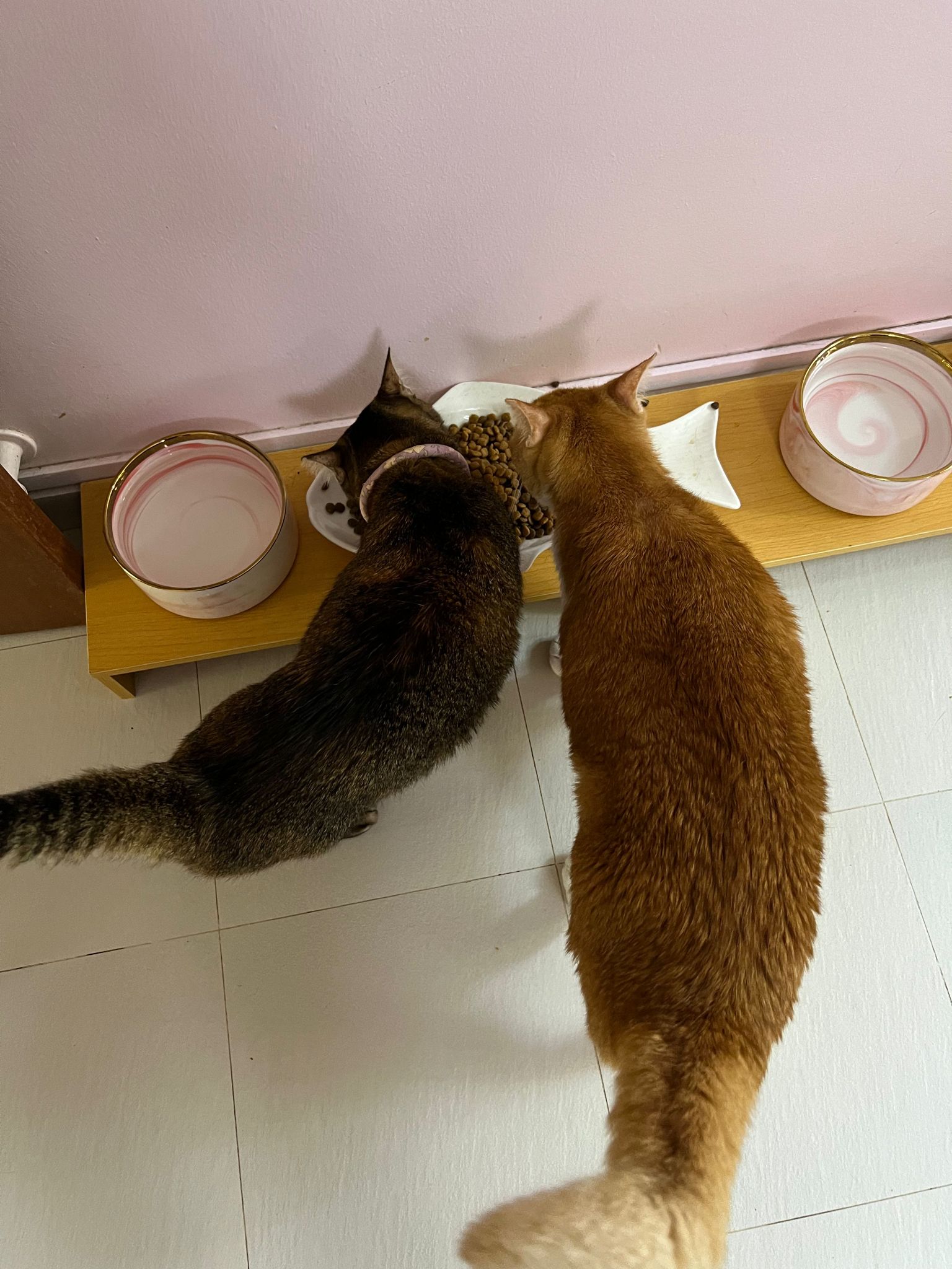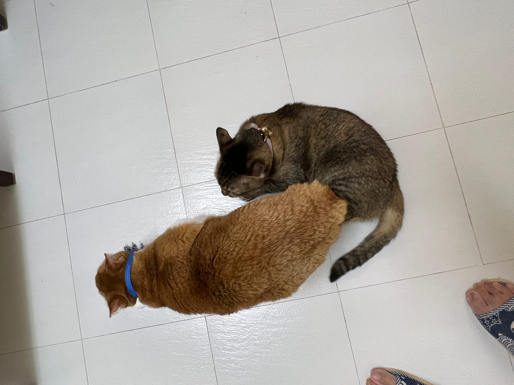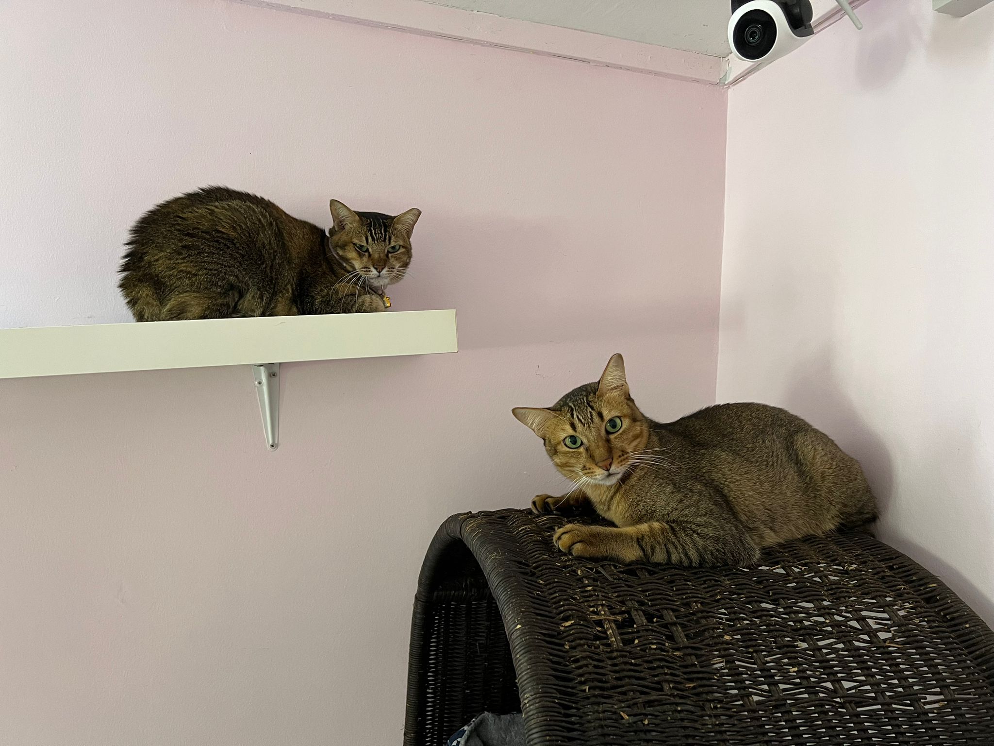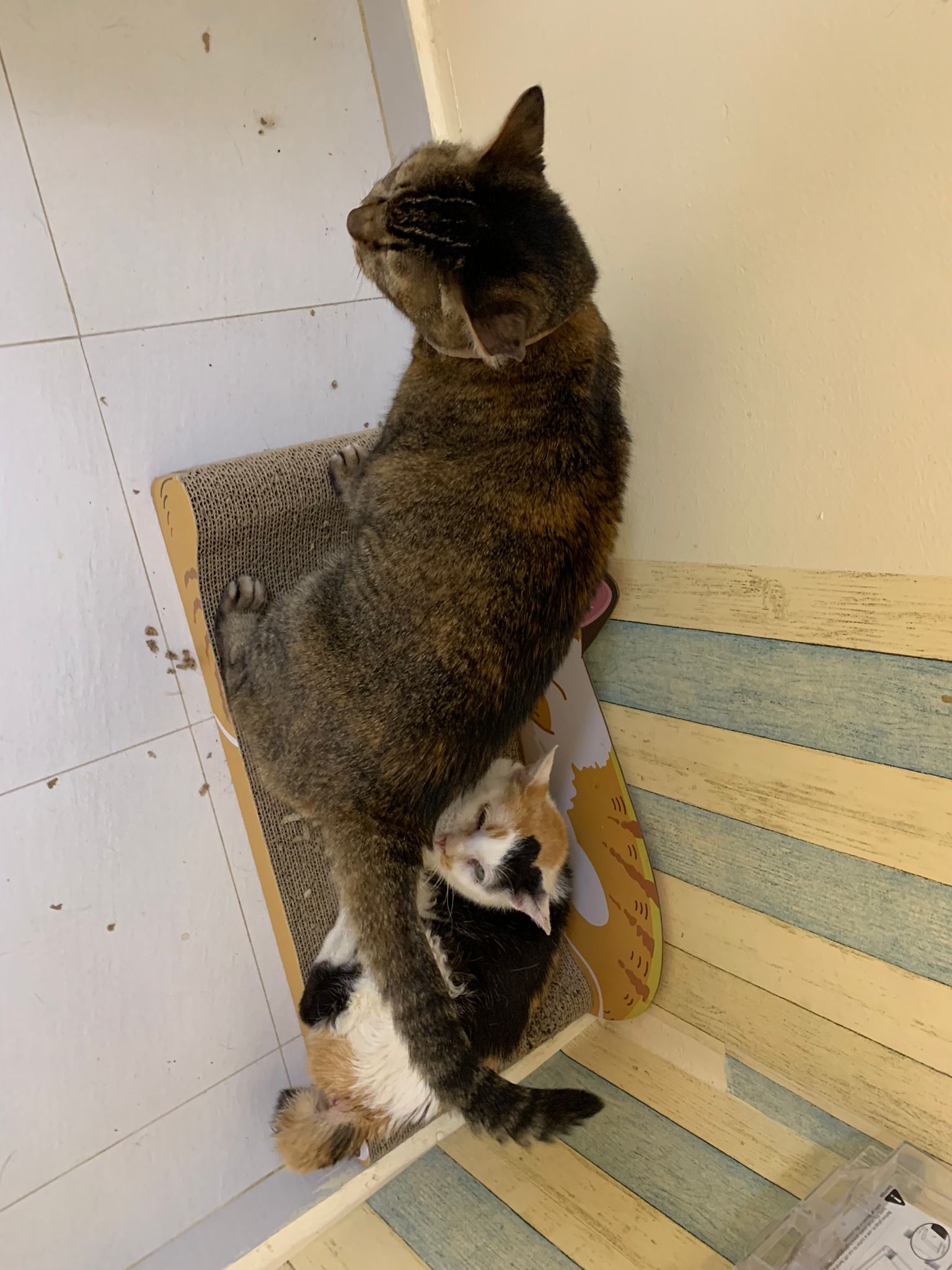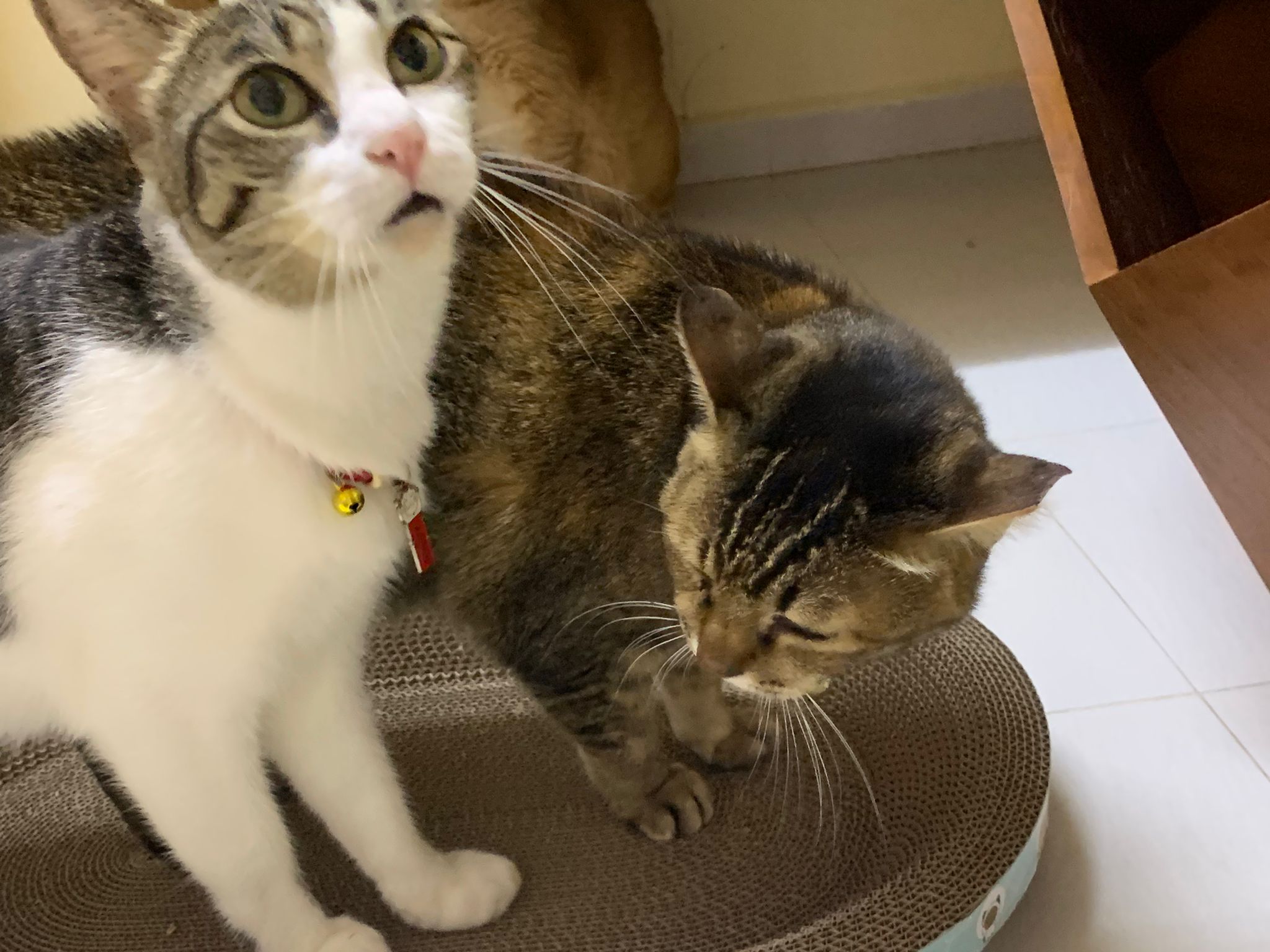 9am+: tao station on top of that window cabinet, sena wanna sit beside her, she stare at her, making sure she didn’t touch her. End up both of them sit together; didnt disturb each other. Kiss the 2, n take photos of them. Ha. When I’m going medi round, sena still do her job la. Flop on floor tell me belly rub when manja putting eye drop.