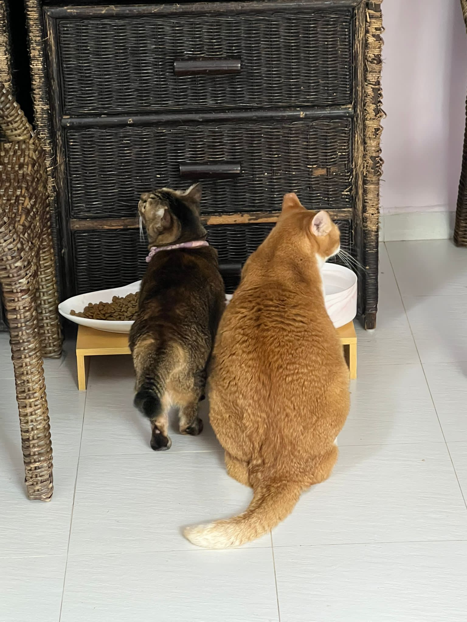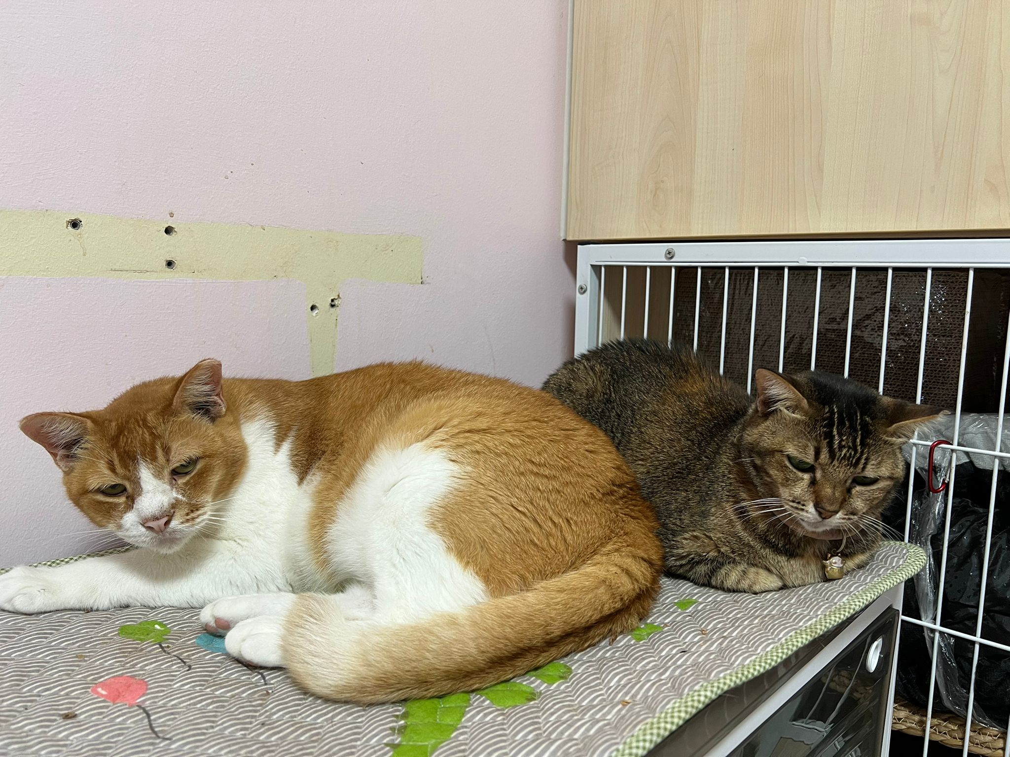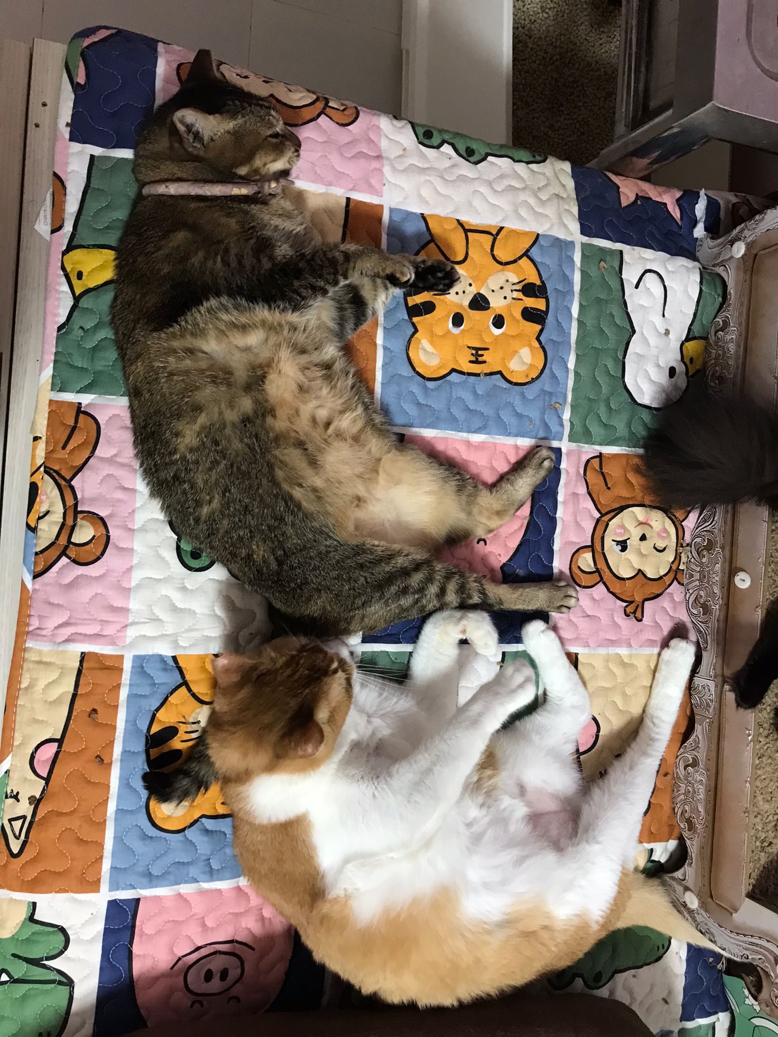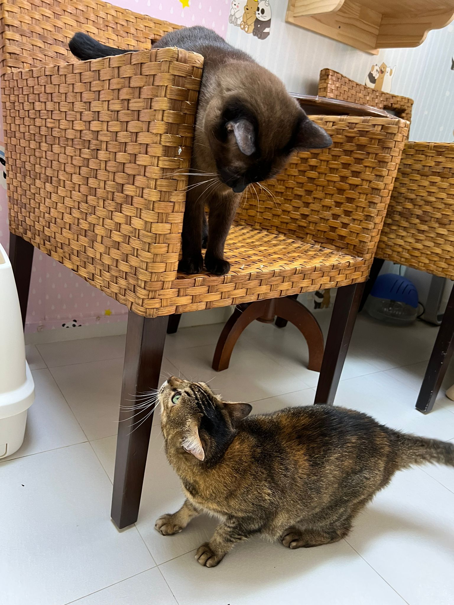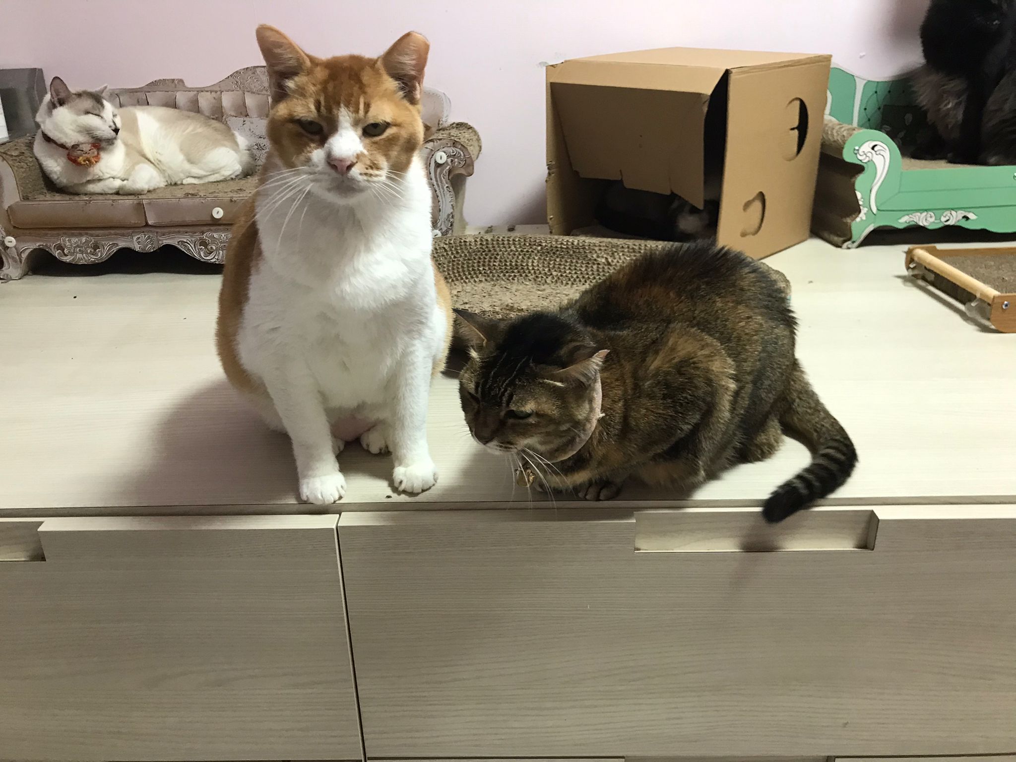 9am+: tao station on top of that window cabinet, sena wanna sit beside her, she stare at her, making sure she didn’t touch her. End up both of them sit together; didnt disturb each other. Kiss the 2, n take photos of them. Ha. When I’m going medi round, sena still do her job la. Flop on floor tell me belly rub when manja putting eye drop.