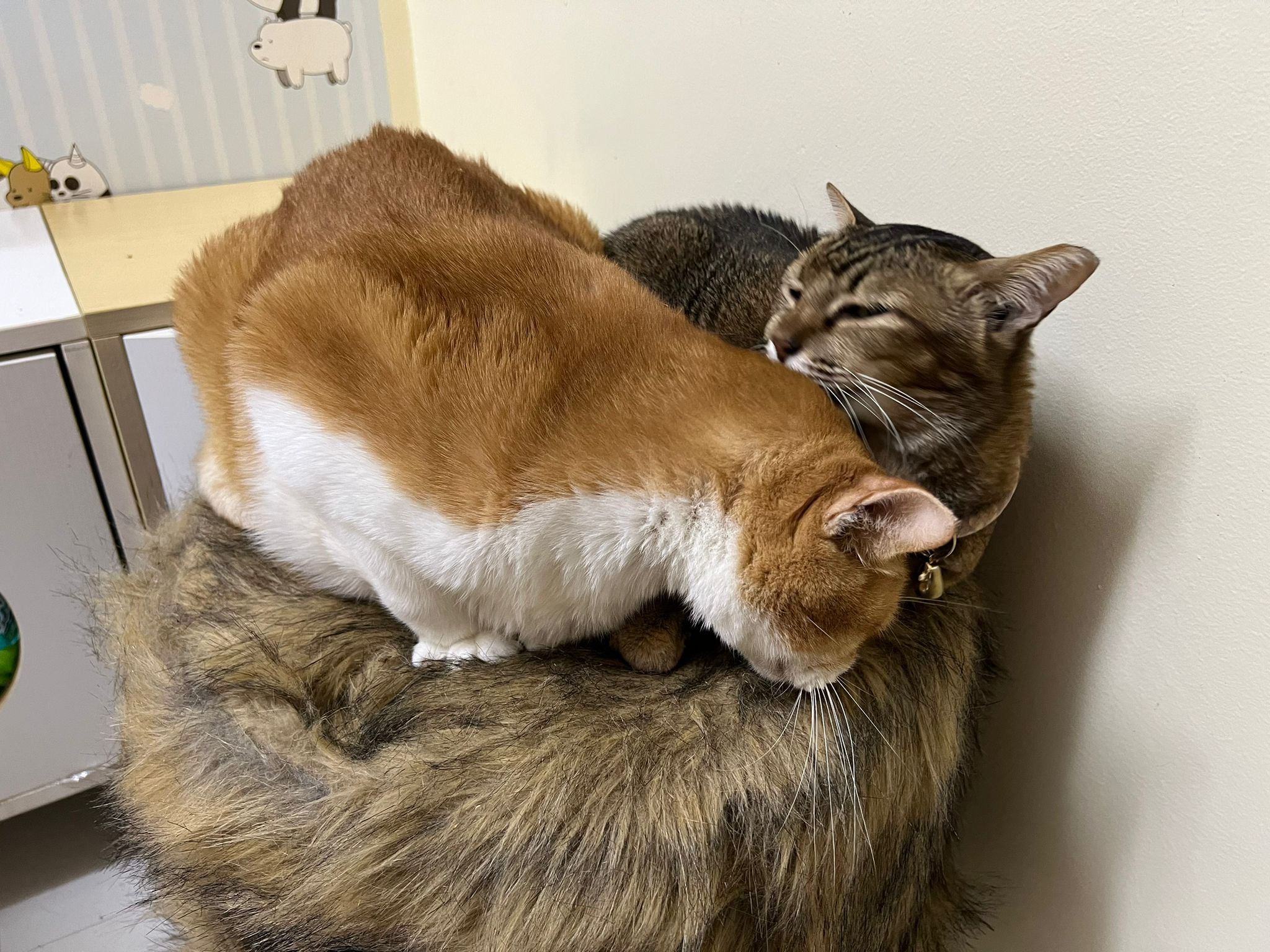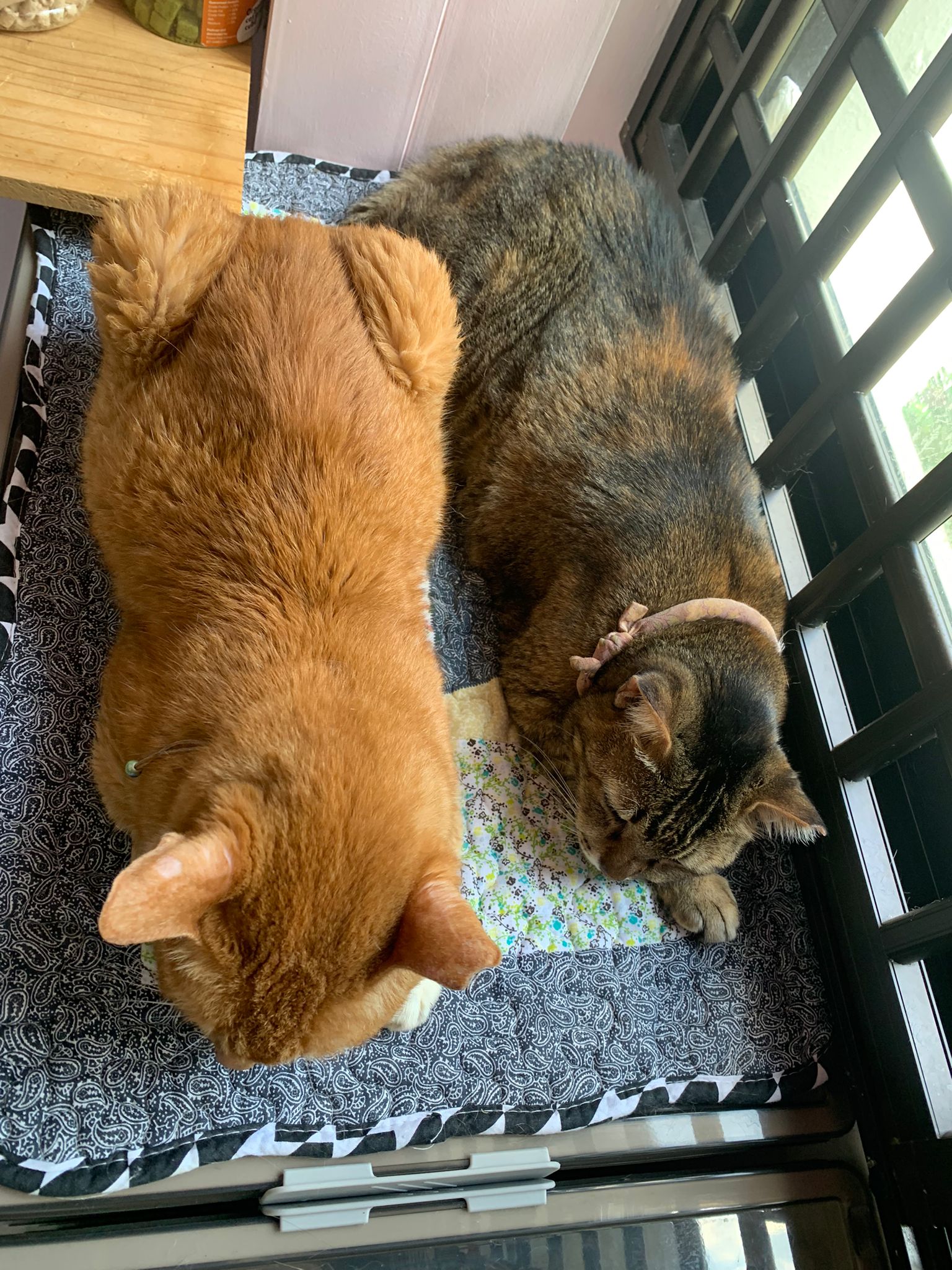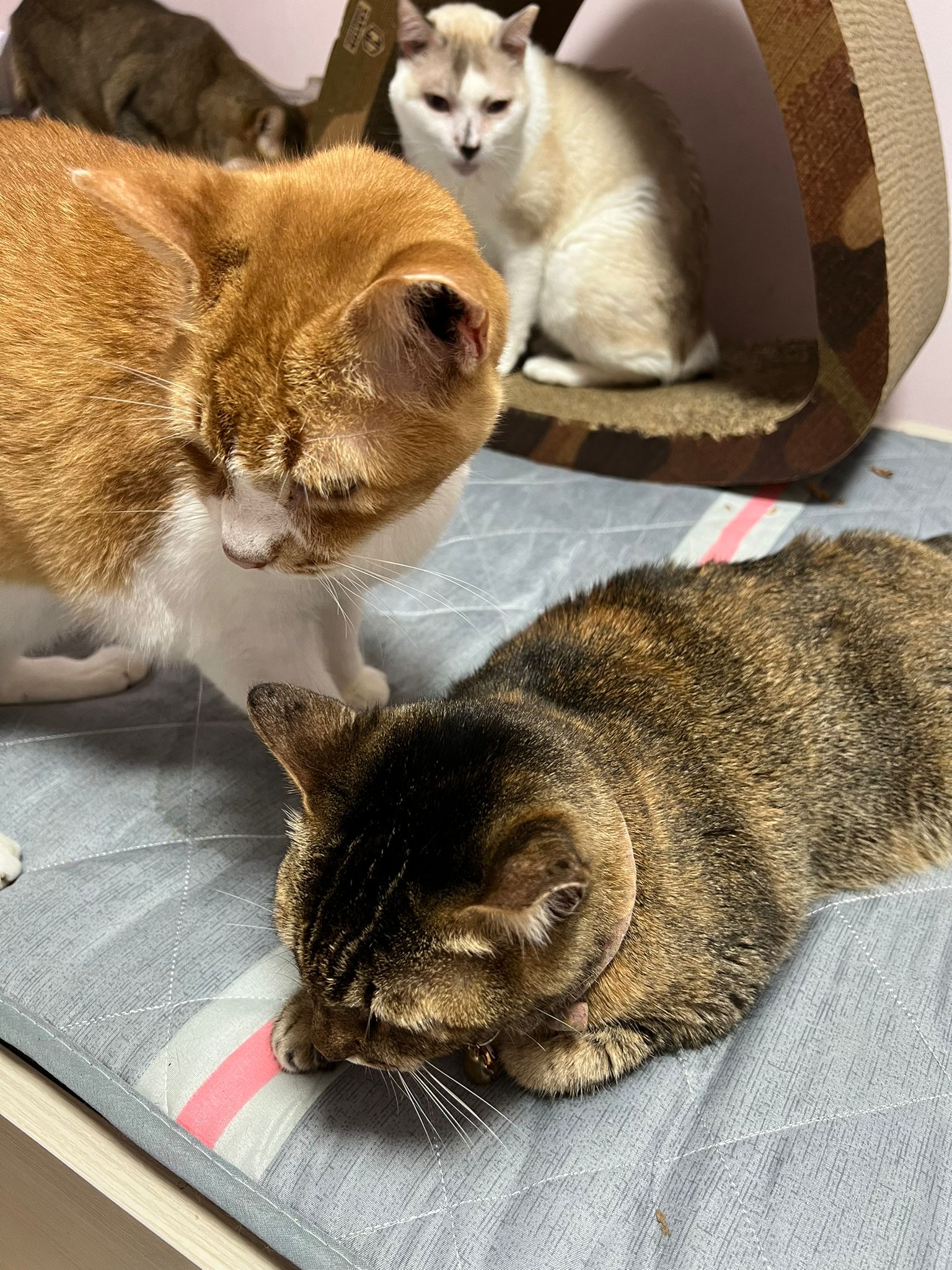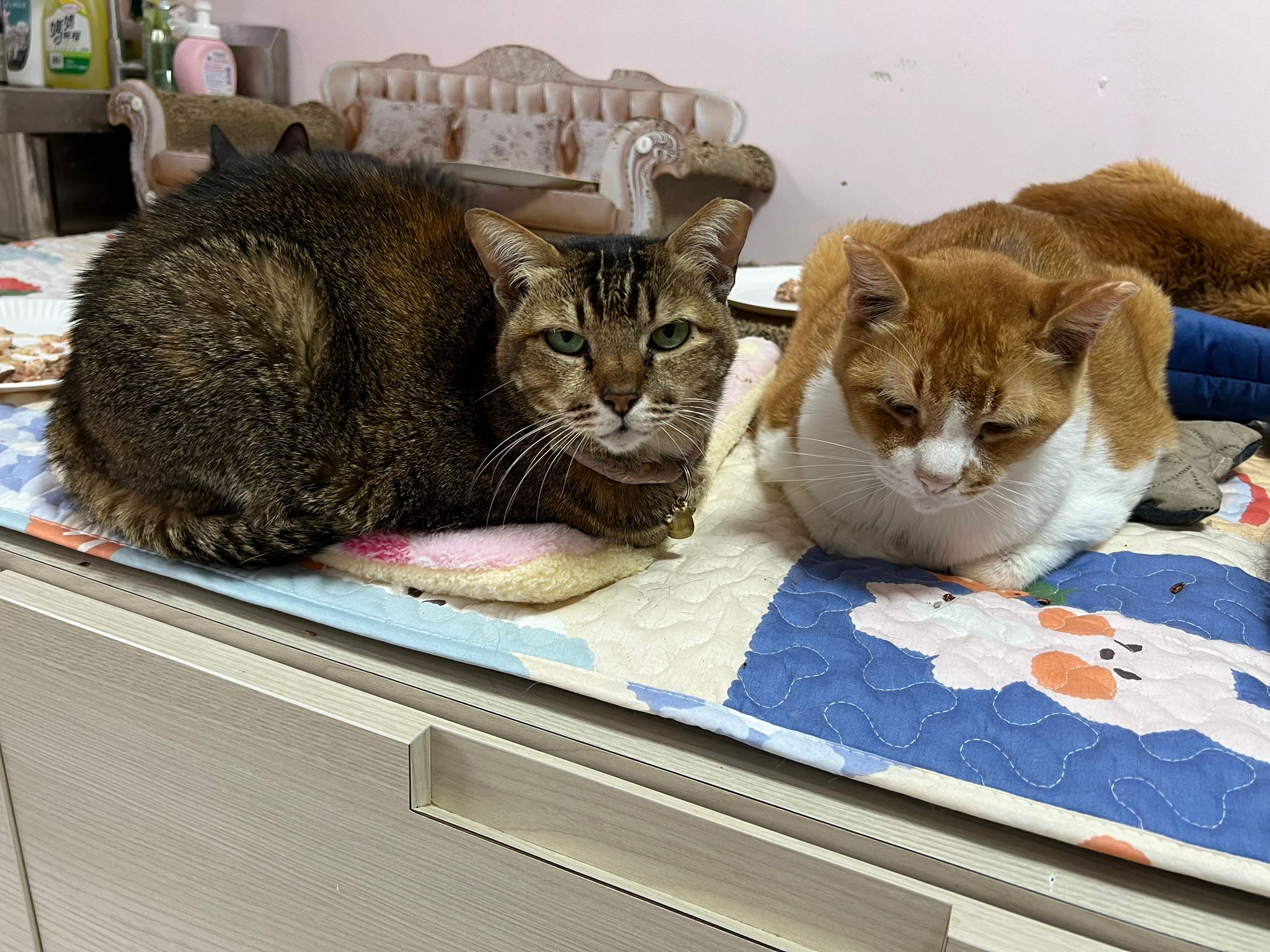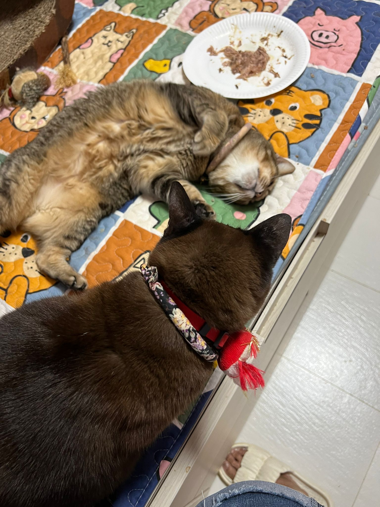 9am+: tao station on top of that window cabinet, sena wanna sit beside her, she stare at her, making sure she didn’t touch her. End up both of them sit together; didnt disturb each other. Kiss the 2, n take photos of them. Ha. When I’m going medi round, sena still do her job la. Flop on floor tell me belly rub when manja putting eye drop.