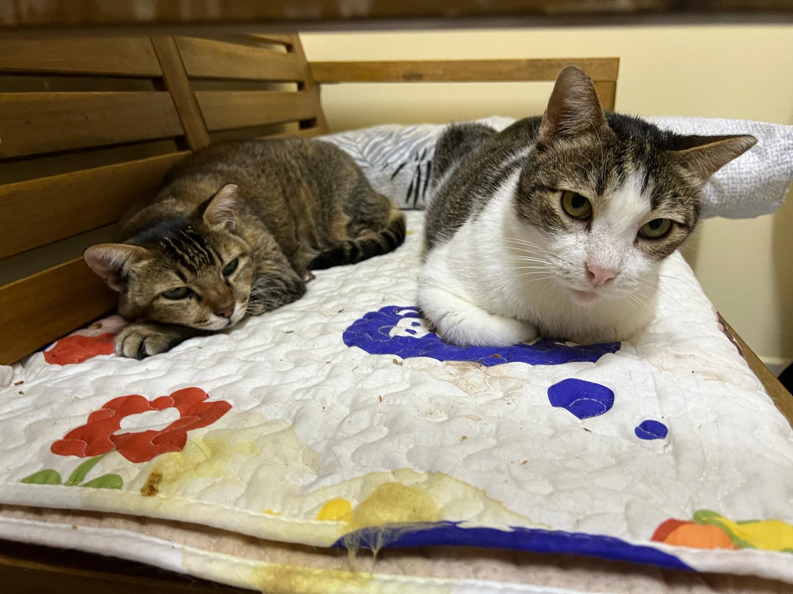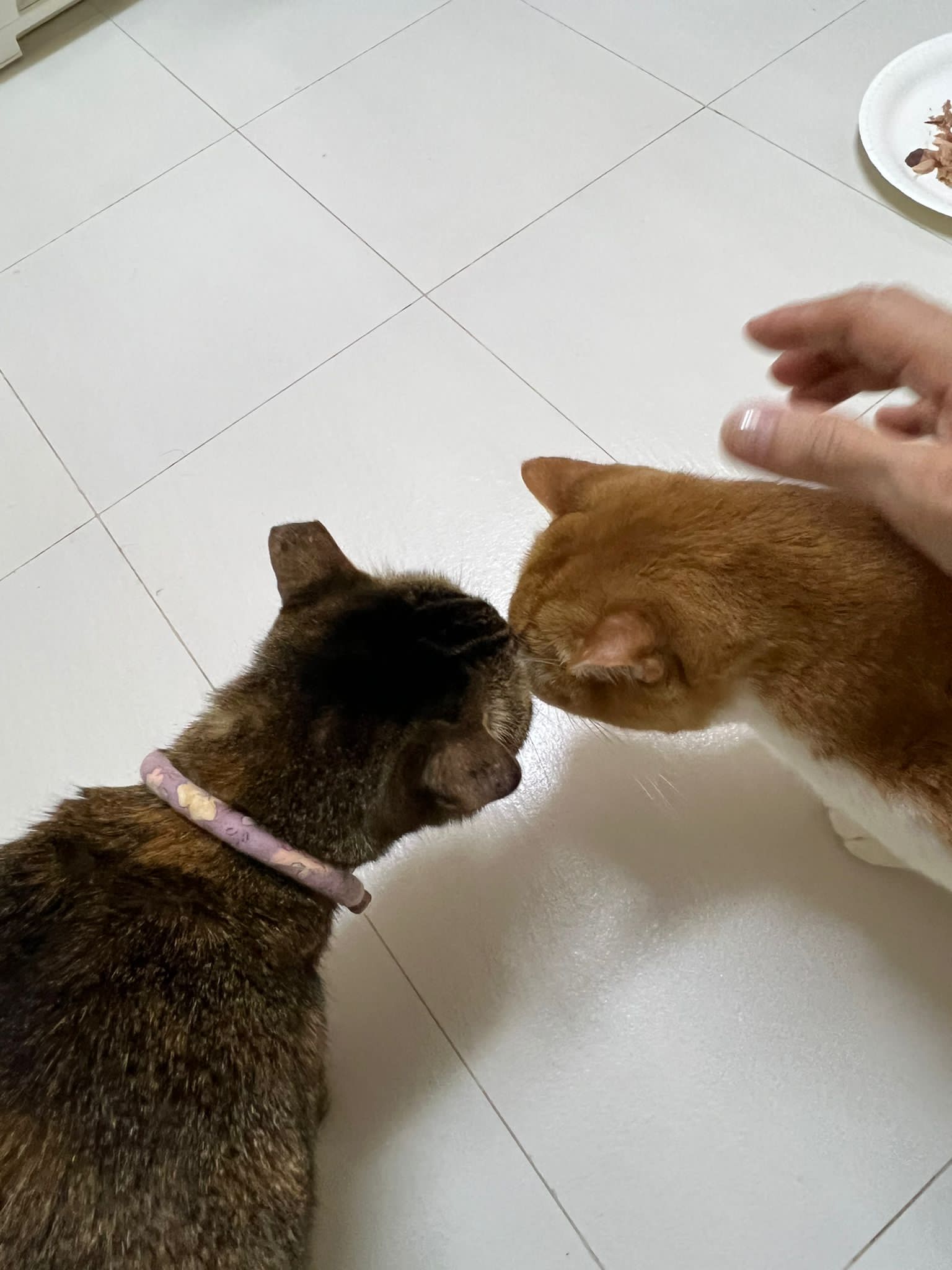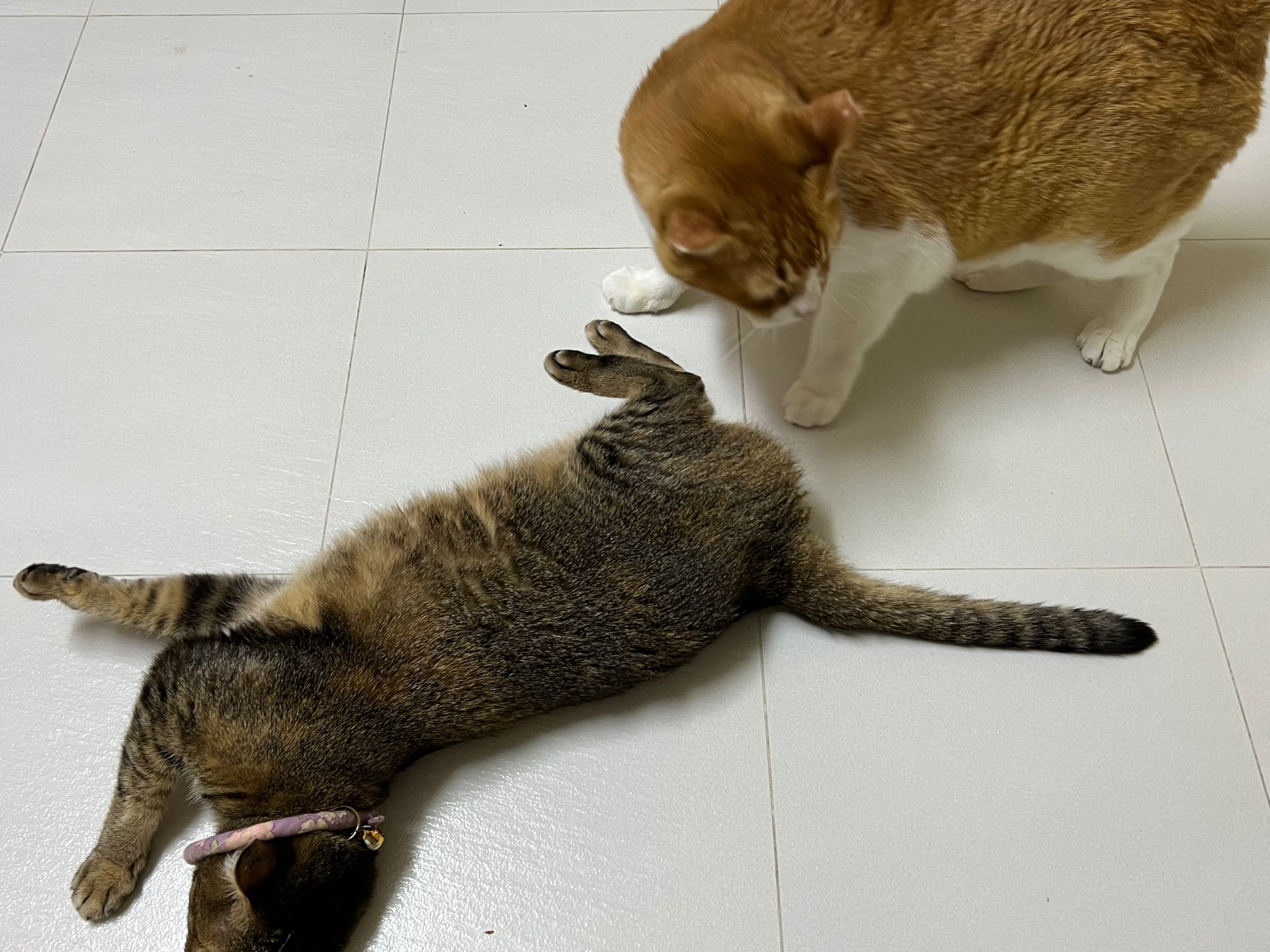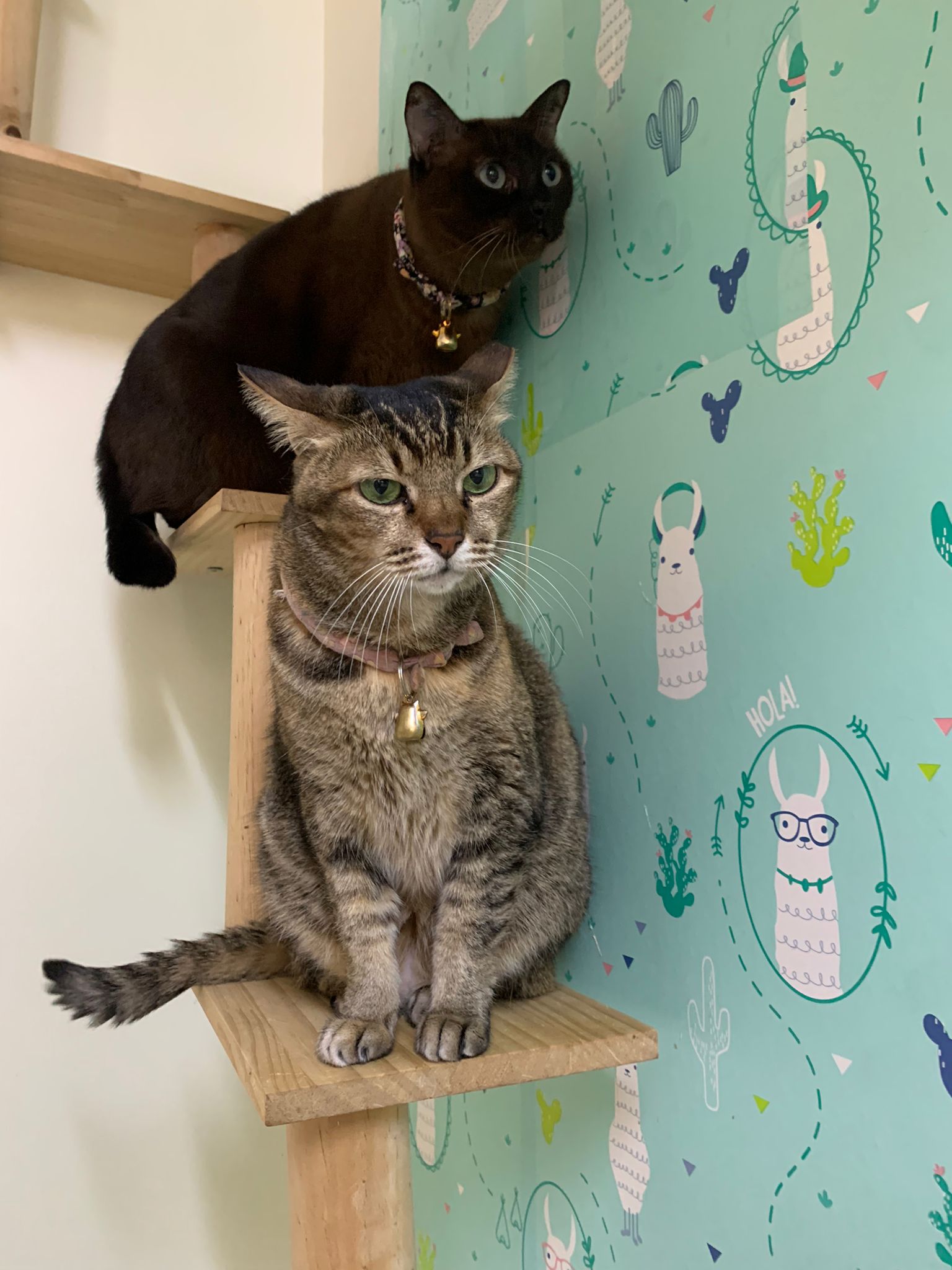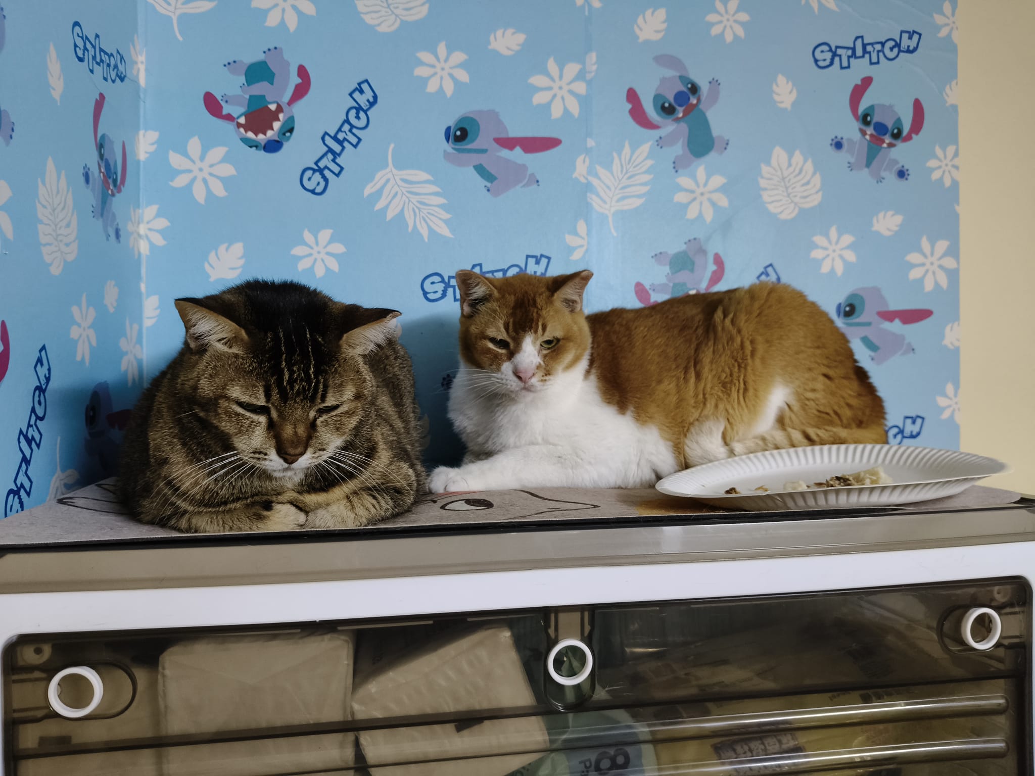 9am+: tao station on top of that window cabinet, sena wanna sit beside her, she stare at her, making sure she didn’t touch her. End up both of them sit together; didnt disturb each other. Kiss the 2, n take photos of them. Ha. When I’m going medi round, sena still do her job la. Flop on floor tell me belly rub when manja putting eye drop.