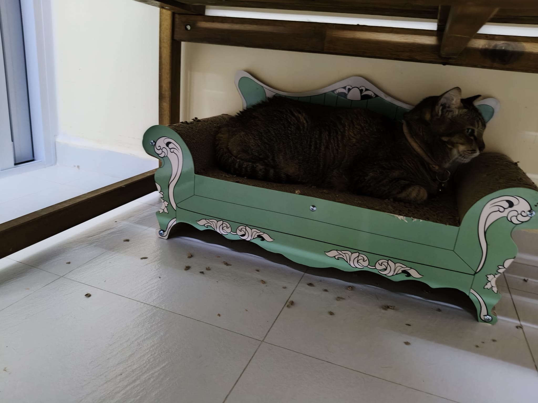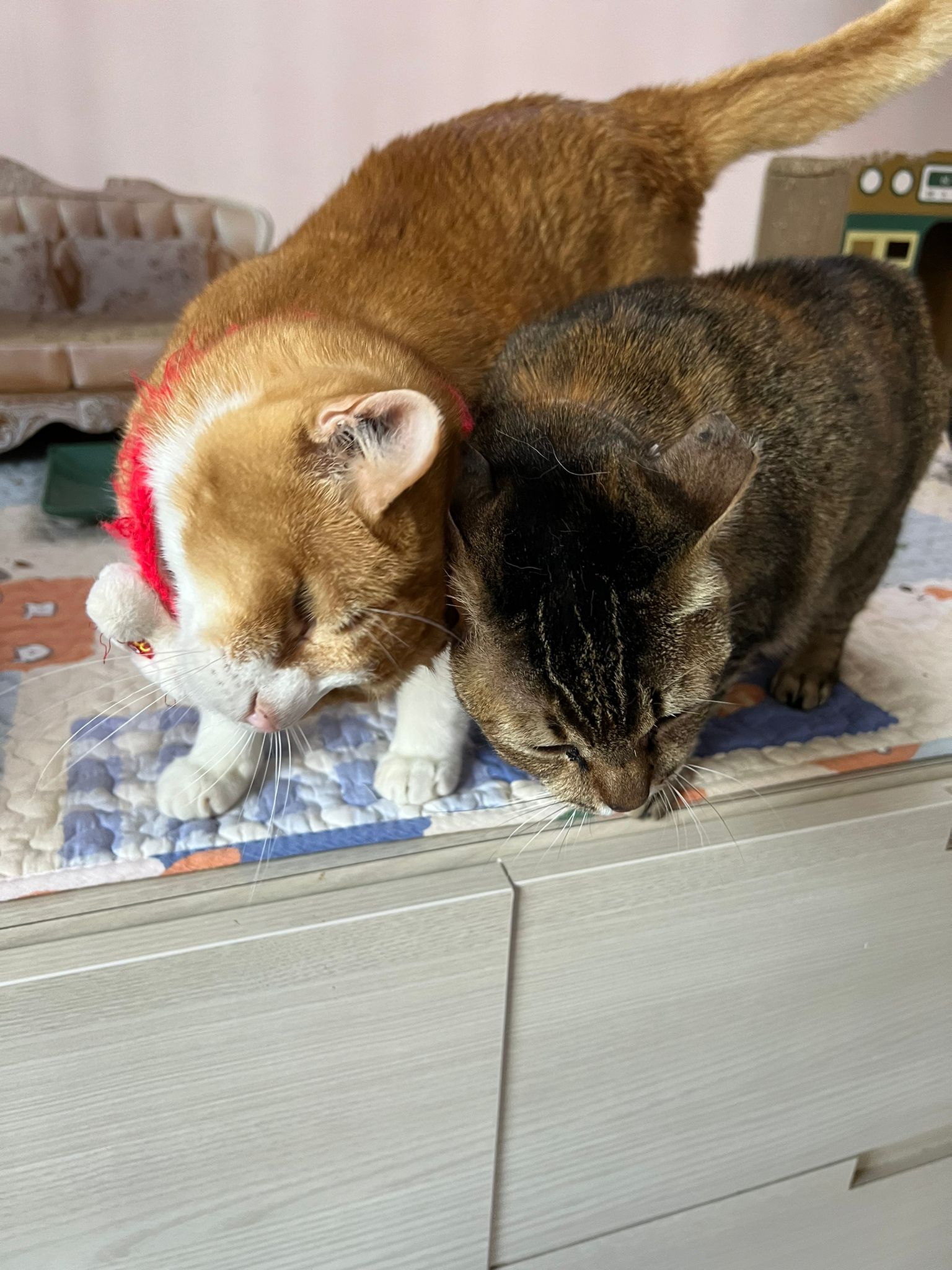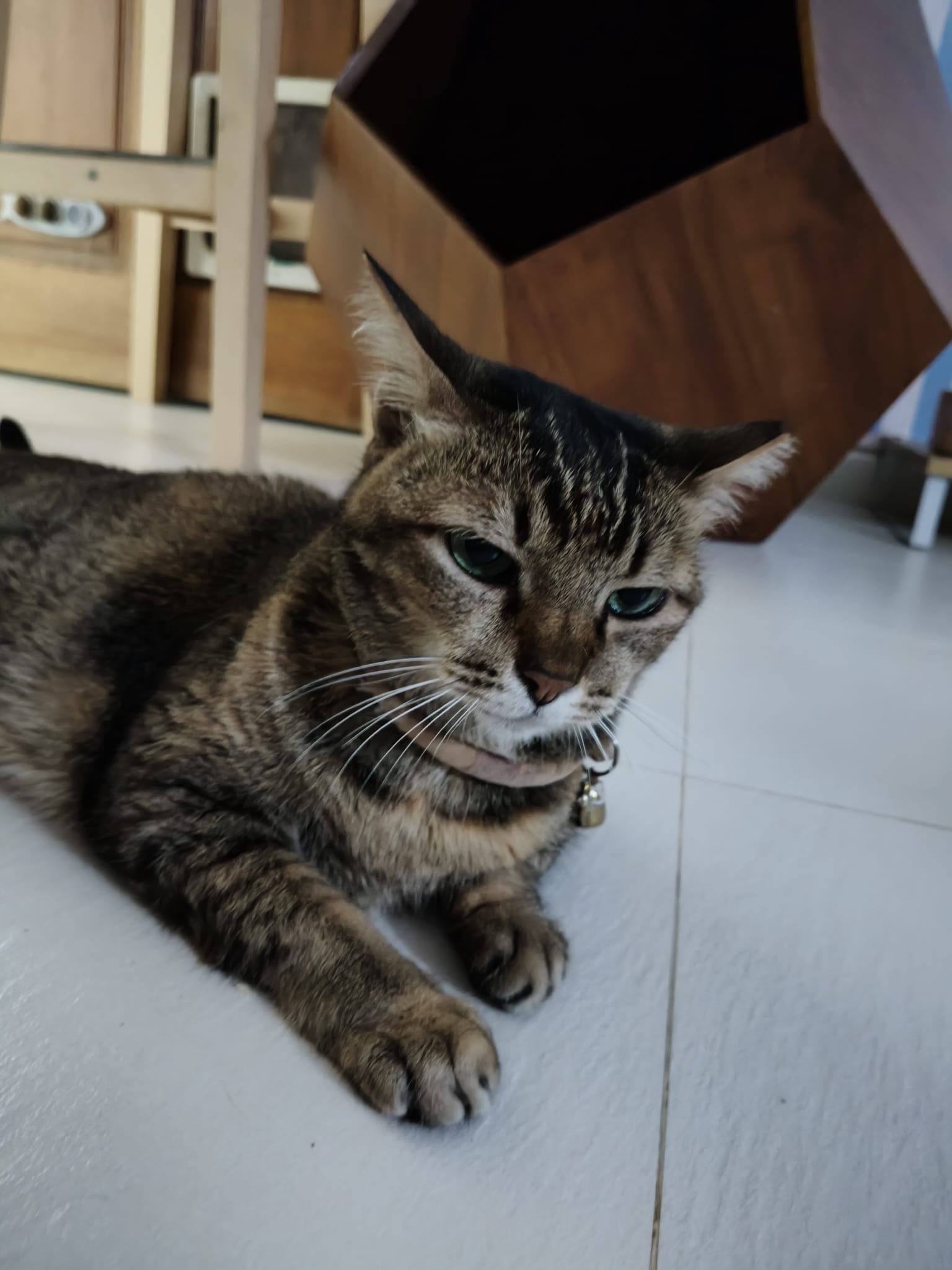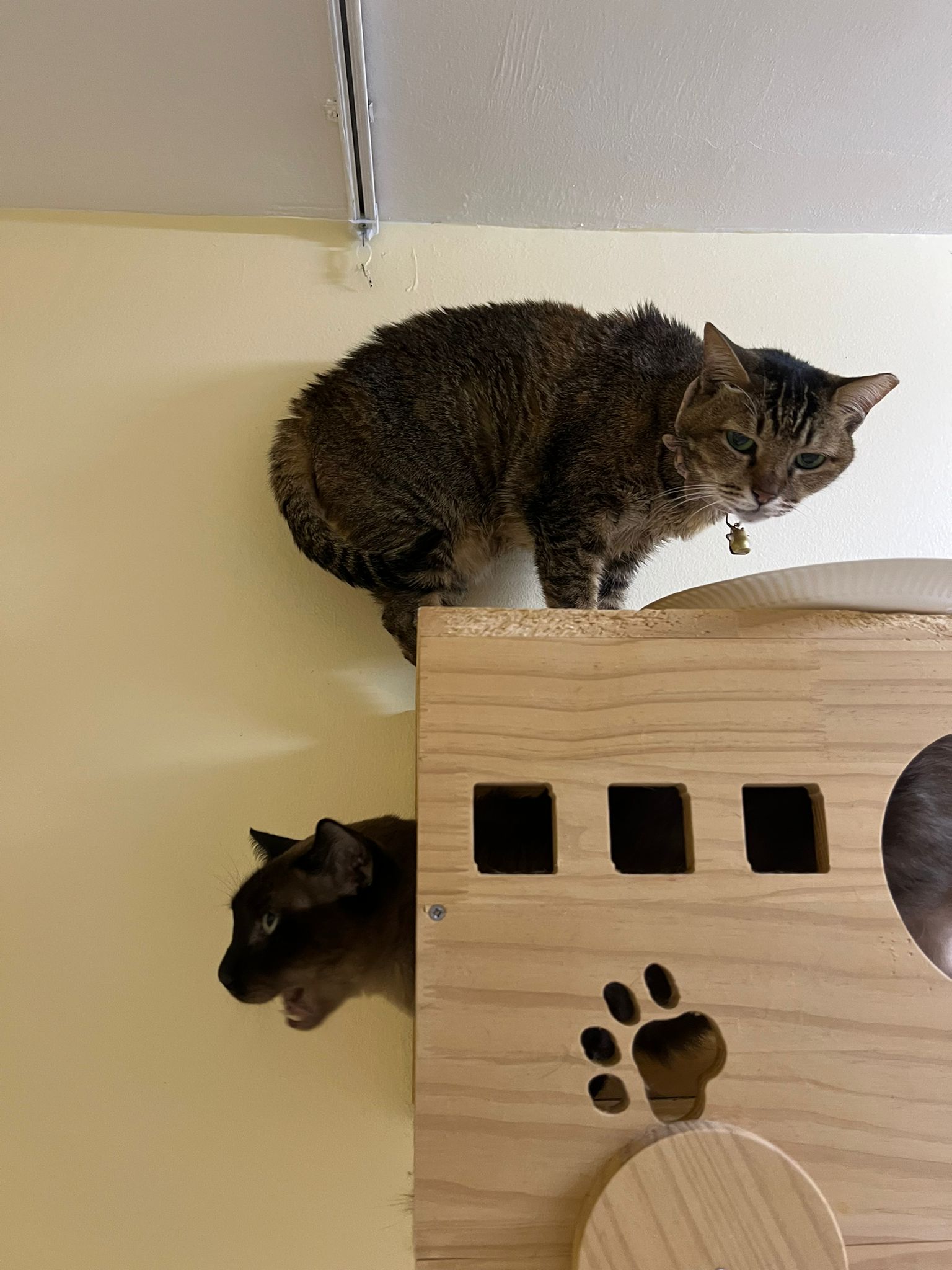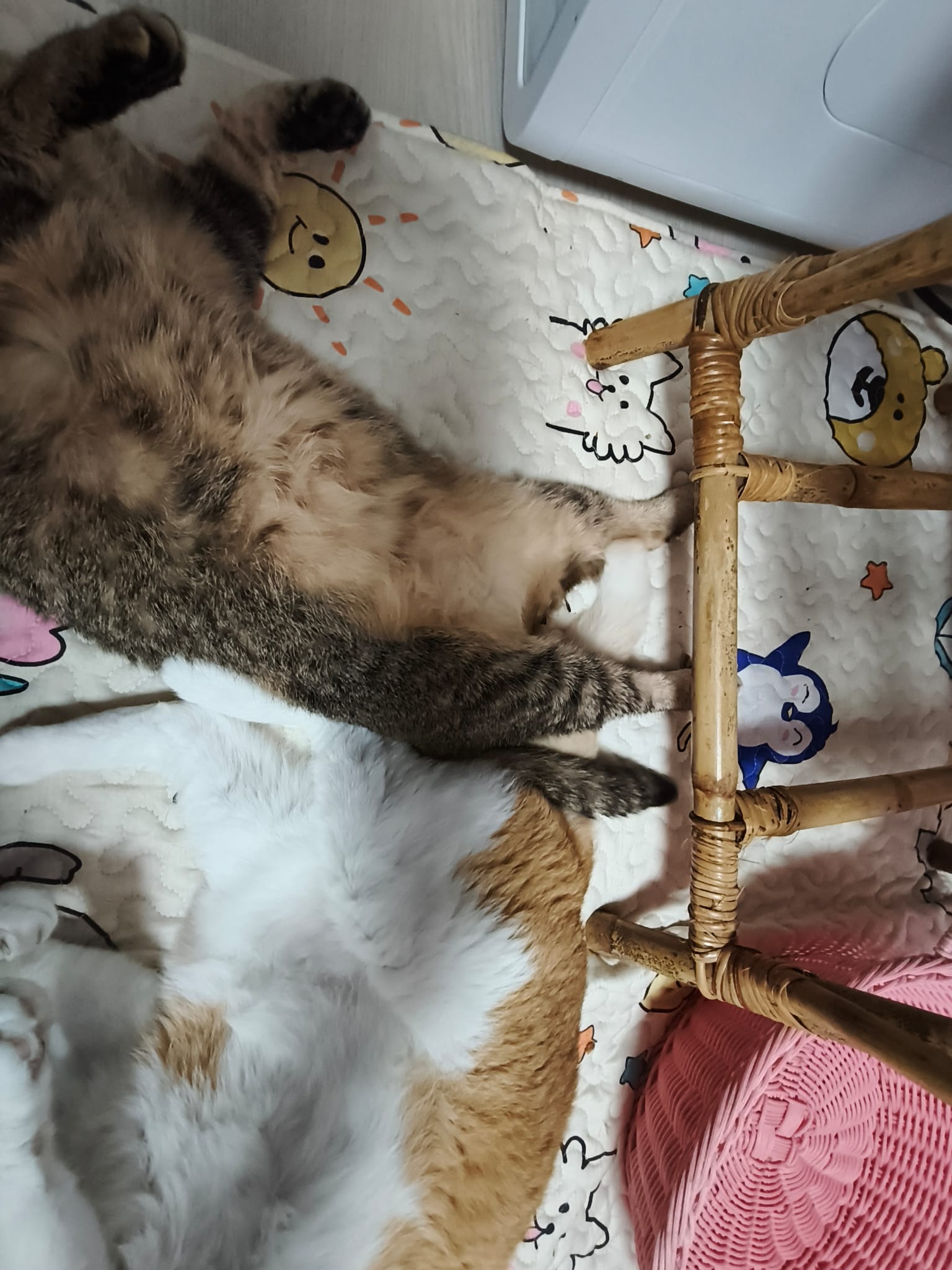 9am+: tao station on top of that window cabinet, sena wanna sit beside her, she stare at her, making sure she didn’t touch her. End up both of them sit together; didnt disturb each other. Kiss the 2, n take photos of them. Ha. When I’m going medi round, sena still do her job la. Flop on floor tell me belly rub when manja putting eye drop.