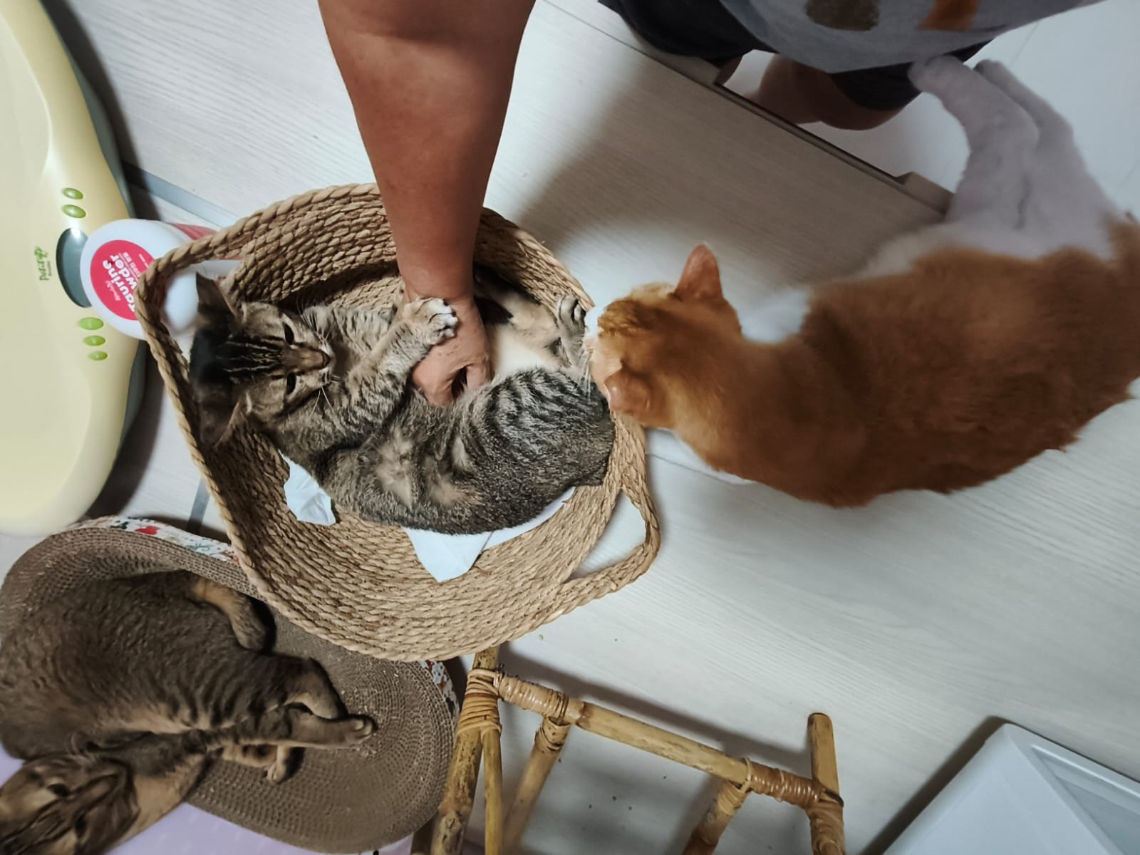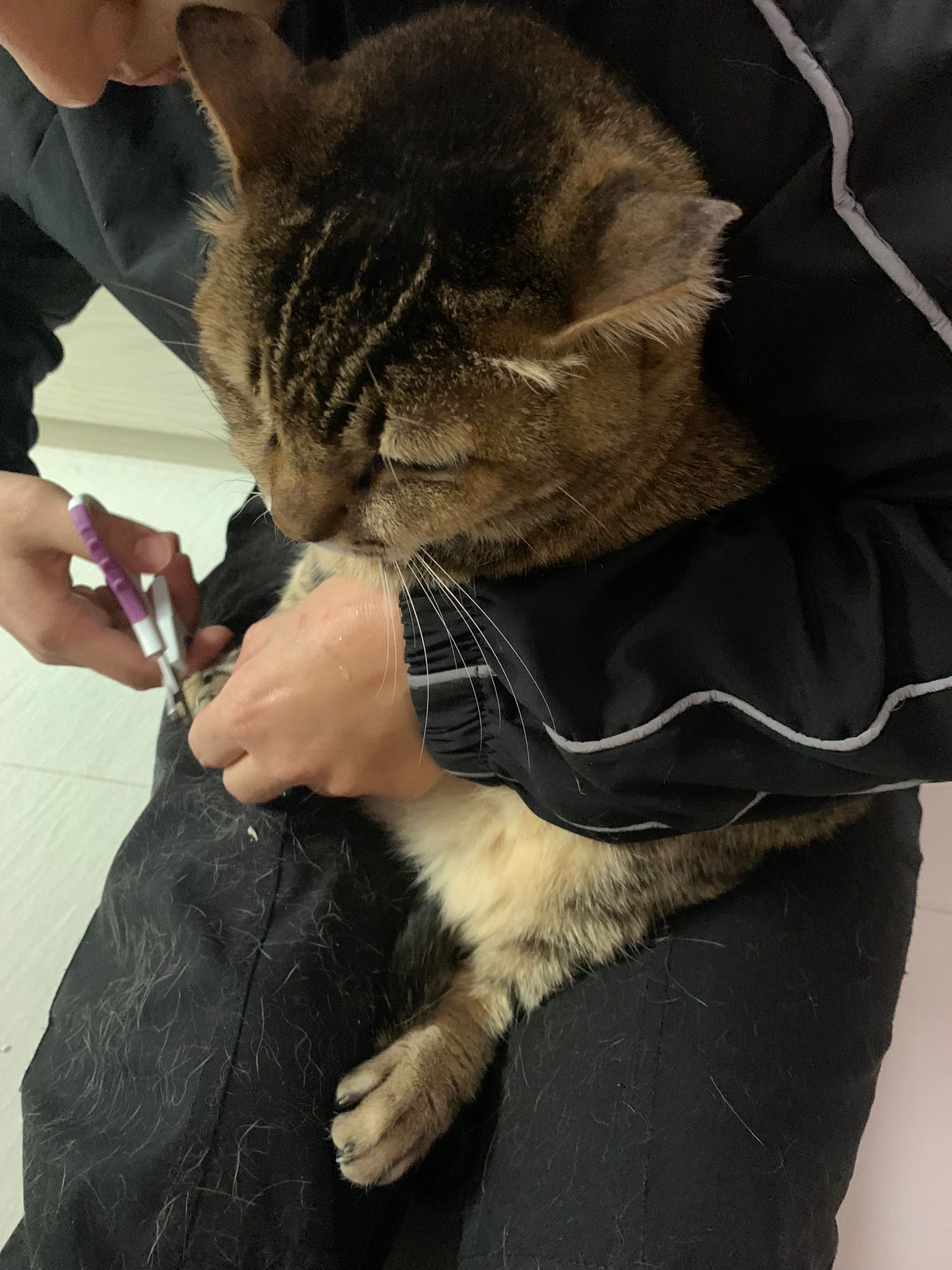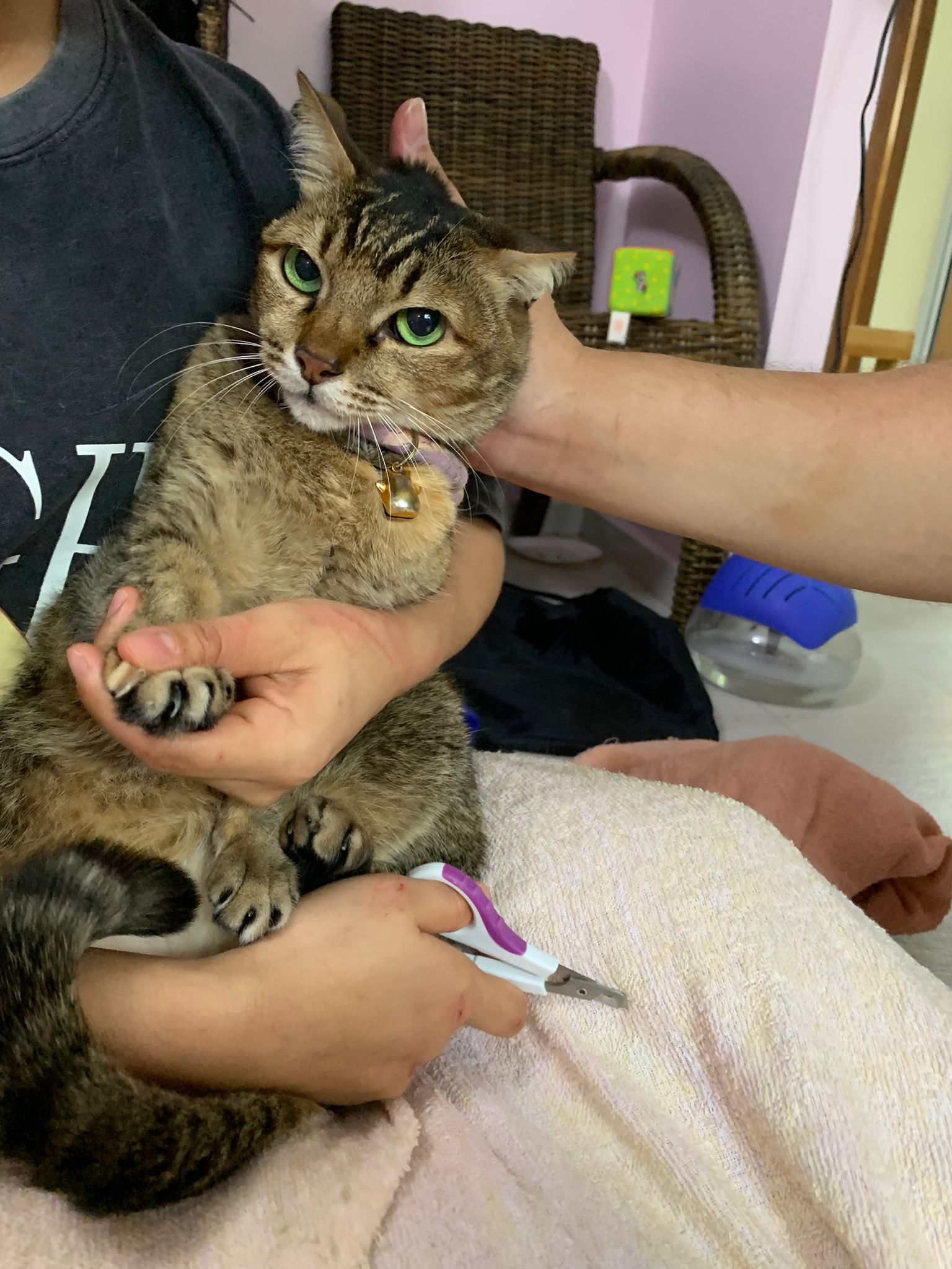 Morning: today basic grooming. Cut nails and clean ears and comb fur. Buddy and sena still super loving and sena bite buddy eat he let her be