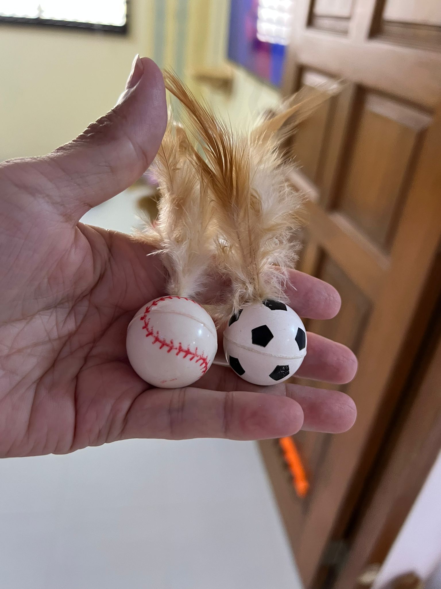 Night: mmm:” Sena playing. Sena attracting more to play. So much fun with the 2 feather balls”