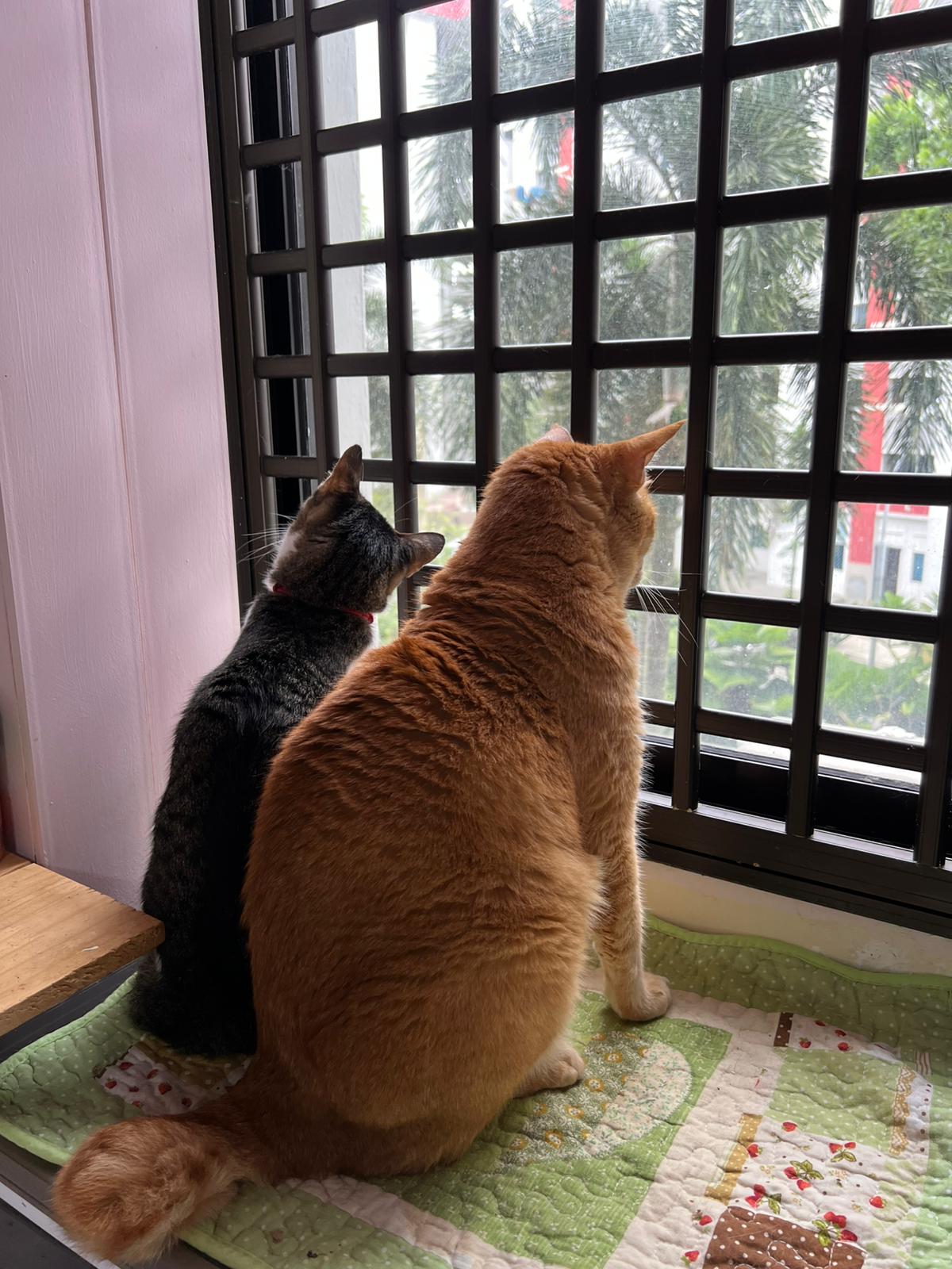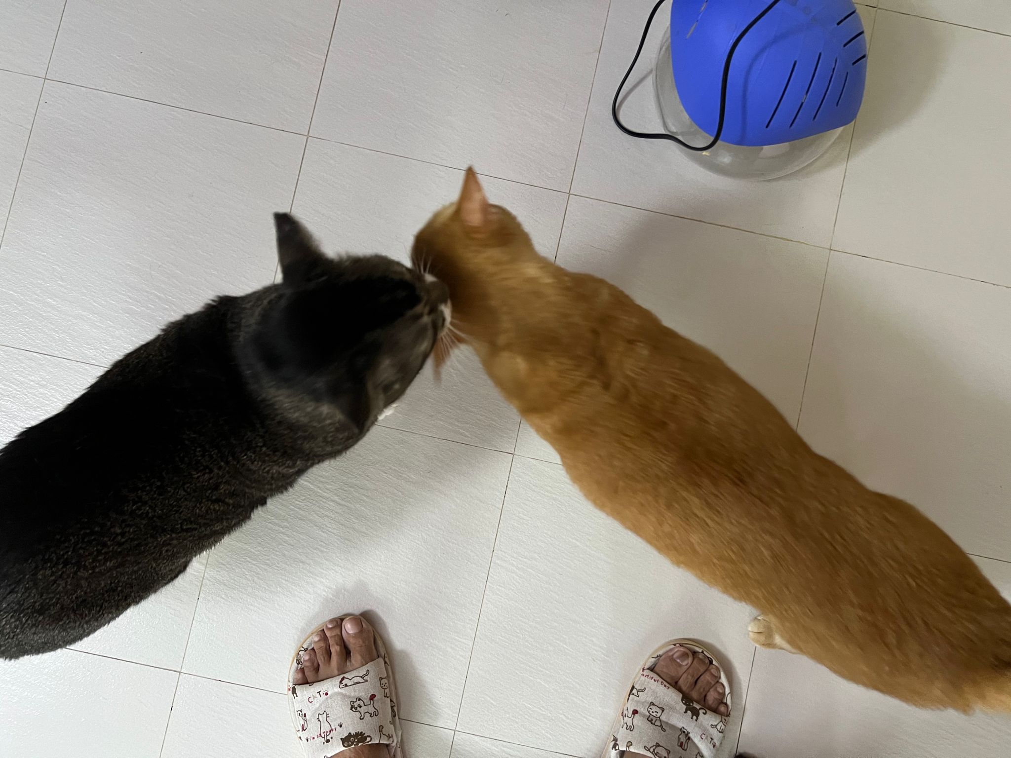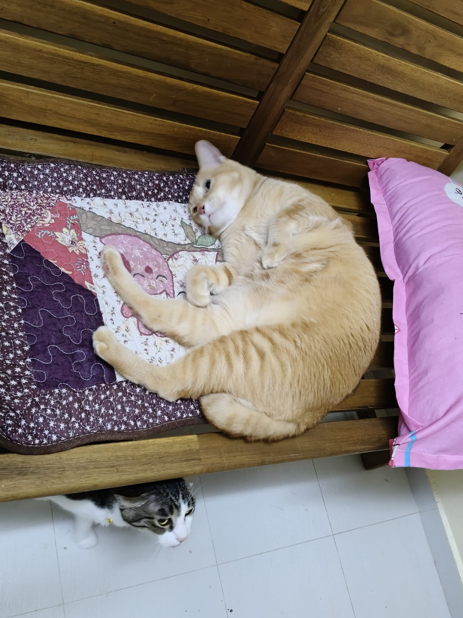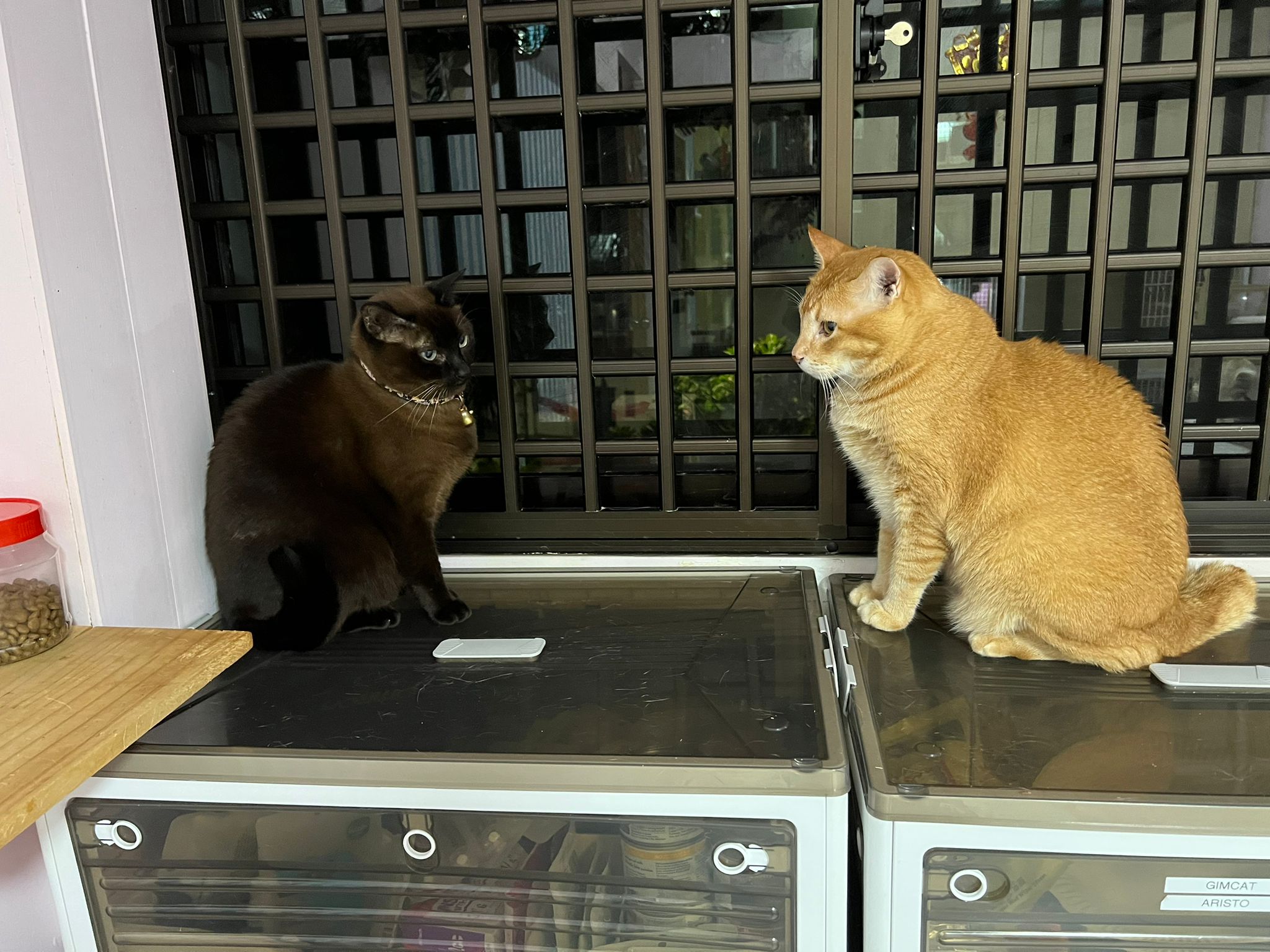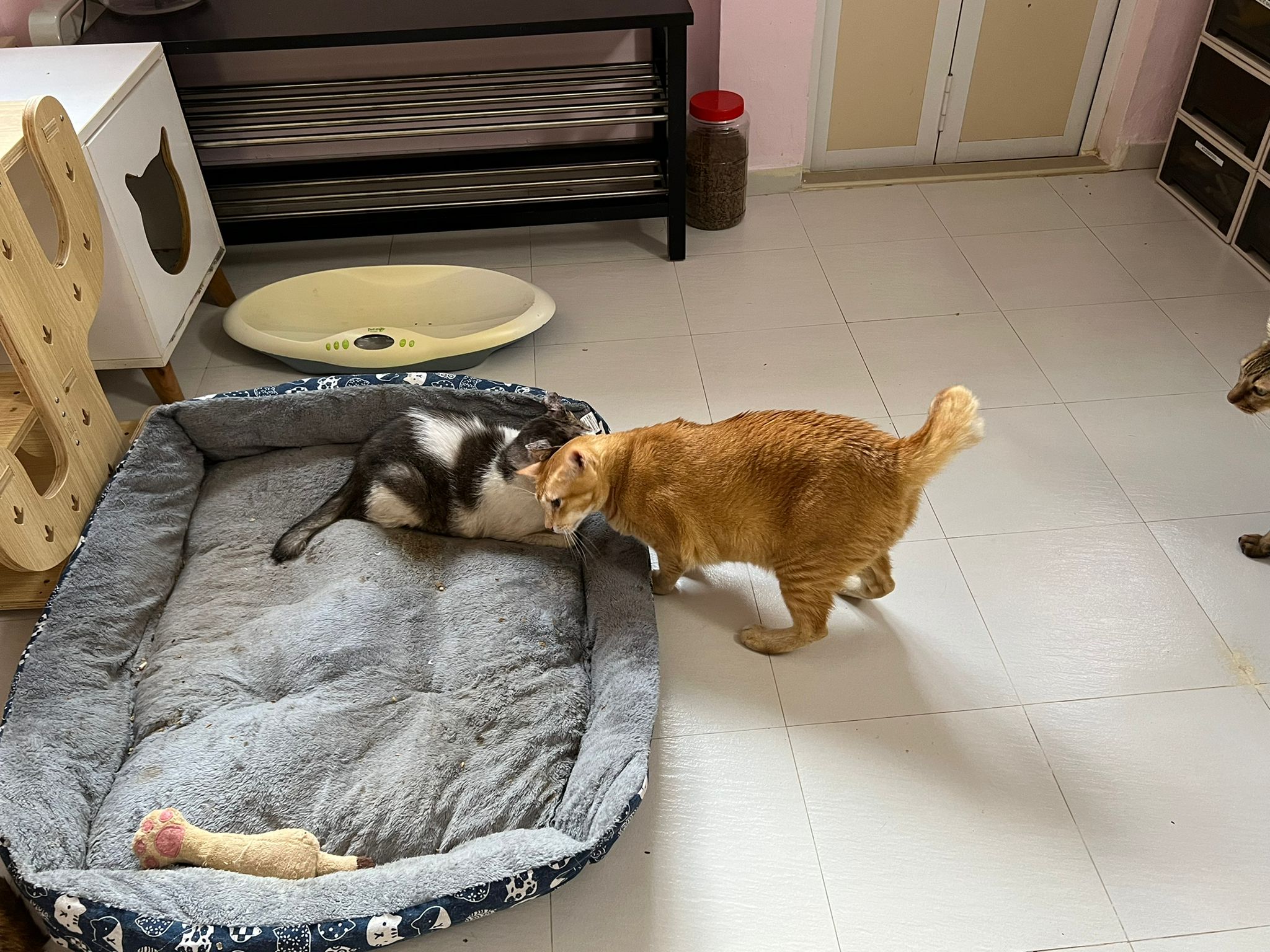 Morning: sunny and junior will head butt. Actually v good in good term mah, then Sunny will meow at him for no reason. Provoke? Just wanna play? WhT!!!? Junior didn’t react and that’s it.
