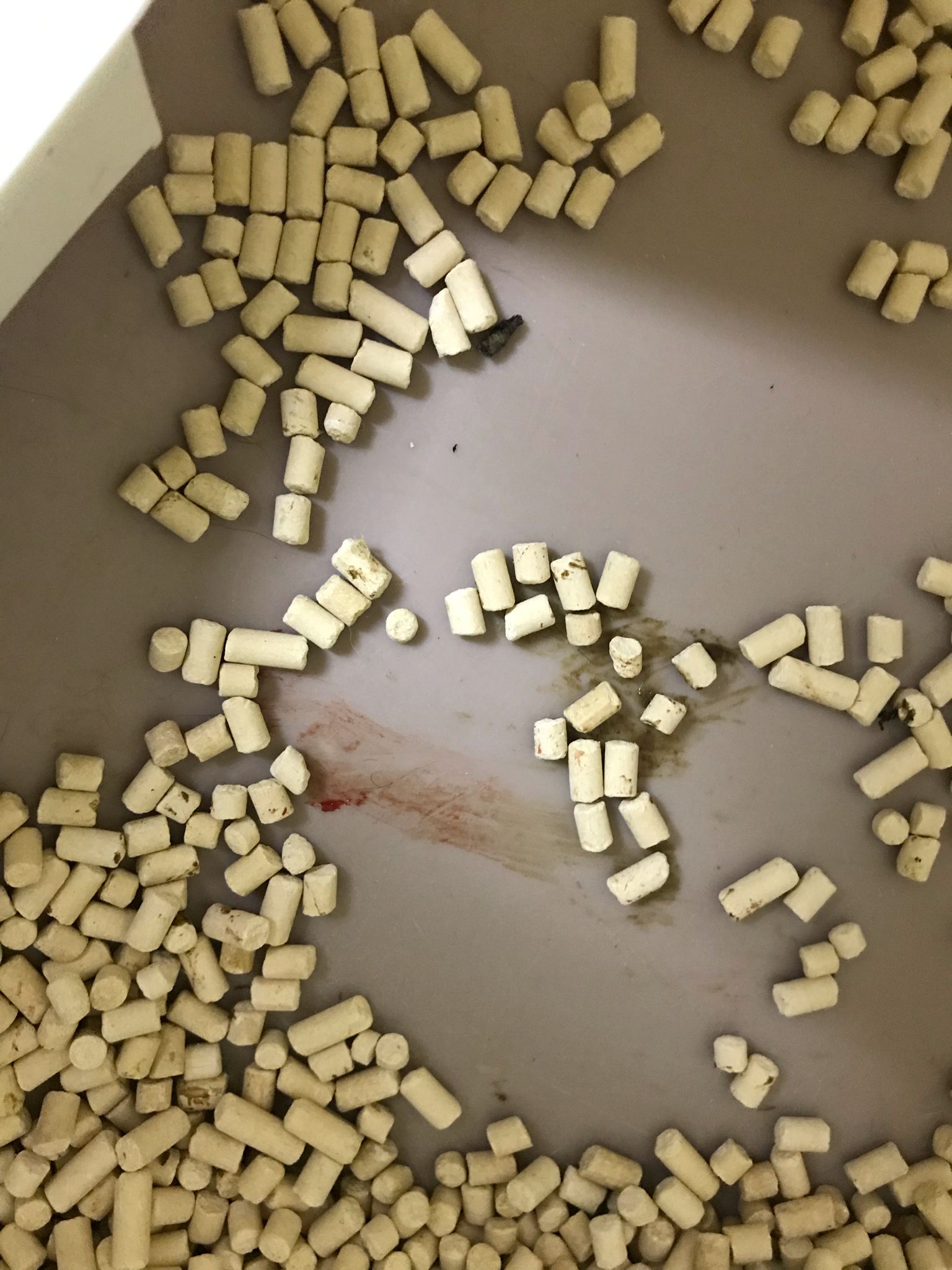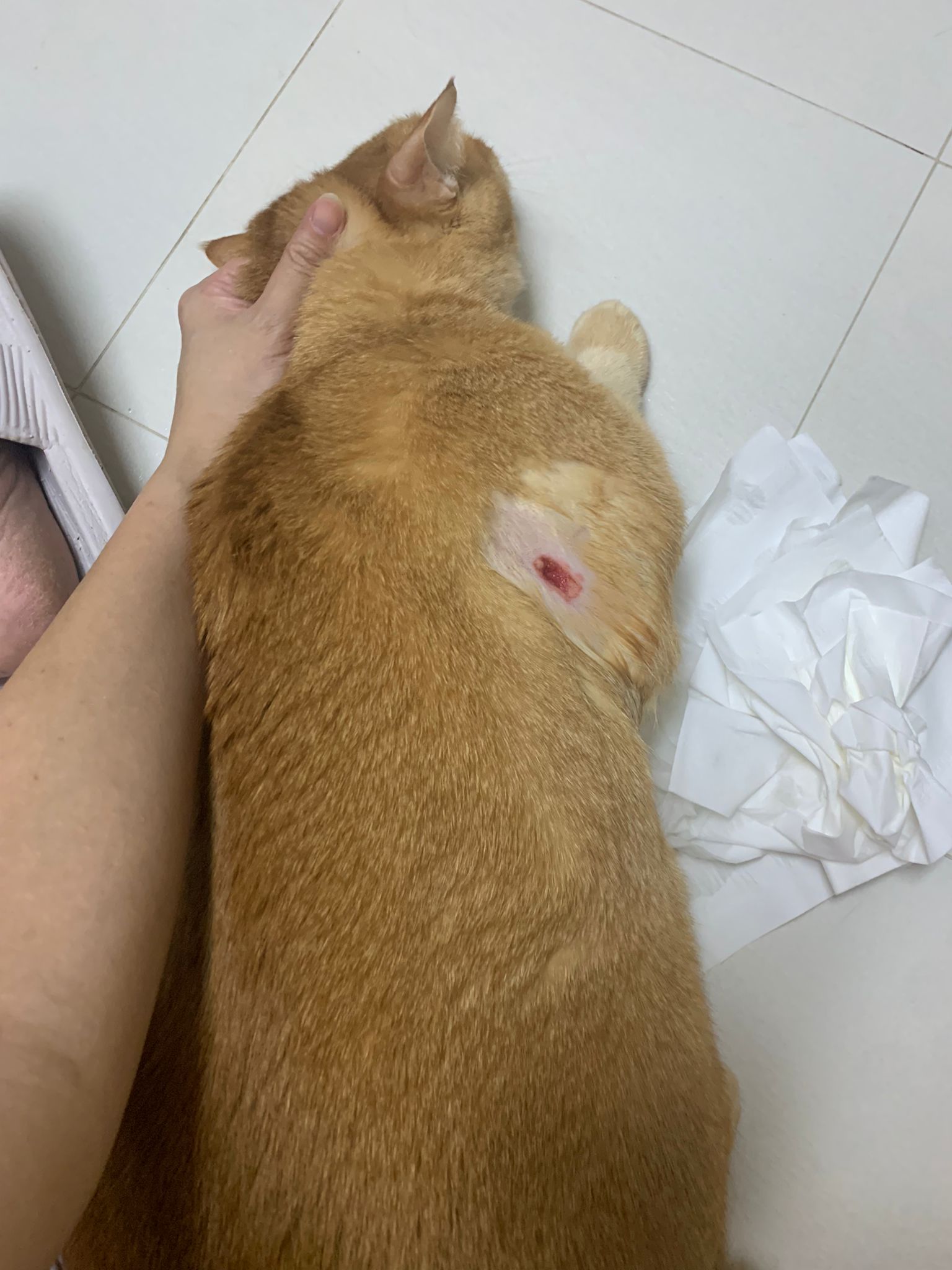 To p room lesser blood, then he walk p to f room again no more bleeding alr. Should be fighting w kitty and he injure himself in one of the cat box