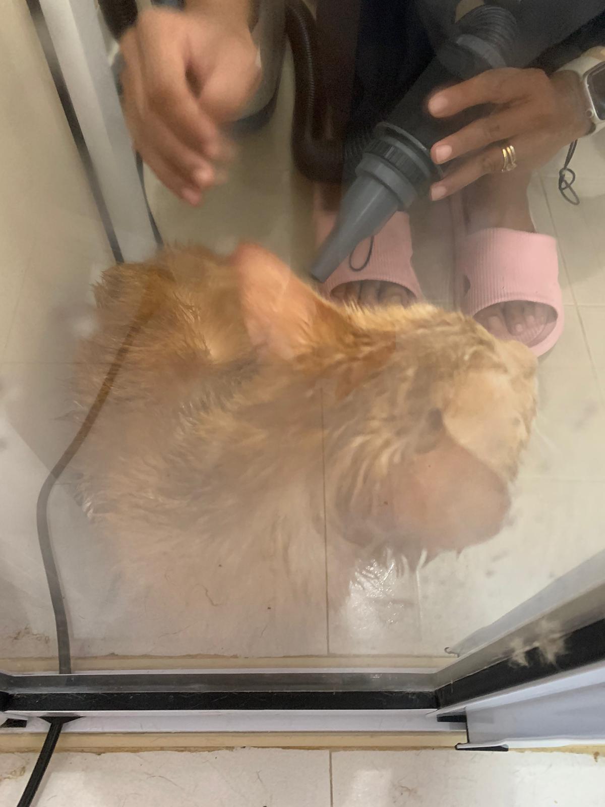Morning: use oommi dry shampoo on him, brush his fur. He ok but still want to run