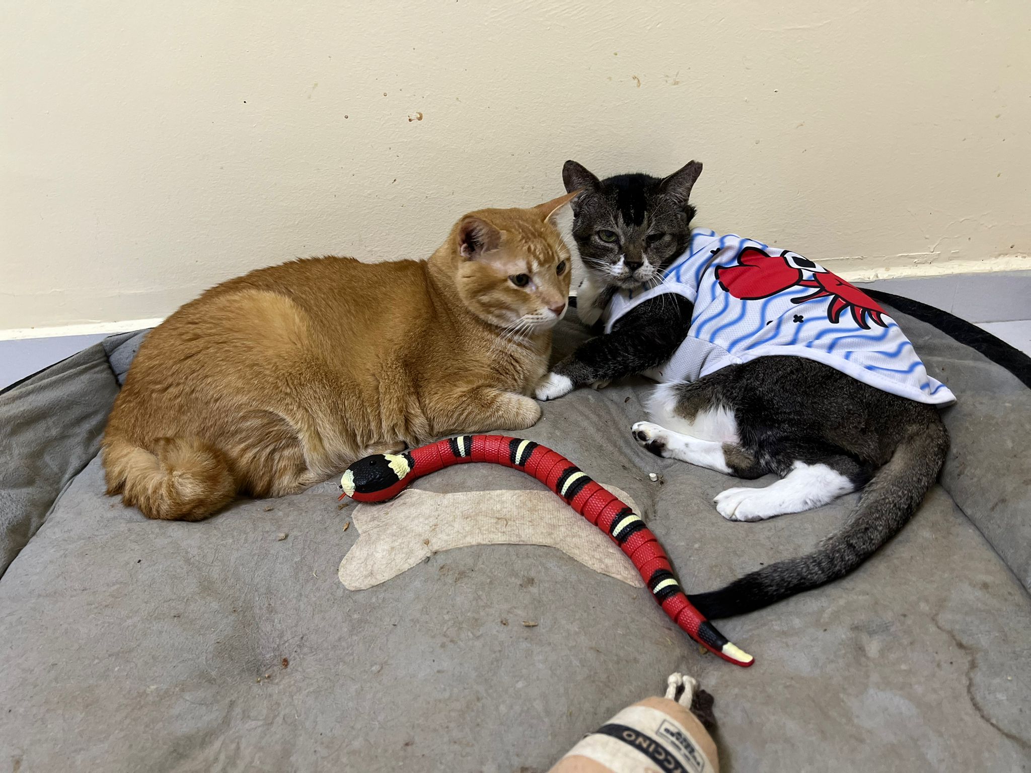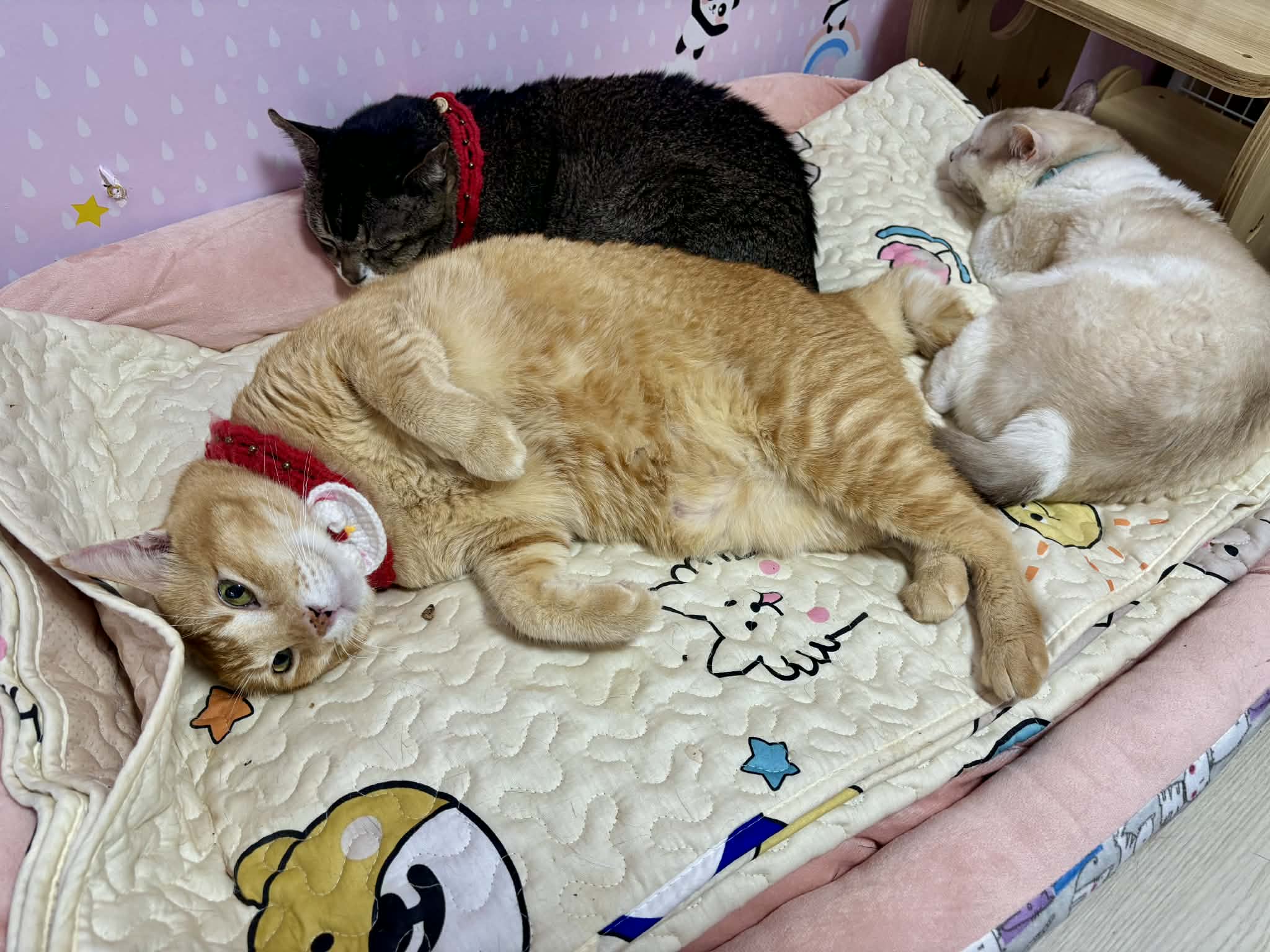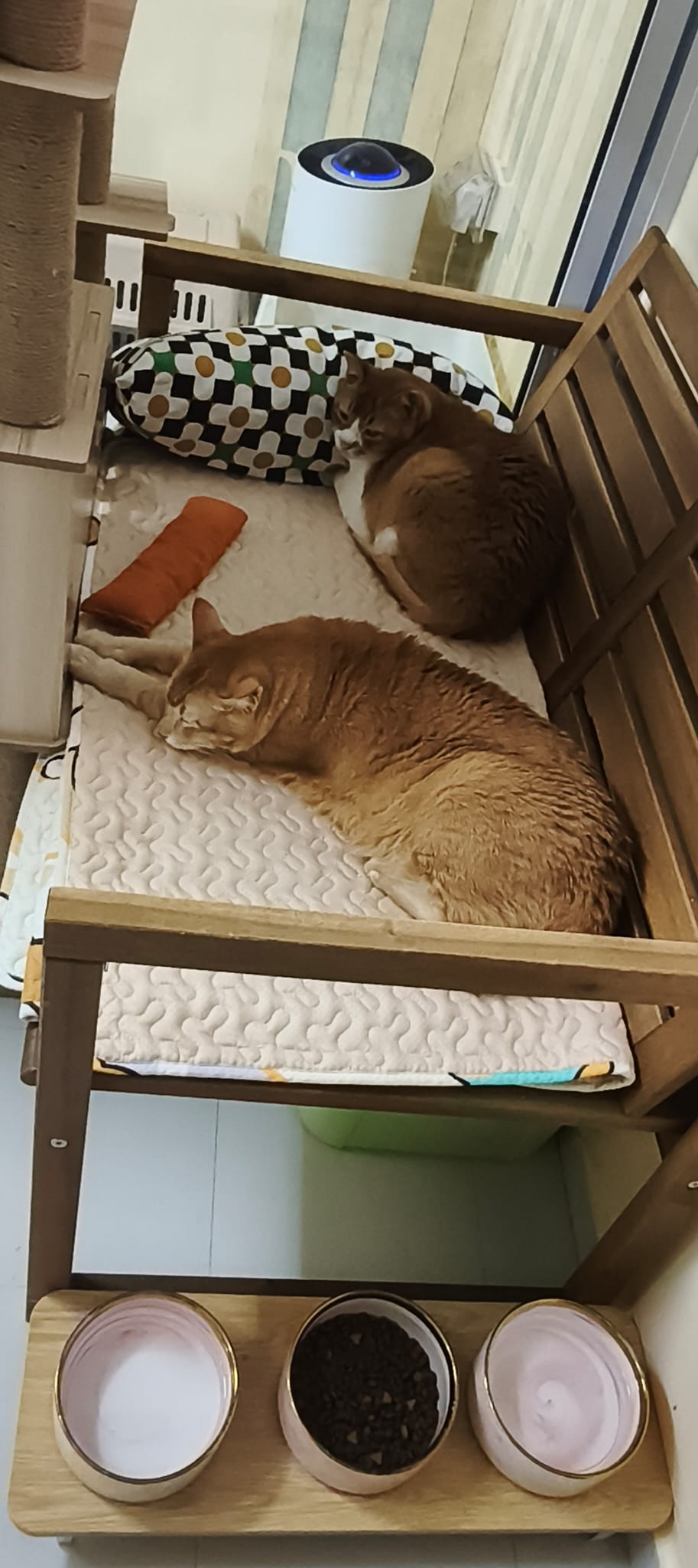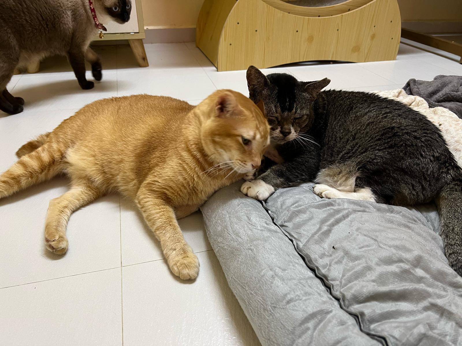 11am: Buddy lying on ducky bed, Sunny go heat butt him, Buddy groom Sunny, I sayang both praise them.