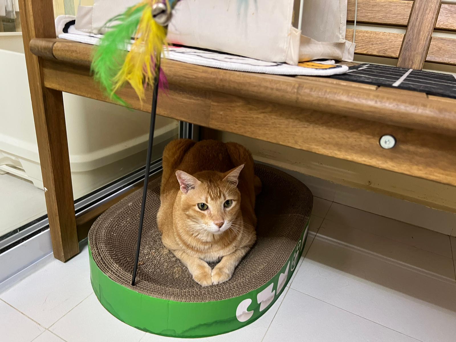 Morning: sunny rub rub rub himself against the blanket on the big bed and rub the catnip toy.