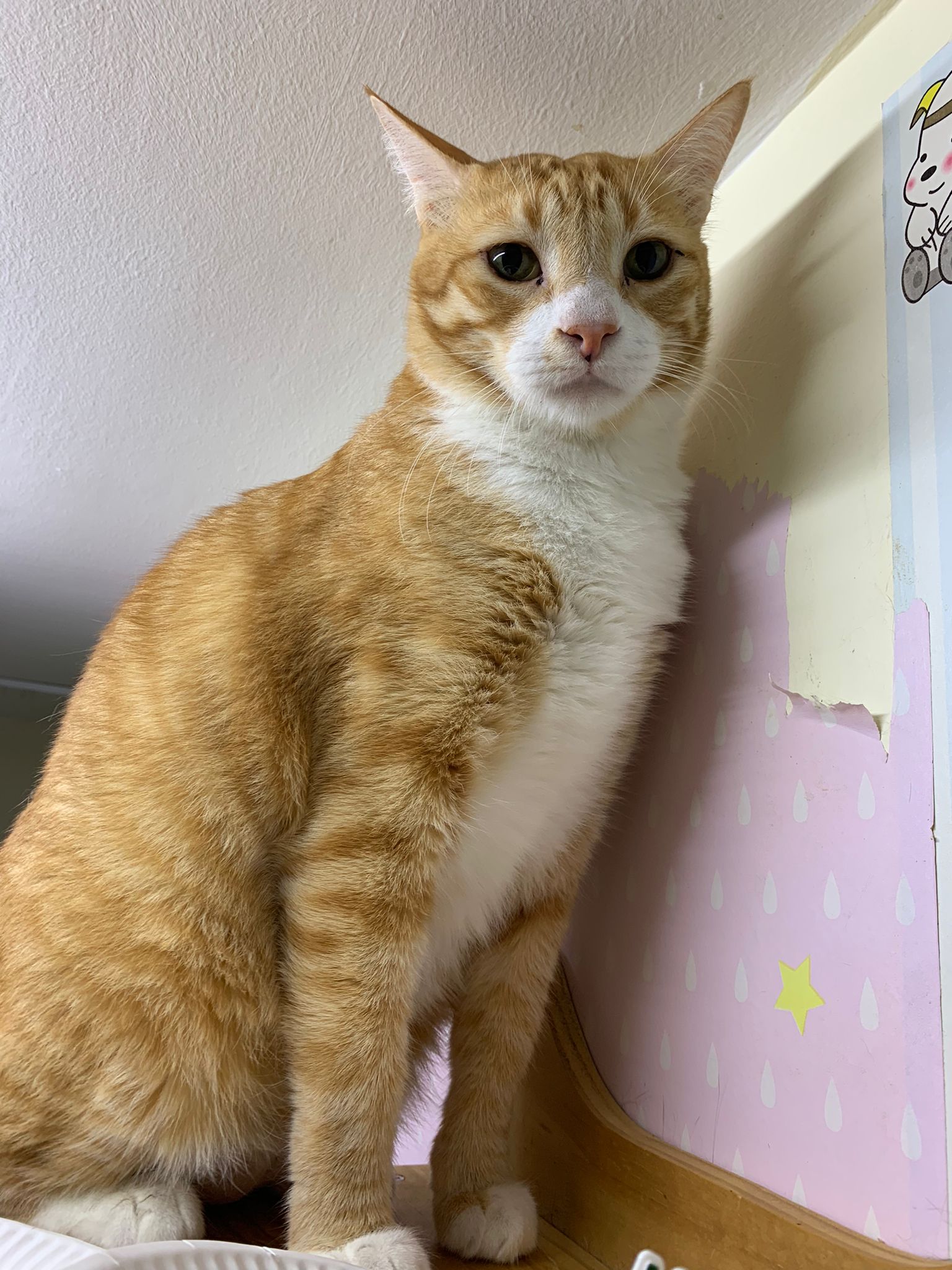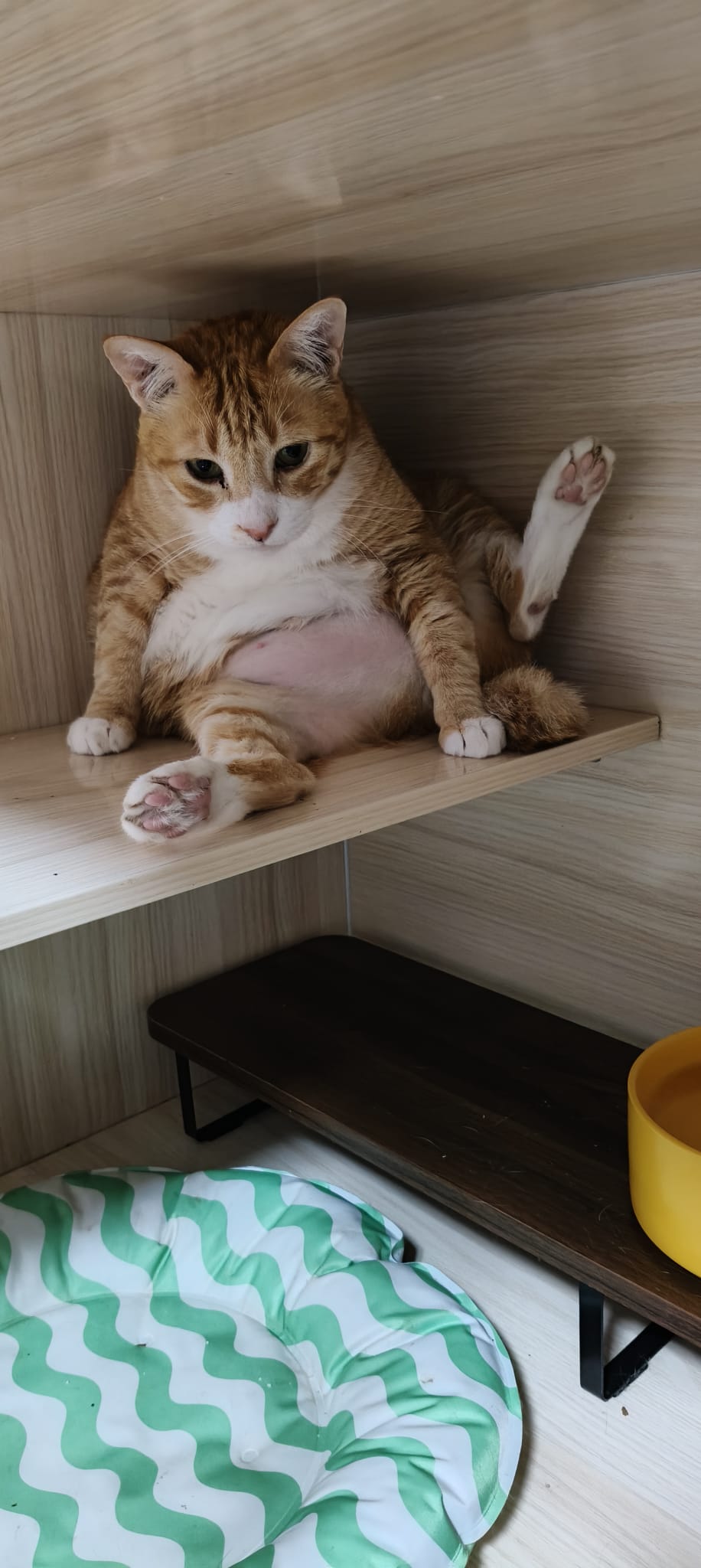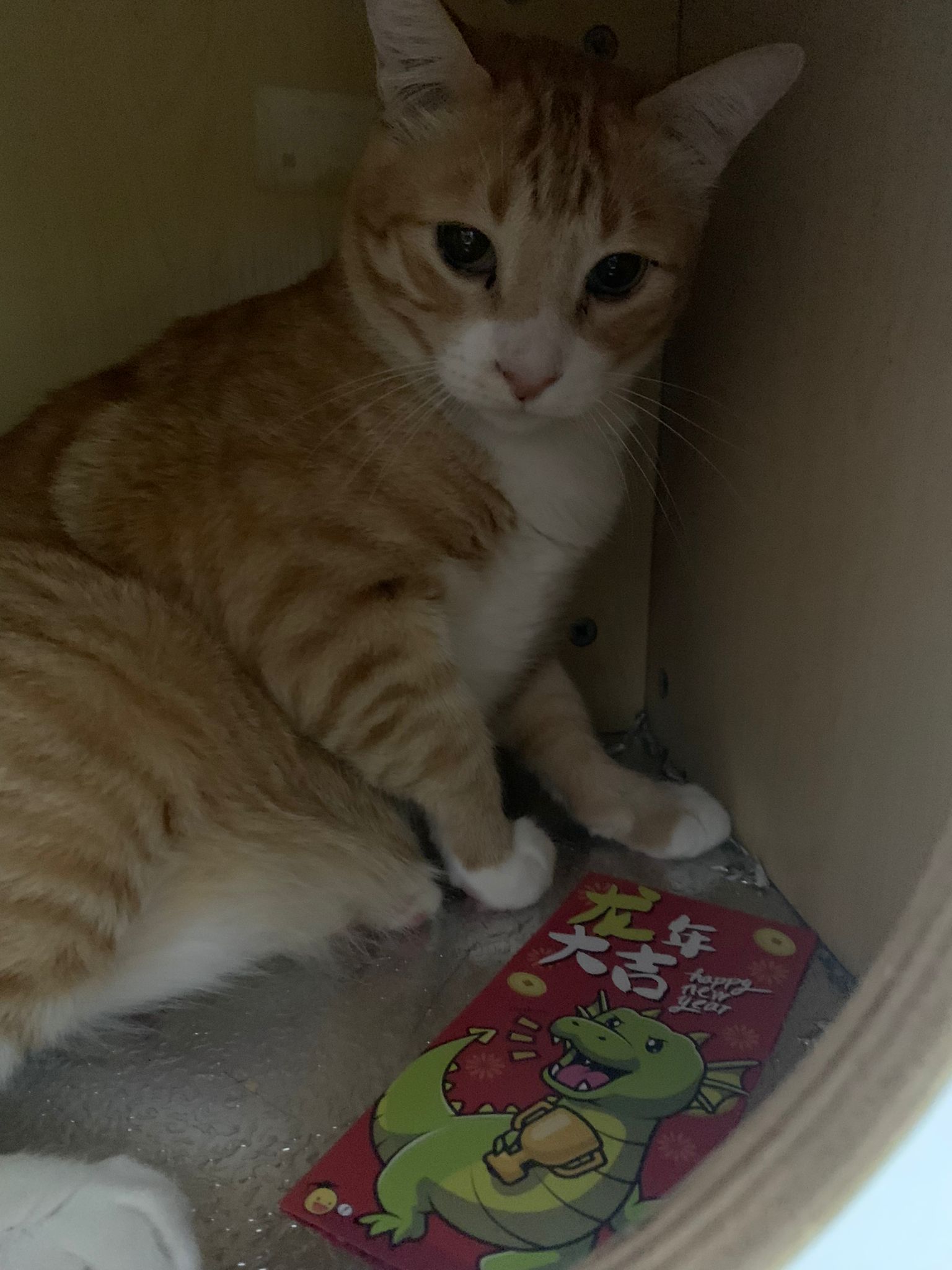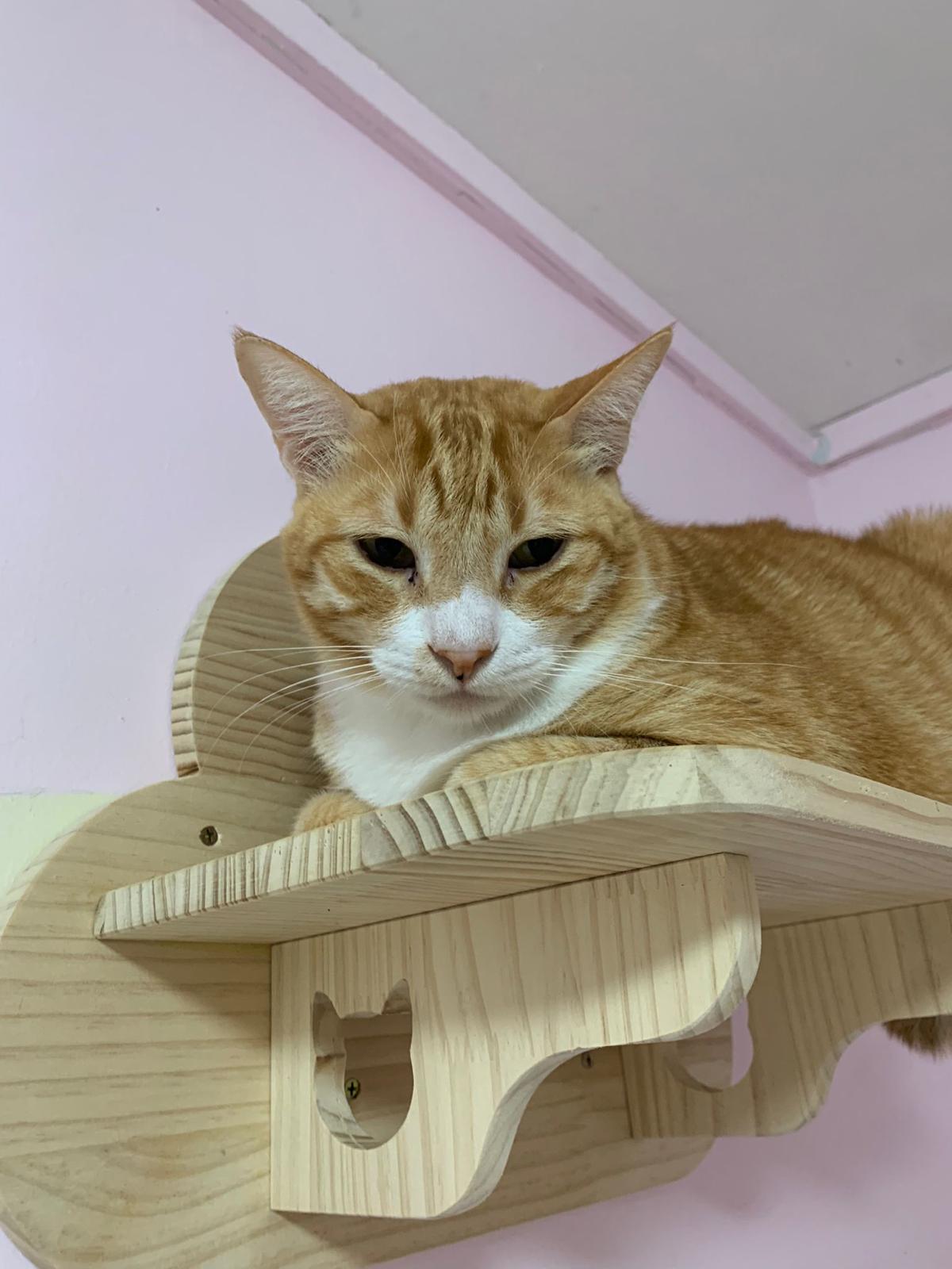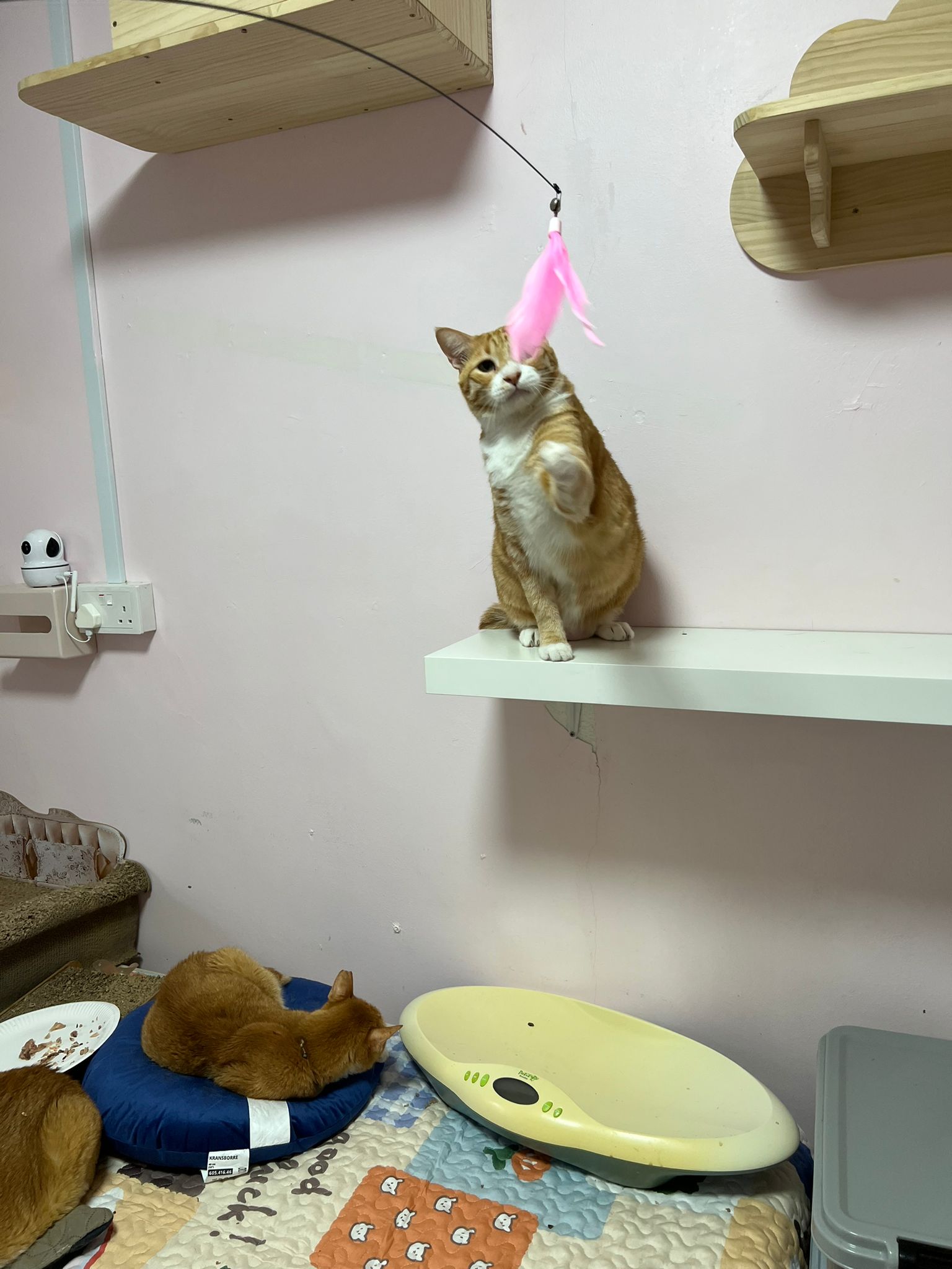Follow his mummy Amber since young, scare of human, don’t allow touch. He don’t really attack me if I touch him but he will fly away. He is playful, play feather time n laser light he will come. I assume he grow up well in 猫房 – muscular and strong.