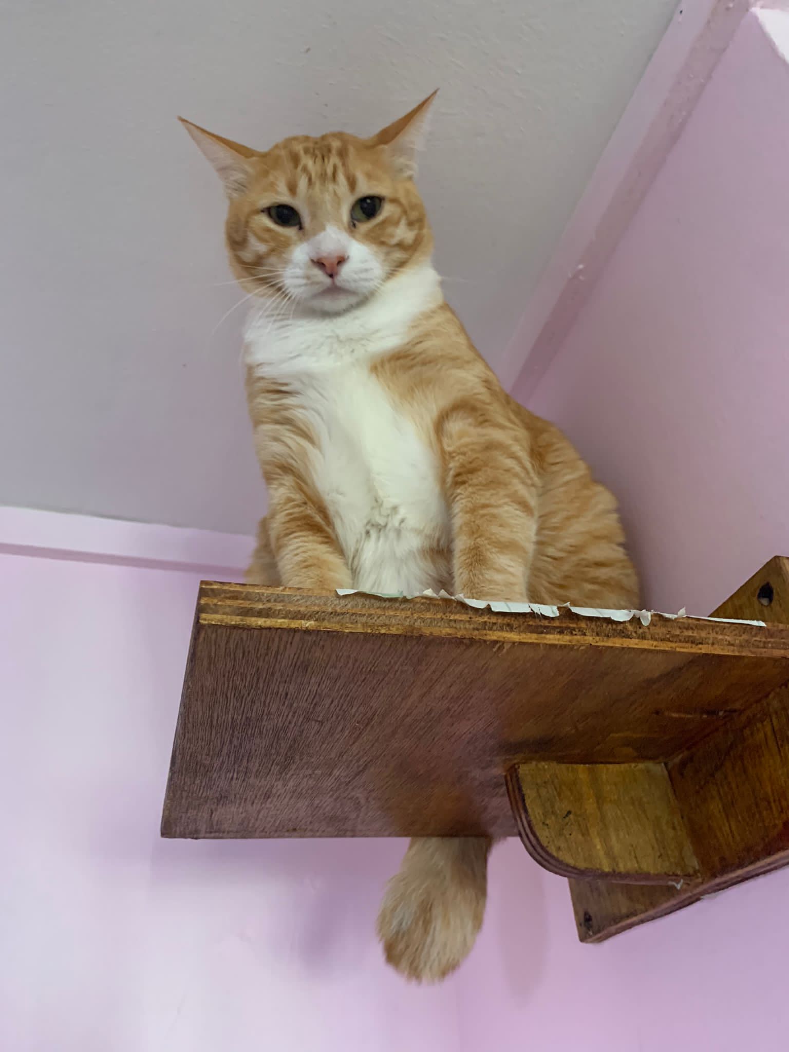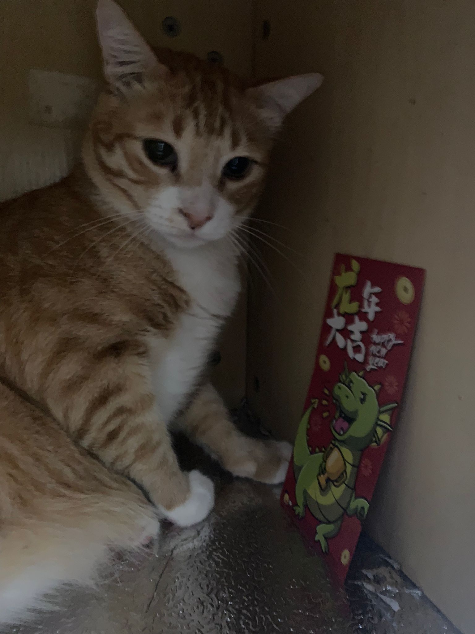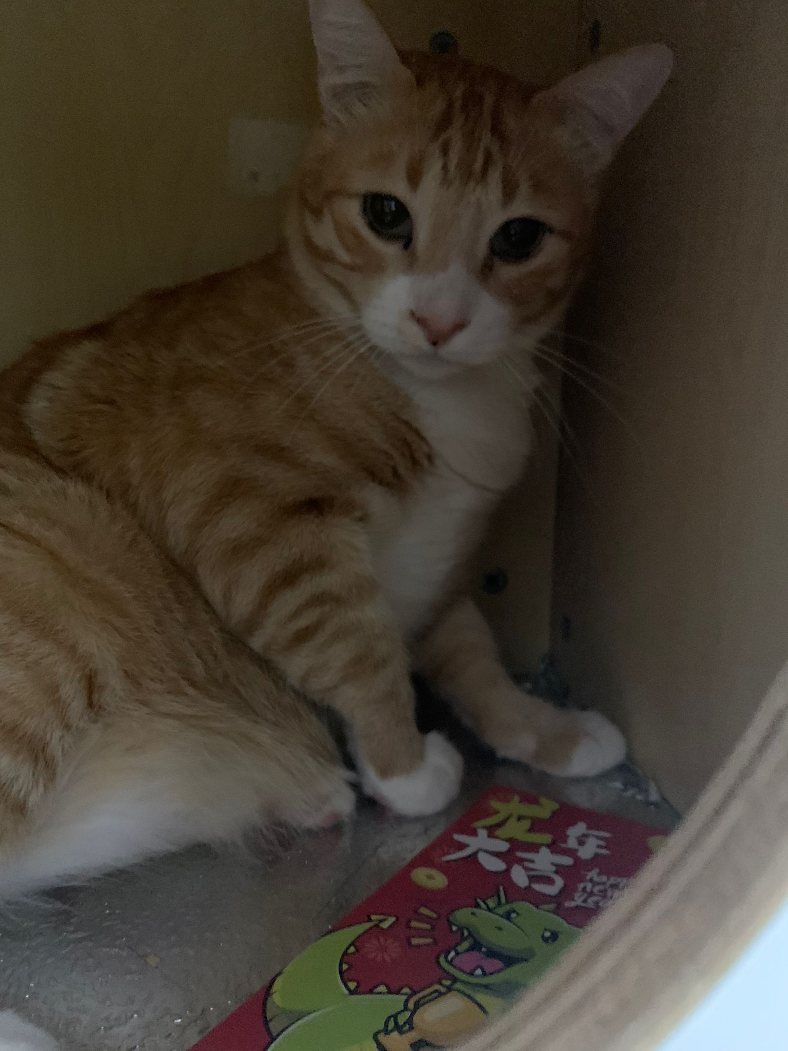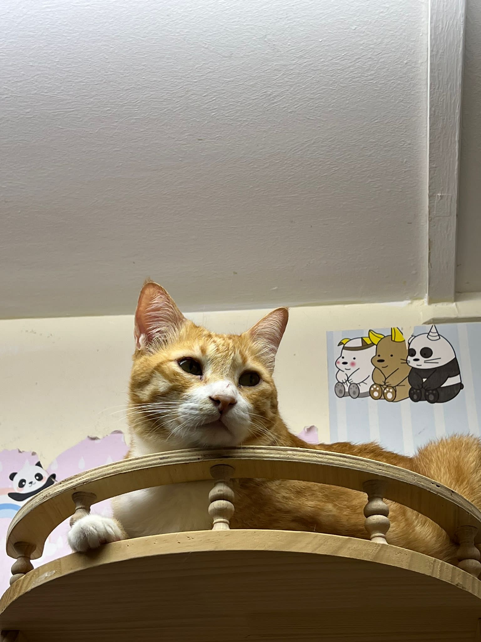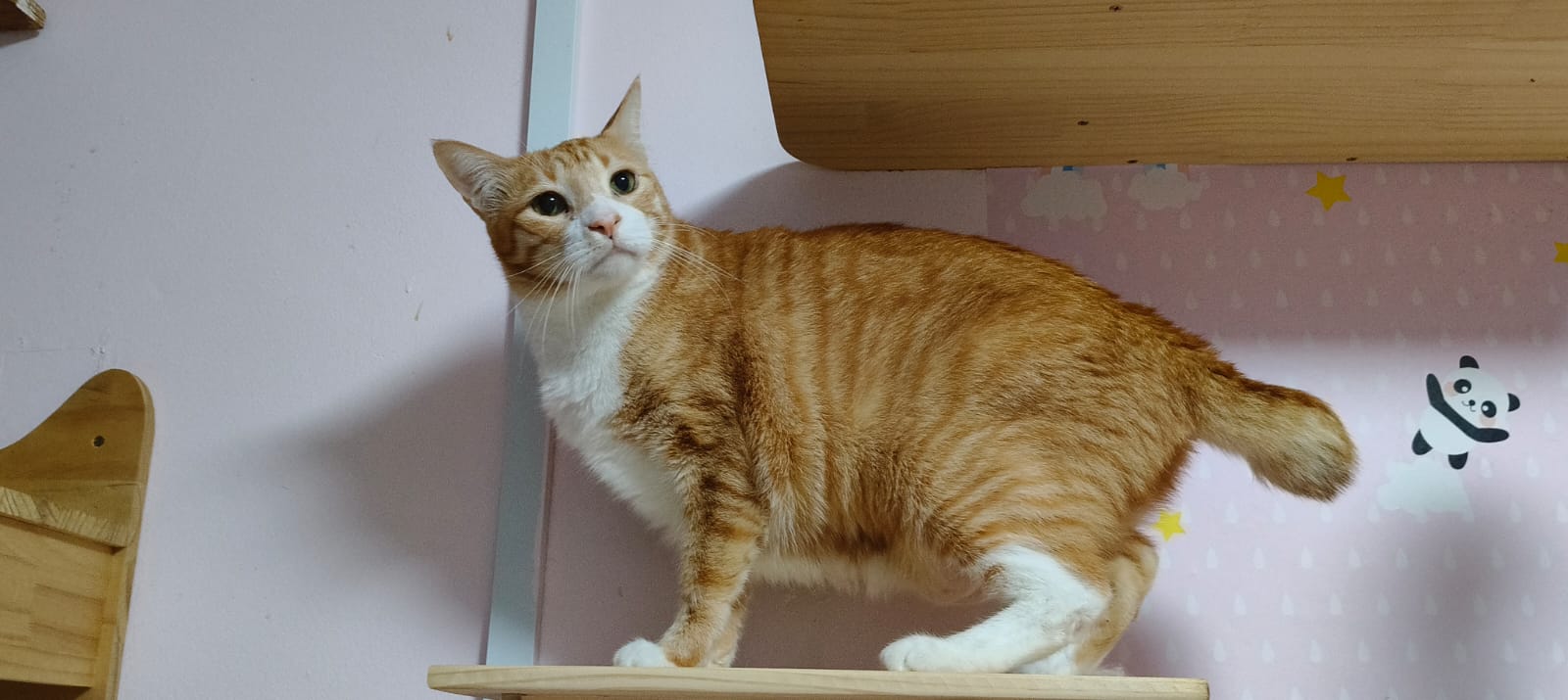 Follow his mummy Amber since young, scare of human, don’t allow touch. He don’t really attack me if I touch him but he will fly away. He is playful, play feather time n laser light he will come. I assume he grow up well in 猫房 – muscular and strong.