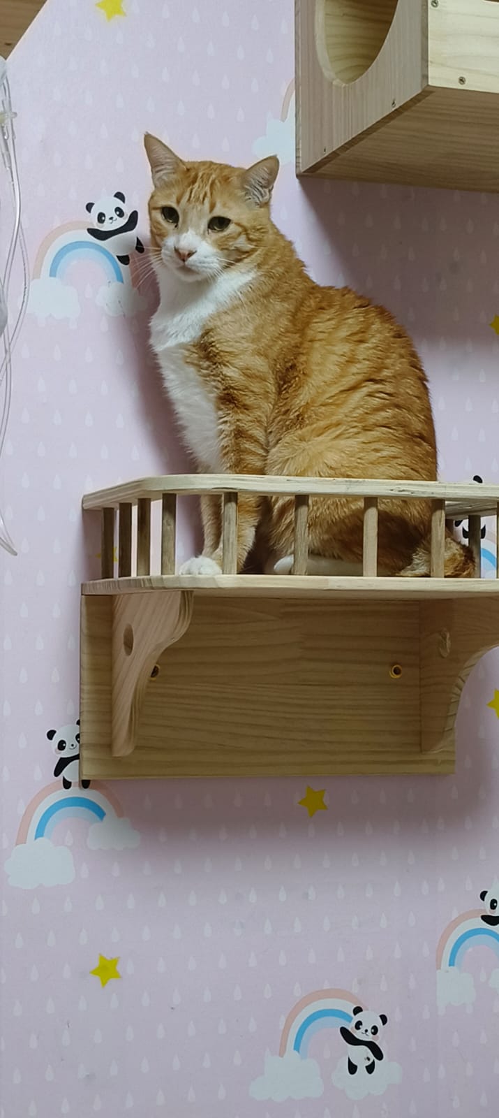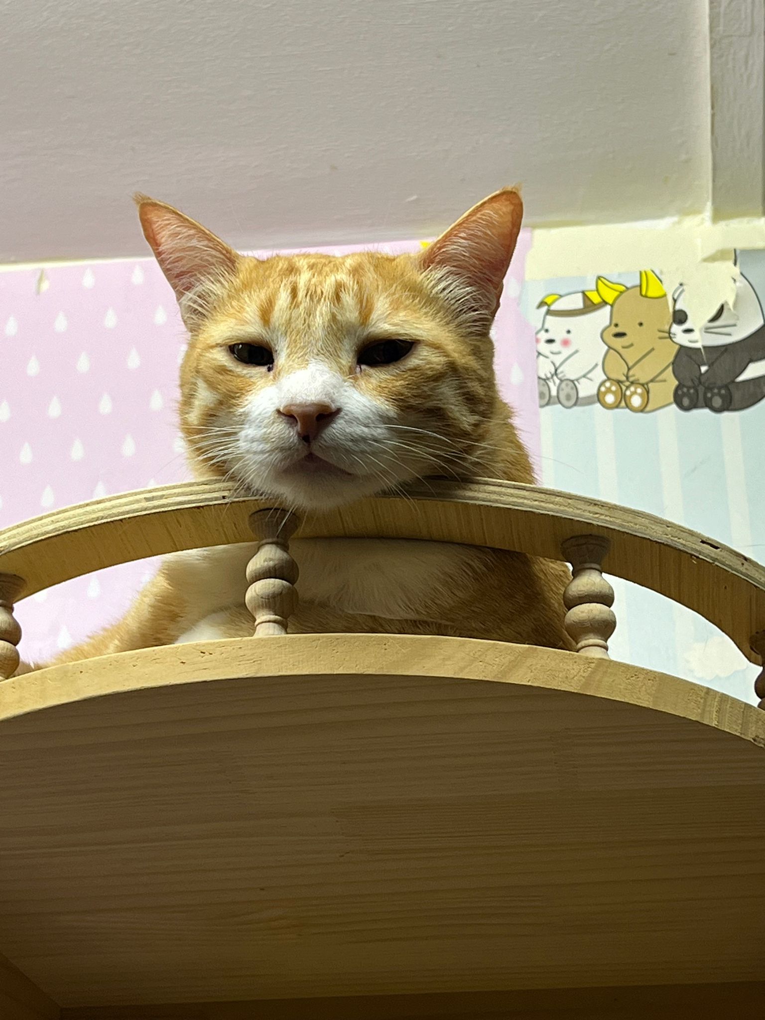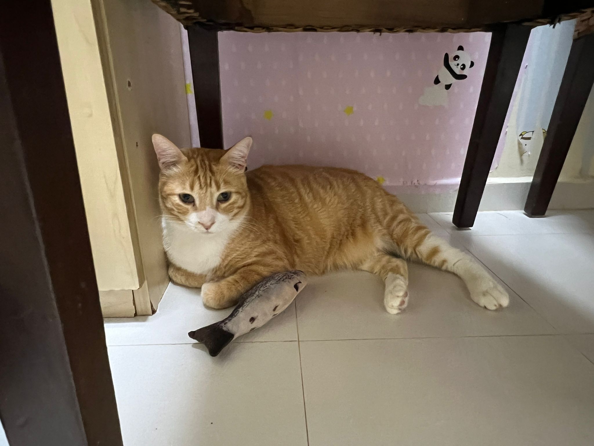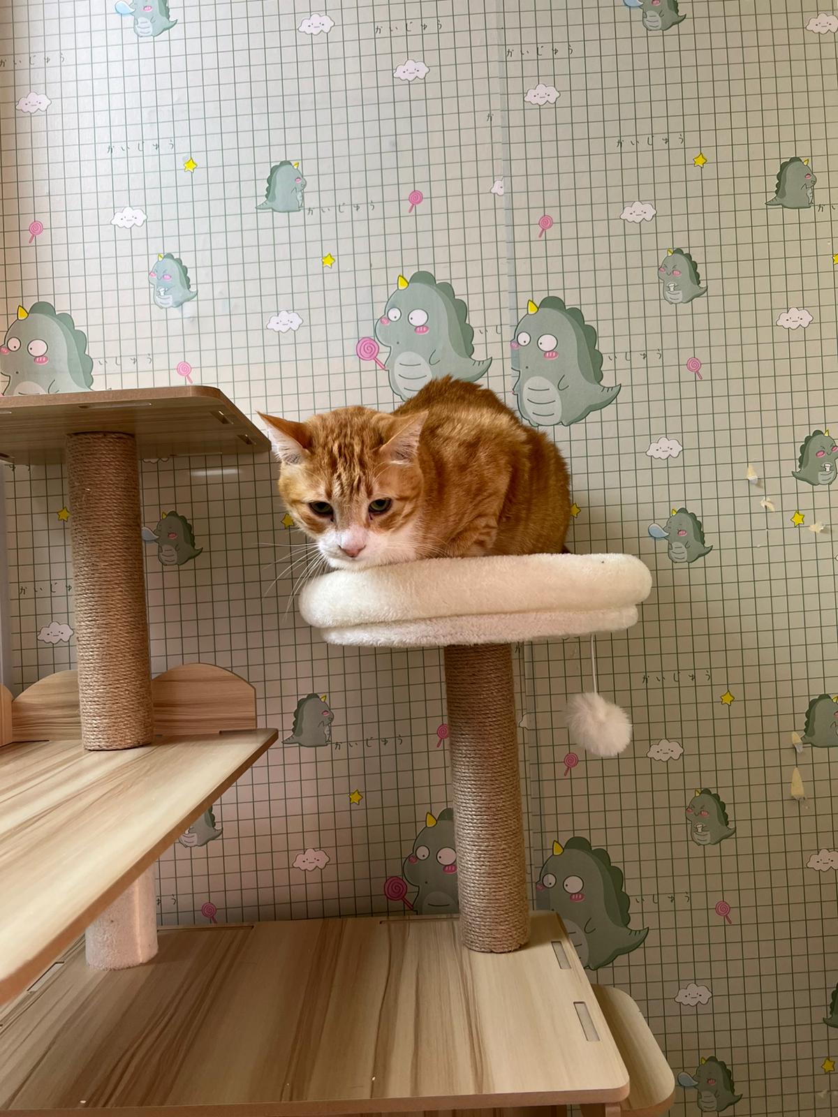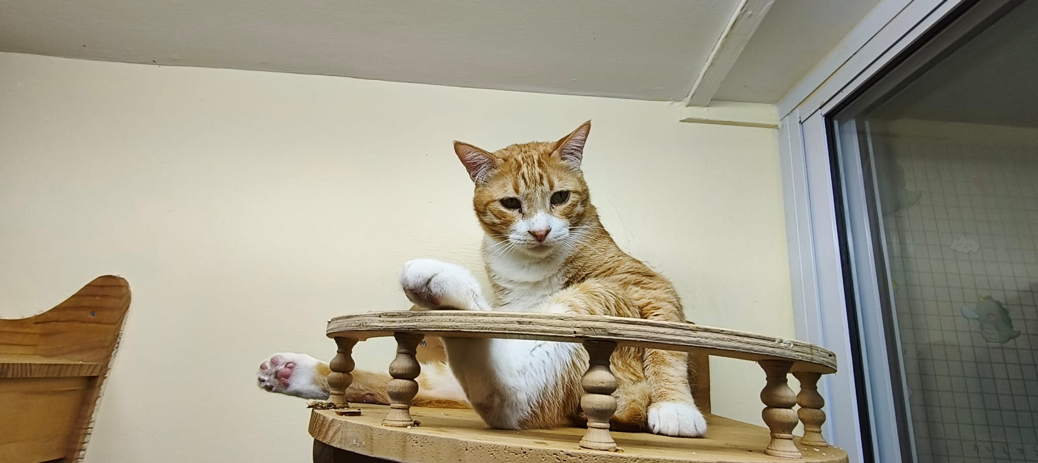 Follow his mummy Amber since young, scare of human, don’t allow touch. He don’t really attack me if I touch him but he will fly away. He is playful, play feather time n laser light he will come. I assume he grow up well in 猫房 – muscular and strong.