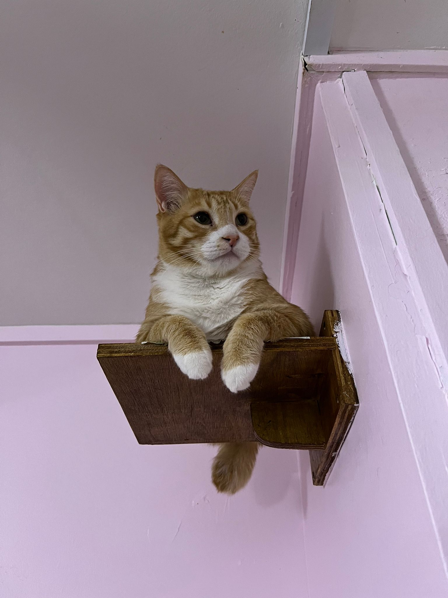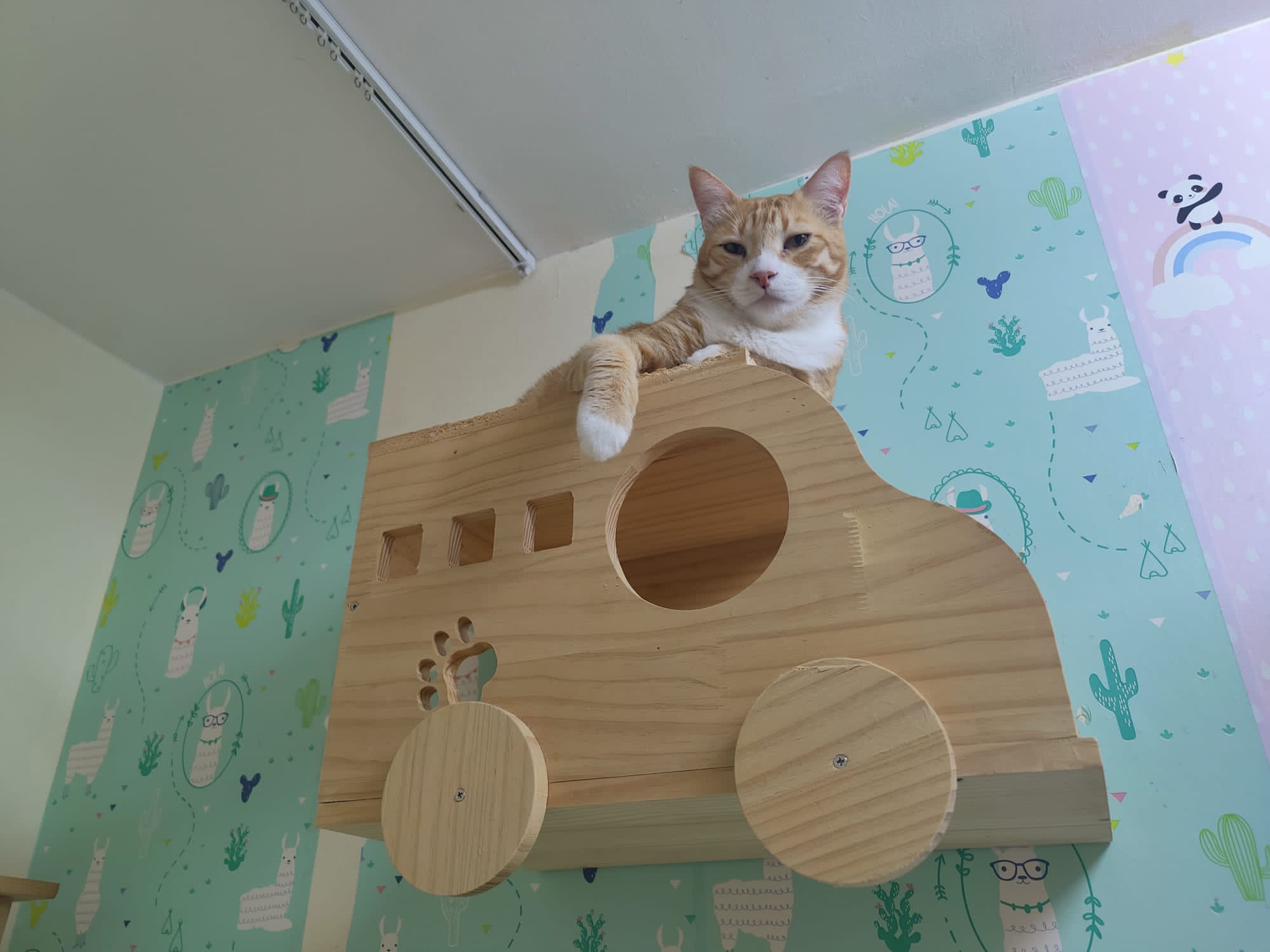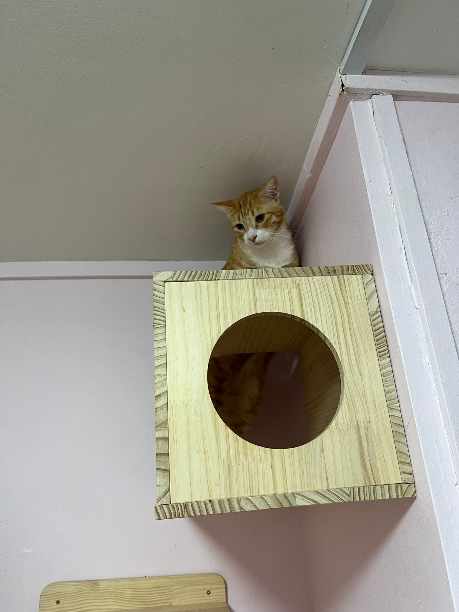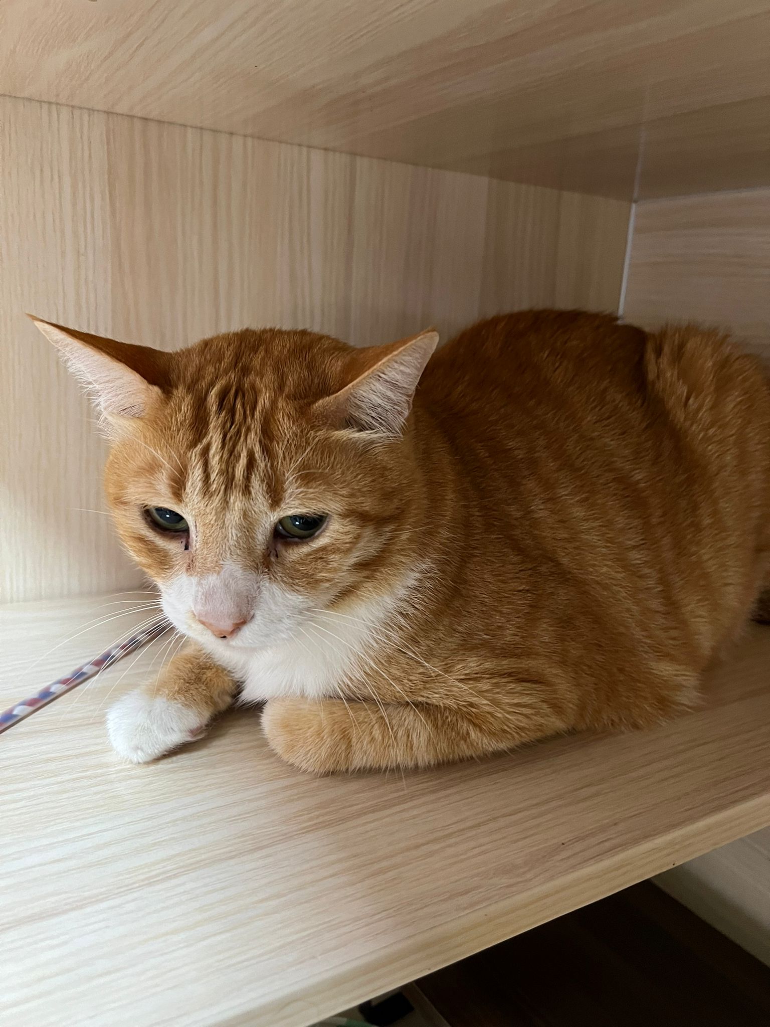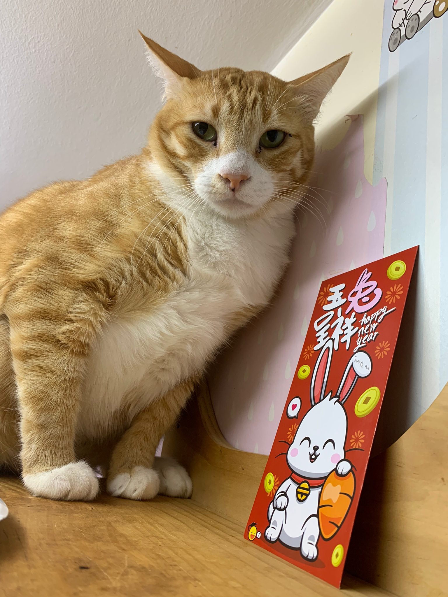 Follow his mummy Amber since young, scare of human, don’t allow touch. He don’t really attack me if I touch him but he will fly away. He is playful, play feather time n laser light he will come. I assume he grow up well in 猫房 – muscular and strong.