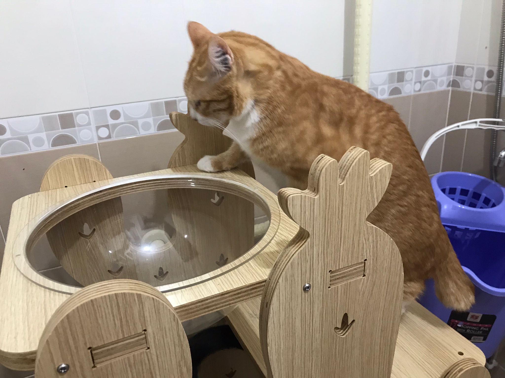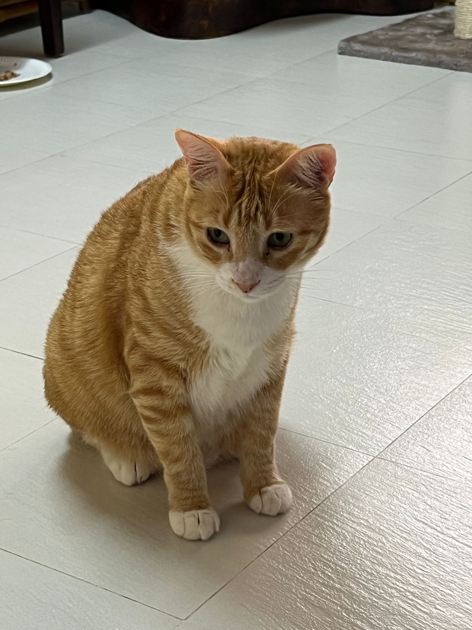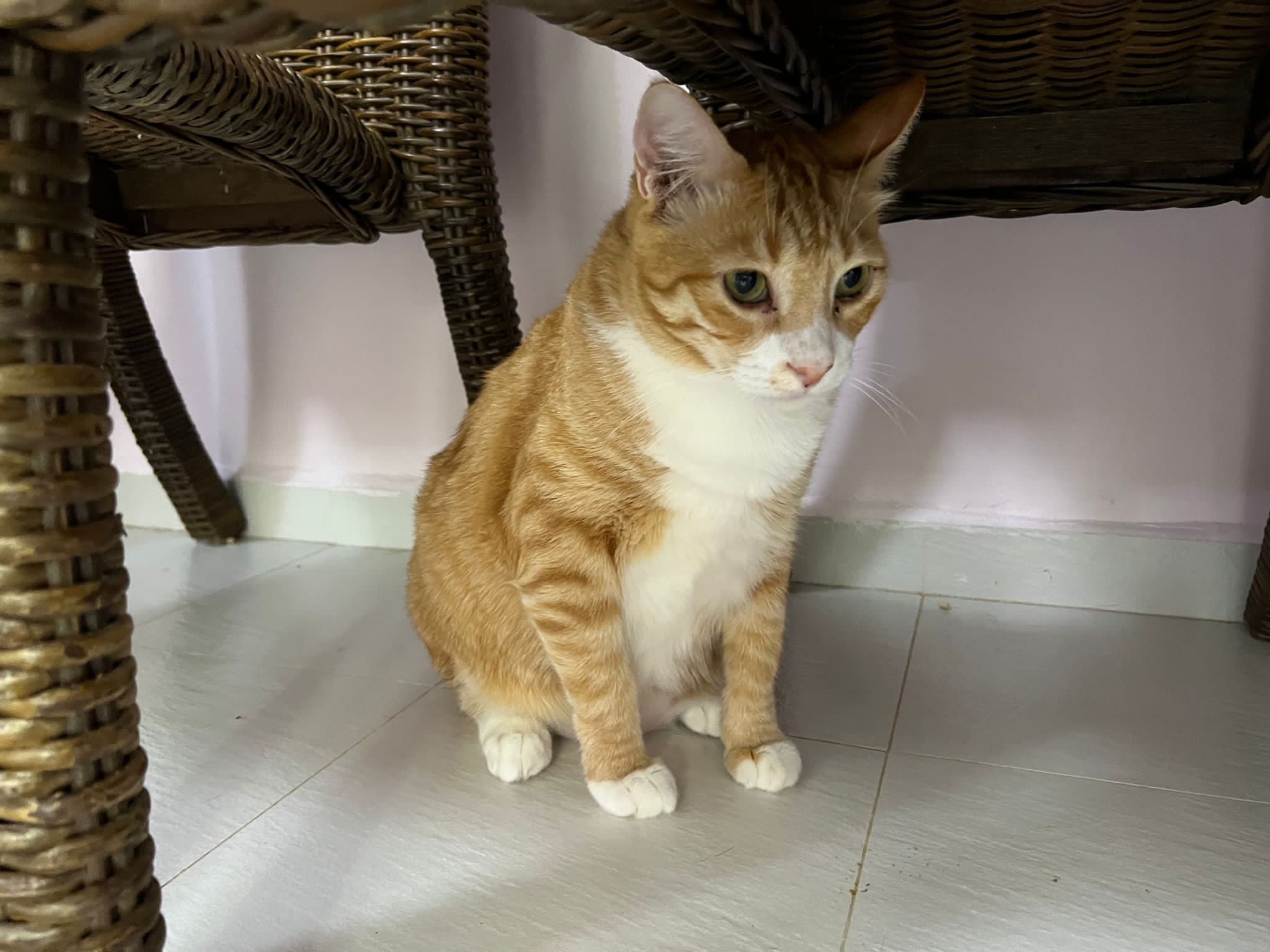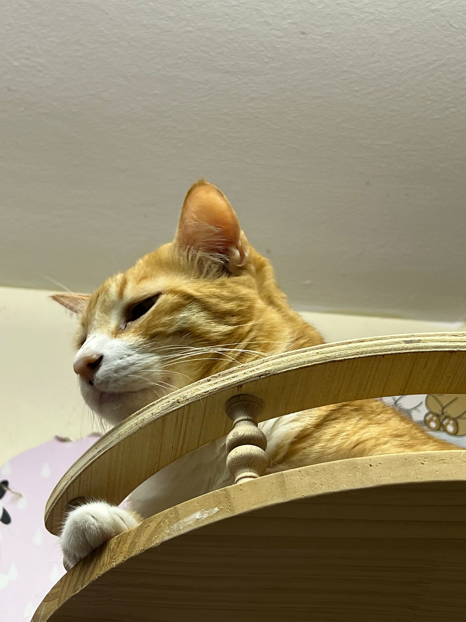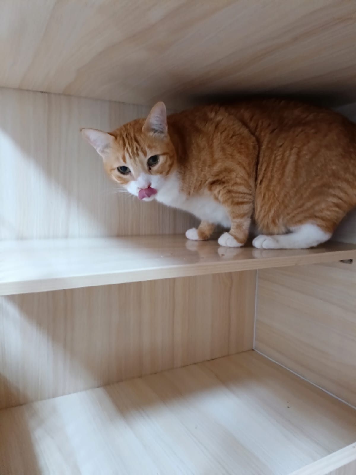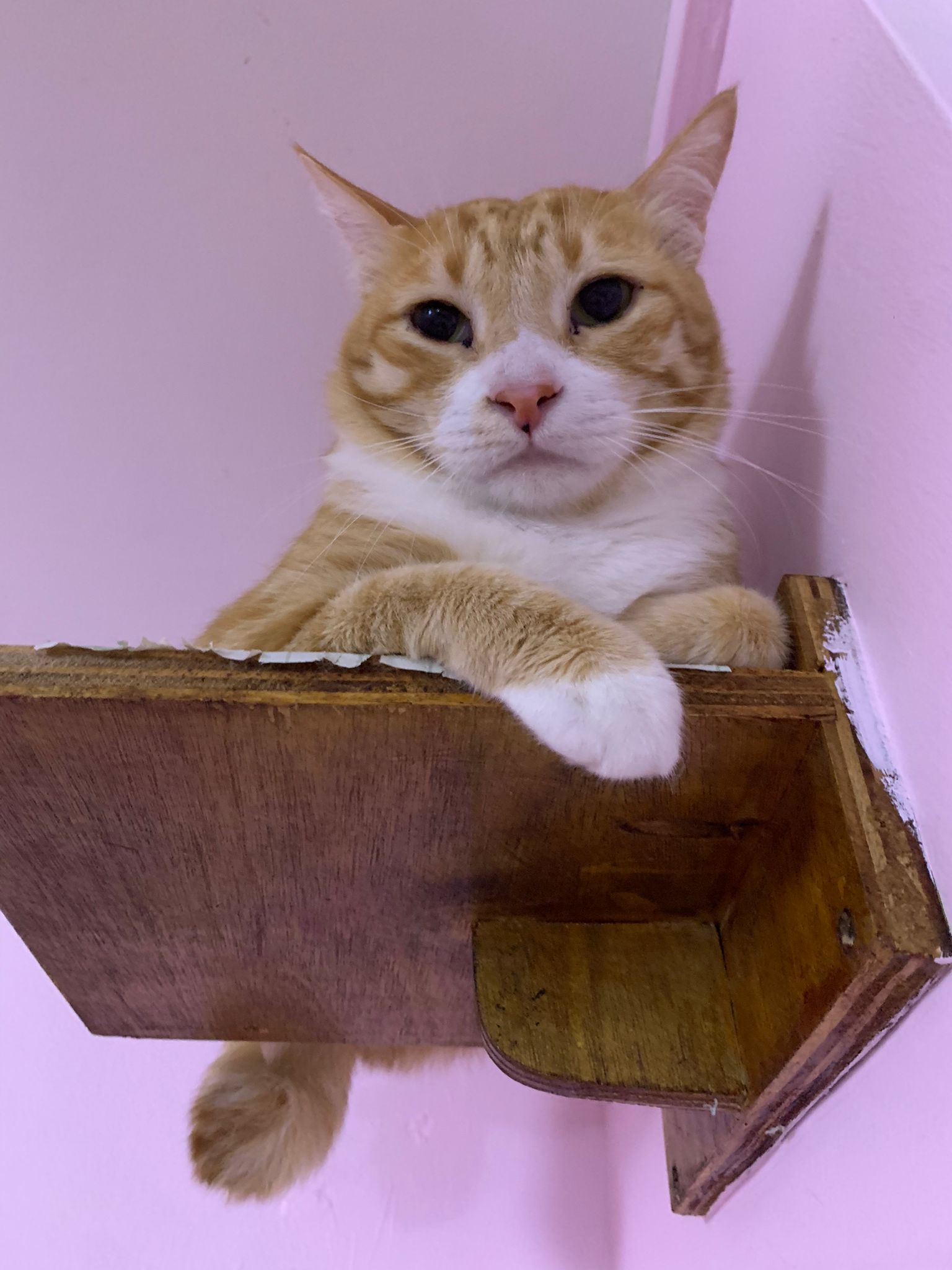 Follow his mummy Amber since young, scare of human, don’t allow touch. He don’t really attack me if I touch him but he will fly away. He is playful, play feather time n laser light he will come. I assume he grow up well in 猫房 – muscular and strong.