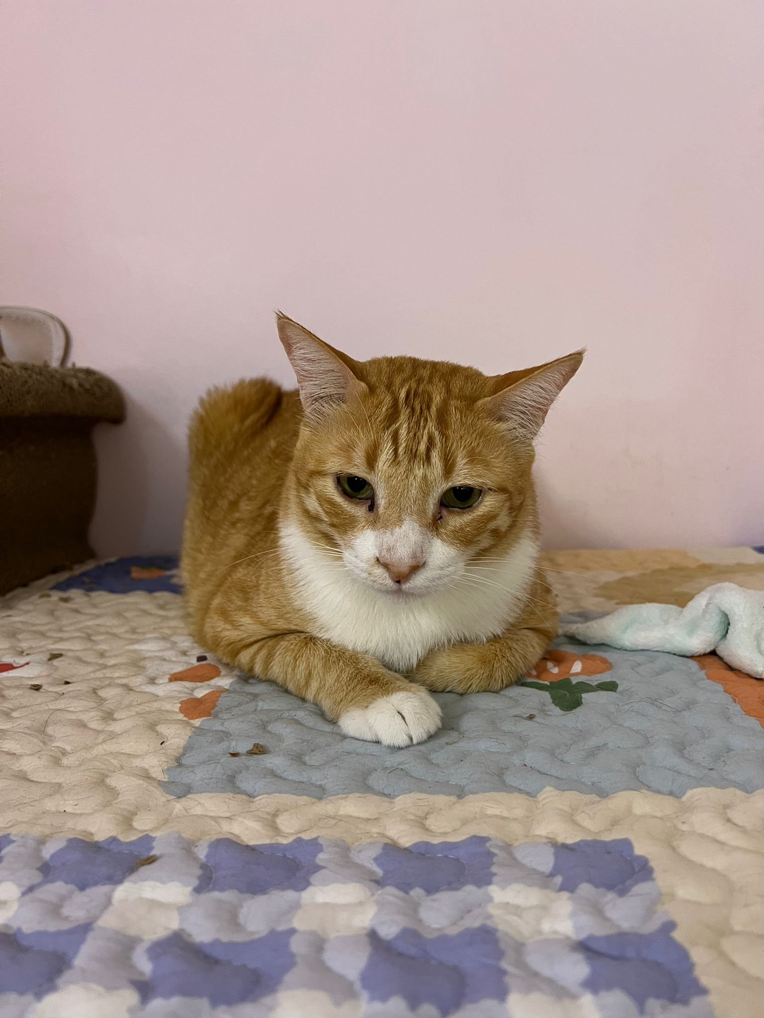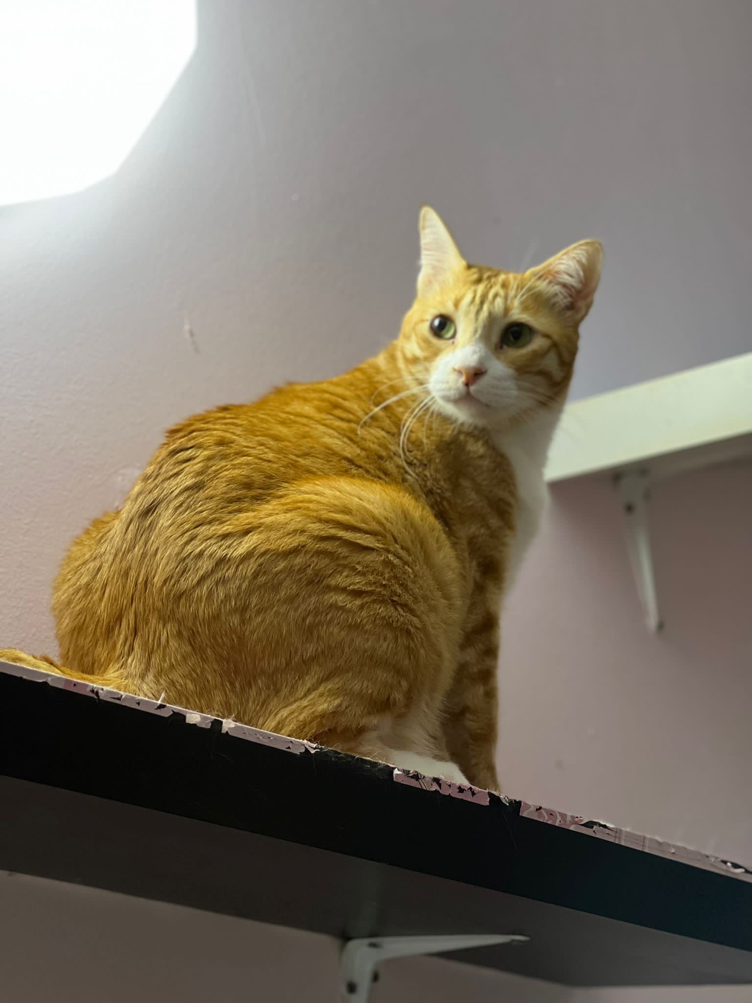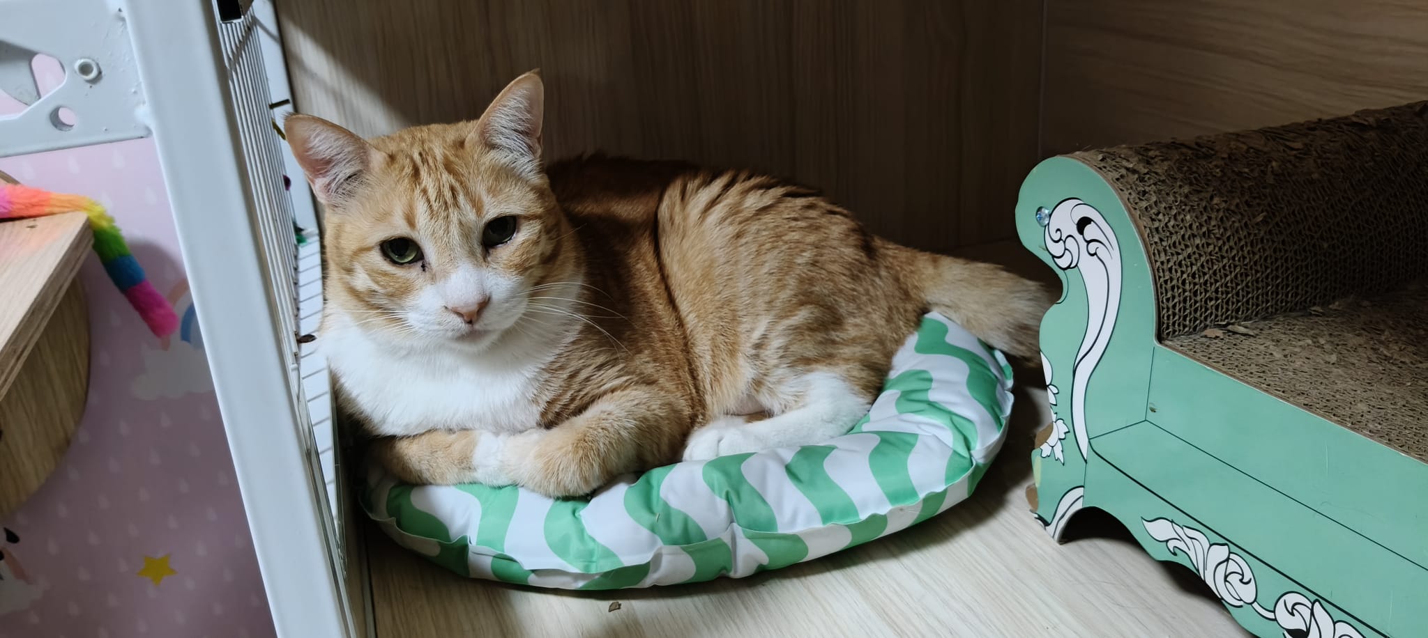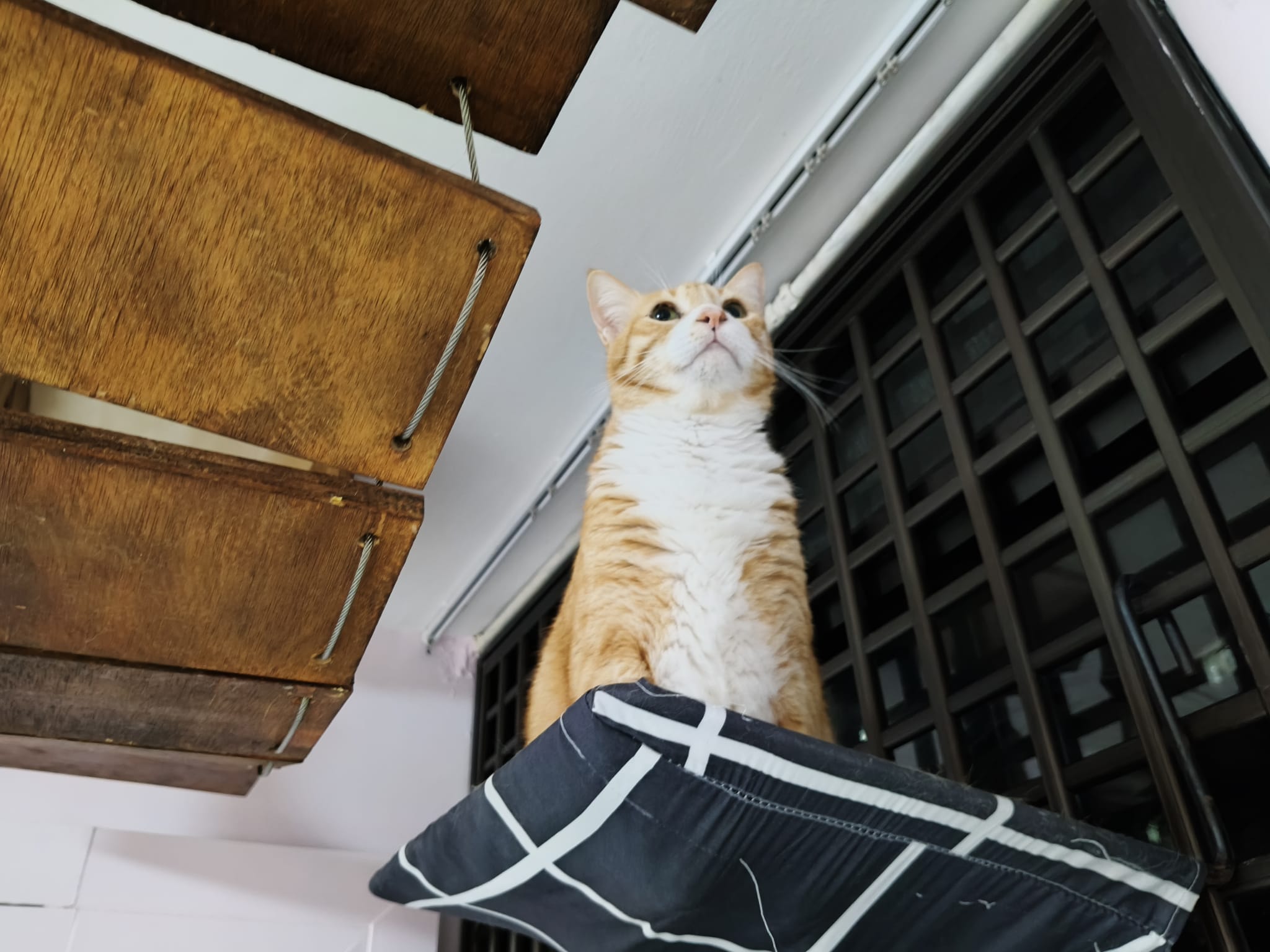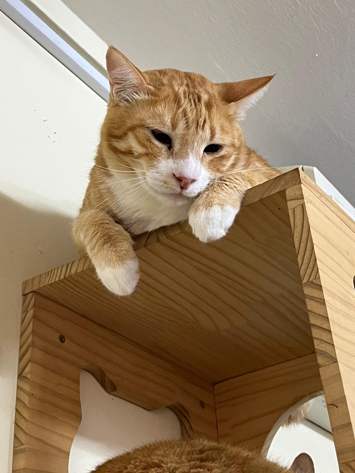 Follow his mummy Amber since young, scare of human, don’t allow touch. He don’t really attack me if I touch him but he will fly away. He is playful, play feather time n laser light he will come. I assume he grow up well in 猫房 – muscular and strong.