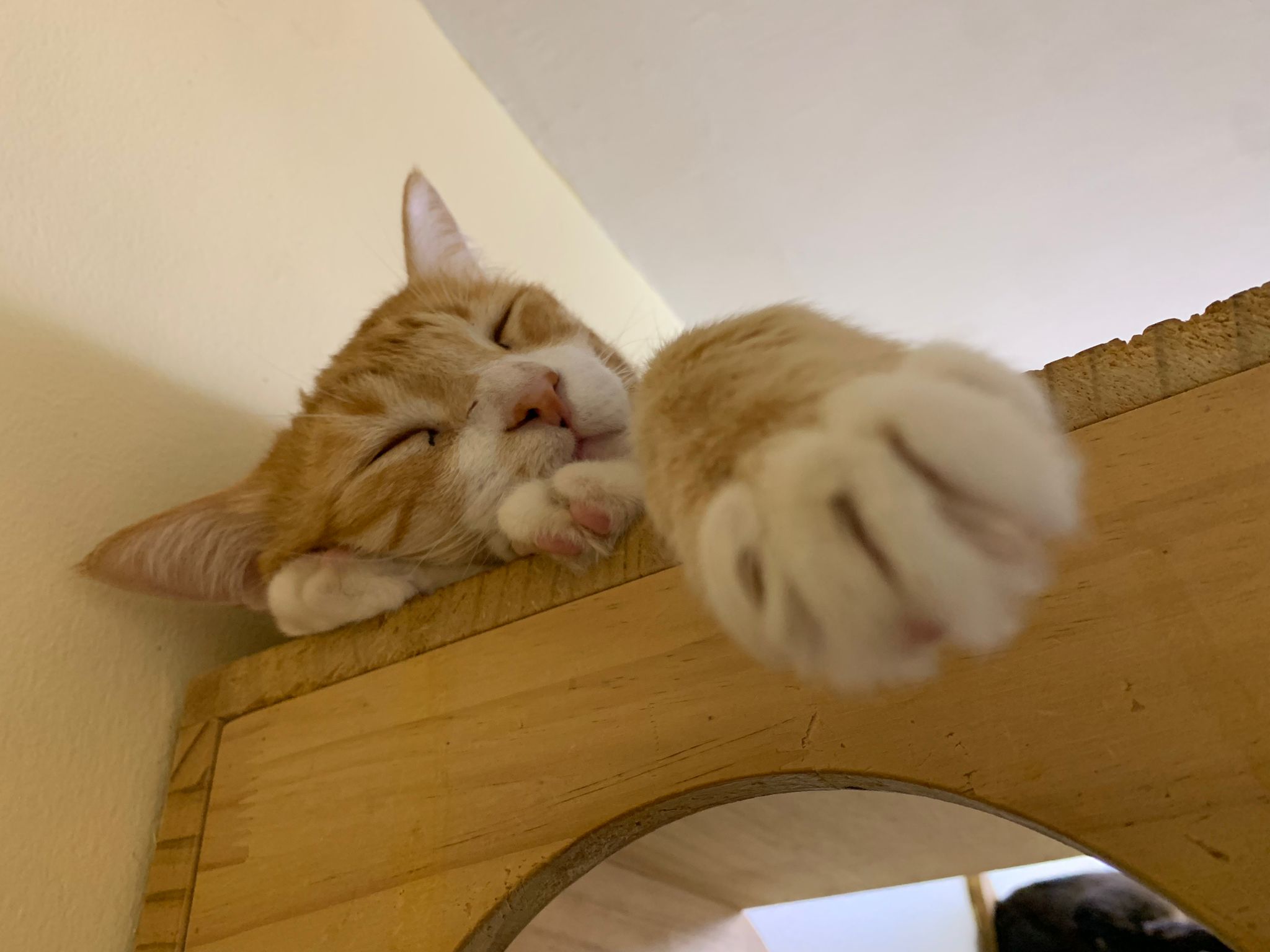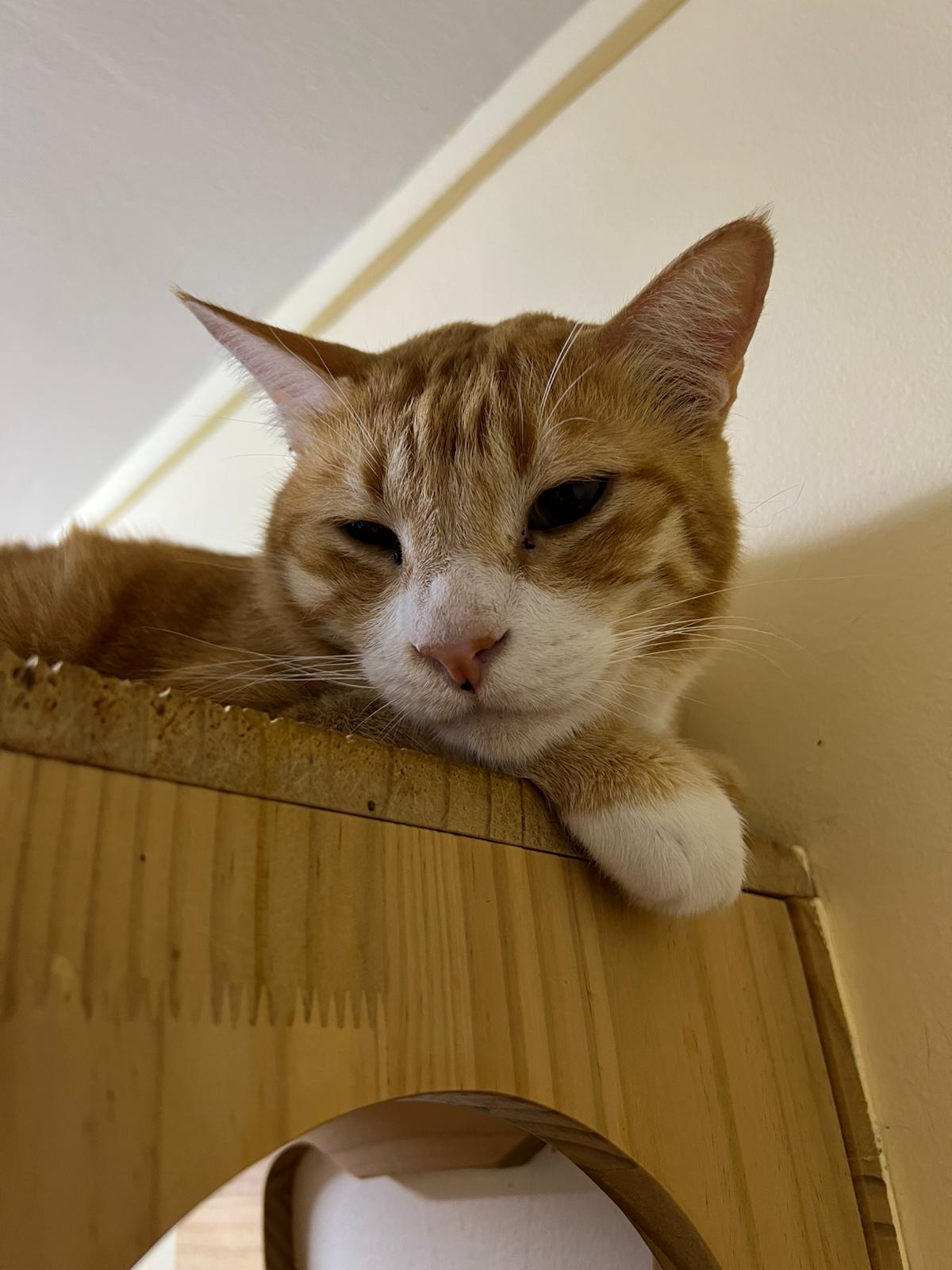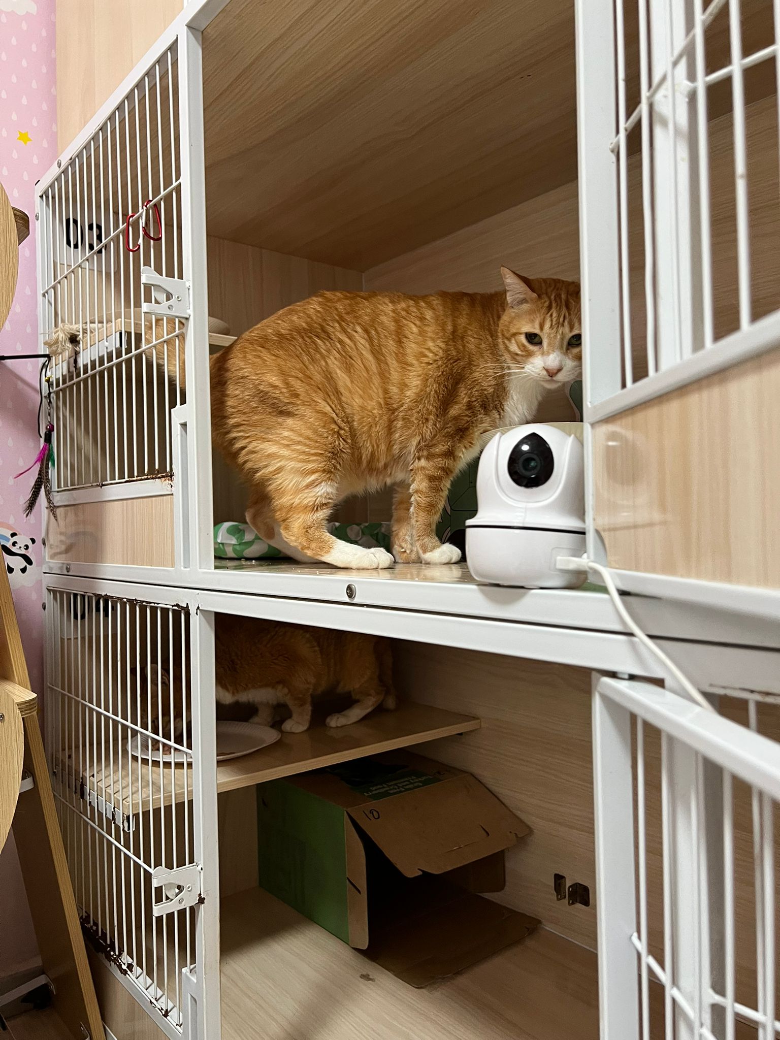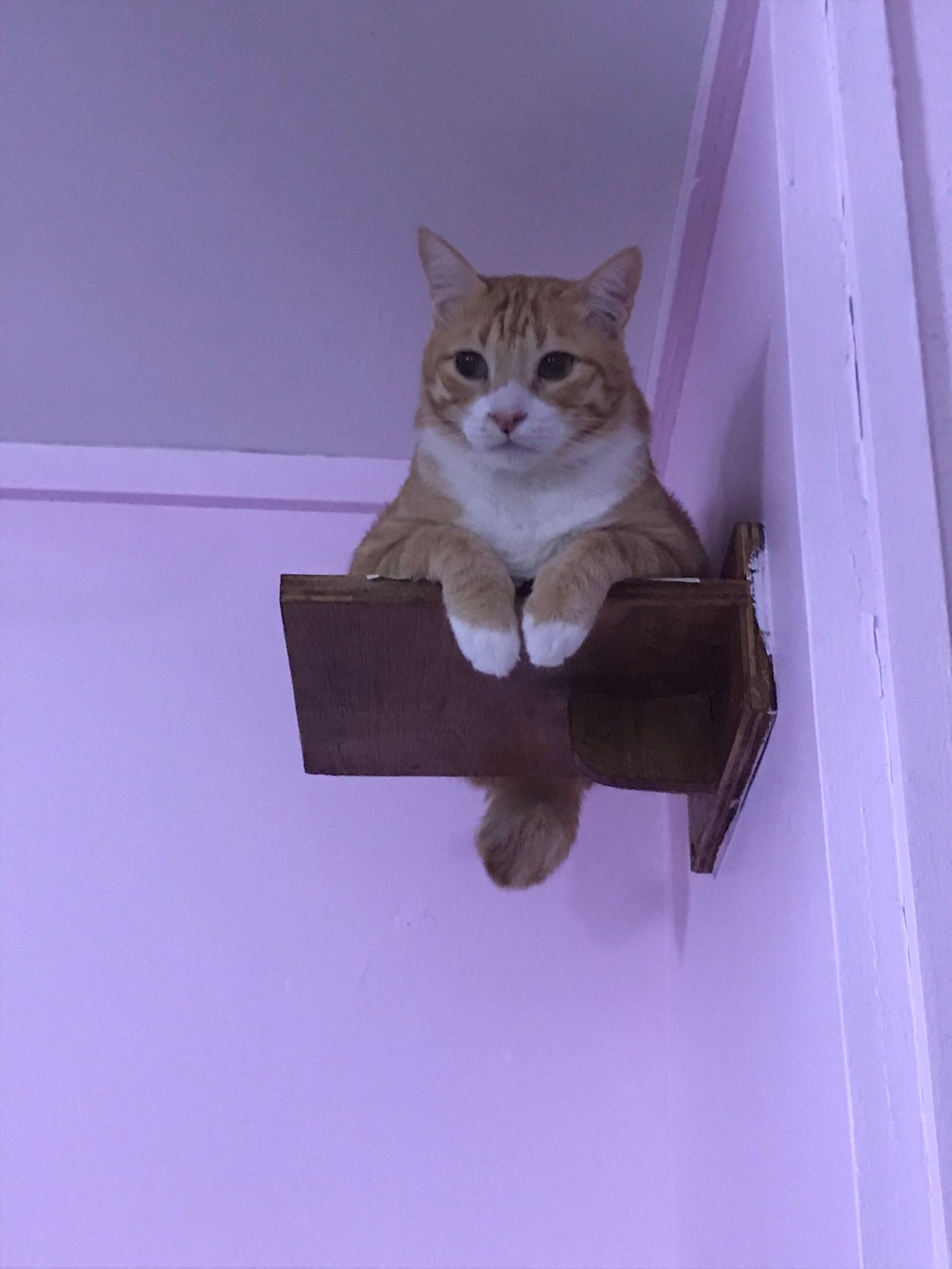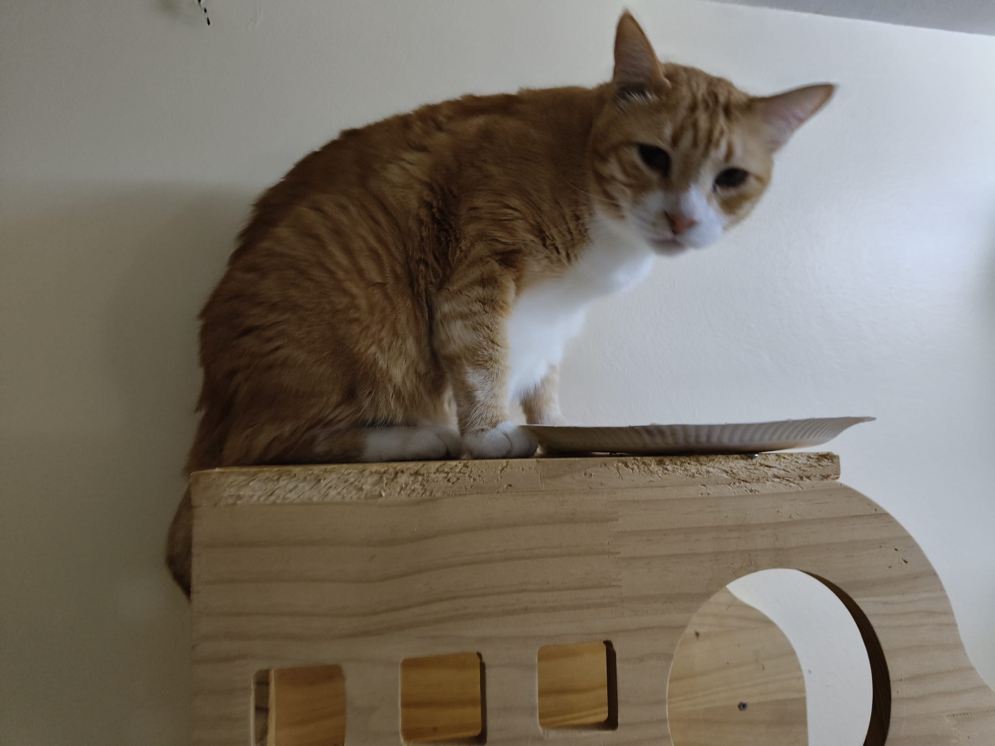 Follow his mummy Amber since young, scare of human, don’t allow touch. He don’t really attack me if I touch him but he will fly away. He is playful, play feather time n laser light he will come. I assume he grow up well in 猫房 – muscular and strong.