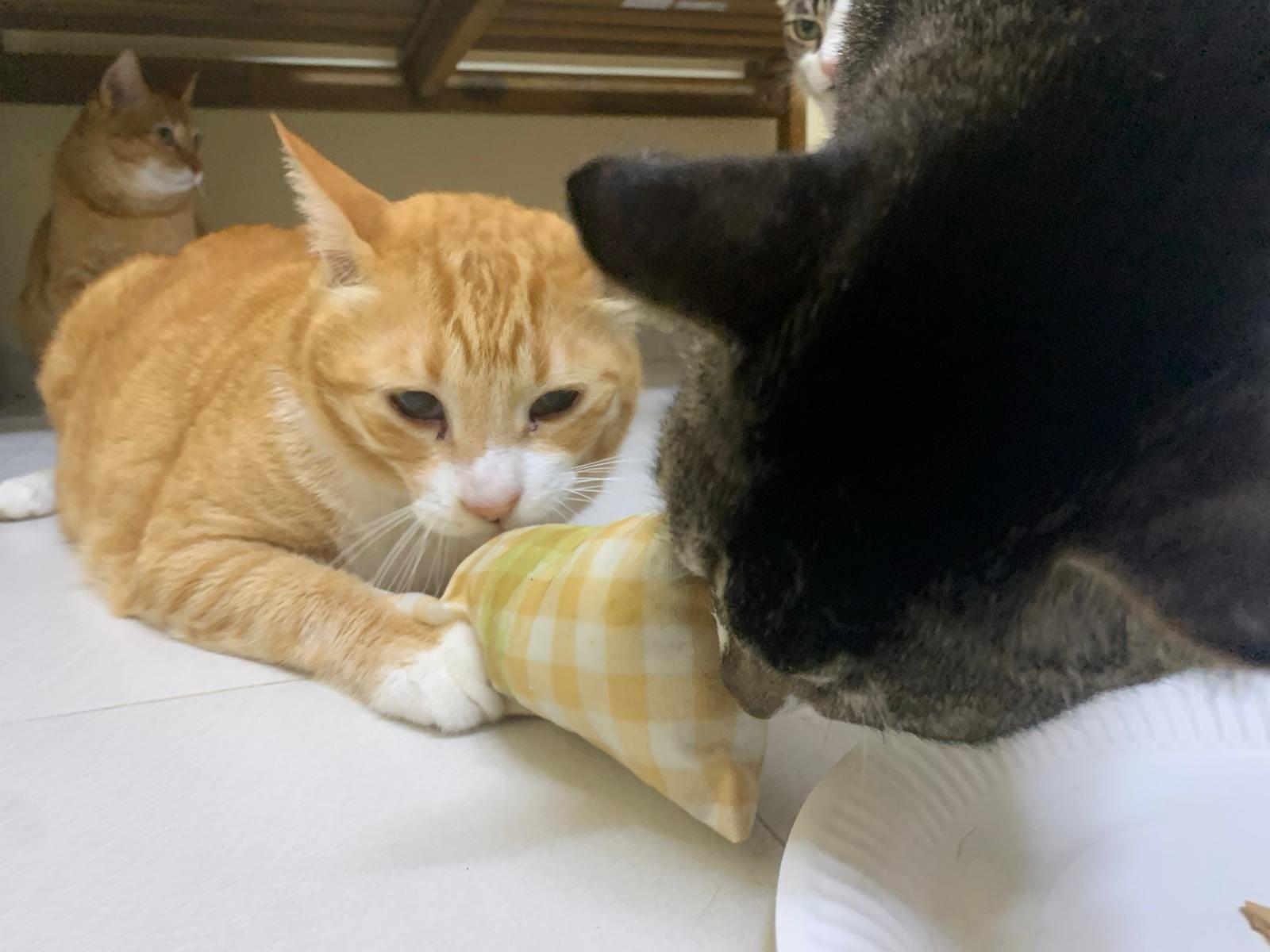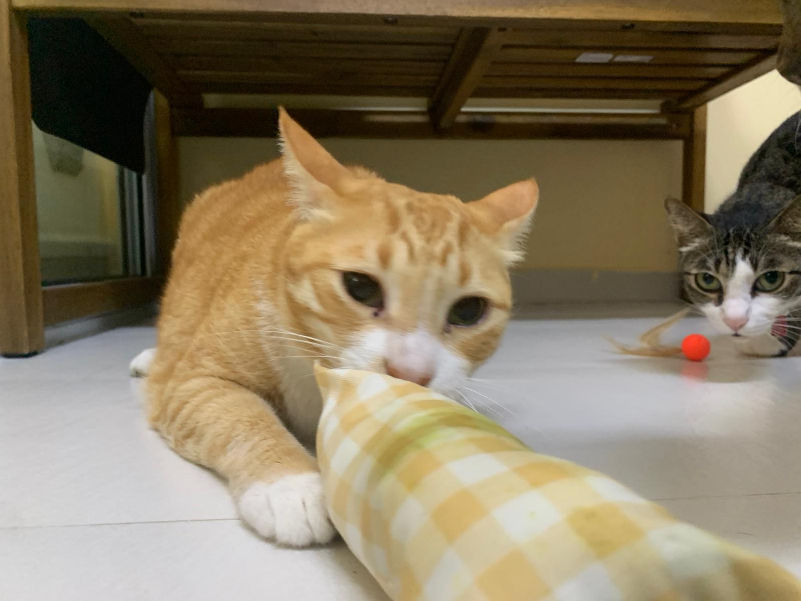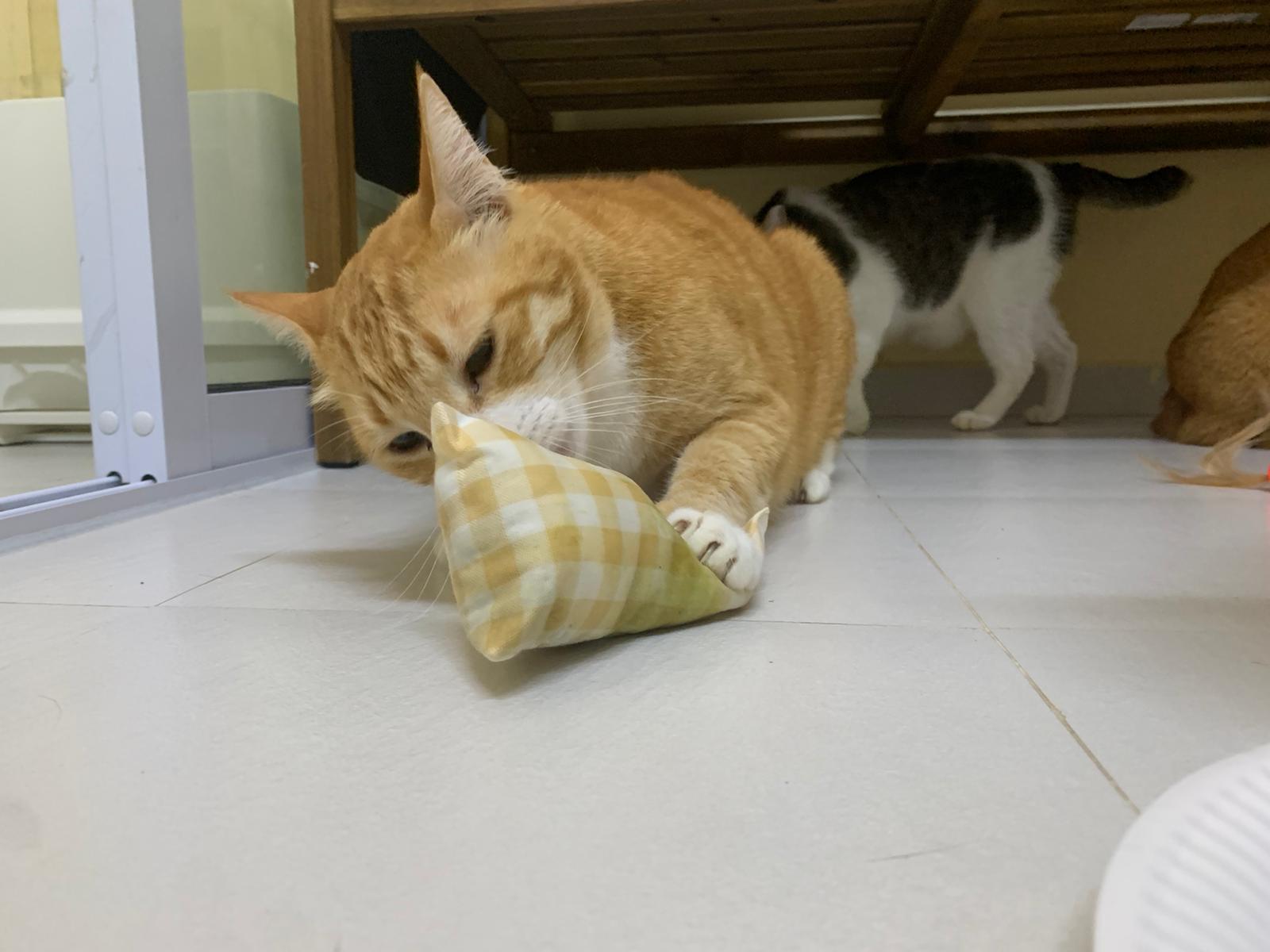 Morning: I throw them a Joni big catnip pillow, he play until very happy loh. Jack join him