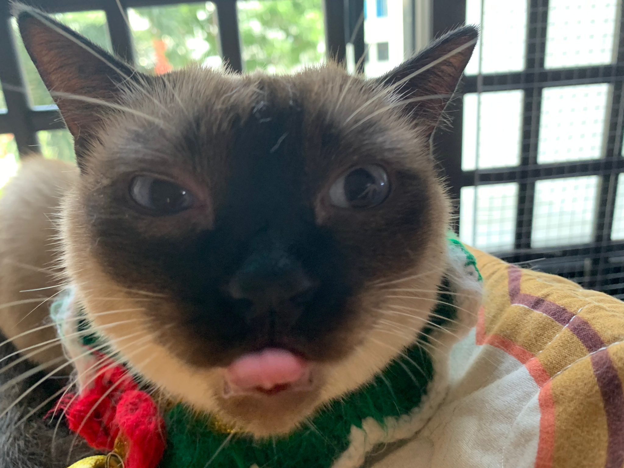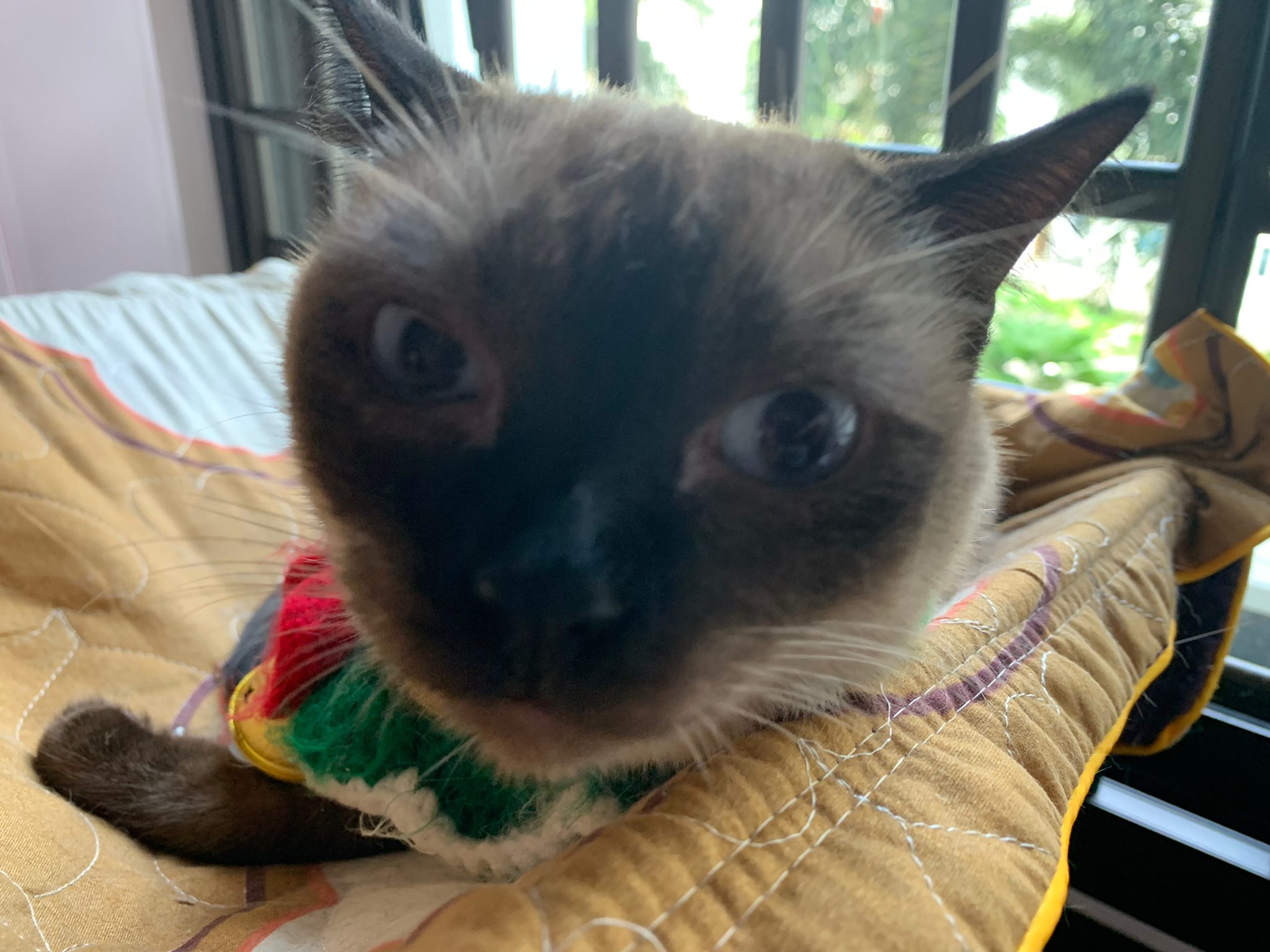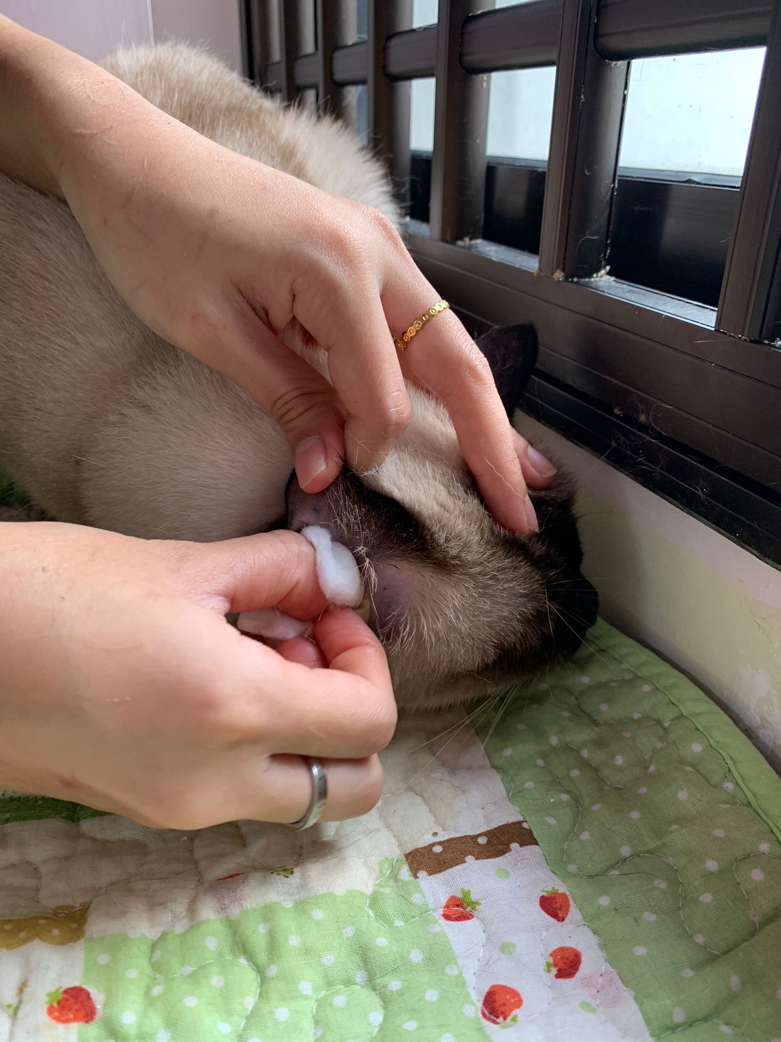 Morning: her mouth got saliva, pls don’t have d dental problem ah, we don’t have good dental vet in Singapore le. wipe her mouth le then took photos aiya.