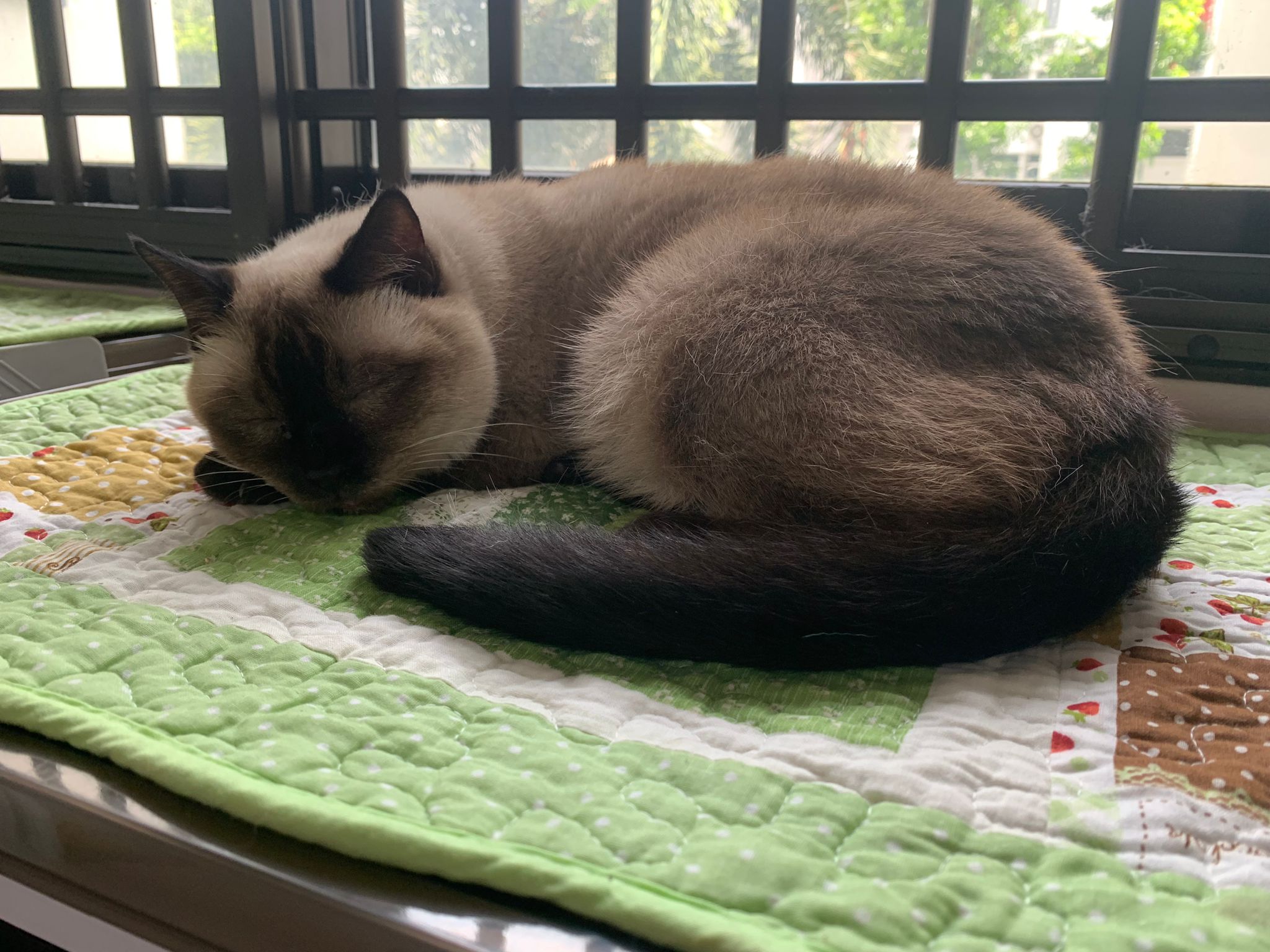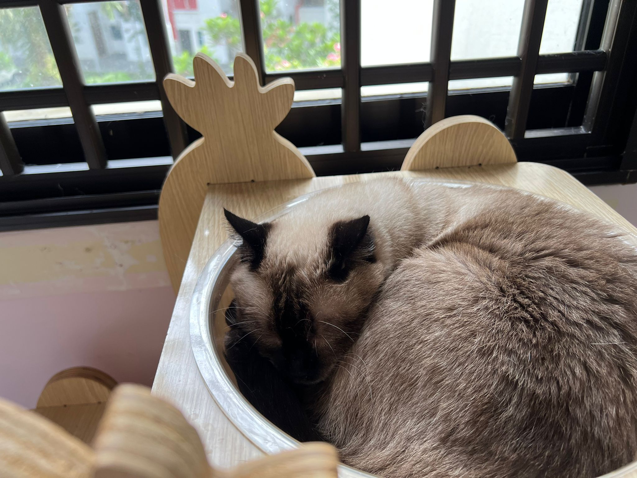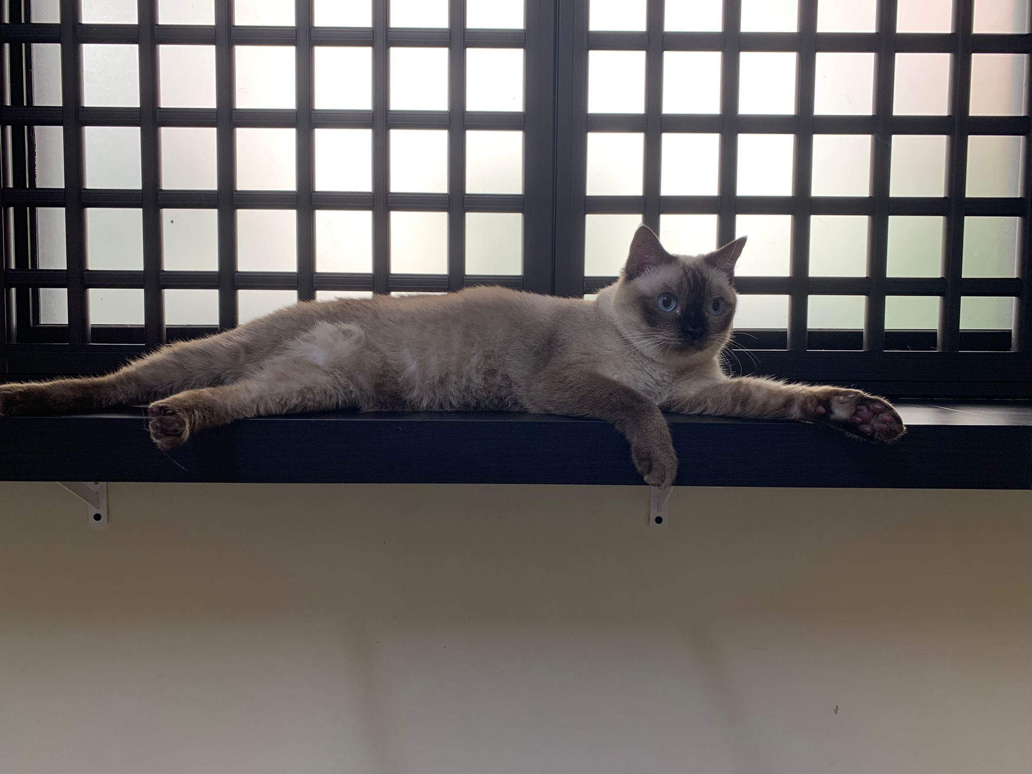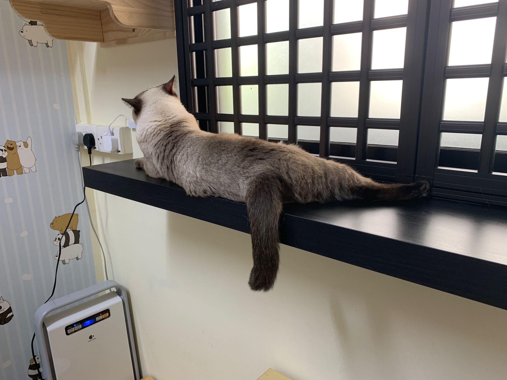 Morning: yesterday brownie and junior don’t give her any chance to go up the cabinet by the window, this morning she is sooooo happy that she flop right there, sleep there n don’t want to move at all.
