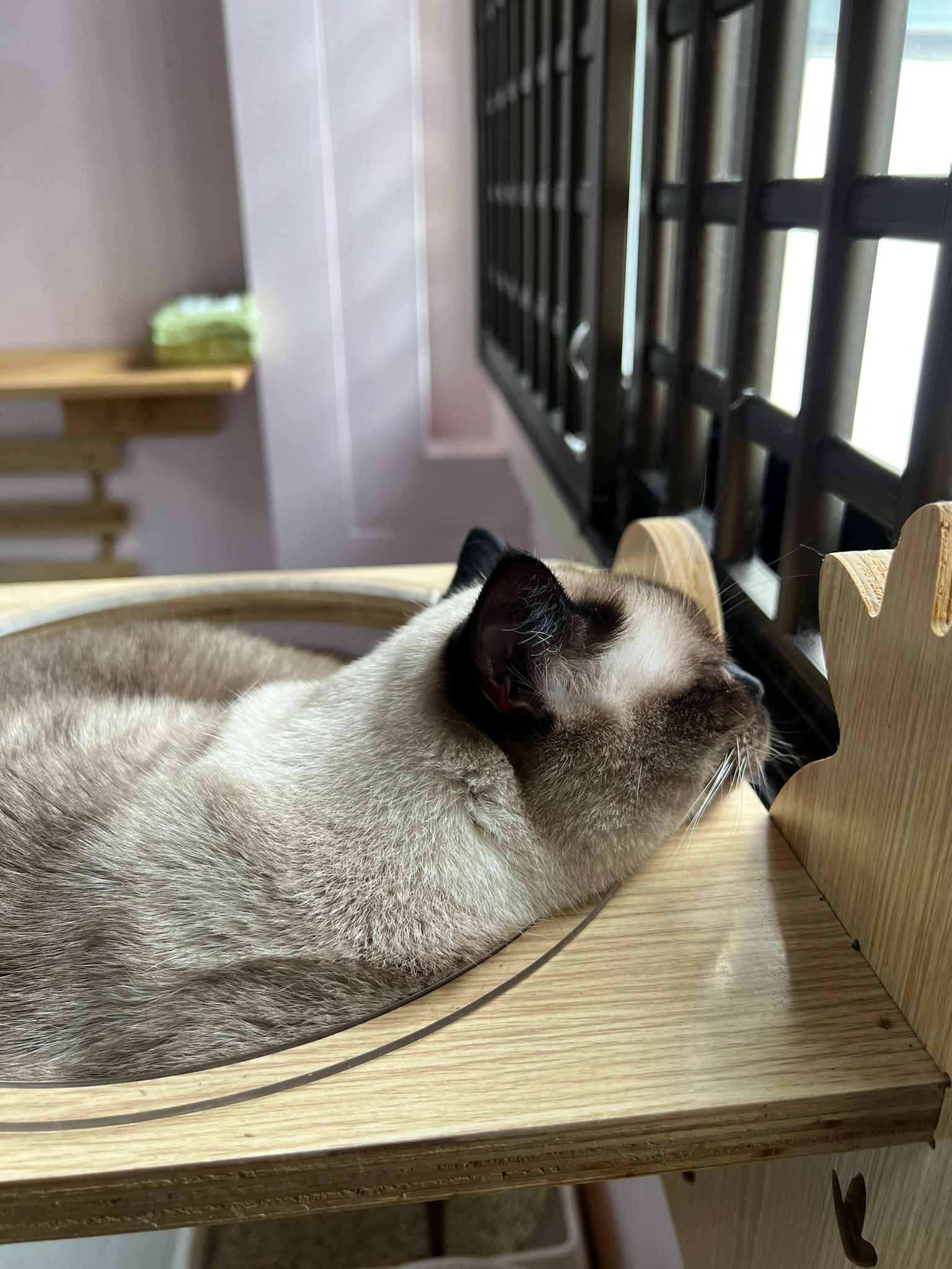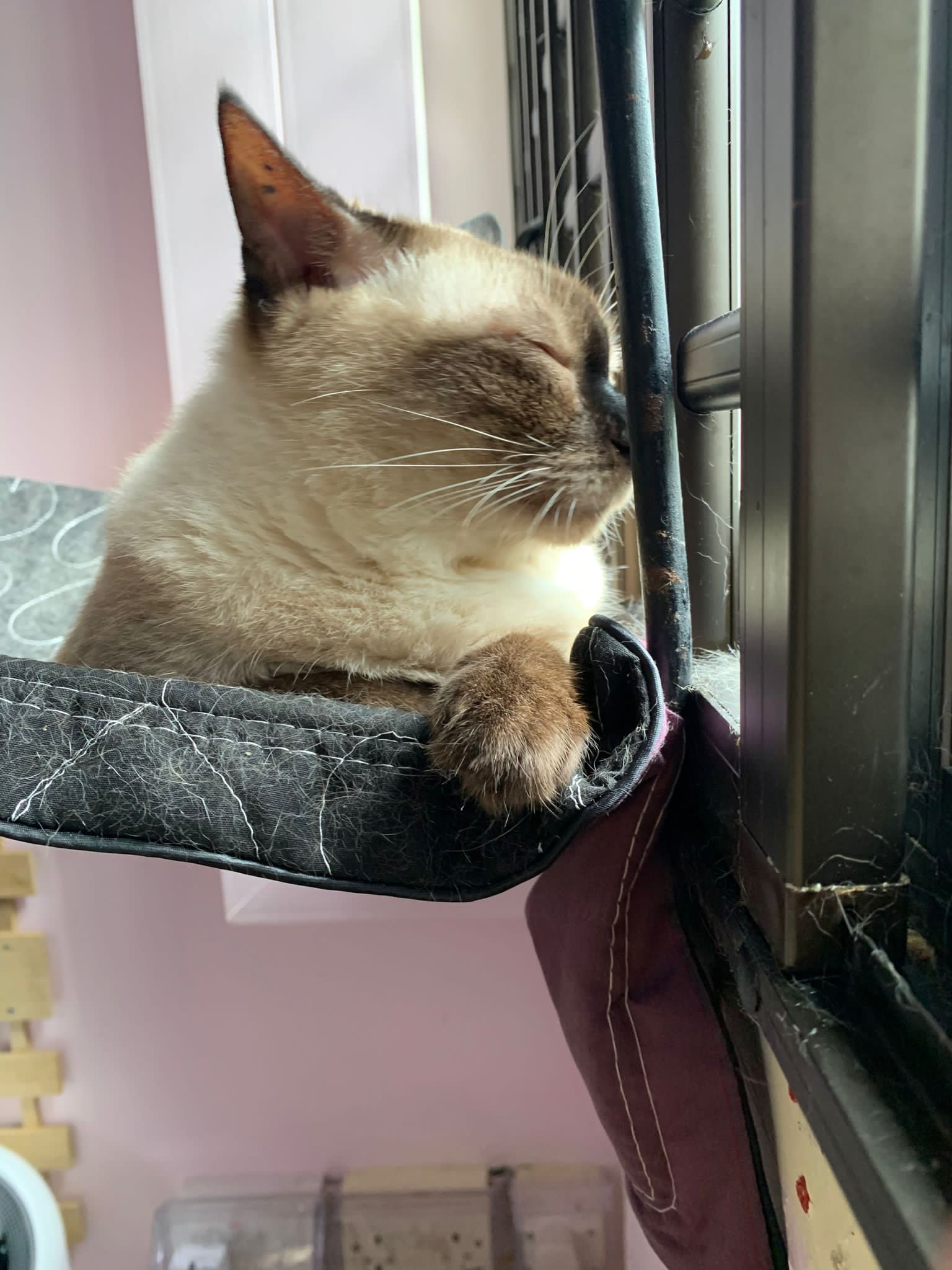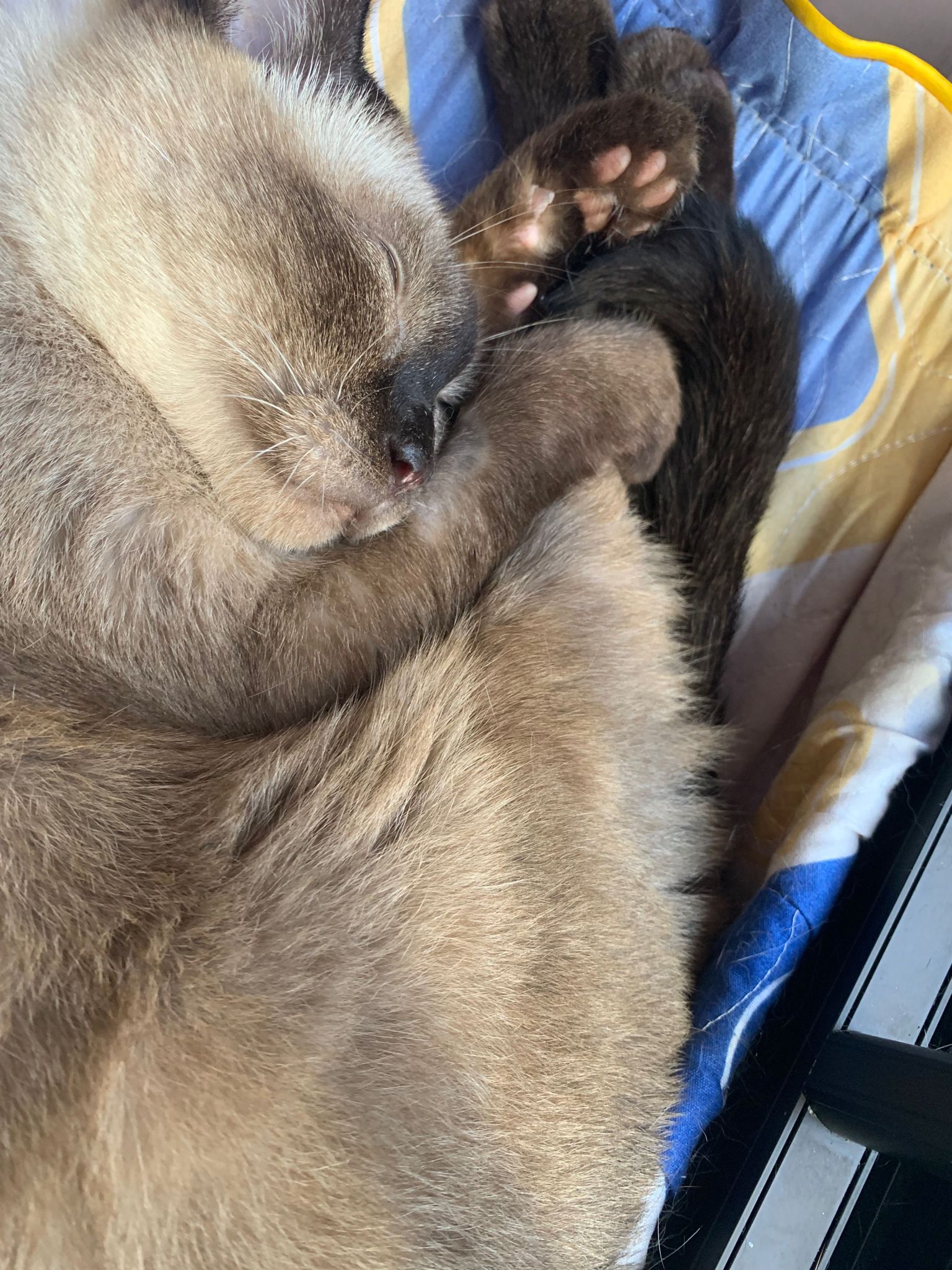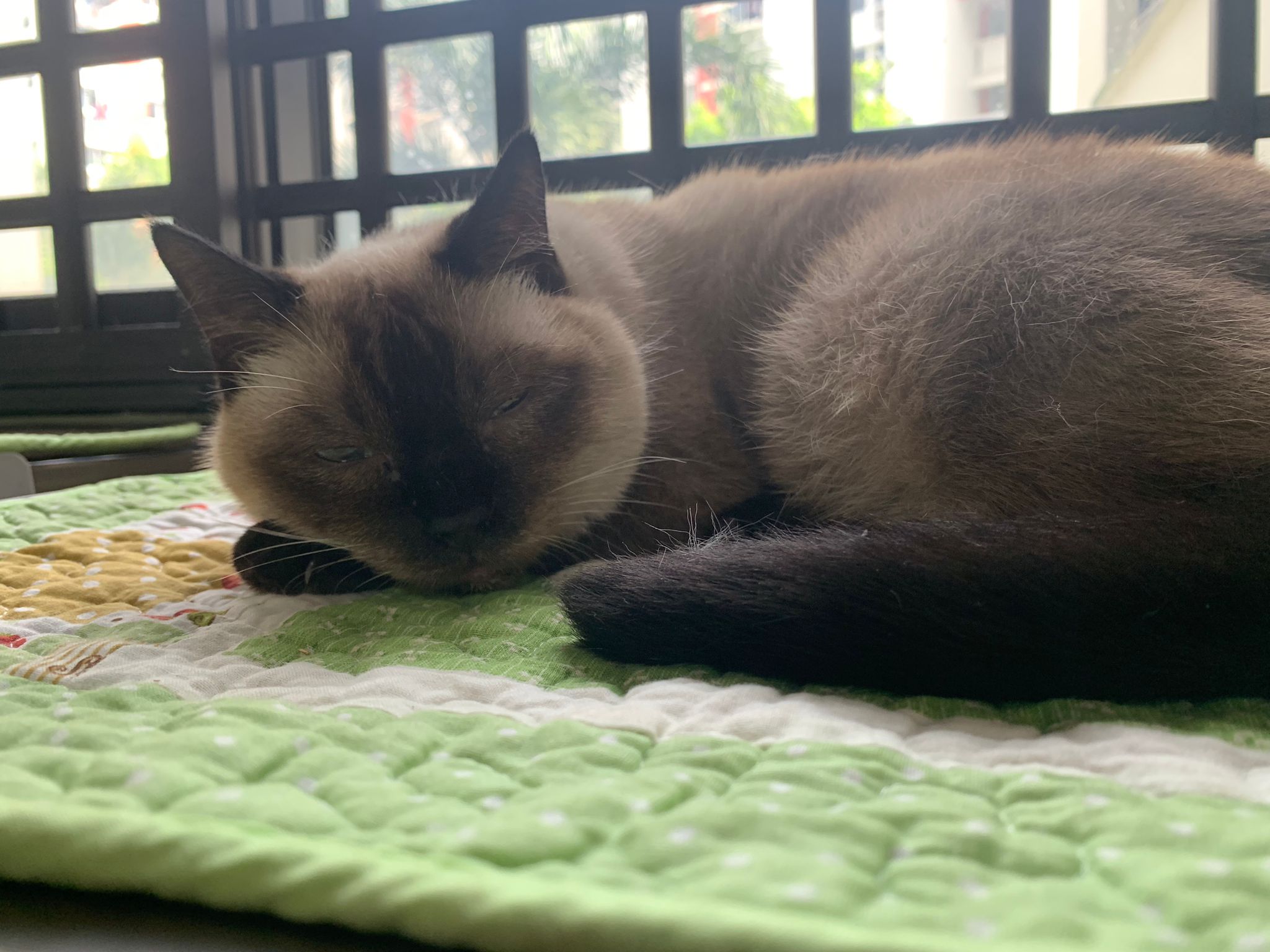 Morning: yesterday brownie and junior don’t give her any chance to go up the cabinet by the window, this morning she is sooooo happy that she flop right there, sleep there n don’t want to move at all.