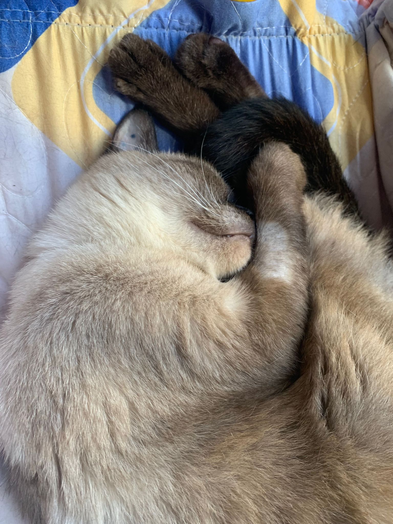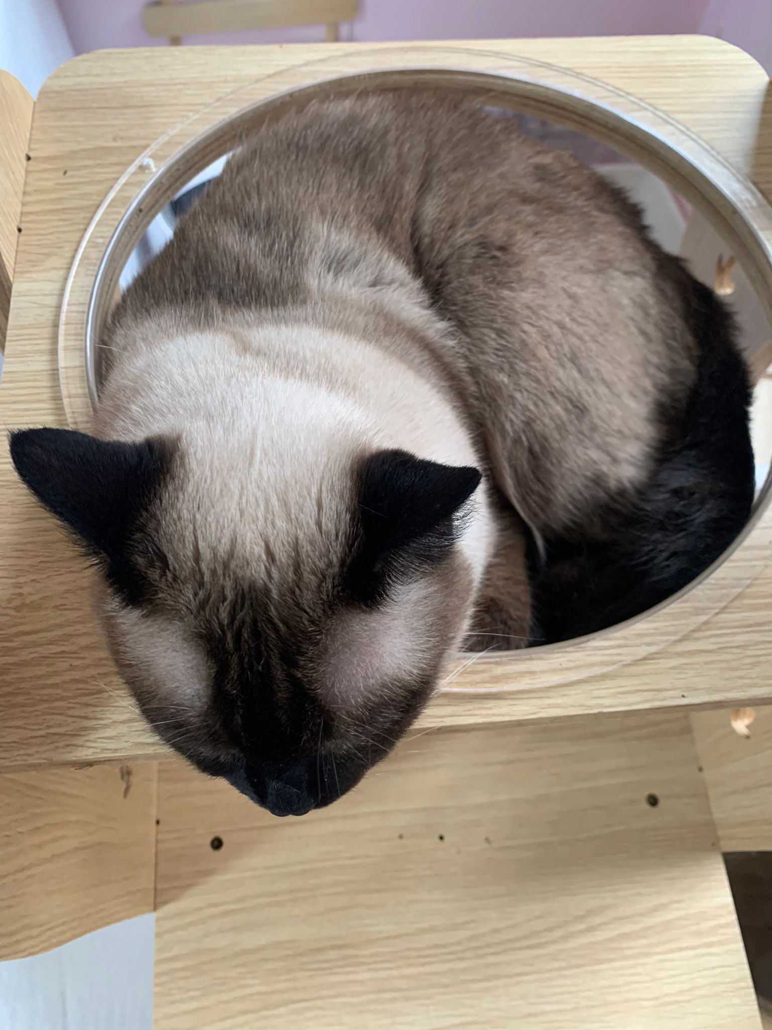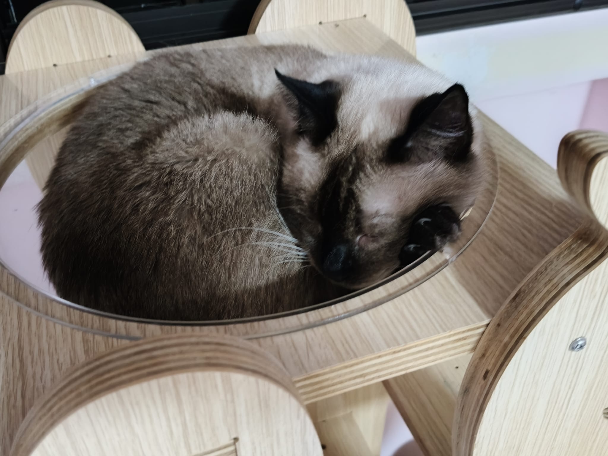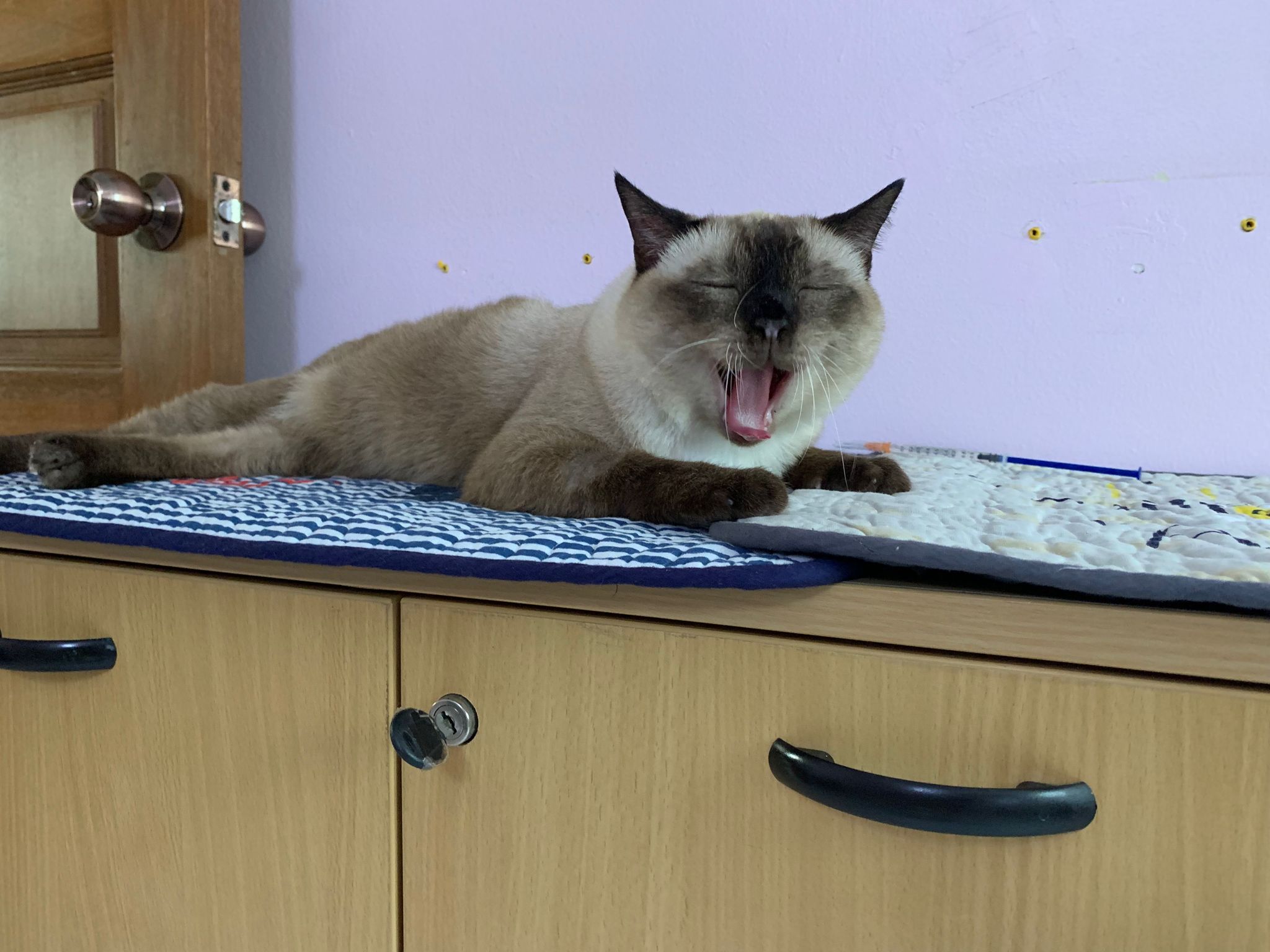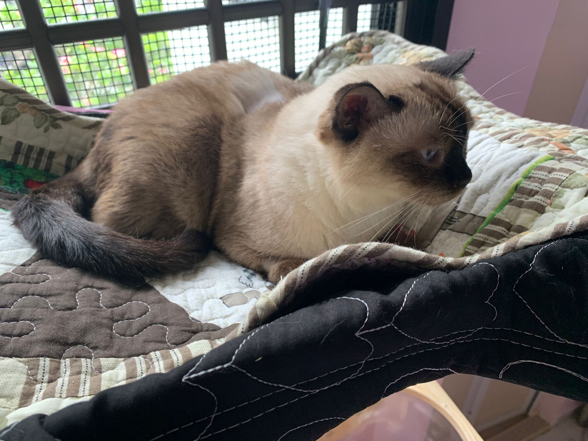 Morning: yesterday brownie and junior don’t give her any chance to go up the cabinet by the window, this morning she is sooooo happy that she flop right there, sleep there n don’t want to move at all.