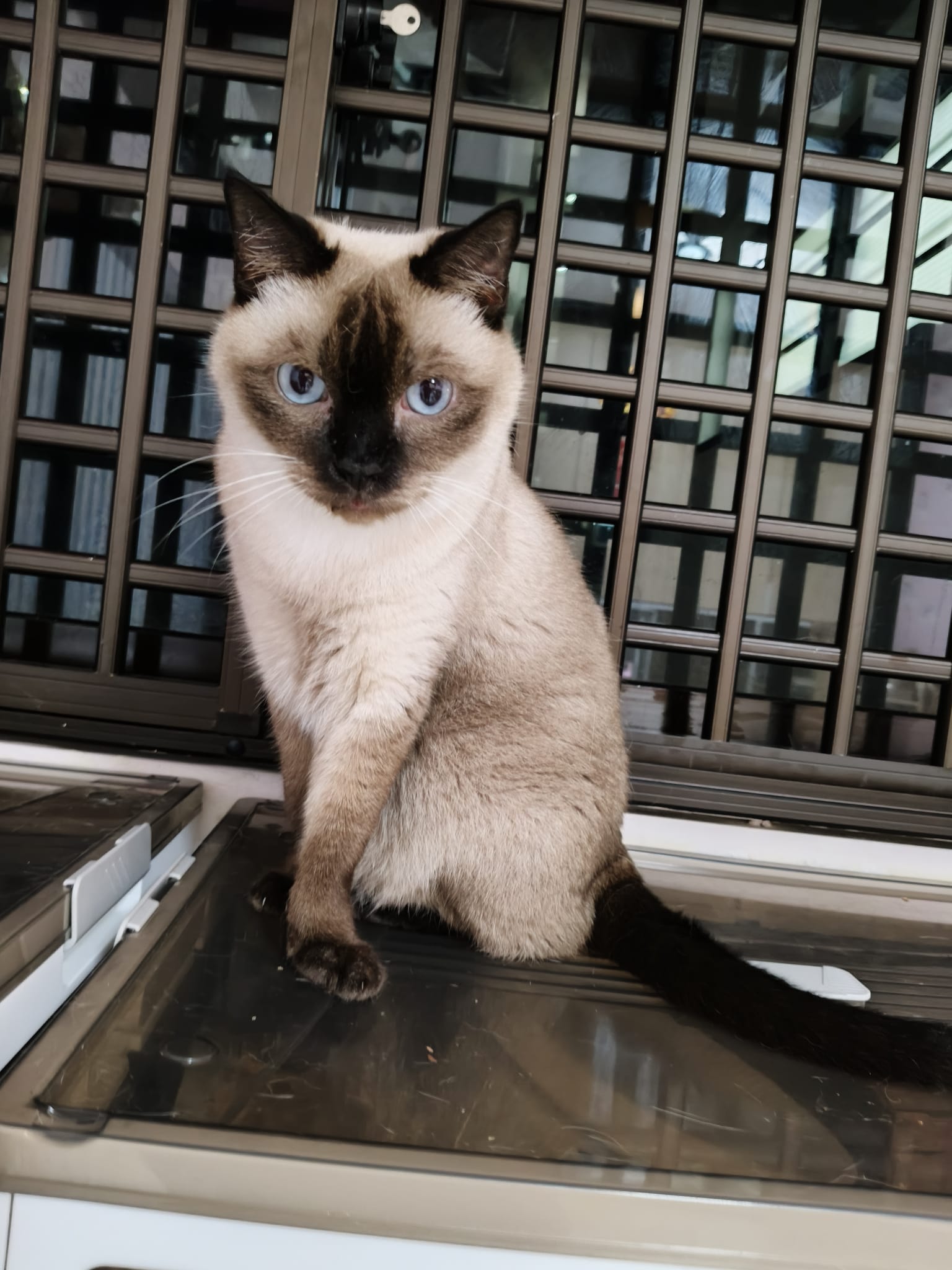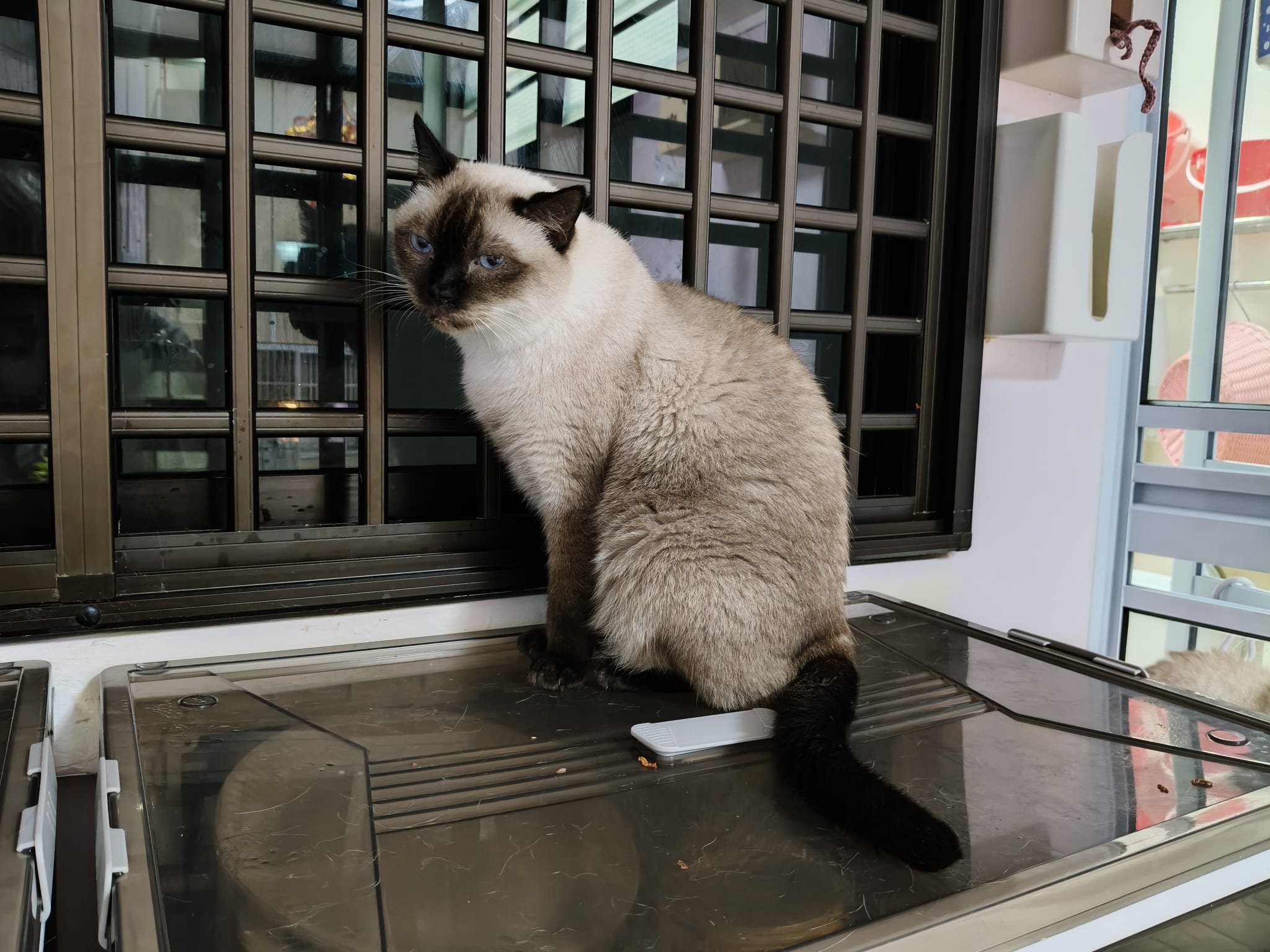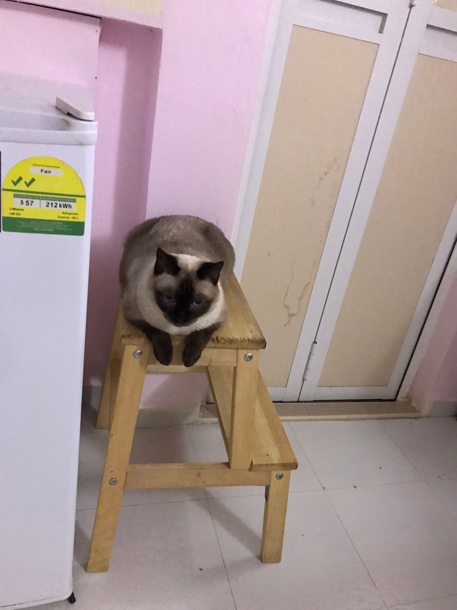 Morning: tao sit on the fridge, seem to be waiting for space so she can jump to her hammock