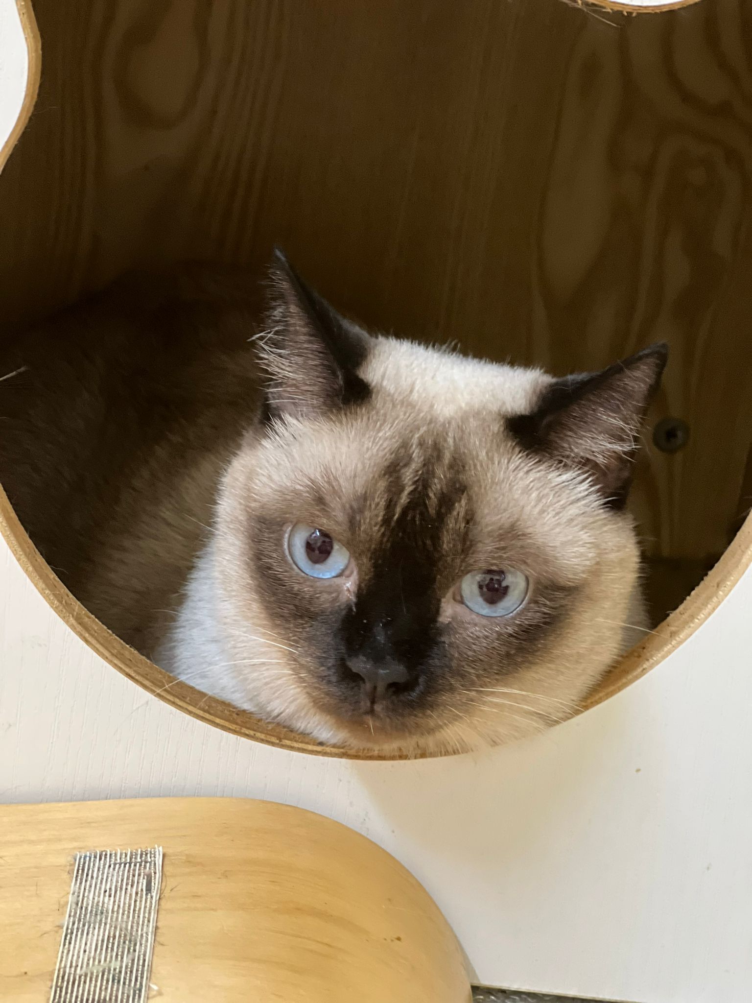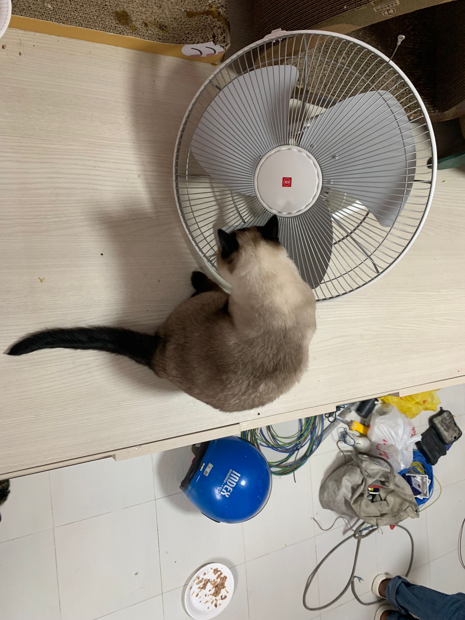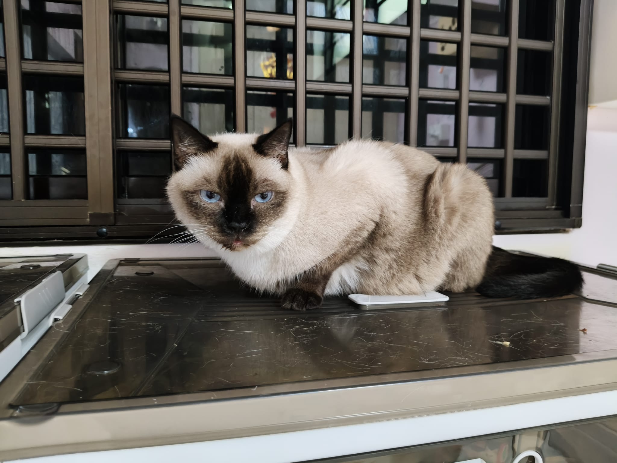 Morning: tao sit on the fridge, seem to be waiting for space so she can jump to her hammock