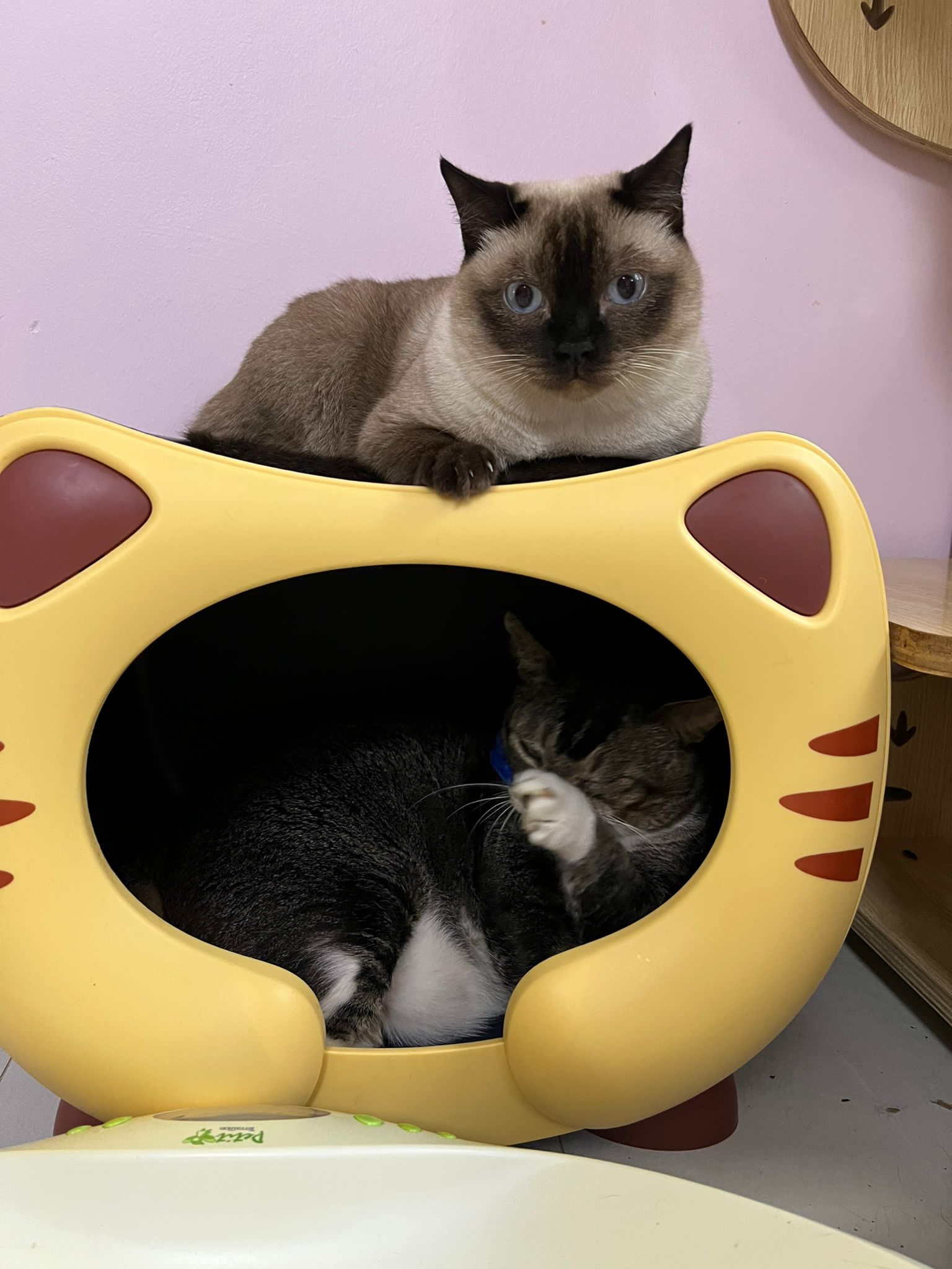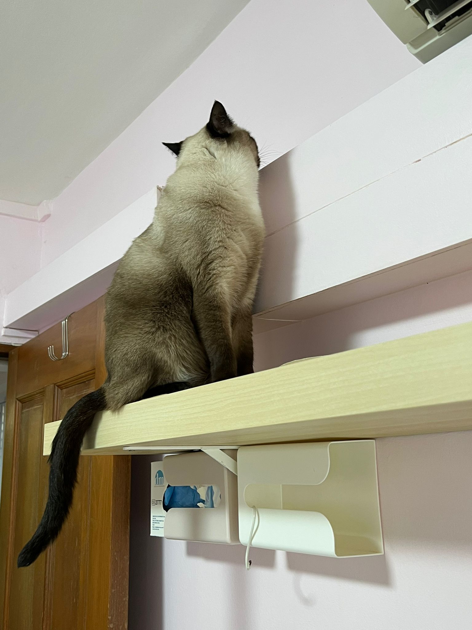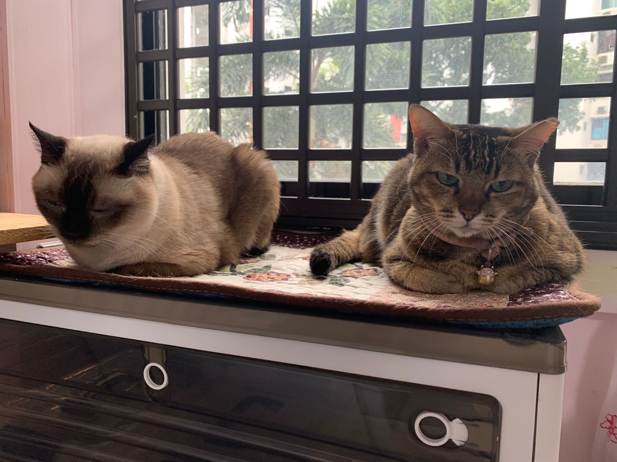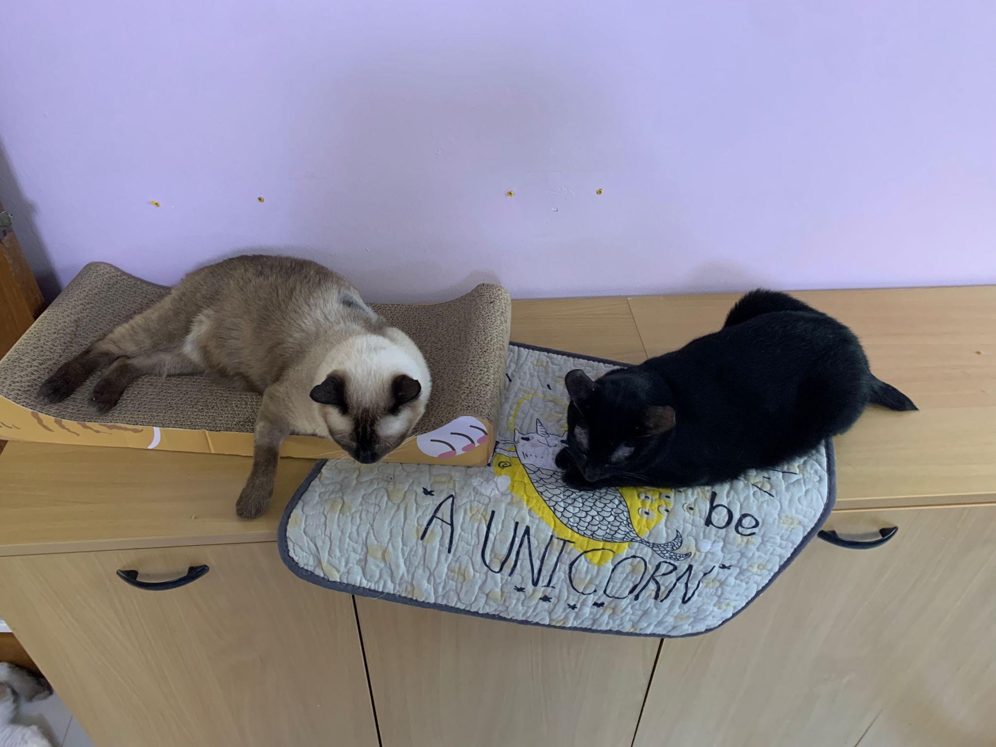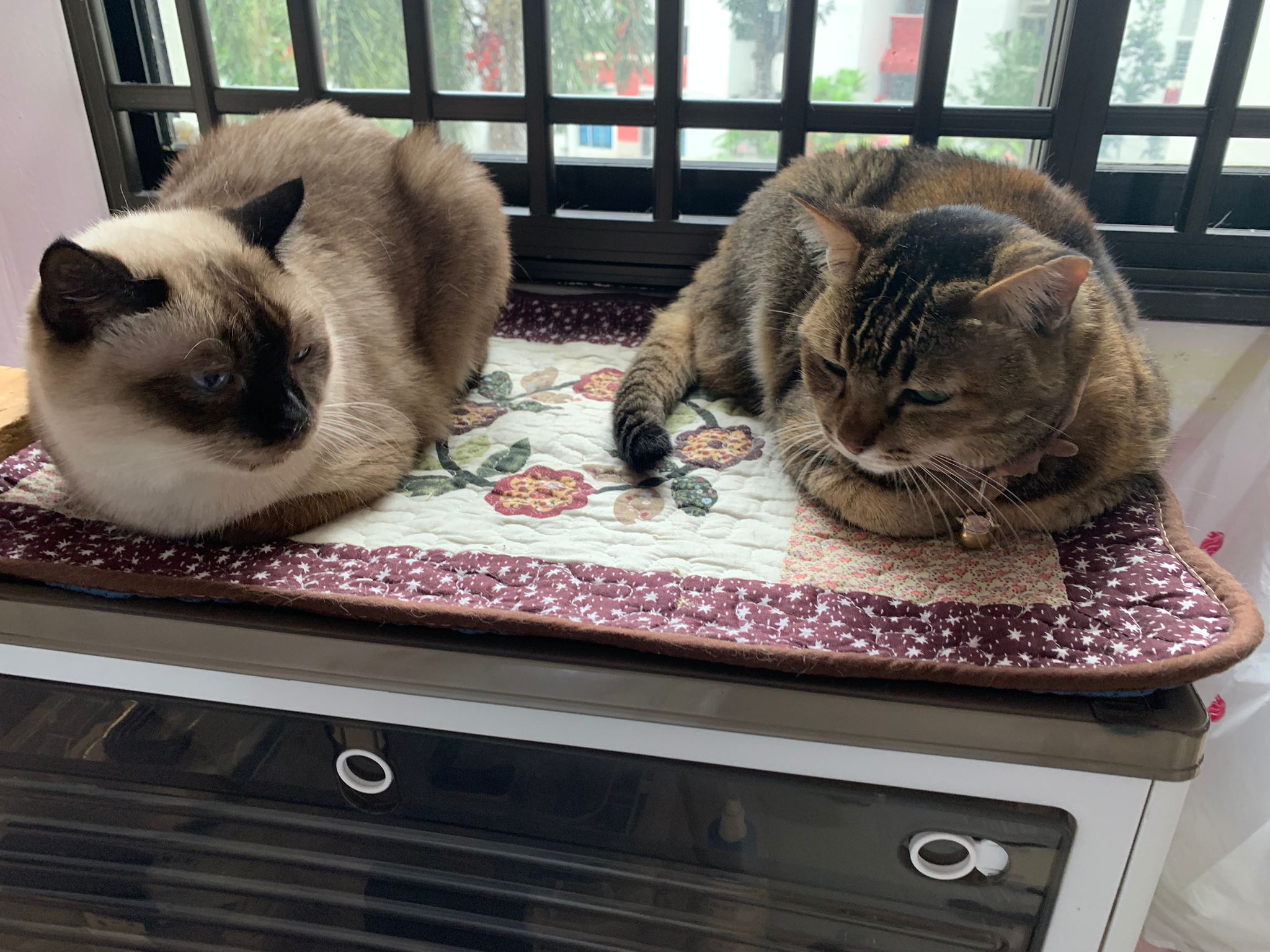 9am+: tao station on top of that window cabinet, sena wanna sit beside her, she stare at her, making sure she didn’t touch her. End up both of them sit together; didnt disturb each other. Kiss the 2, n take photos of them. Ha