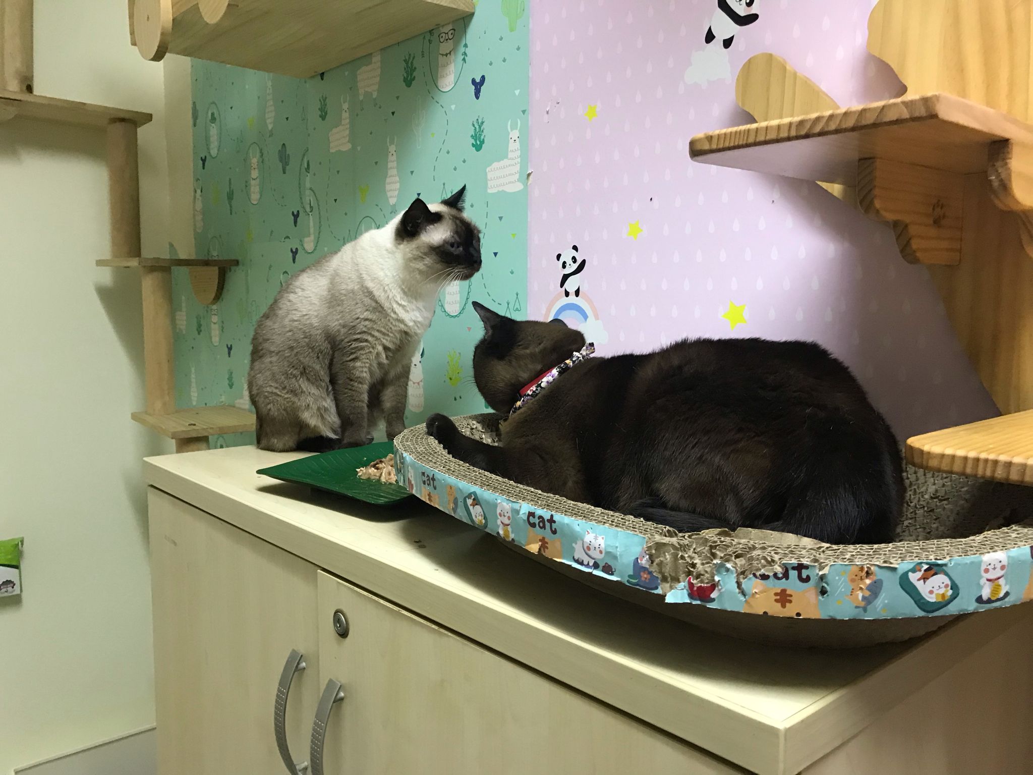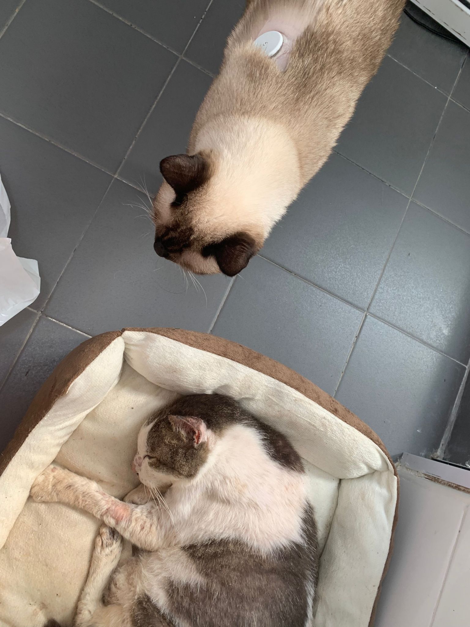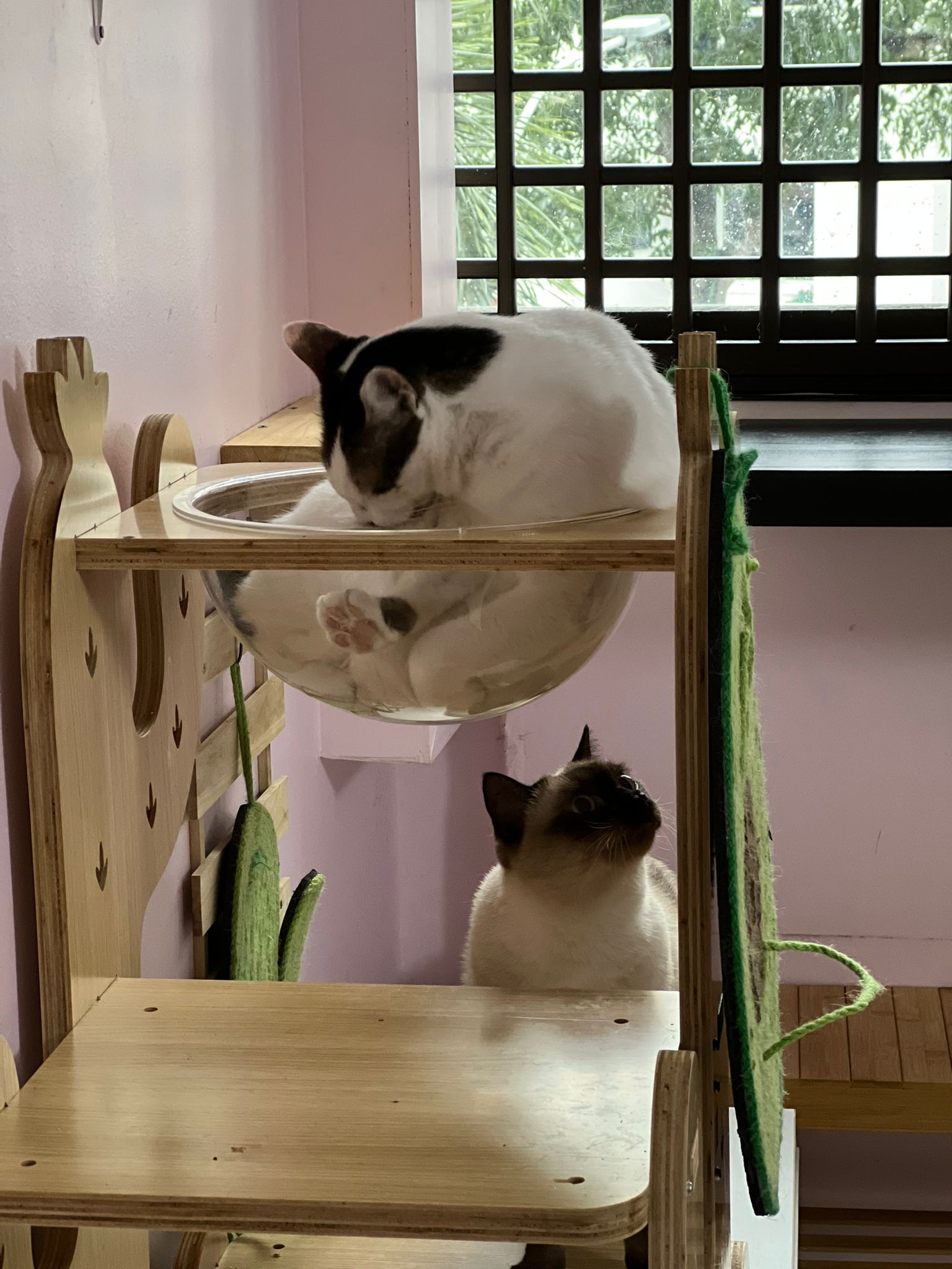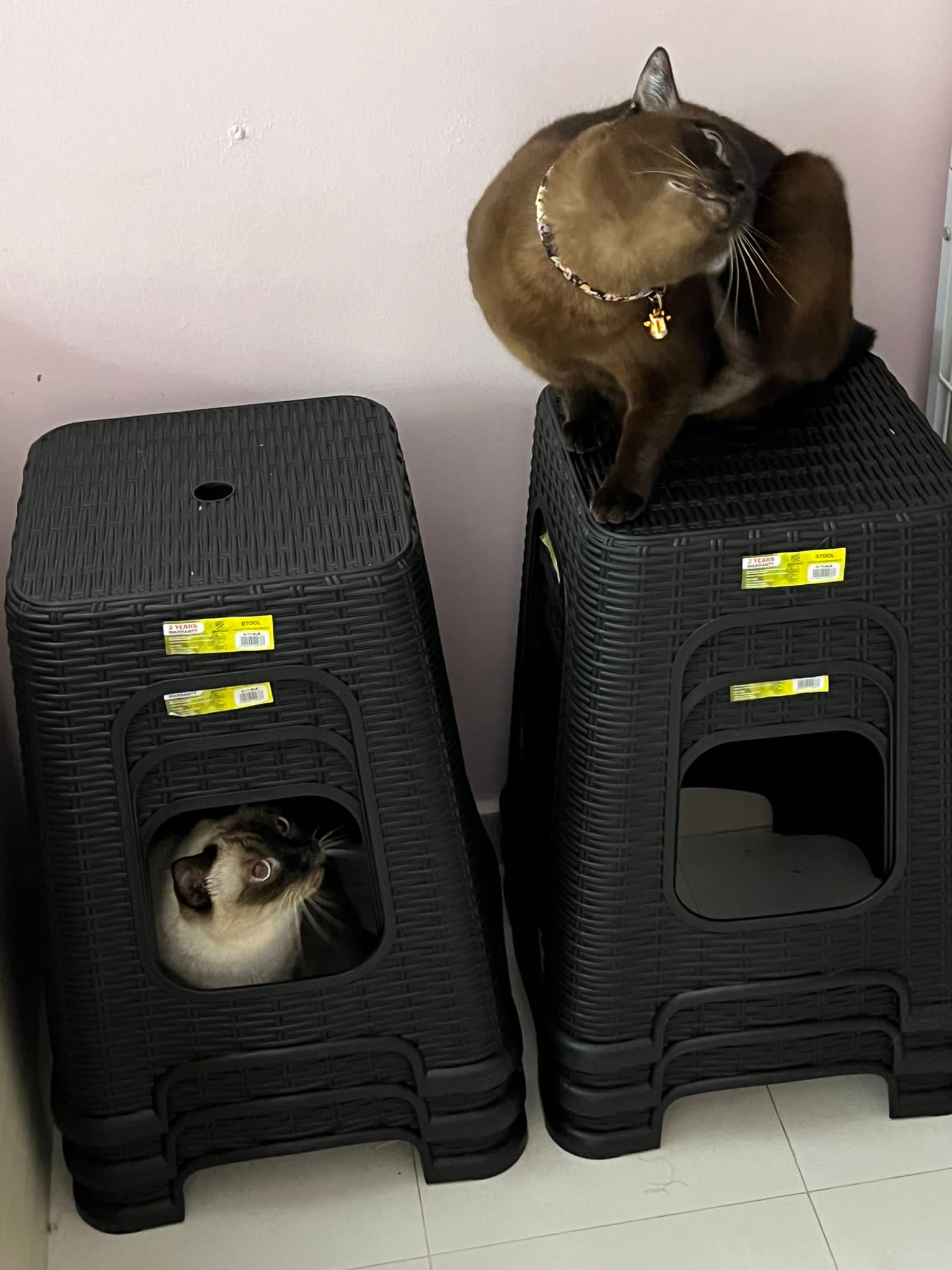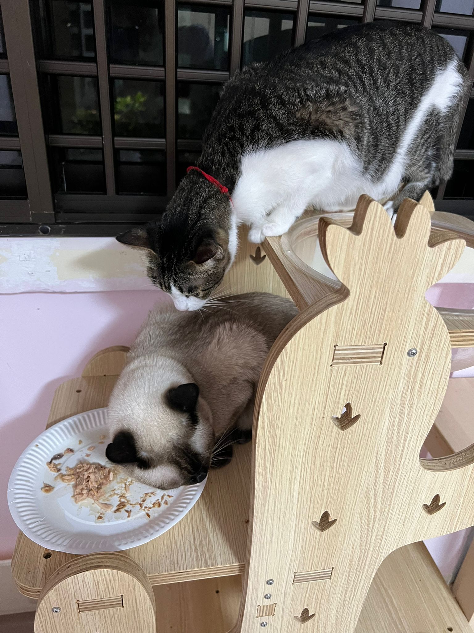 9am+: tao station on top of that window cabinet, sena wanna sit beside her, she stare at her, making sure she didn’t touch her. End up both of them sit together; didnt disturb each other. Kiss the 2, n take photos of them. Ha