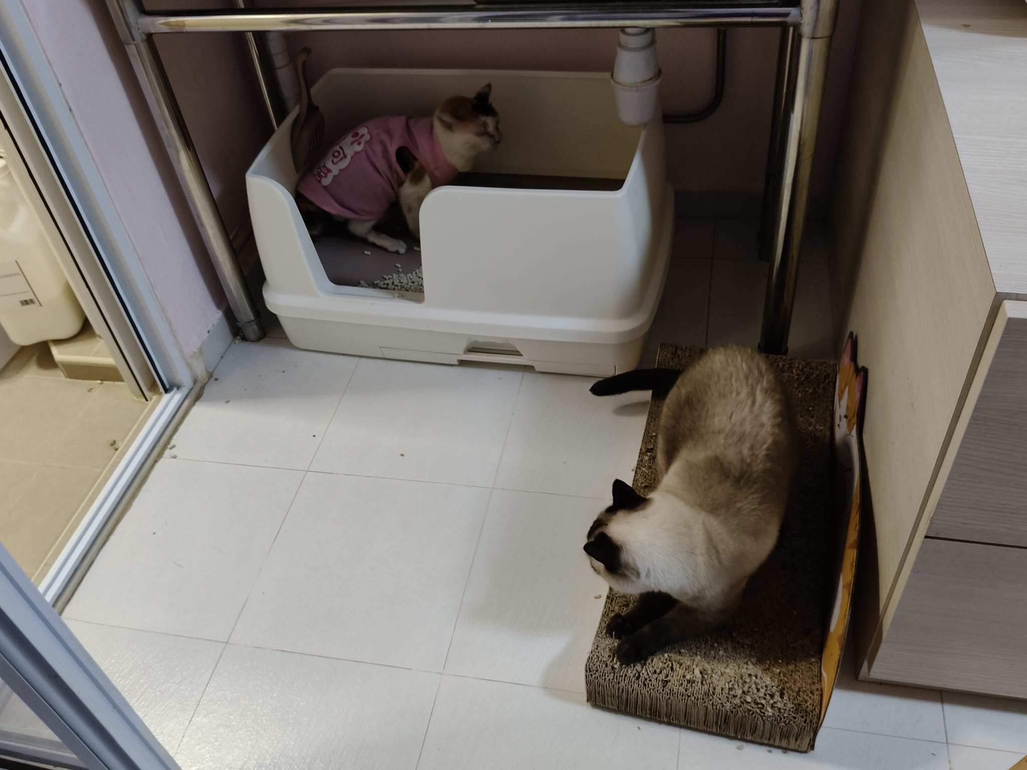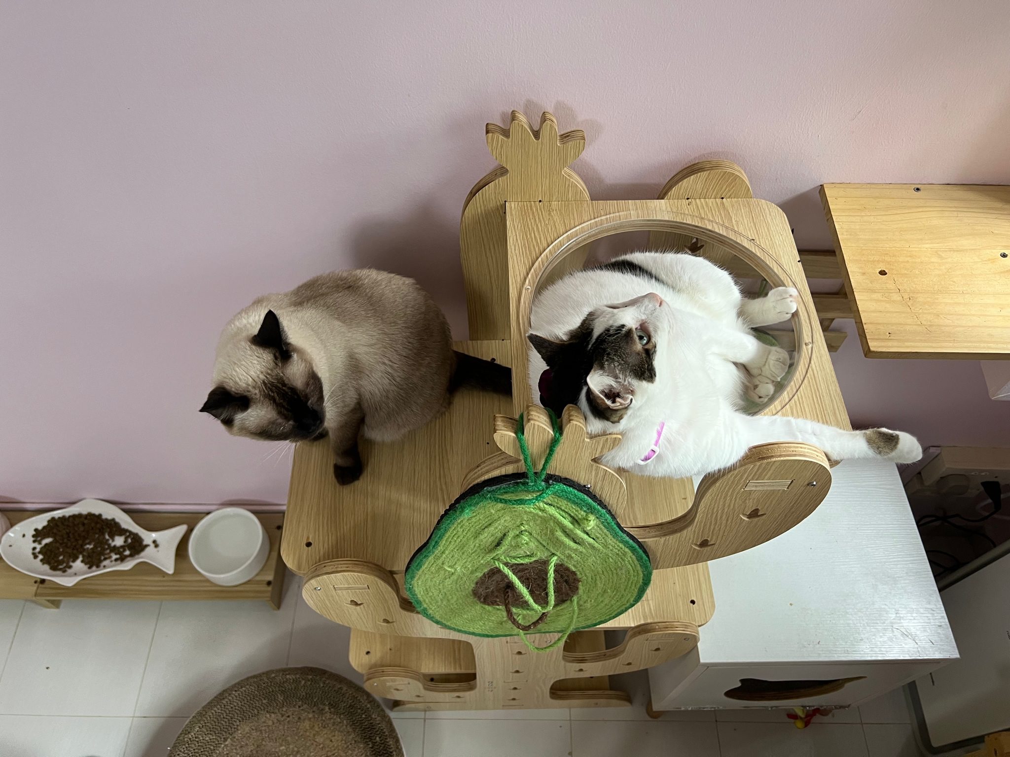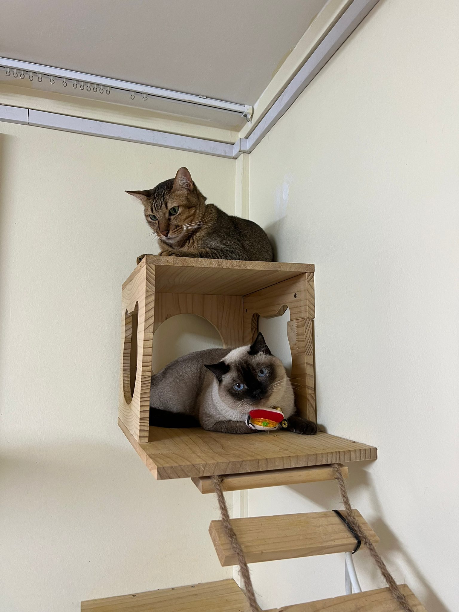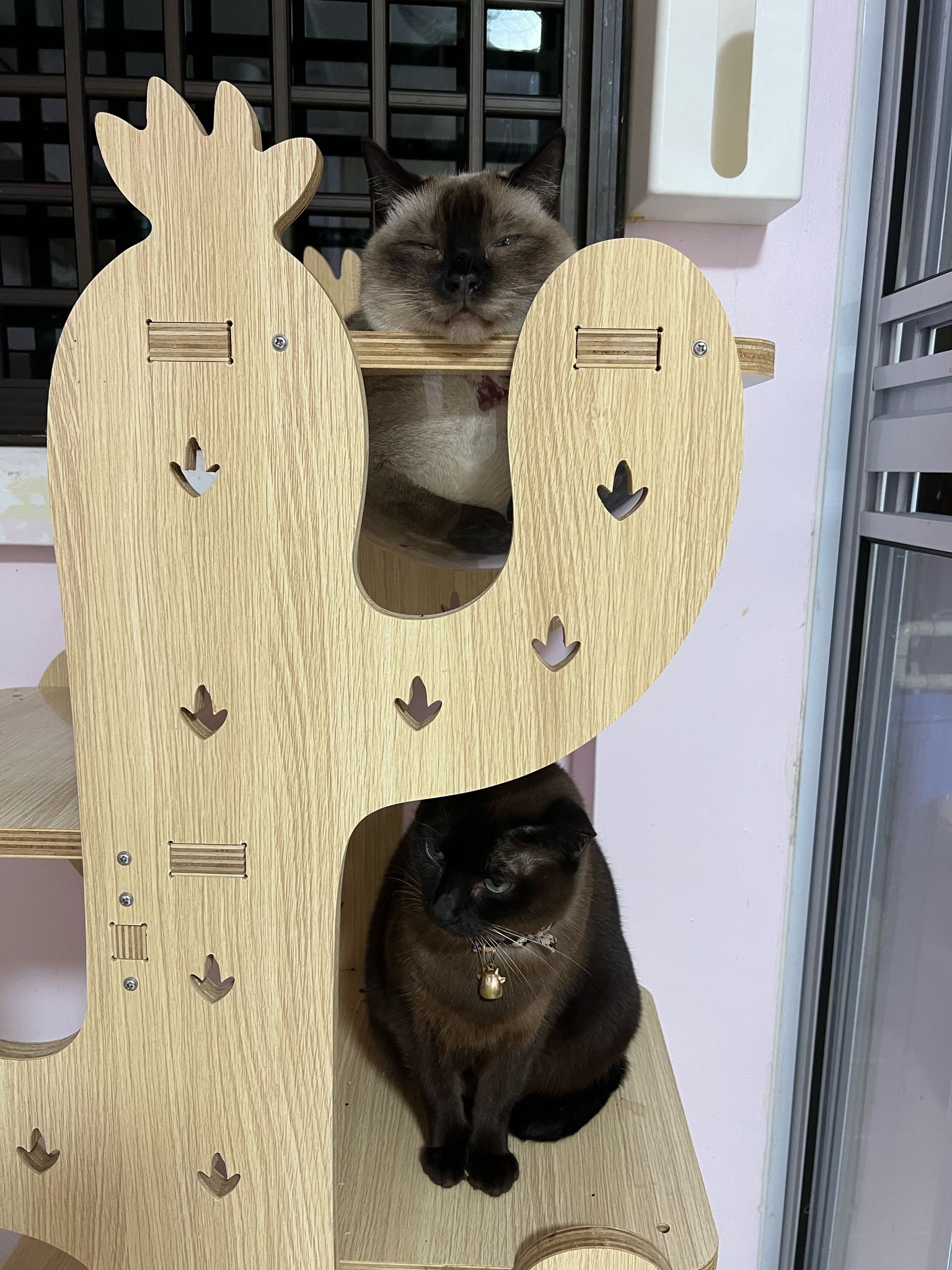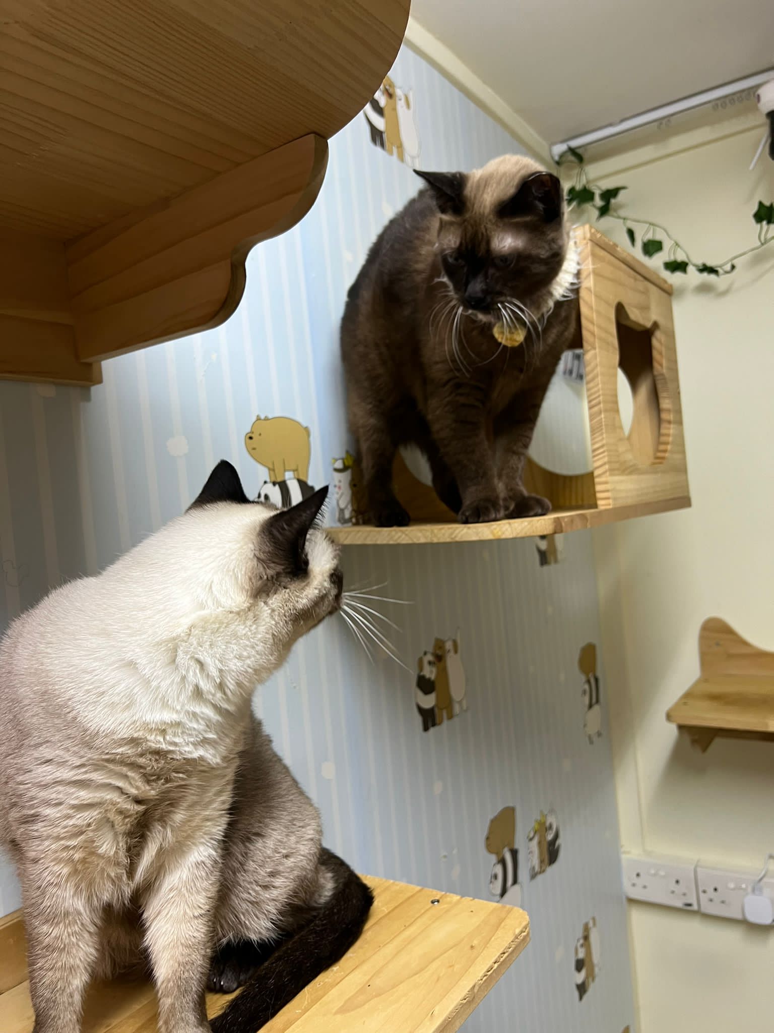 9am+: tao station on top of that window cabinet, sena wanna sit beside her, she stare at her, making sure she didn’t touch her. End up both of them sit together; didnt disturb each other. Kiss the 2, n take photos of them. Ha