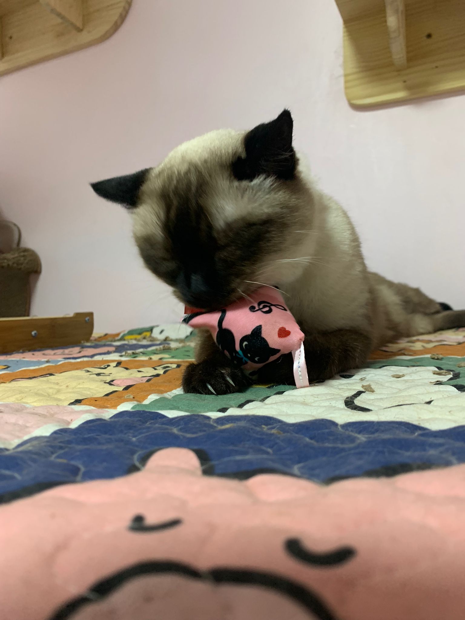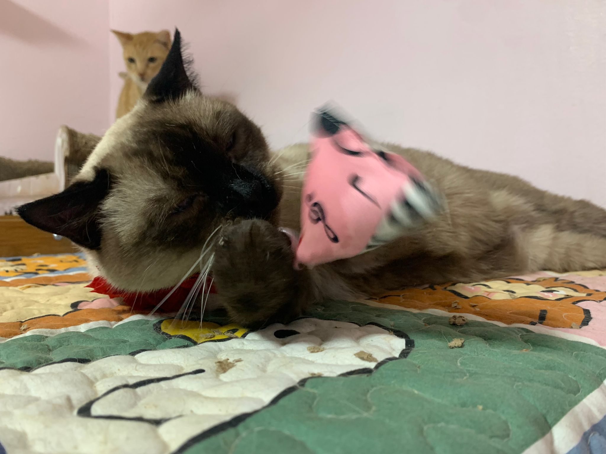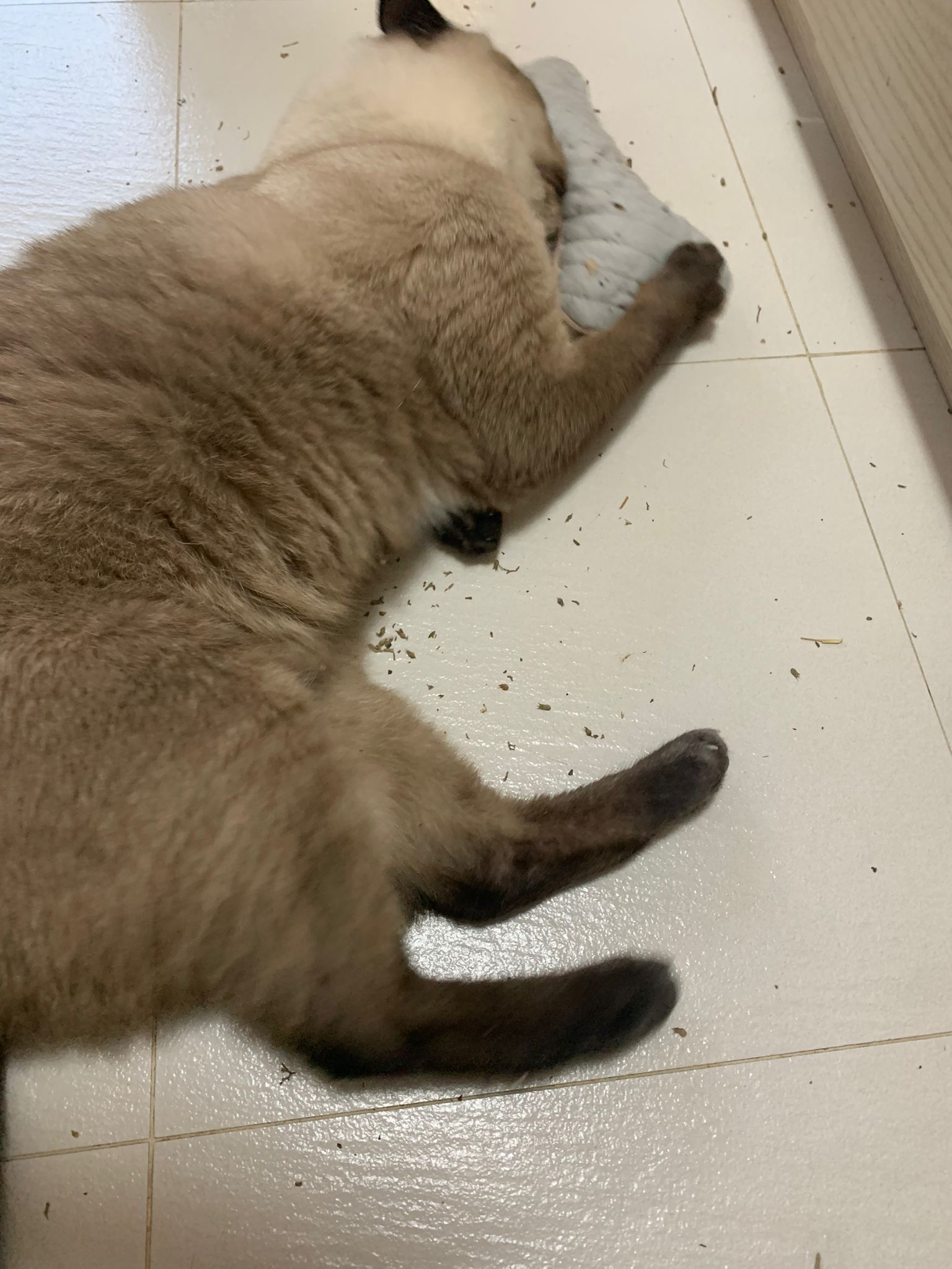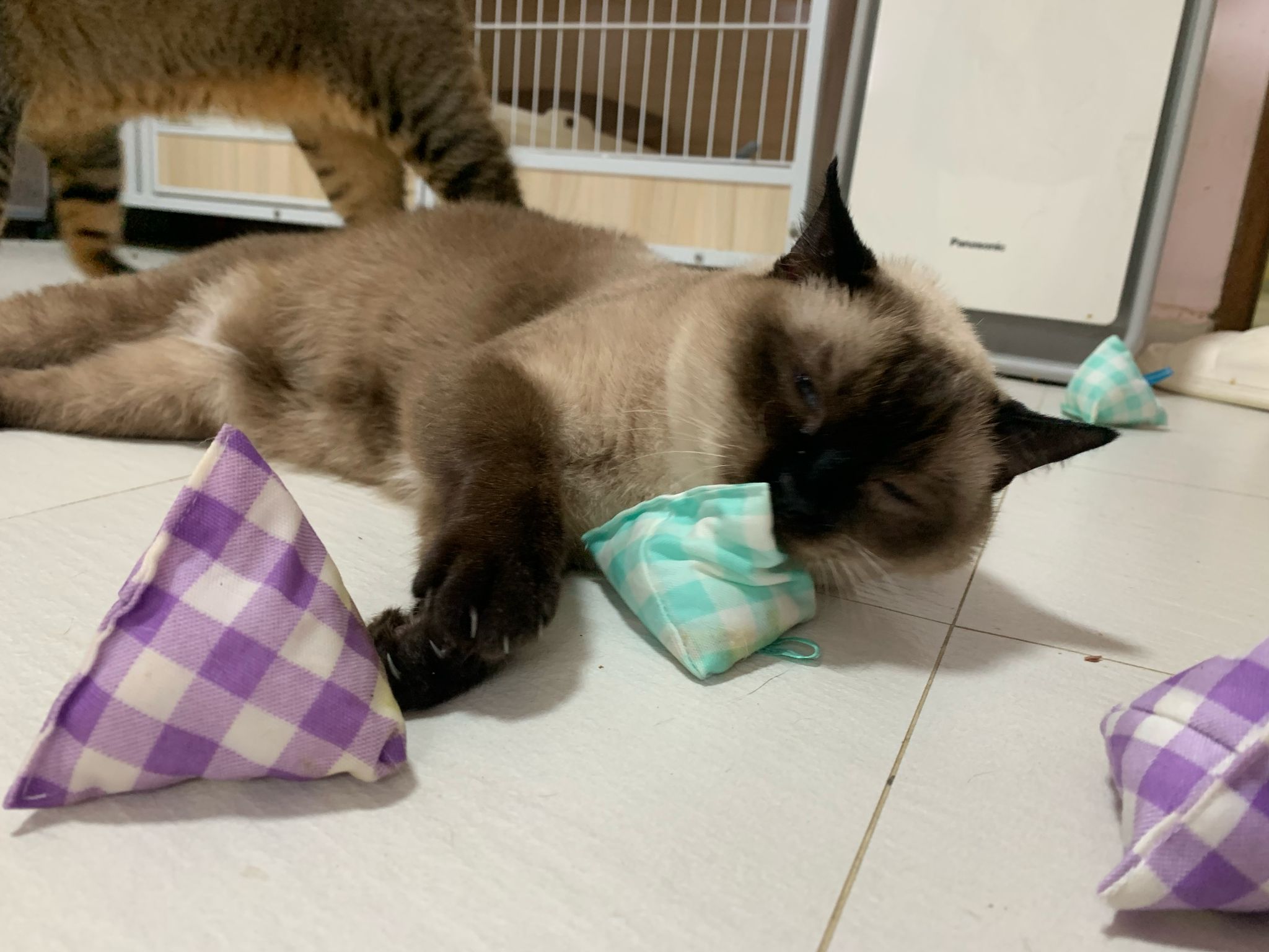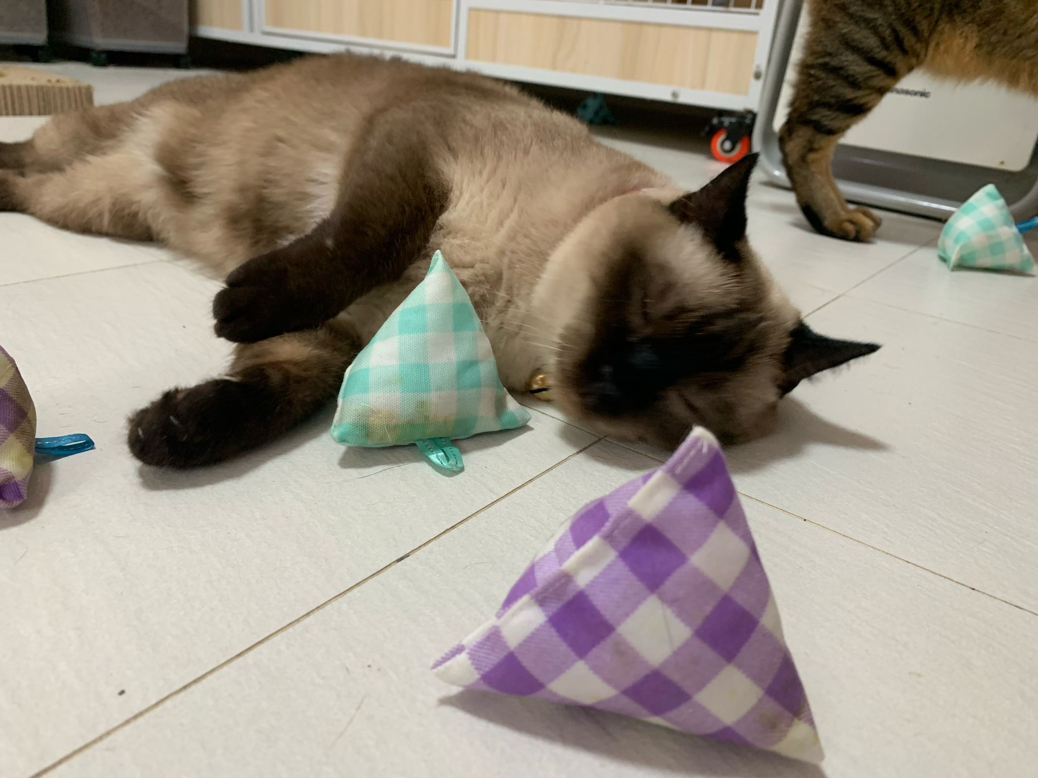 Morning: Tmr major cleaning day, today let them have fun w catnips … tao as usual catnip fan … roll on the floor w the toy. Think I’ll throw all toys on fri