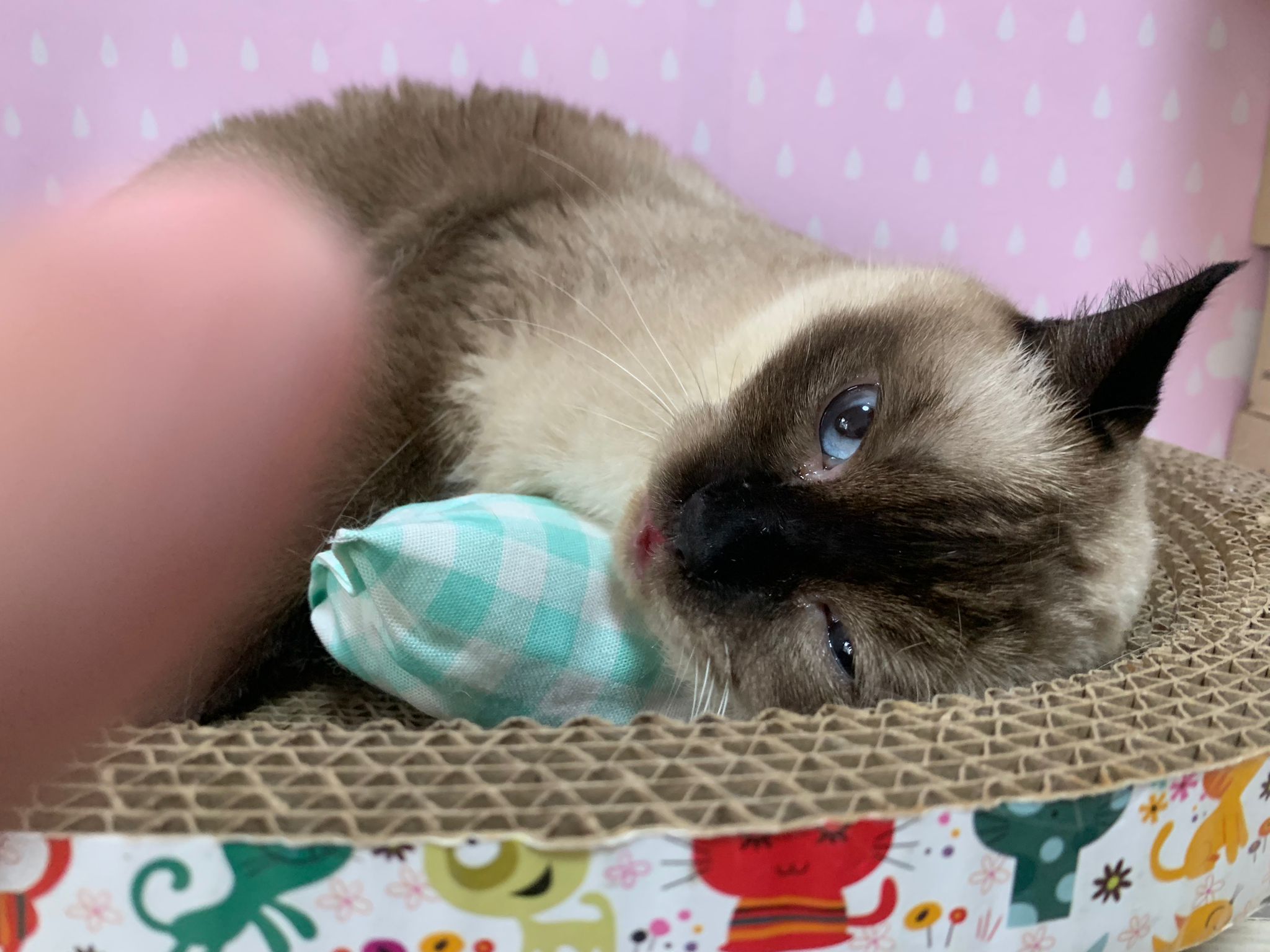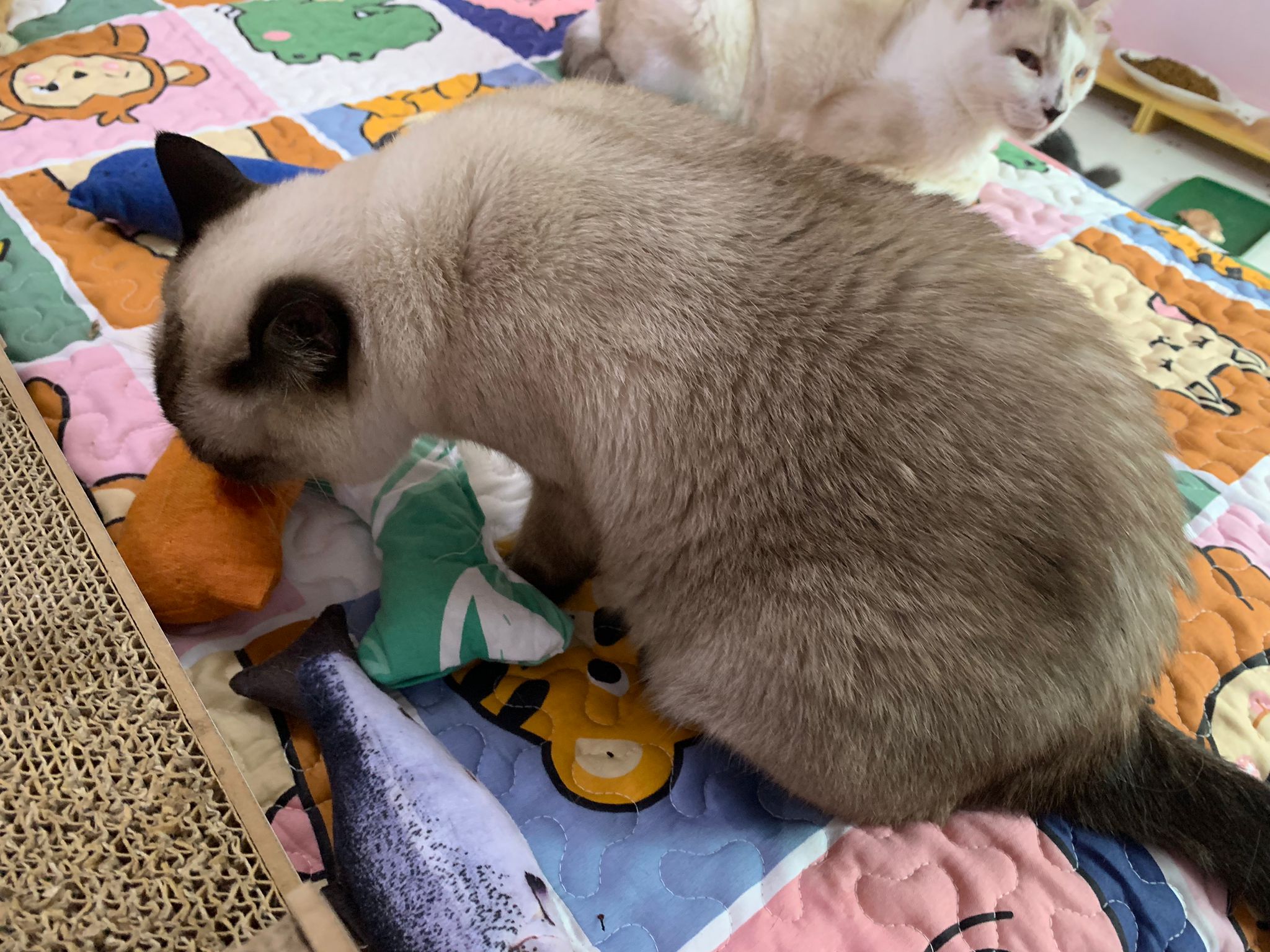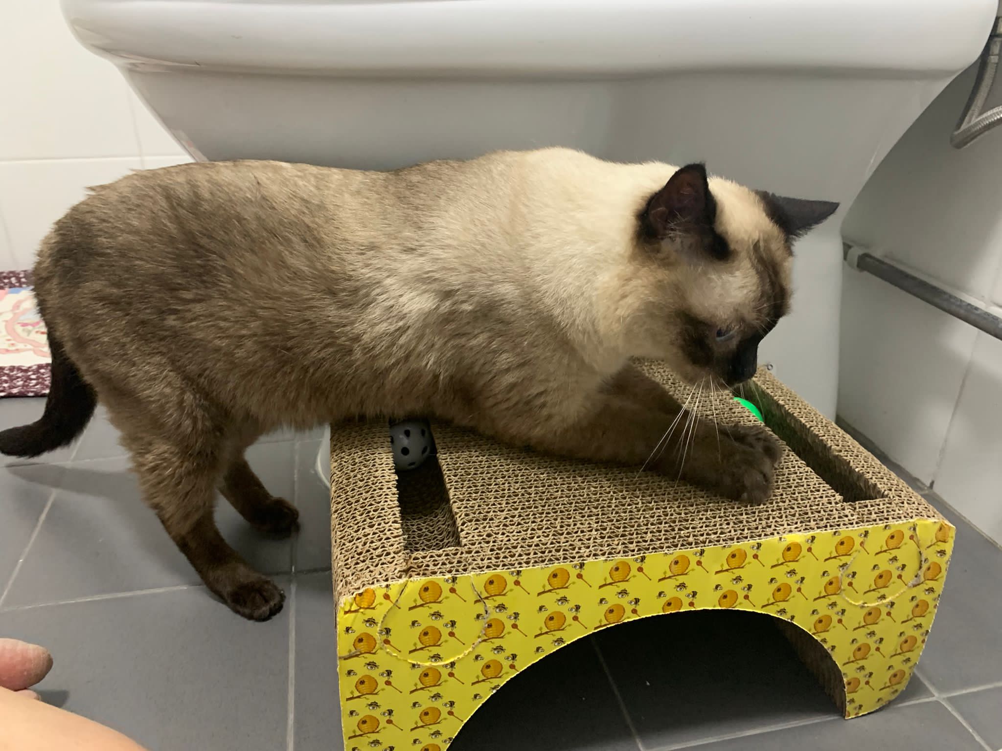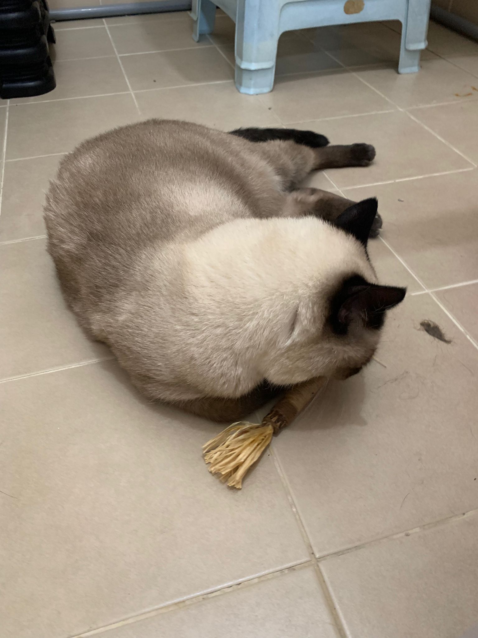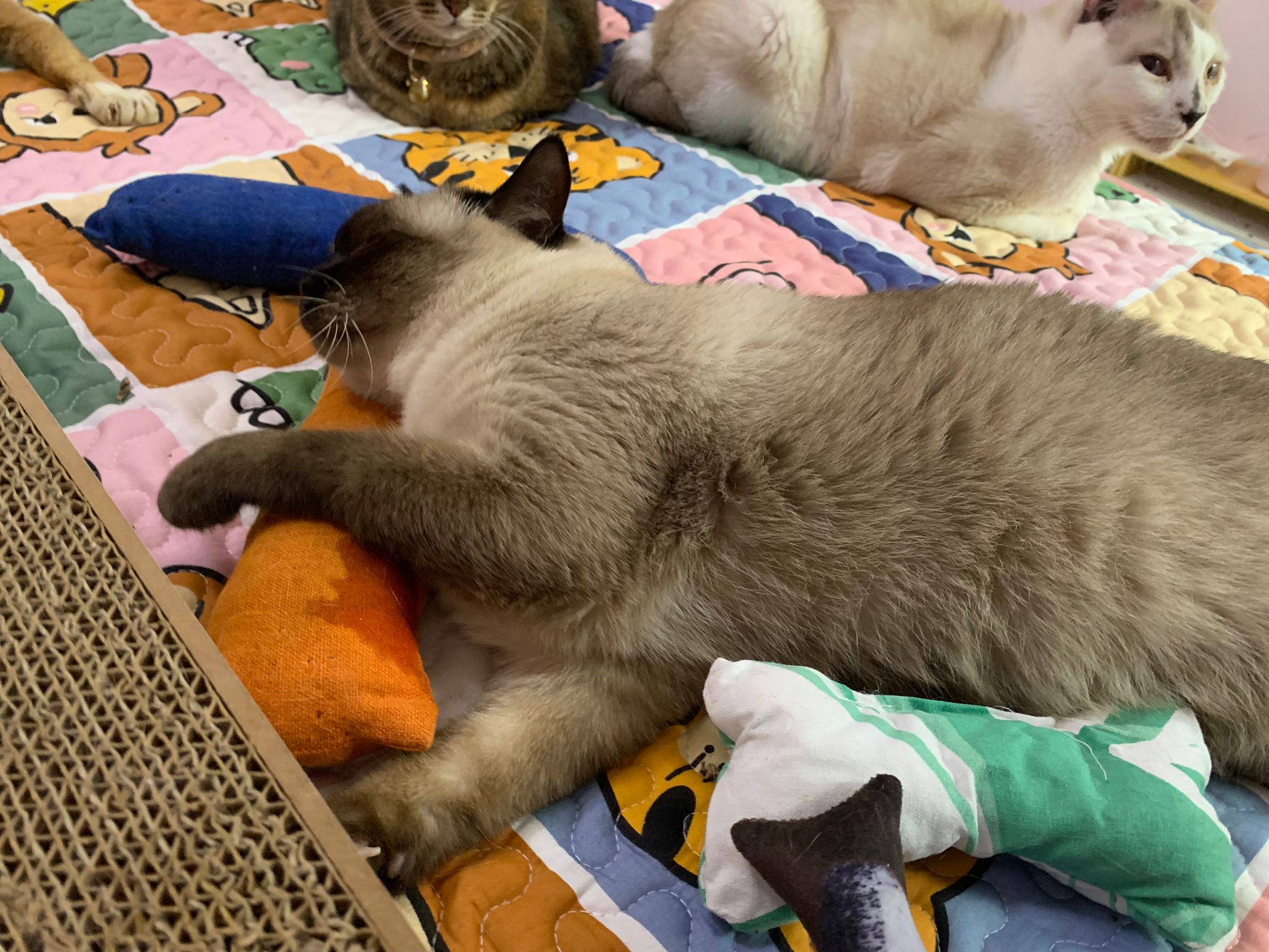 Morning: Tmr major cleaning day, today let them have fun w catnips … tao as usual catnip fan … roll on the floor w the toy. Think I’ll throw all toys on fri