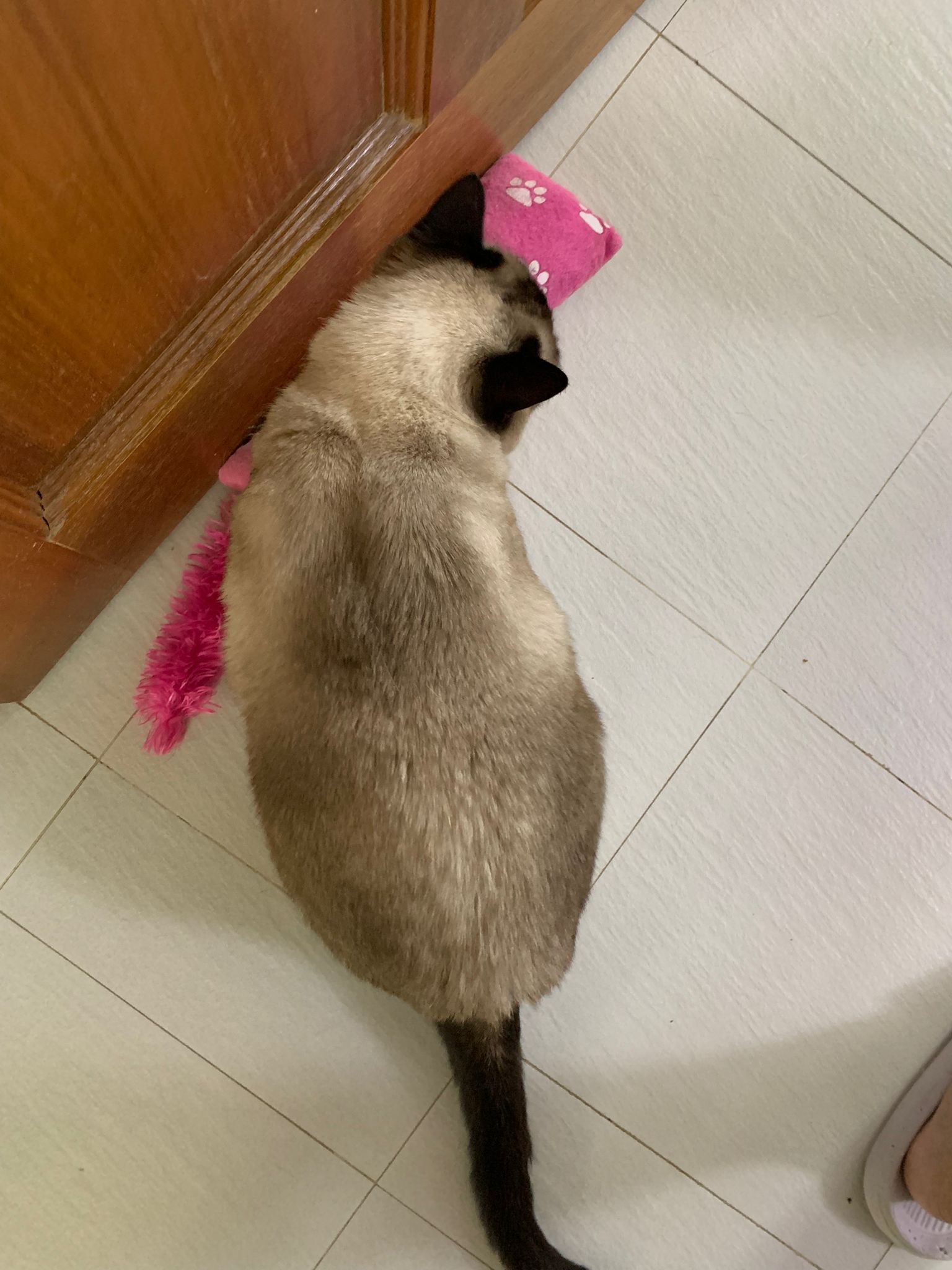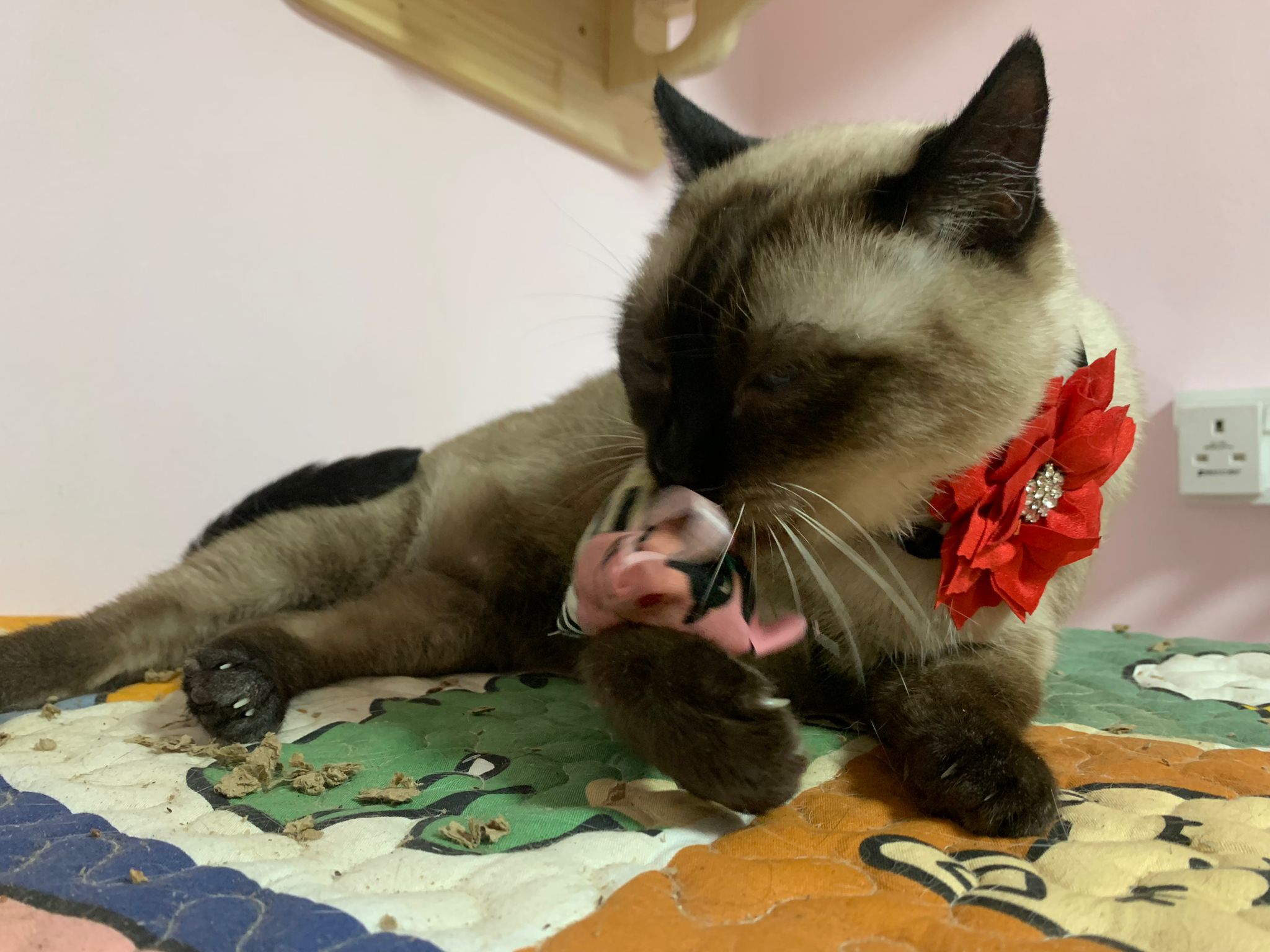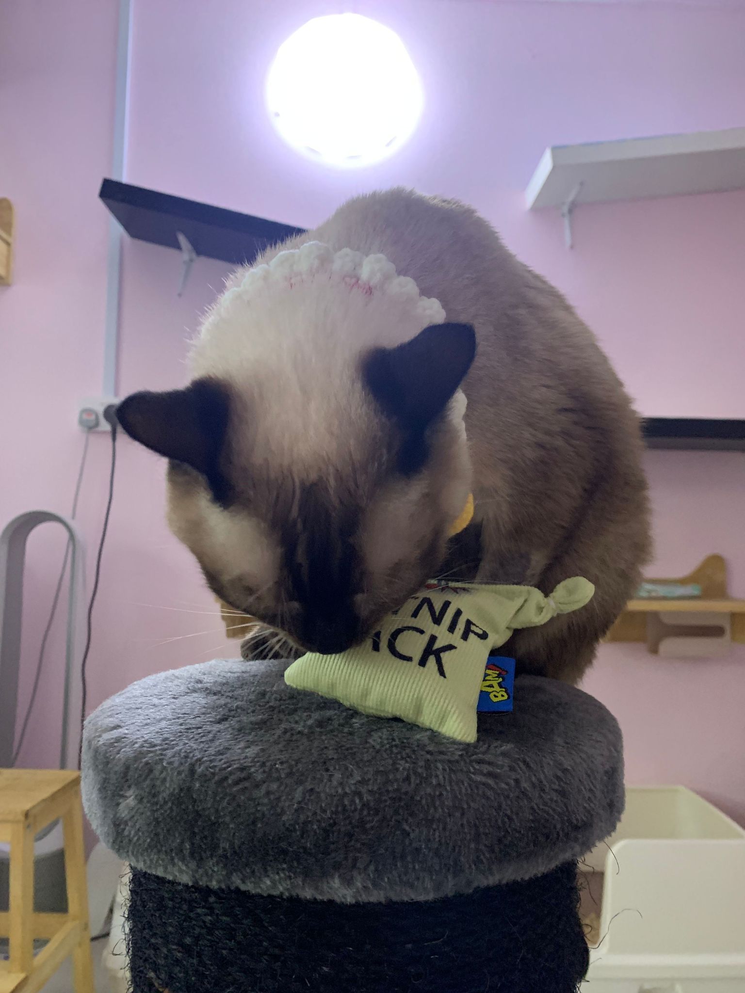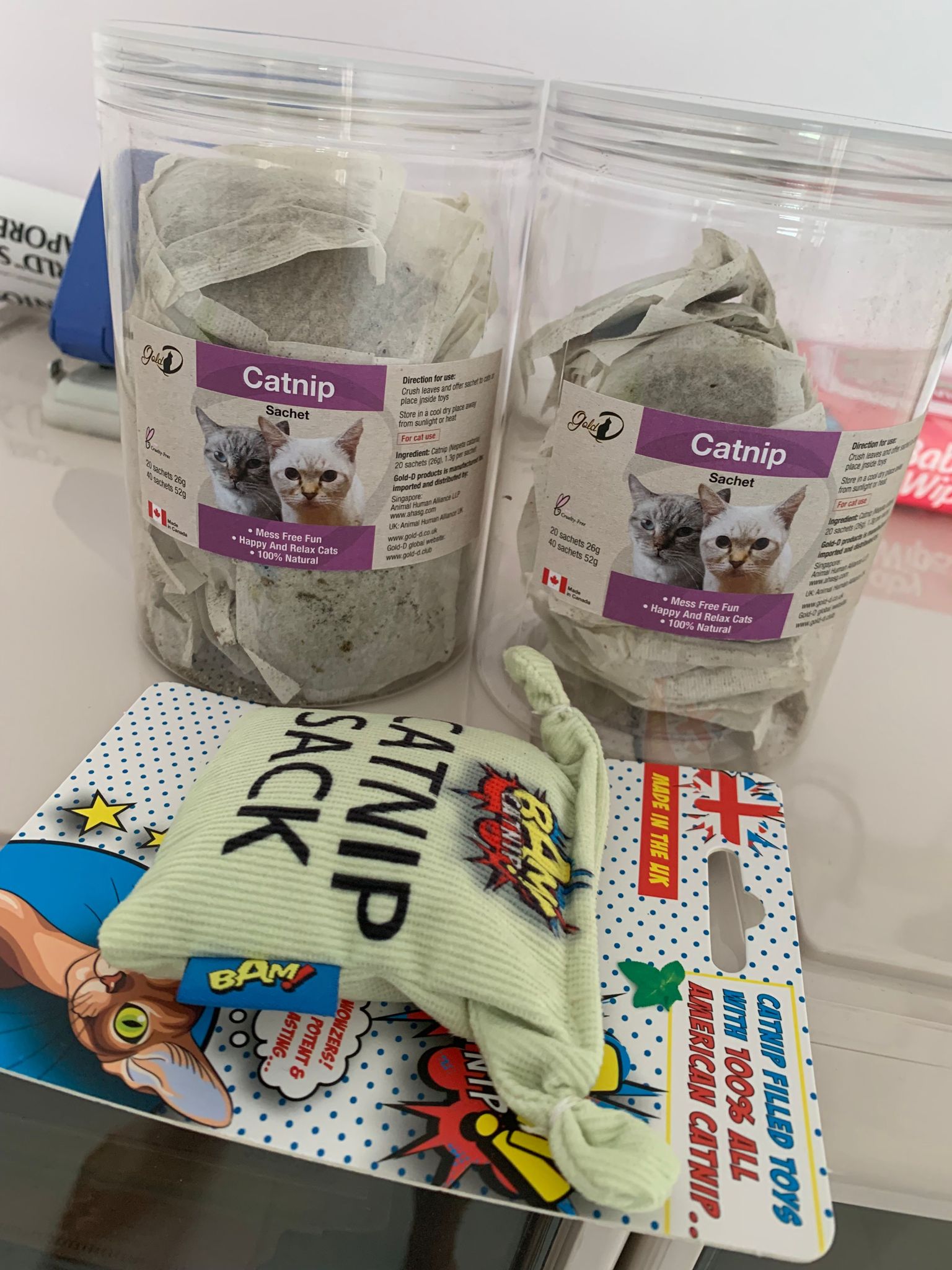 First give her a mettacat mouse w a pack of catnip. Ha smell not that strong mah. She play a while only then give junior n junior ah boy also aren’t that keen.