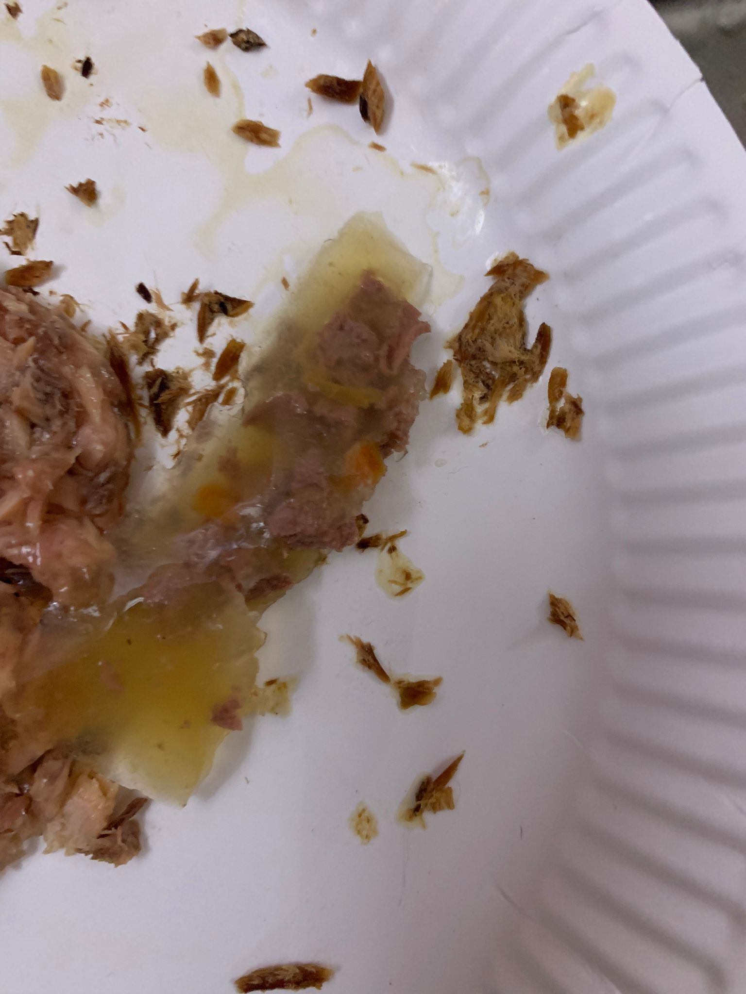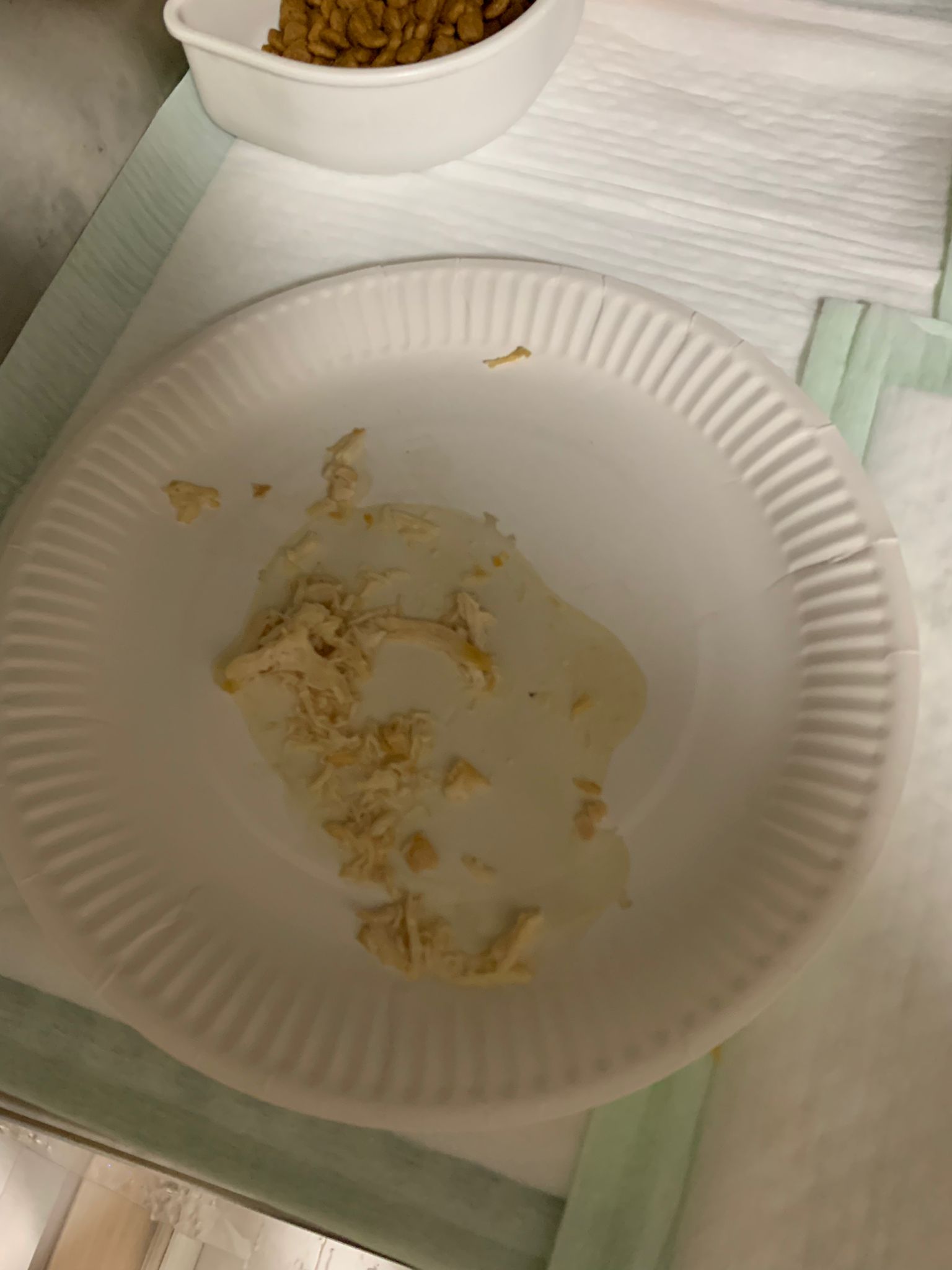 • night: she finish her food, serve tuna w crabmeat and fc gold chicken w gabapentin