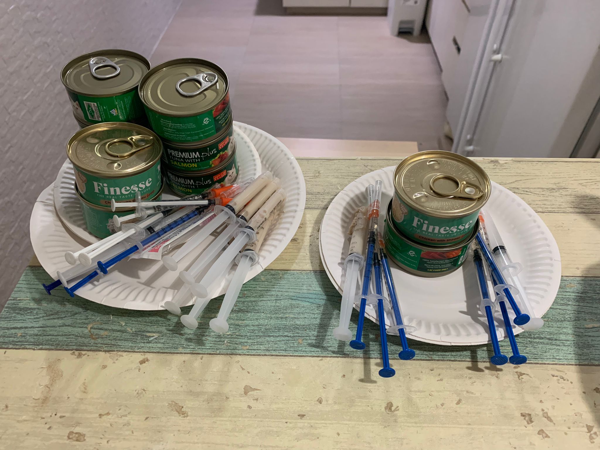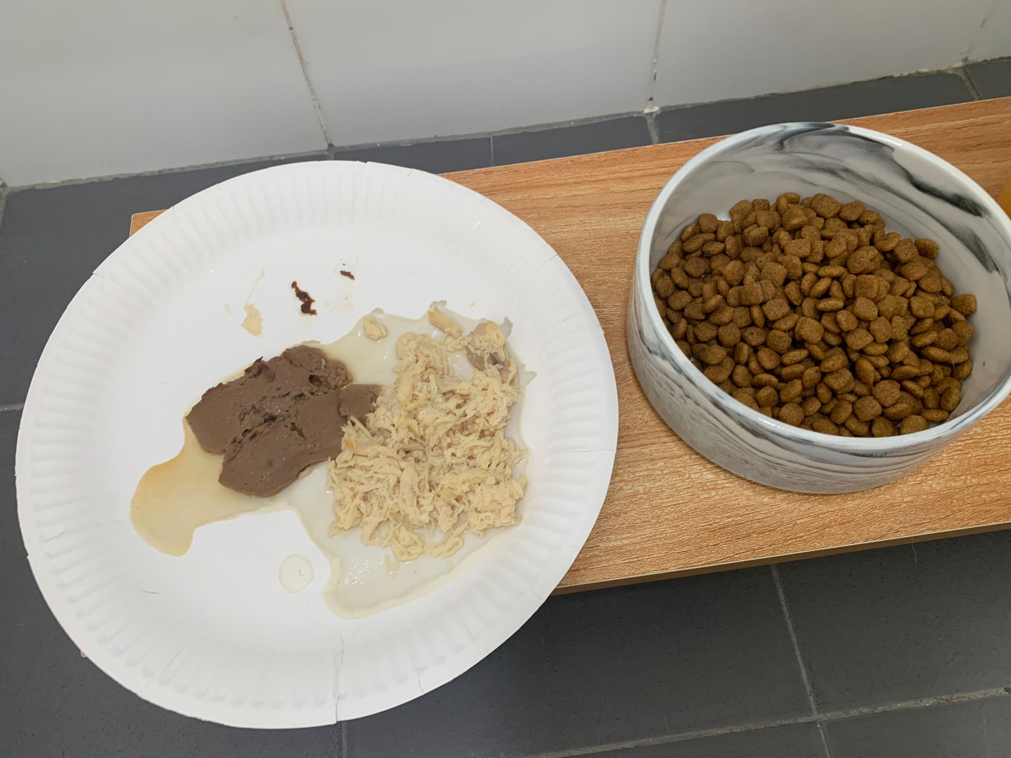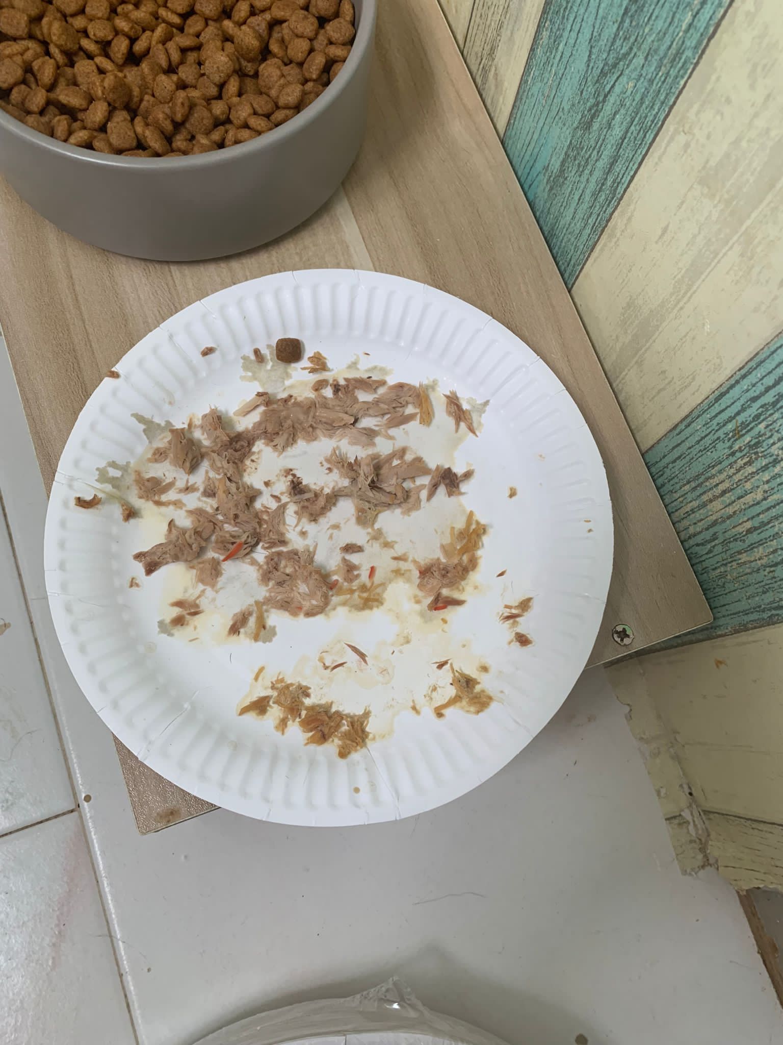 • night; serve her carrot and fc tuna w anchovy – she is a little weird – she turn fierce Cos I’m giving her food?! really meow loudly and fiercely till I scare she will jump and kill me type